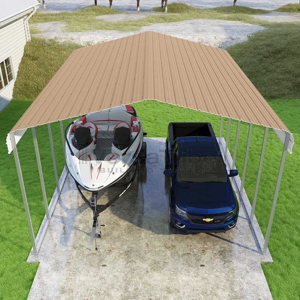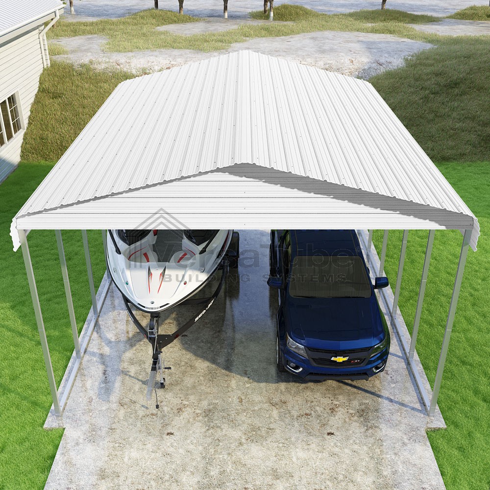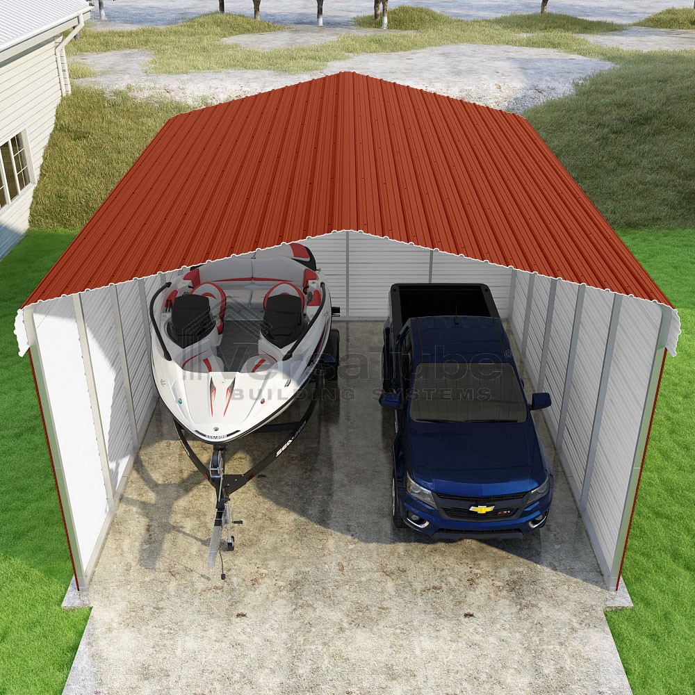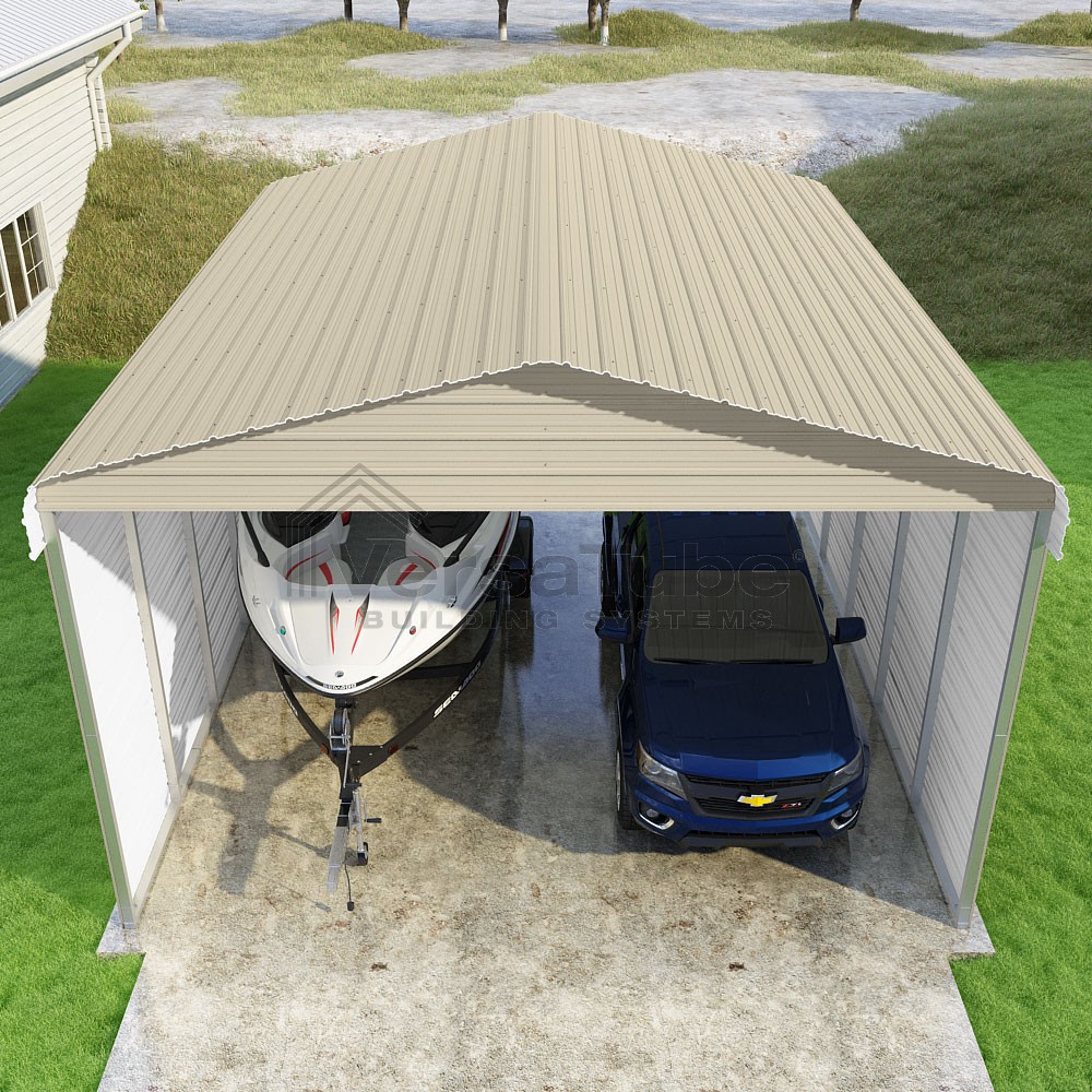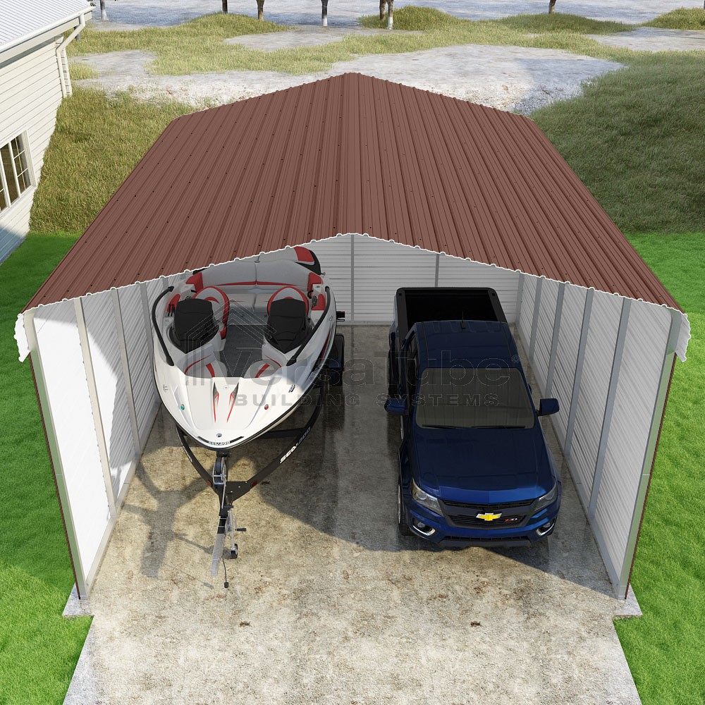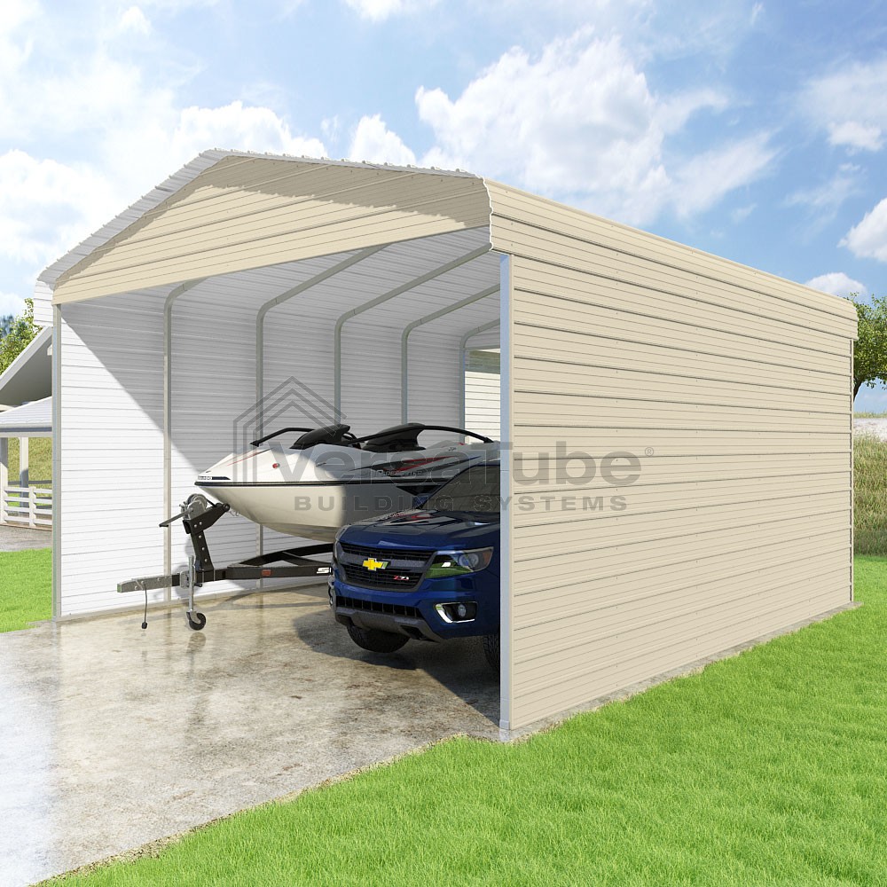Classic Series DIY carport kit features horizontal application of sheet metal panels with the extra protection of rounded eaves.