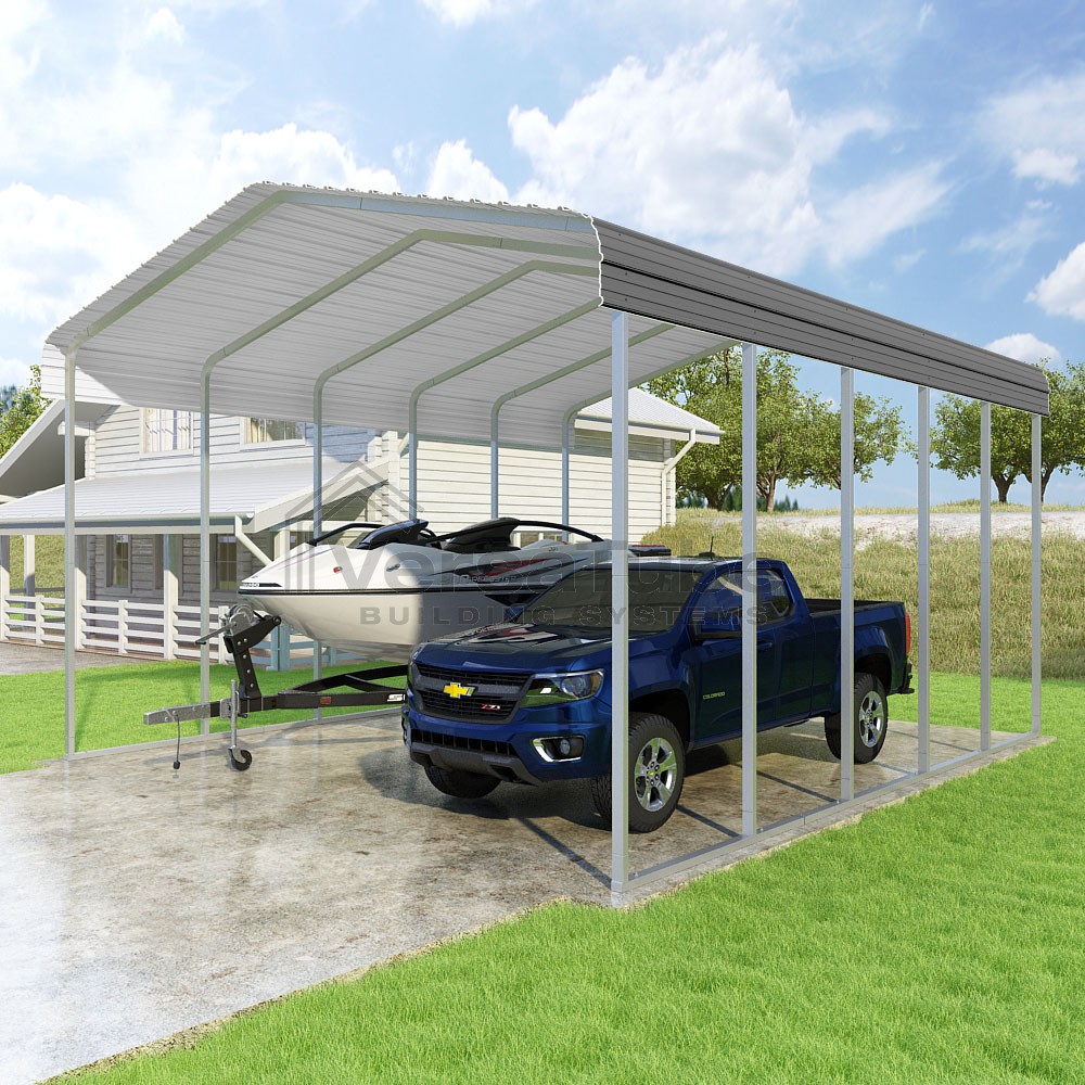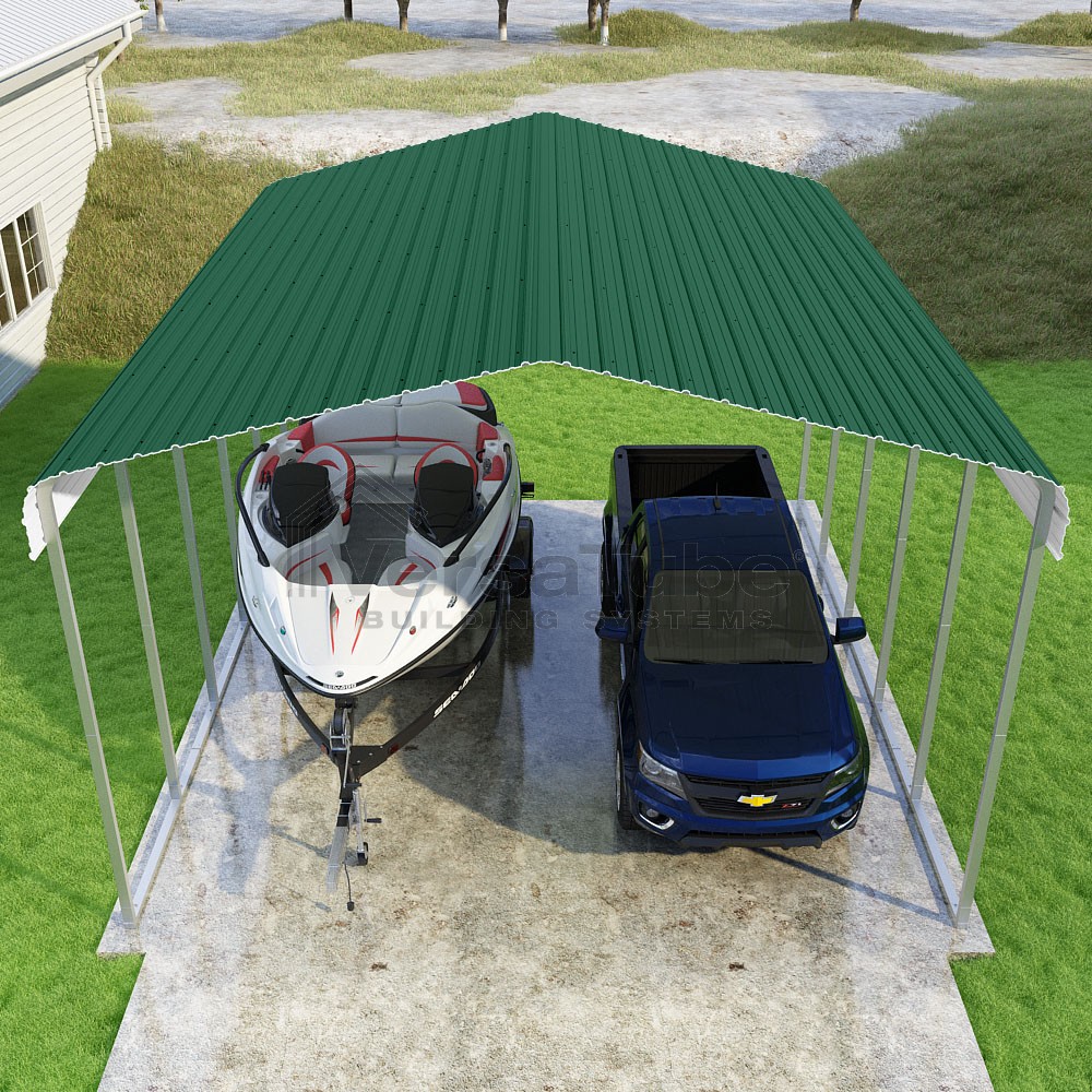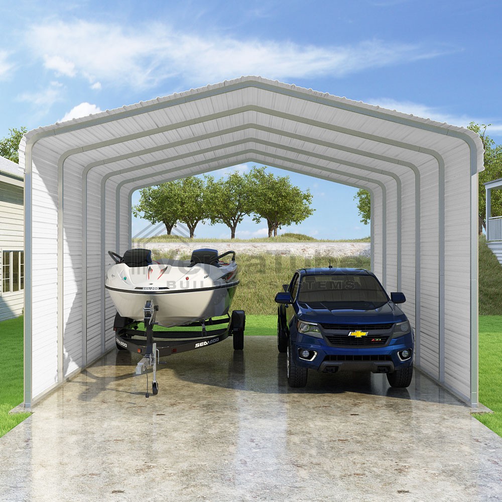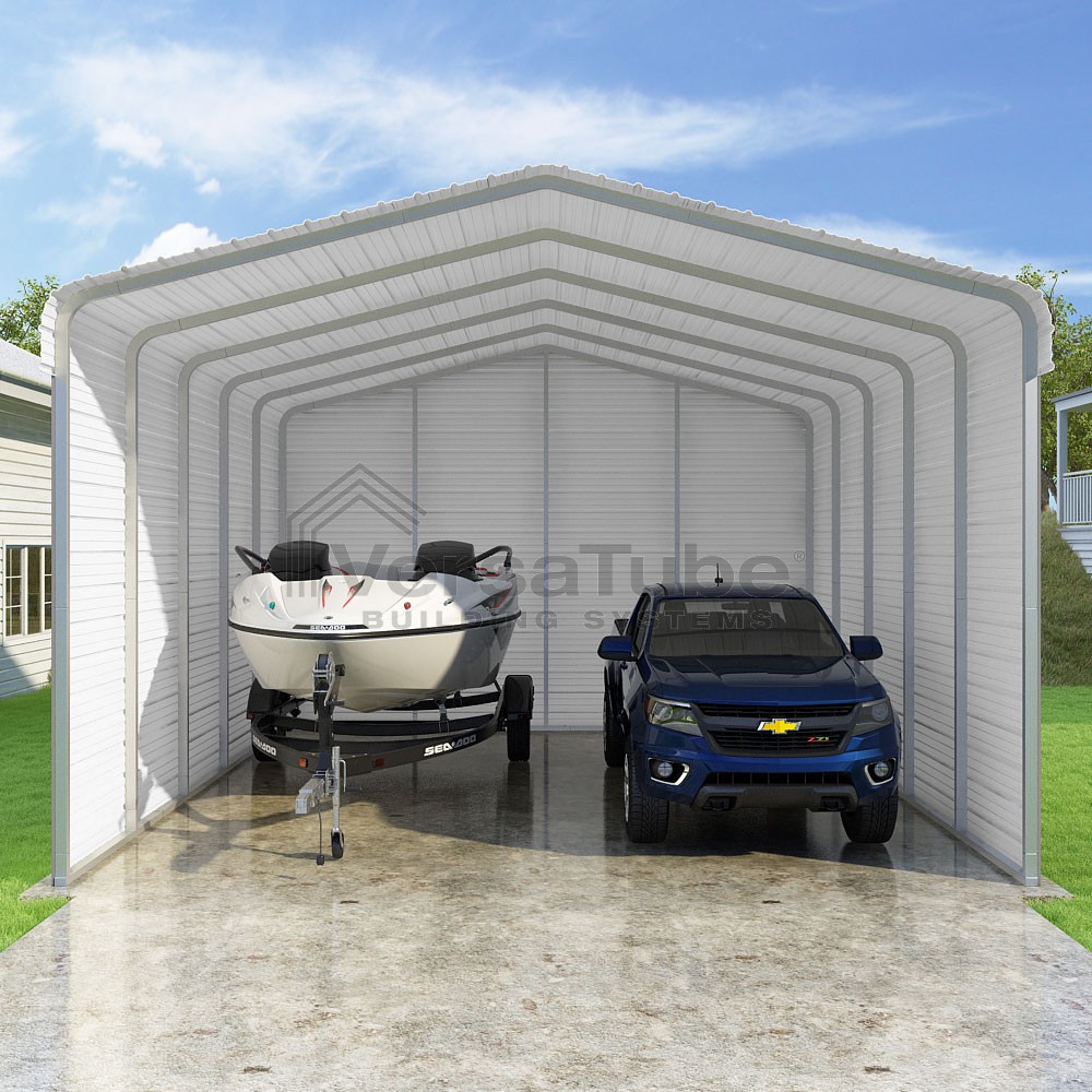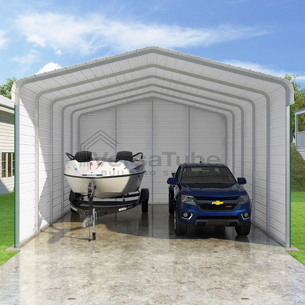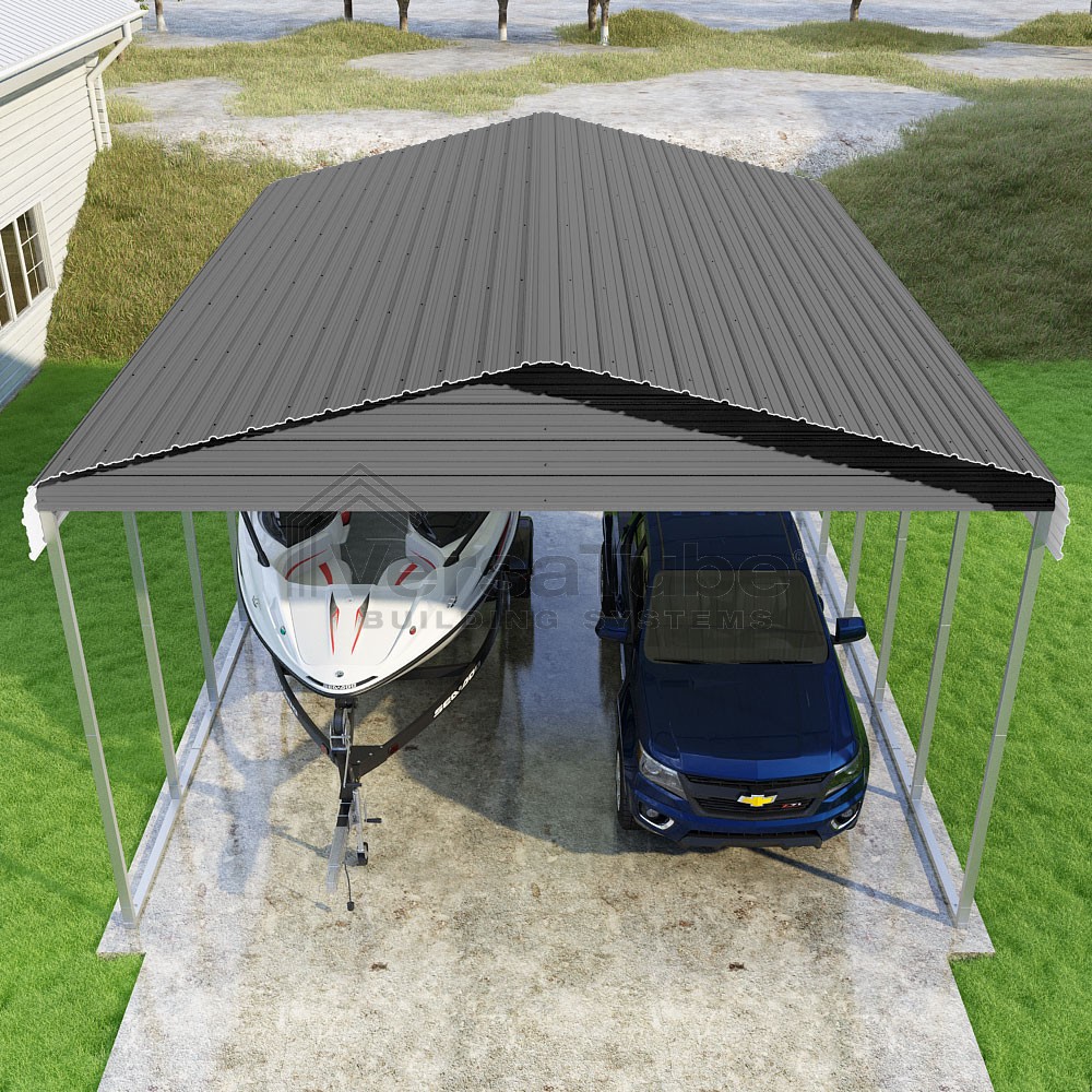 Classic Series DIY carport kit features horizontal application of sheet metal panels with the extra protection of rounded eaves.