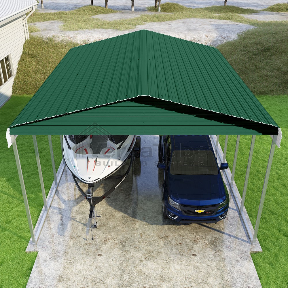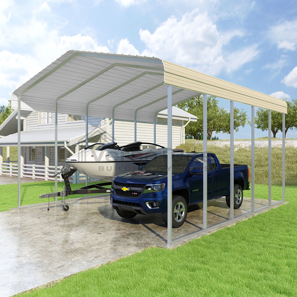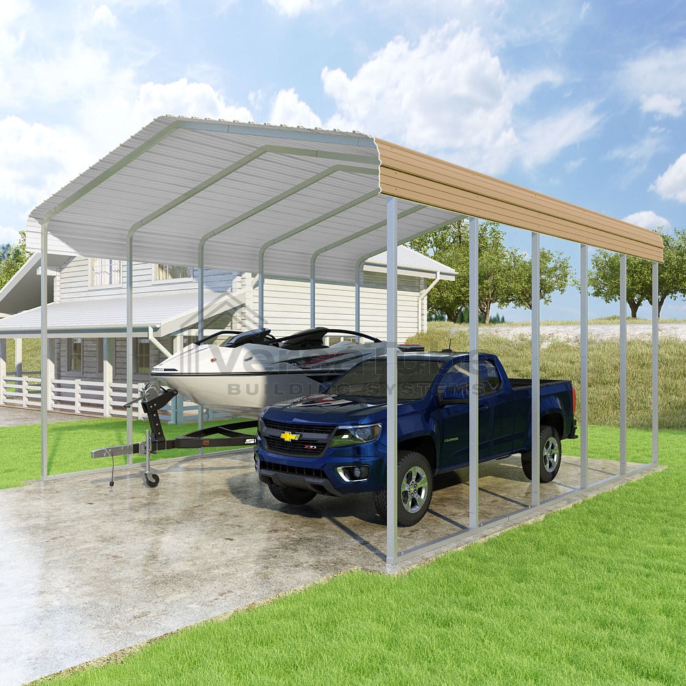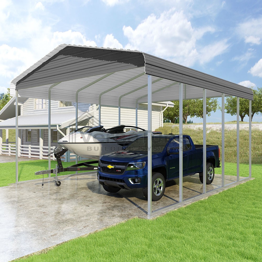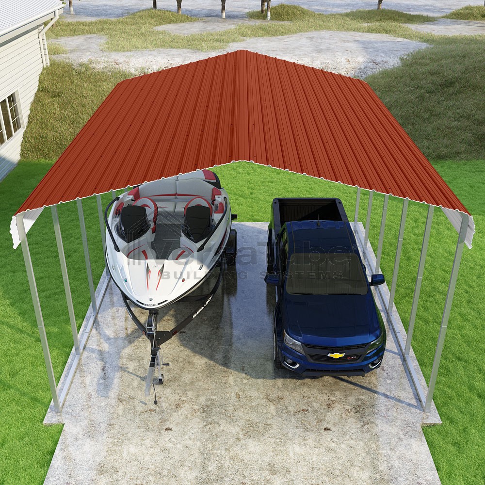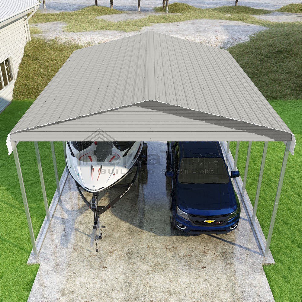 Classic Series DIY carport kit features horizontal application of sheet metal panels with the extra protection of rounded eaves.