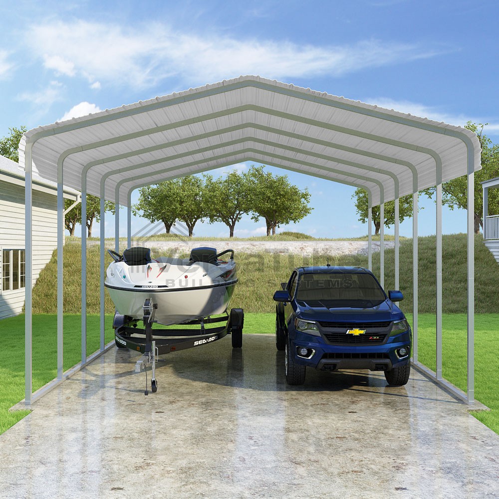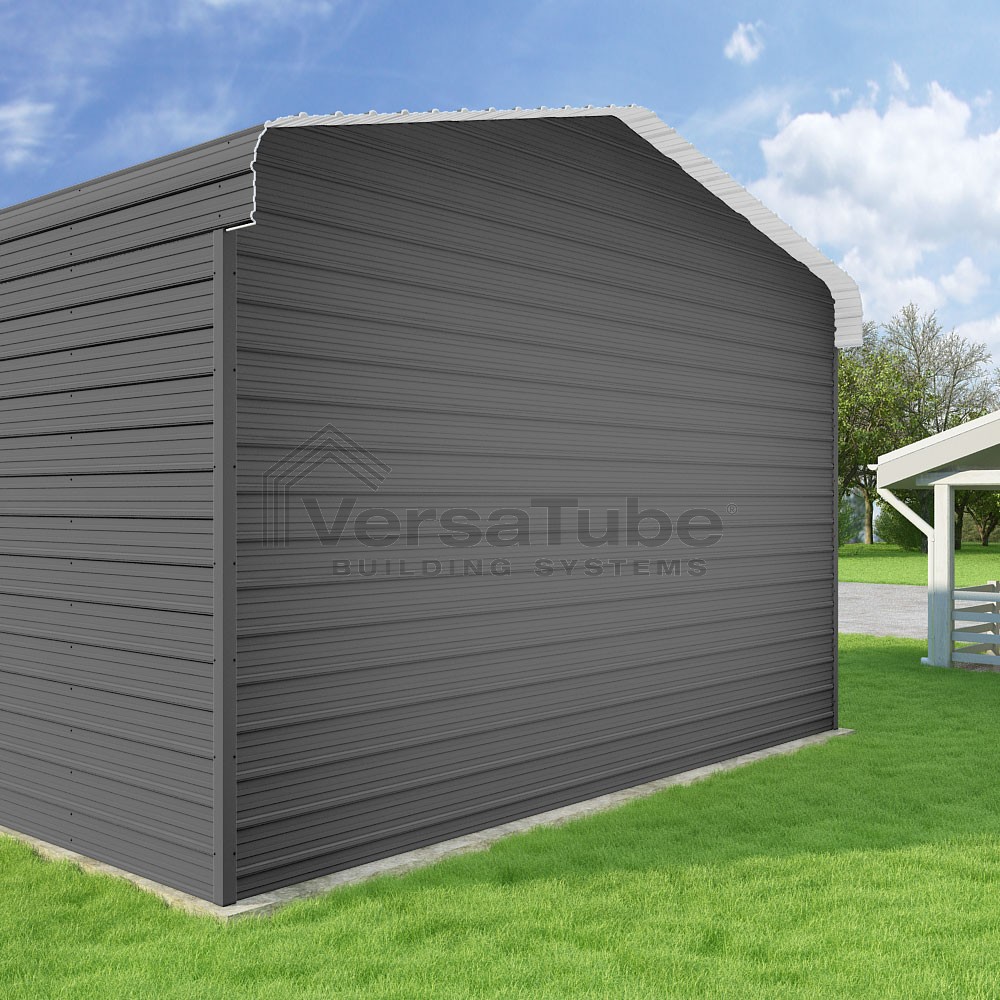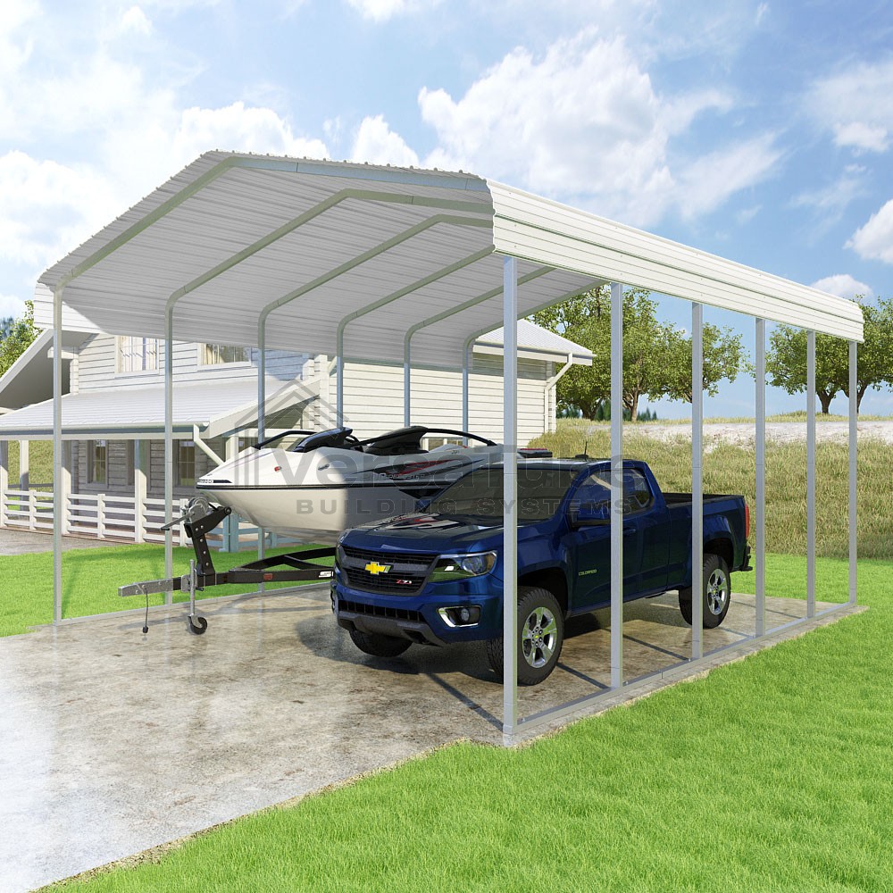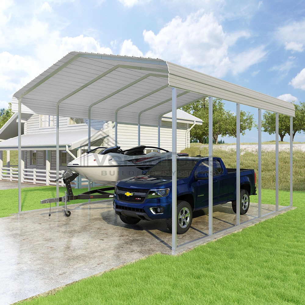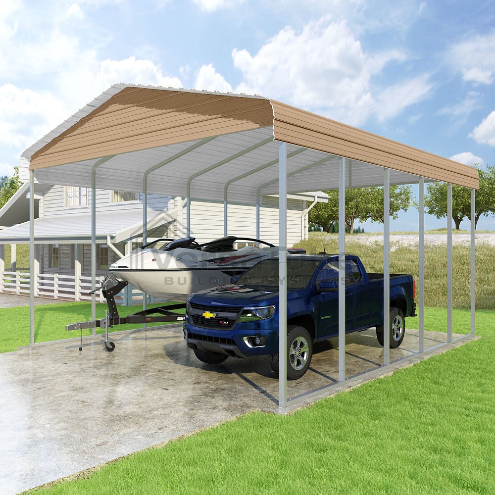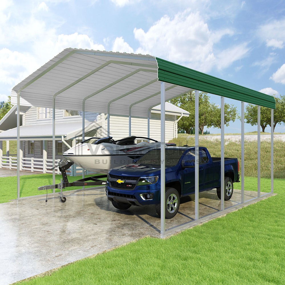 Classic Series DIY carport kit features horizontal application of sheet metal panels with the extra protection of rounded eaves.