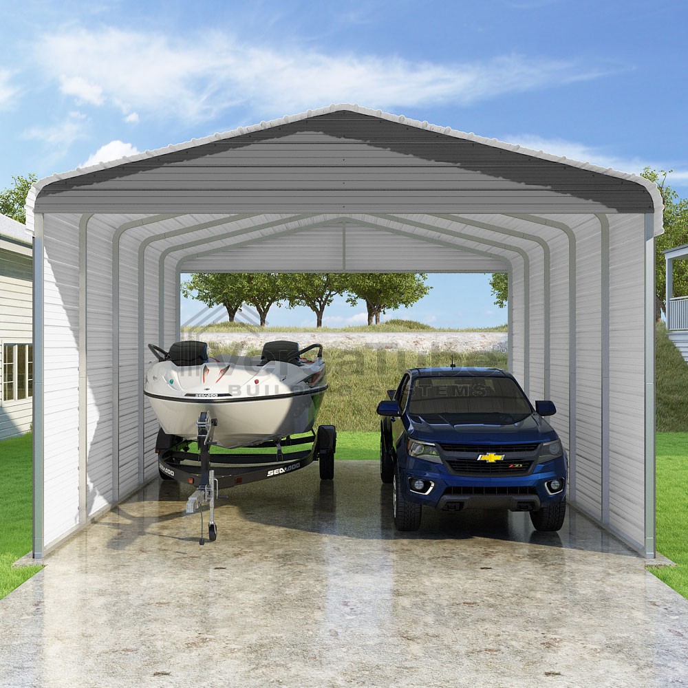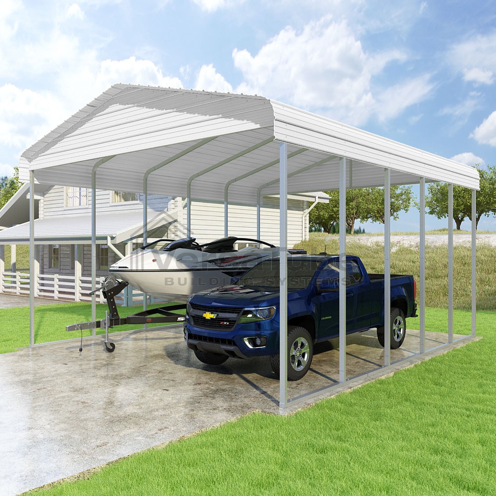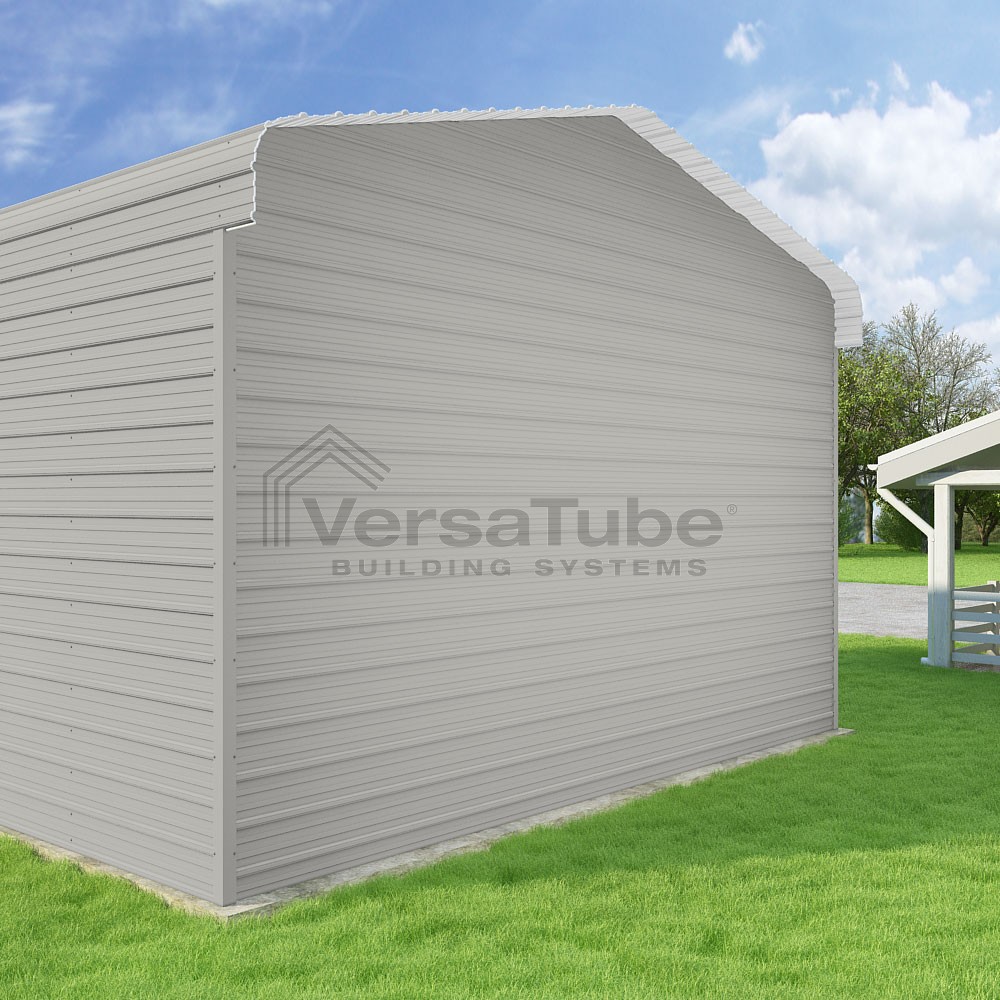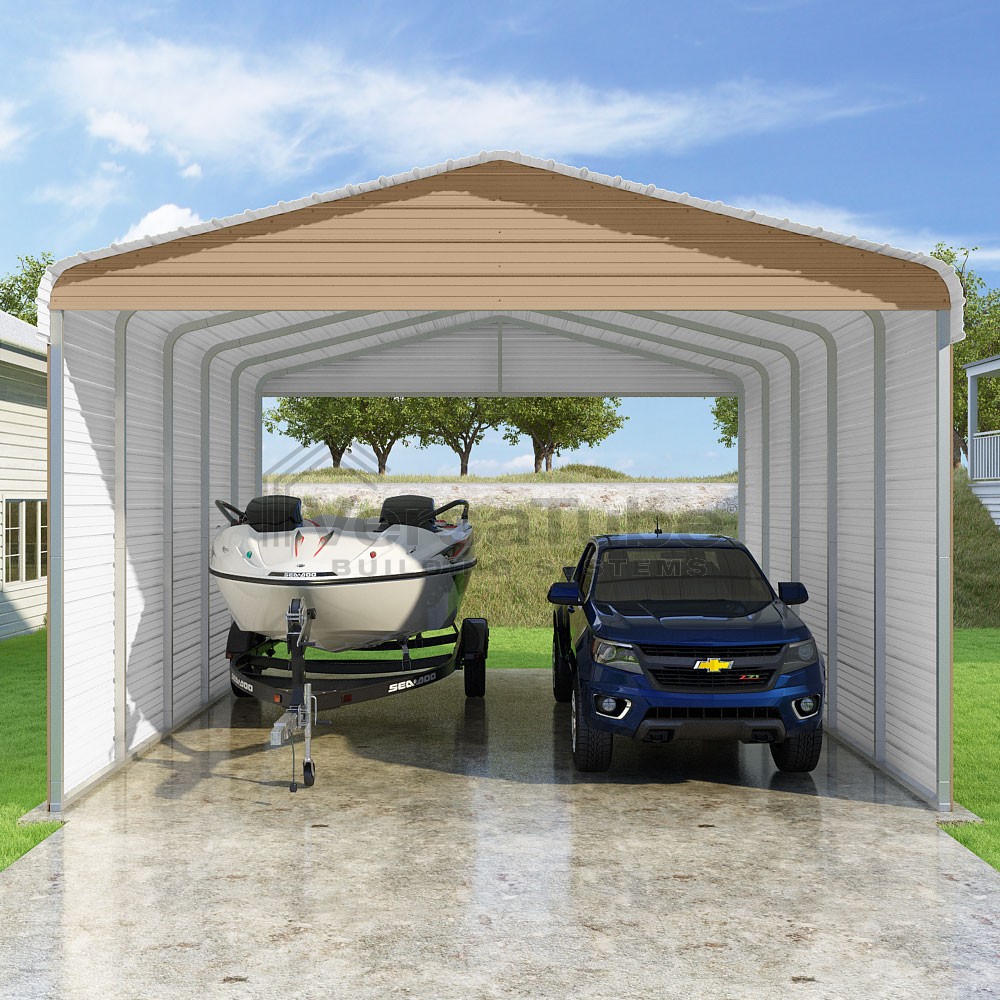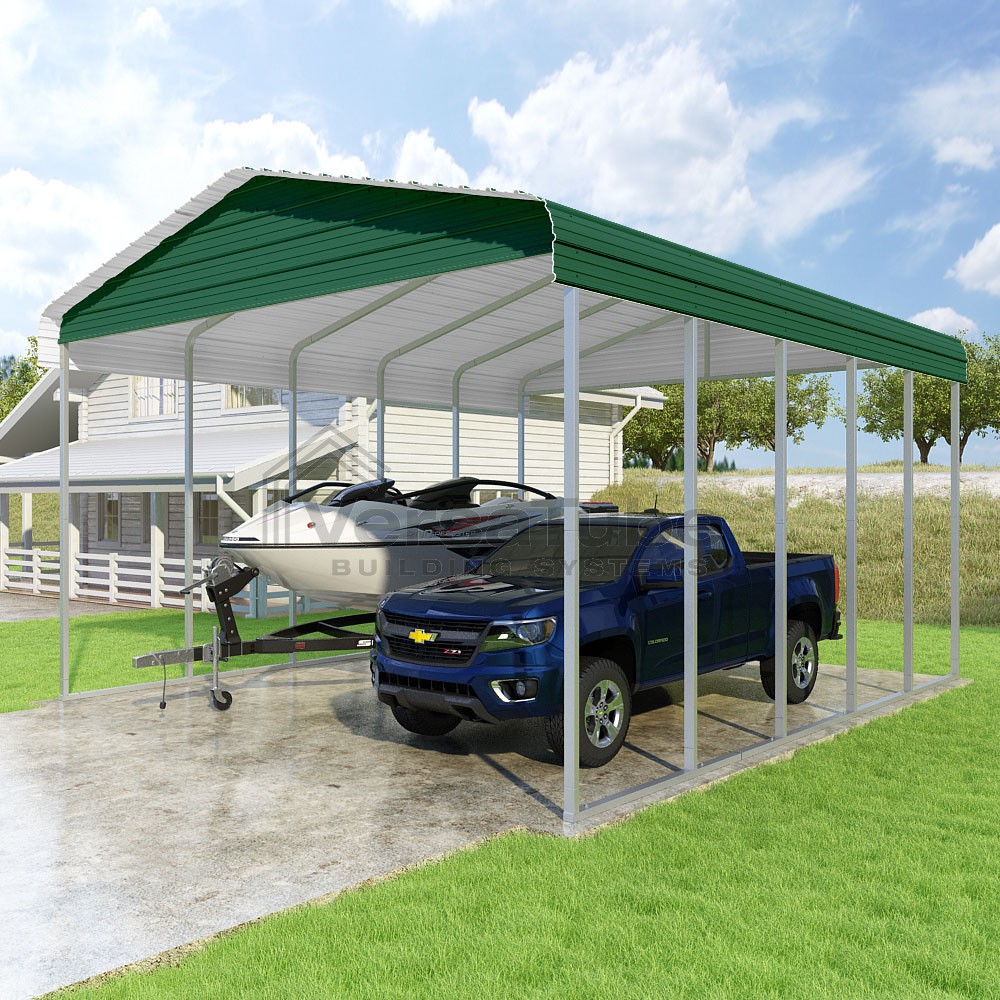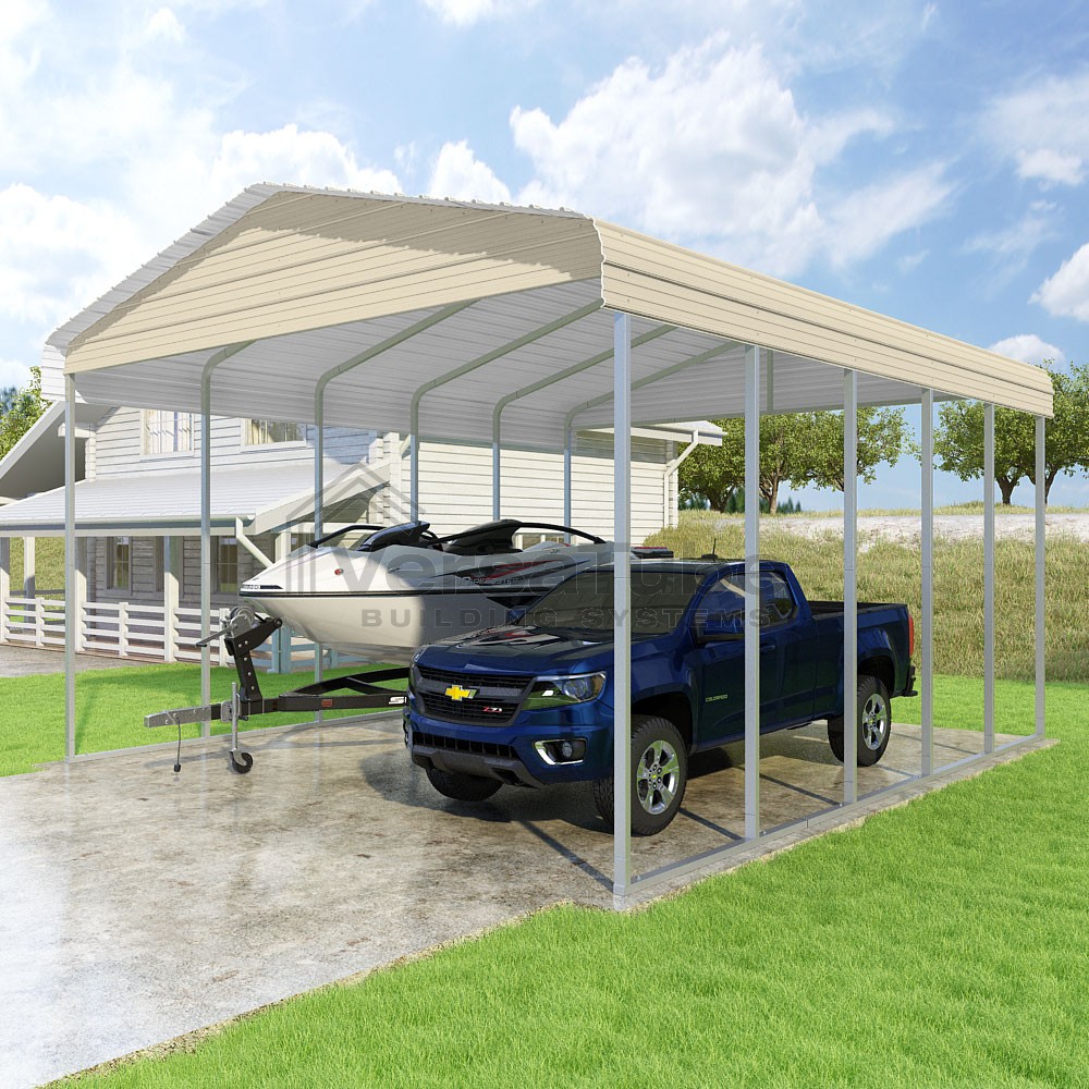 Classic Series DIY carport kit features horizontal application of sheet metal panels with the extra protection of rounded eaves.