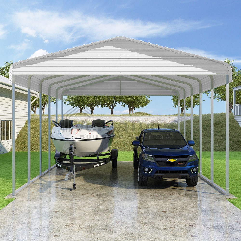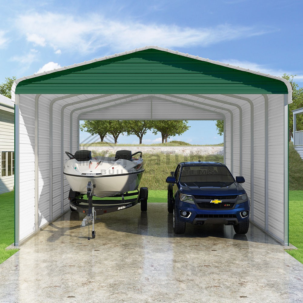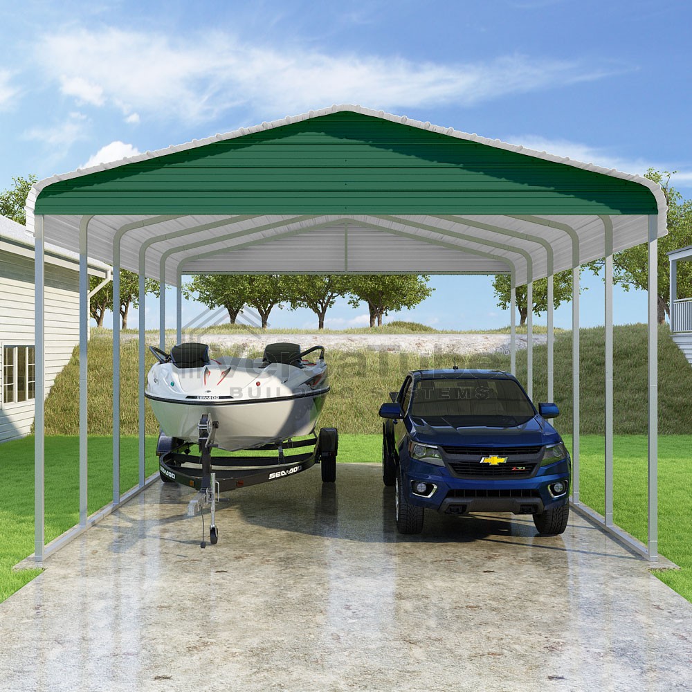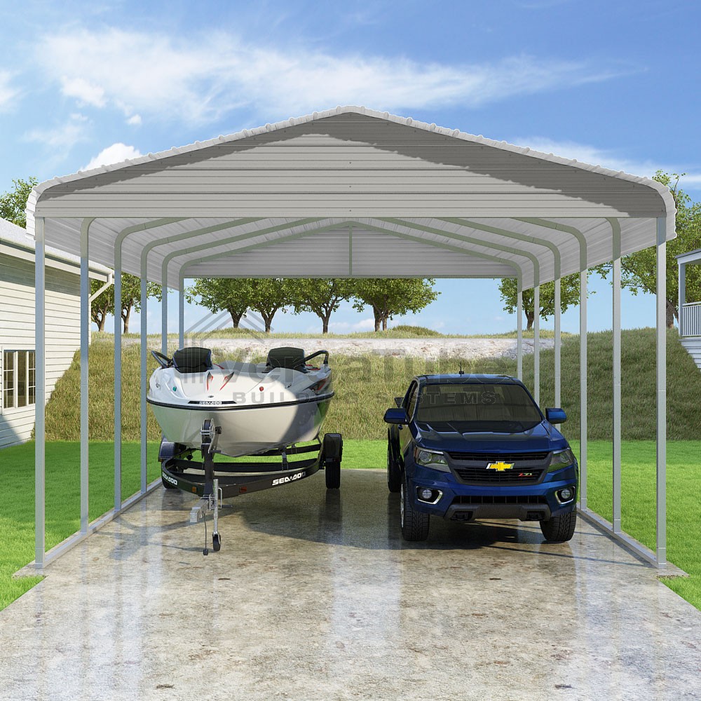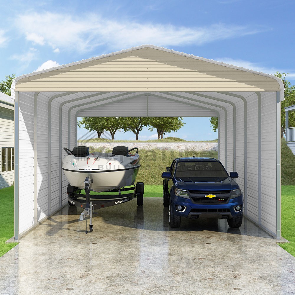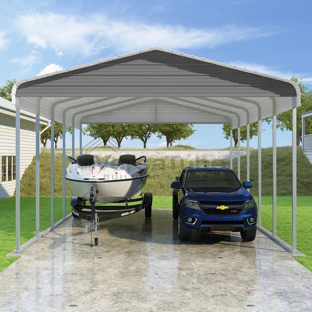 Classic Series DIY carport kit features horizontal application of sheet metal panels with the extra protection of rounded eaves.