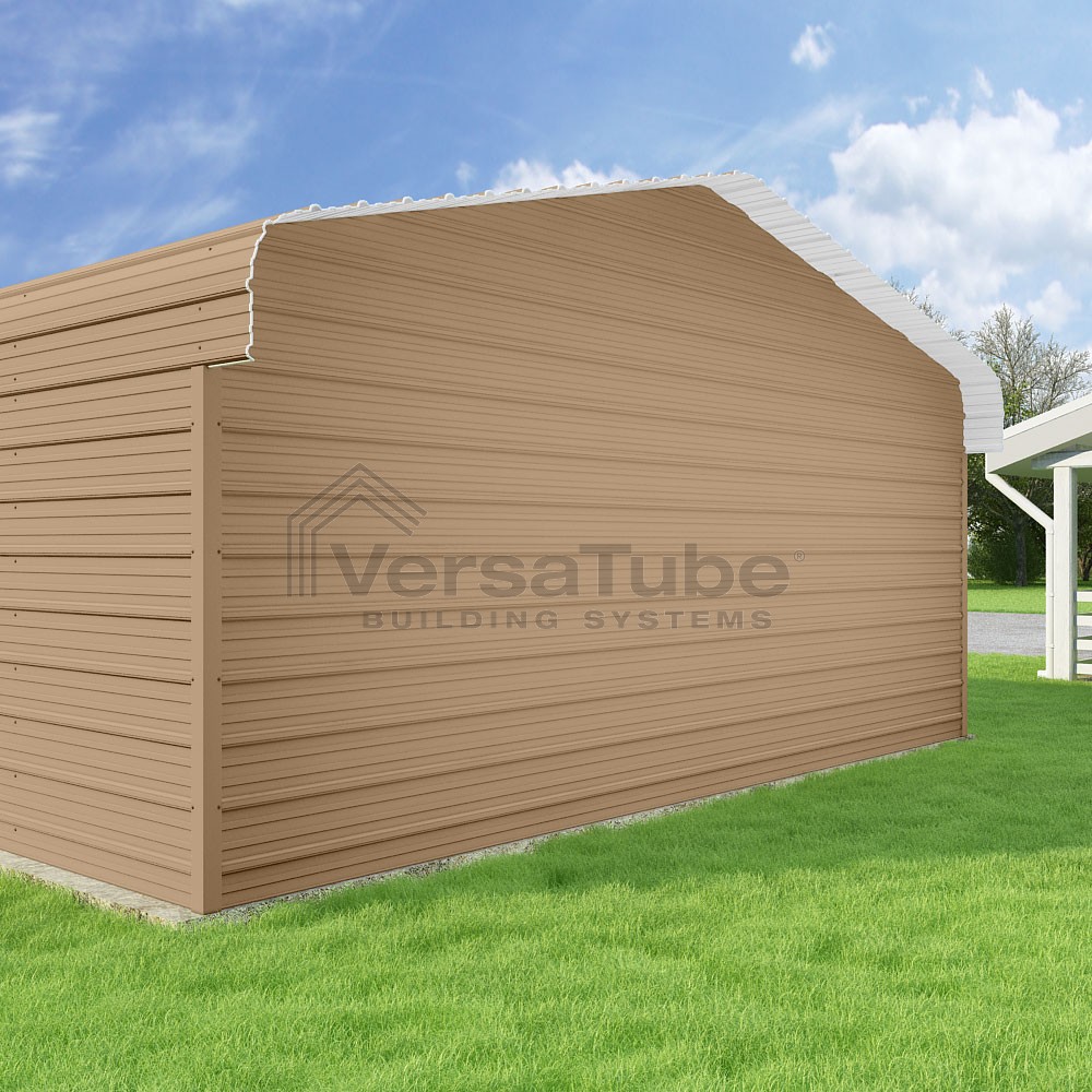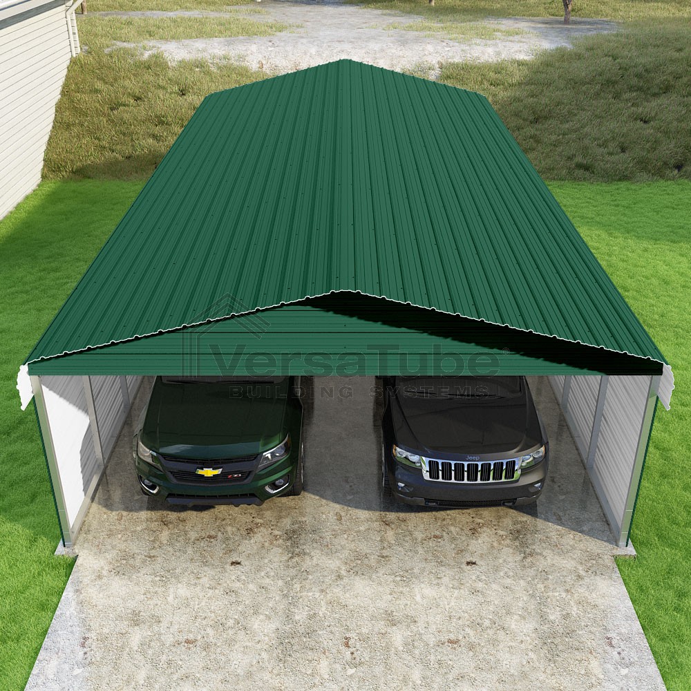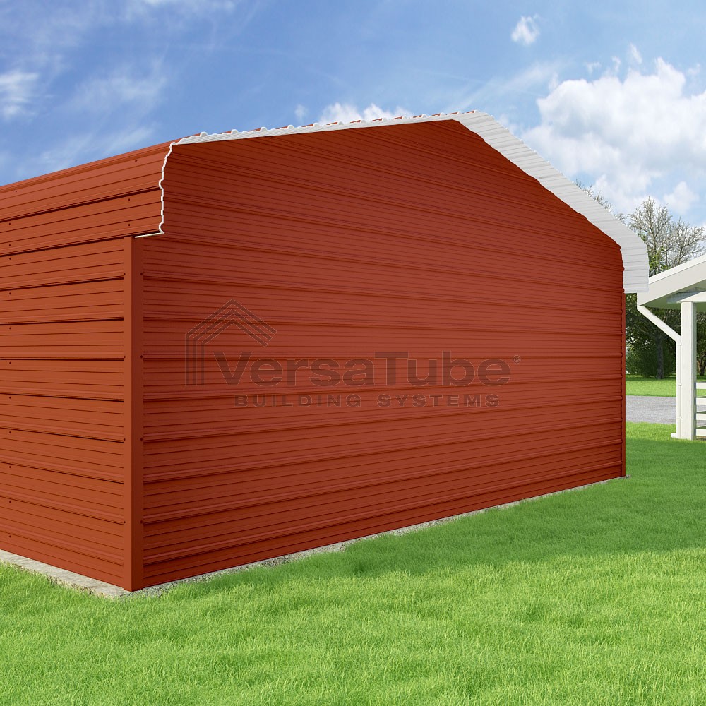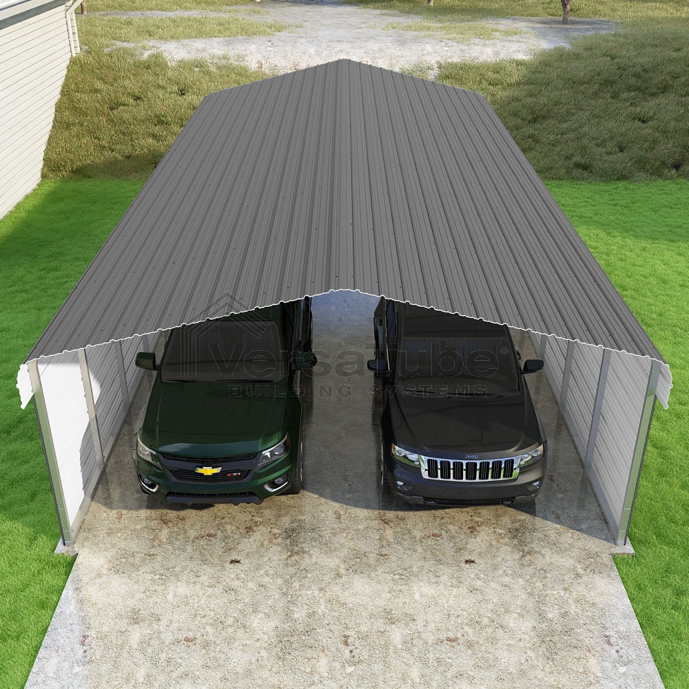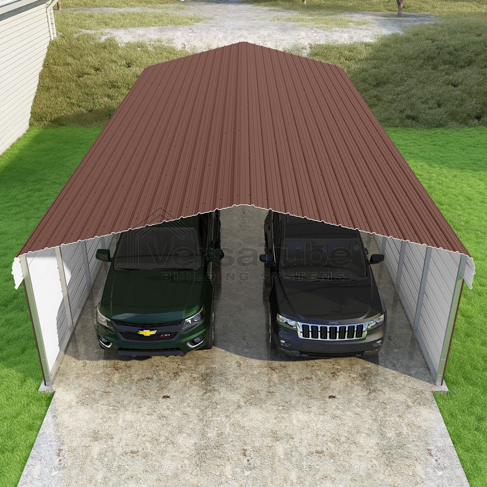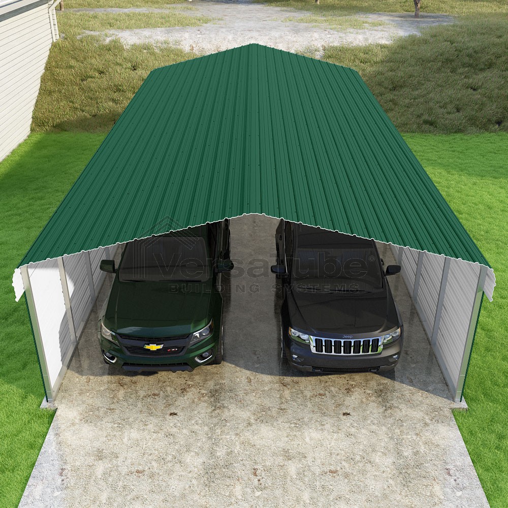 Classic Series DIY carport kit features horizontal application of sheet metal panels with the extra protection of rounded eaves.
