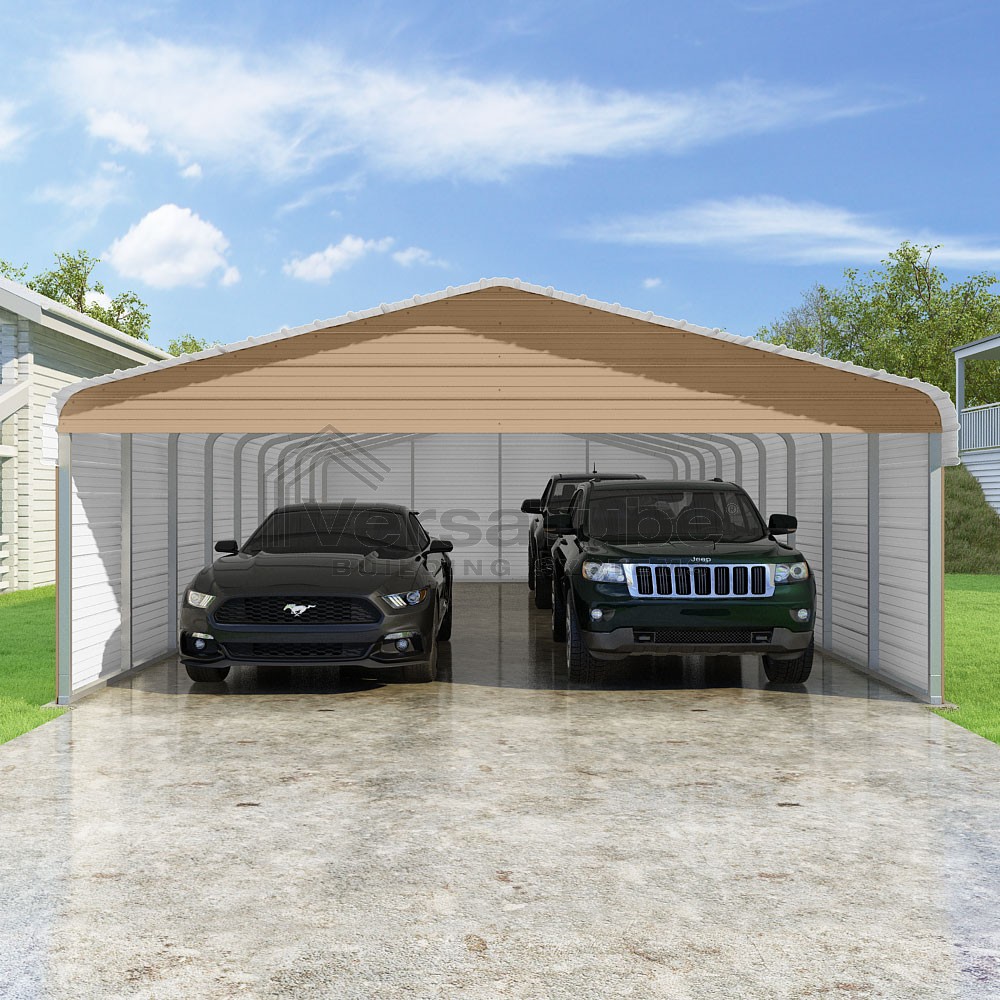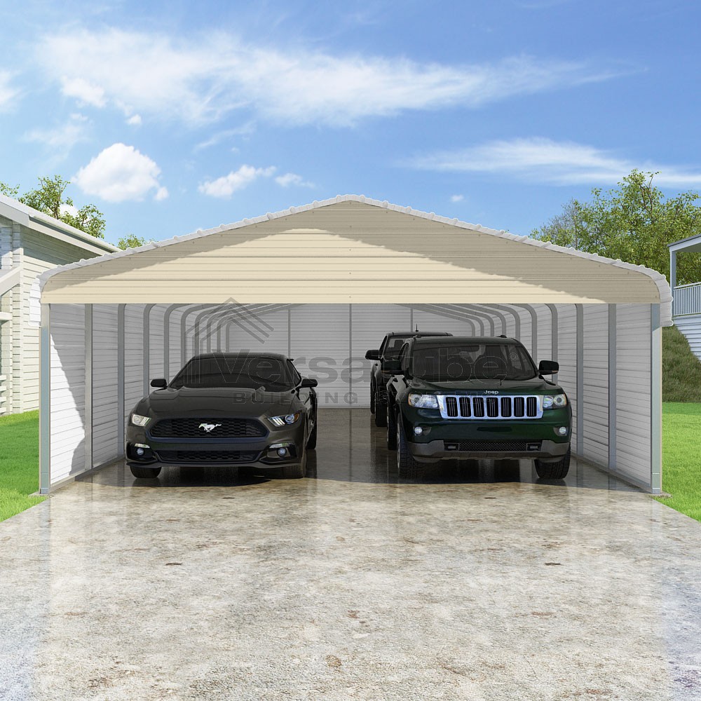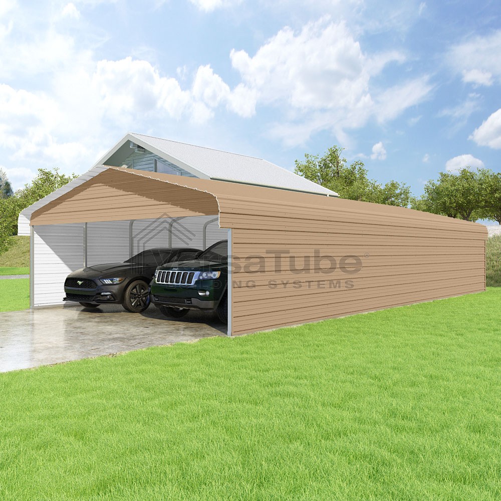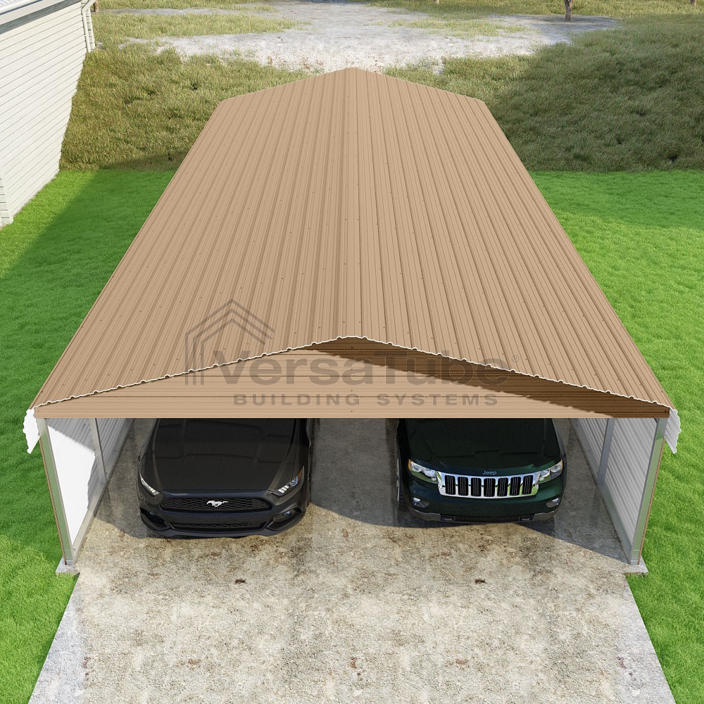 Classic Series DIY carport kit features horizontal application of sheet metal panels with the extra protection of rounded eaves.