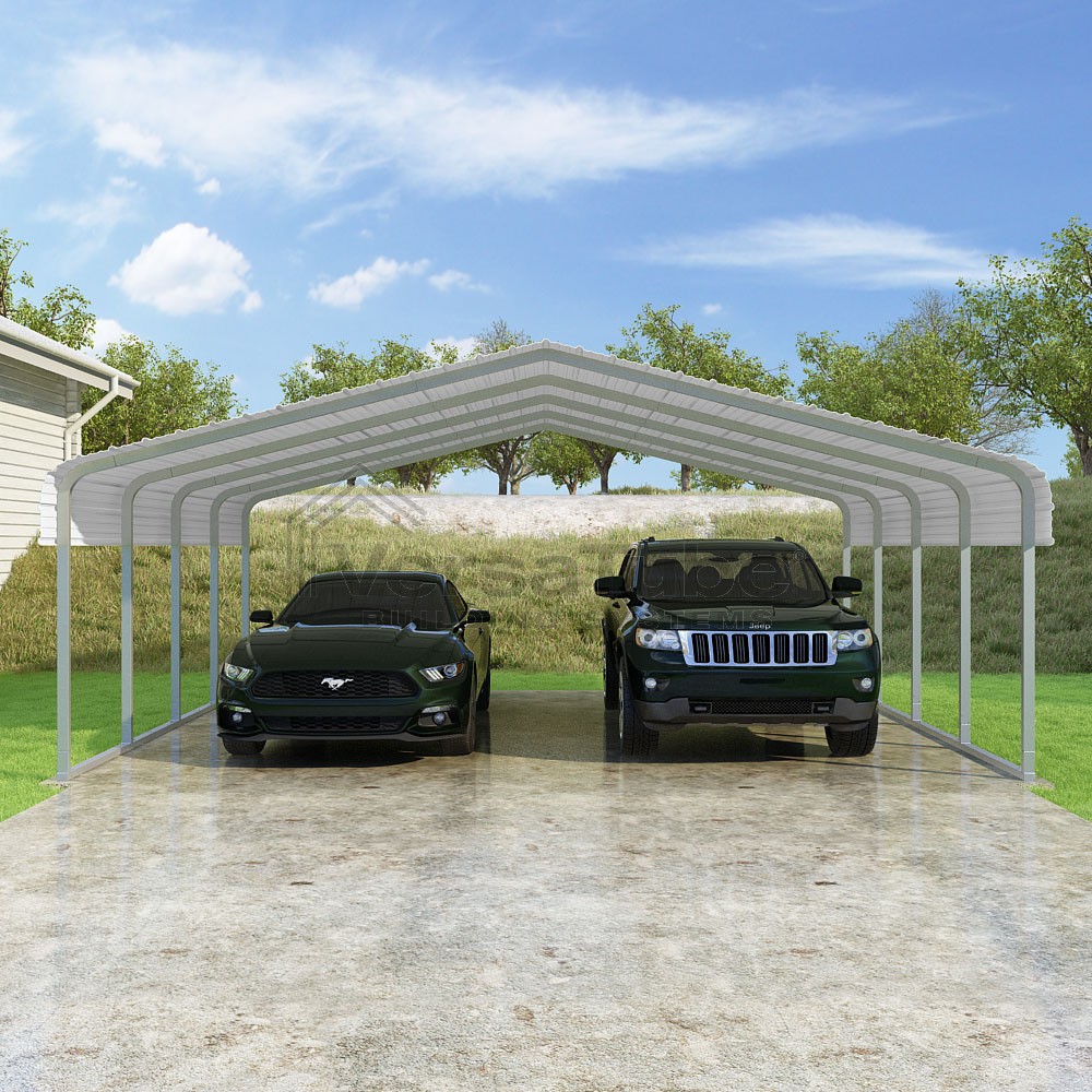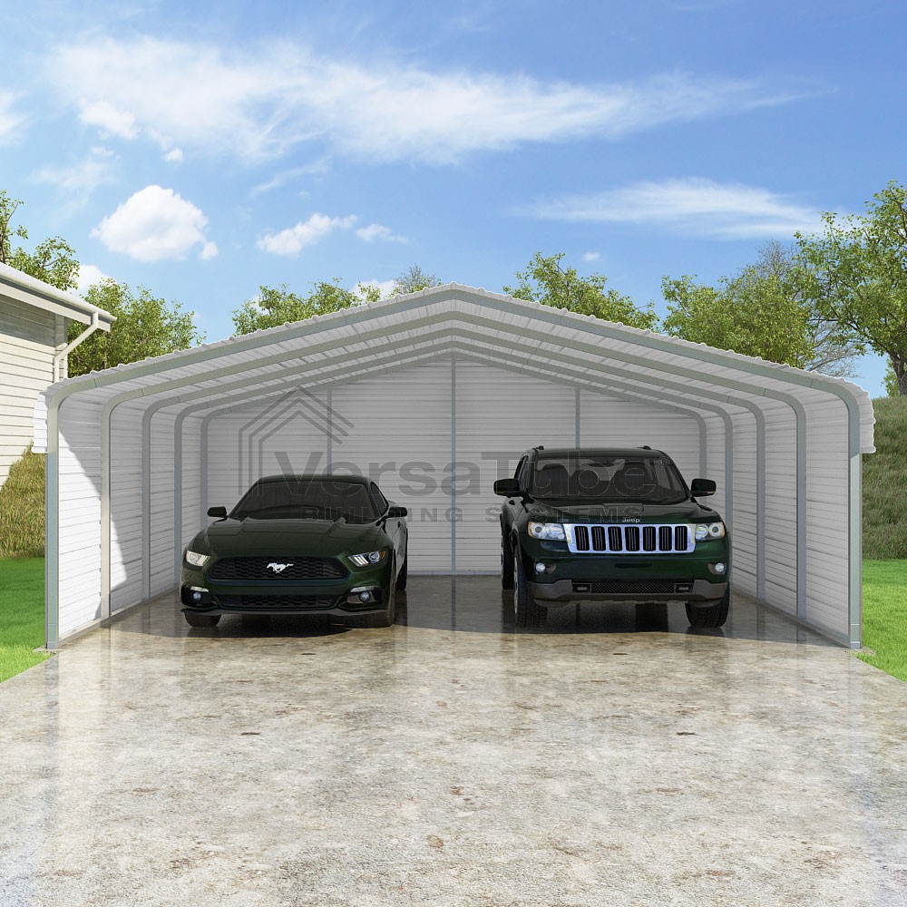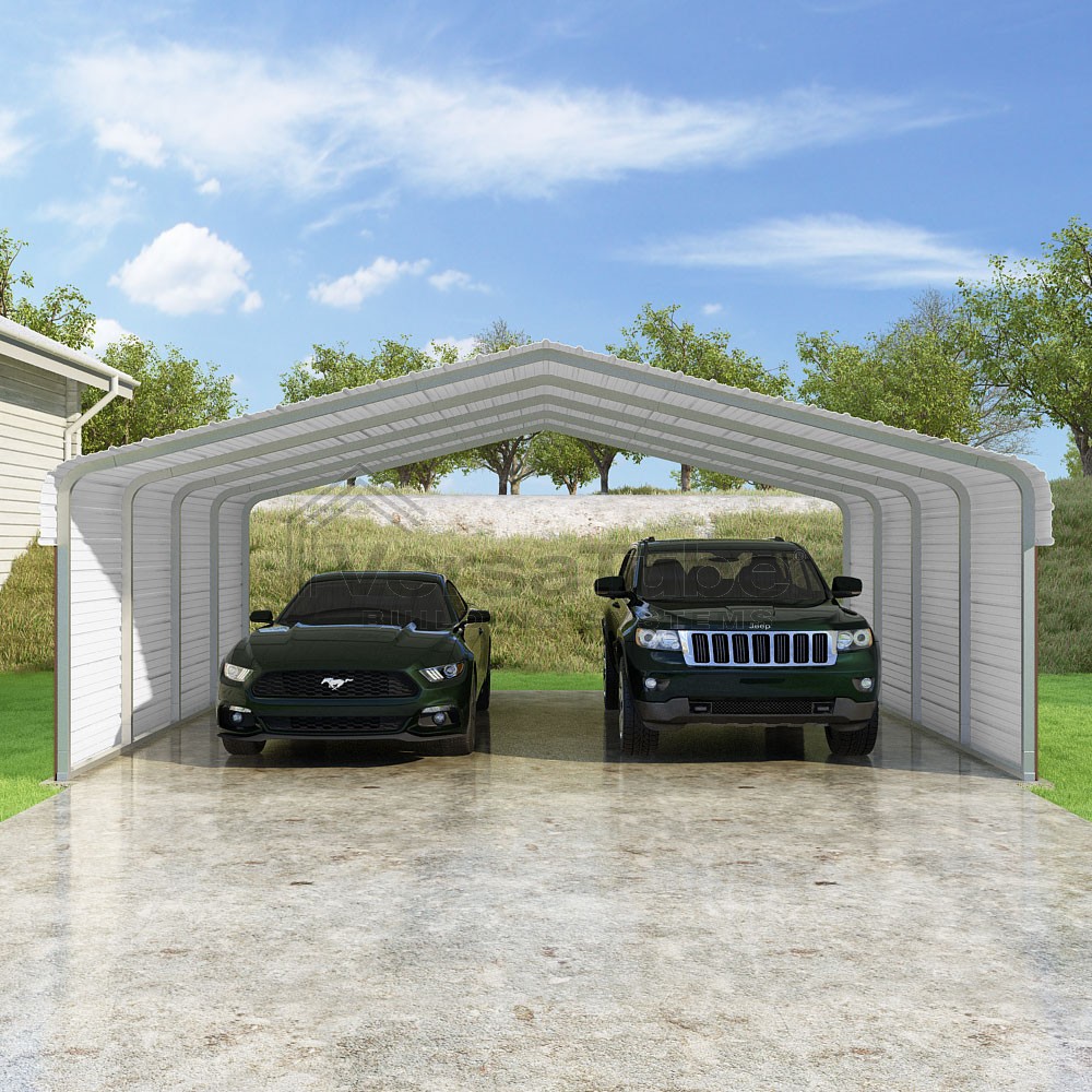 Classic Series DIY carport kit features horizontal application of sheet metal panels with the extra protection of rounded eaves.