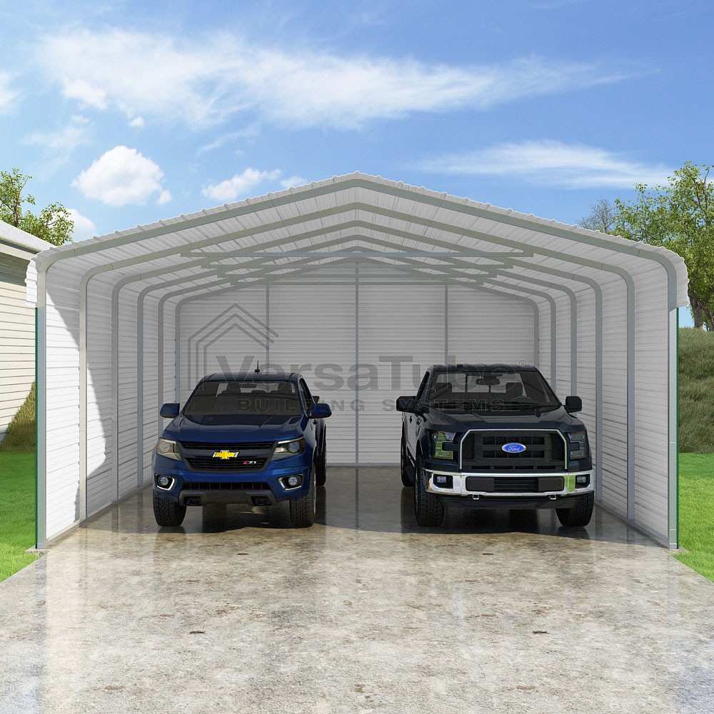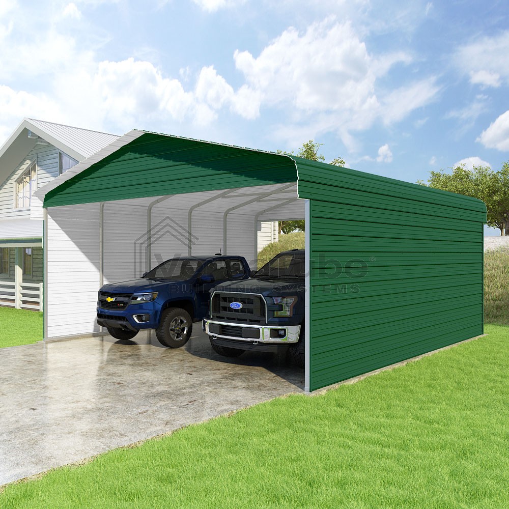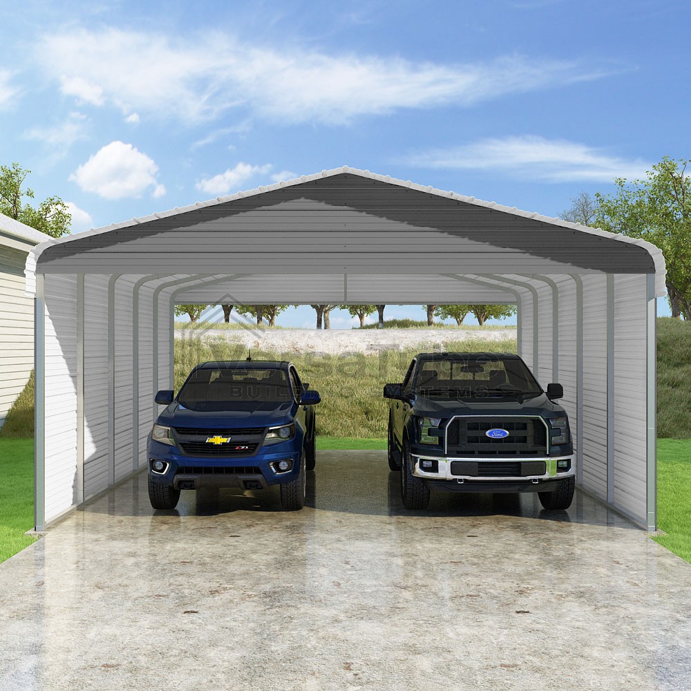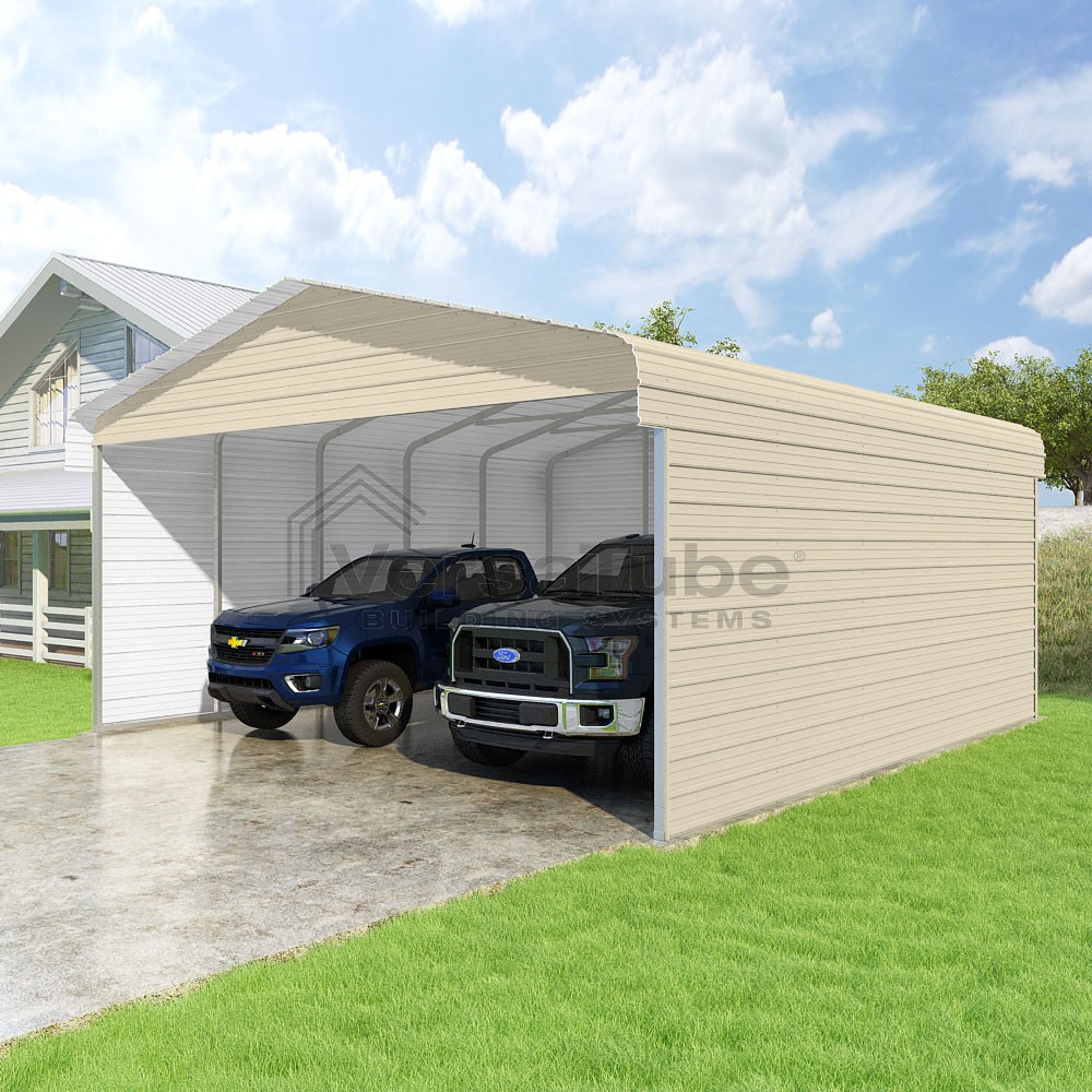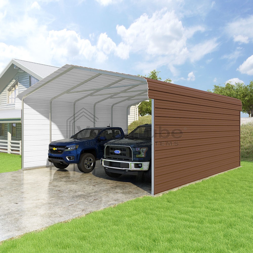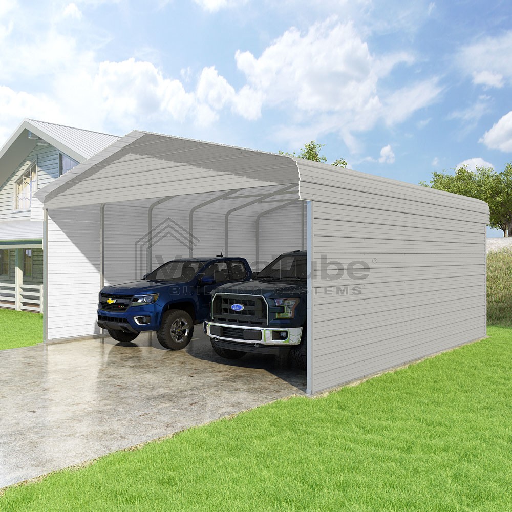 Classic Series DIY carport kit features horizontal application of sheet metal panels with the extra protection of rounded eaves.