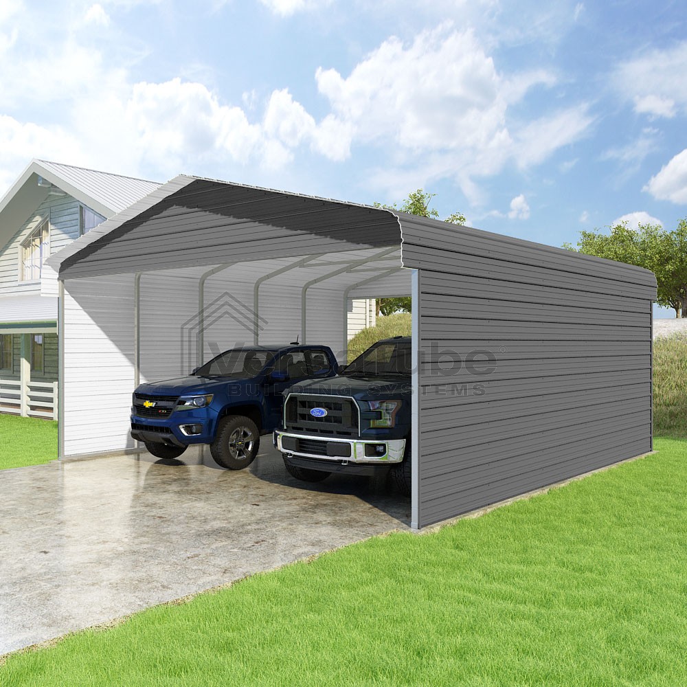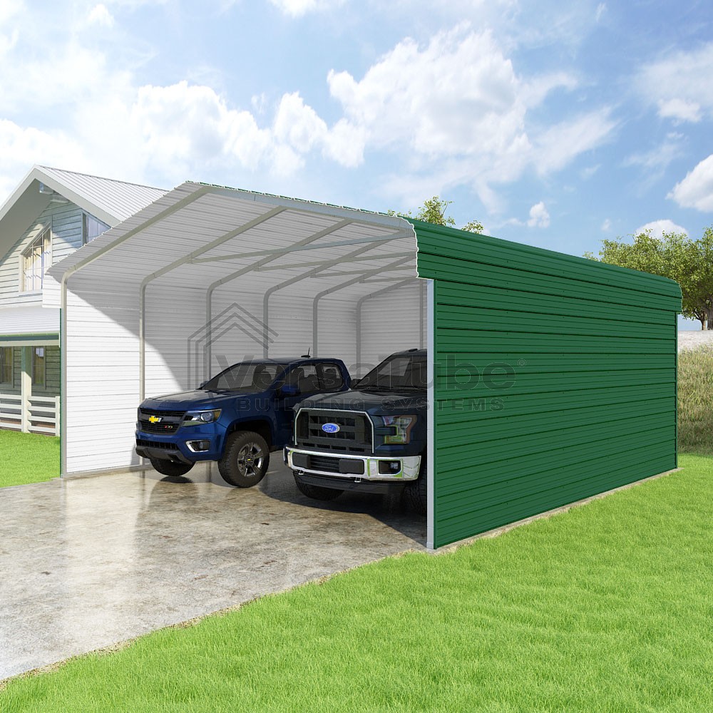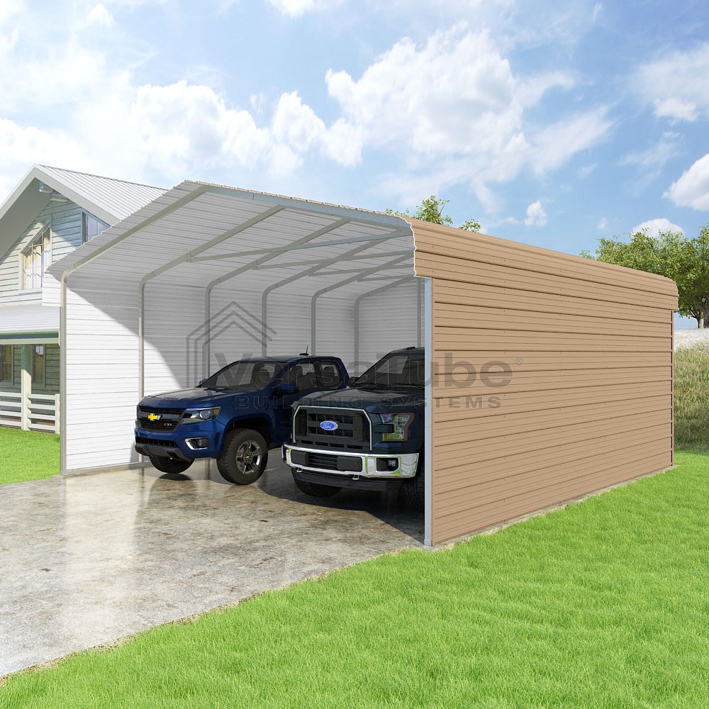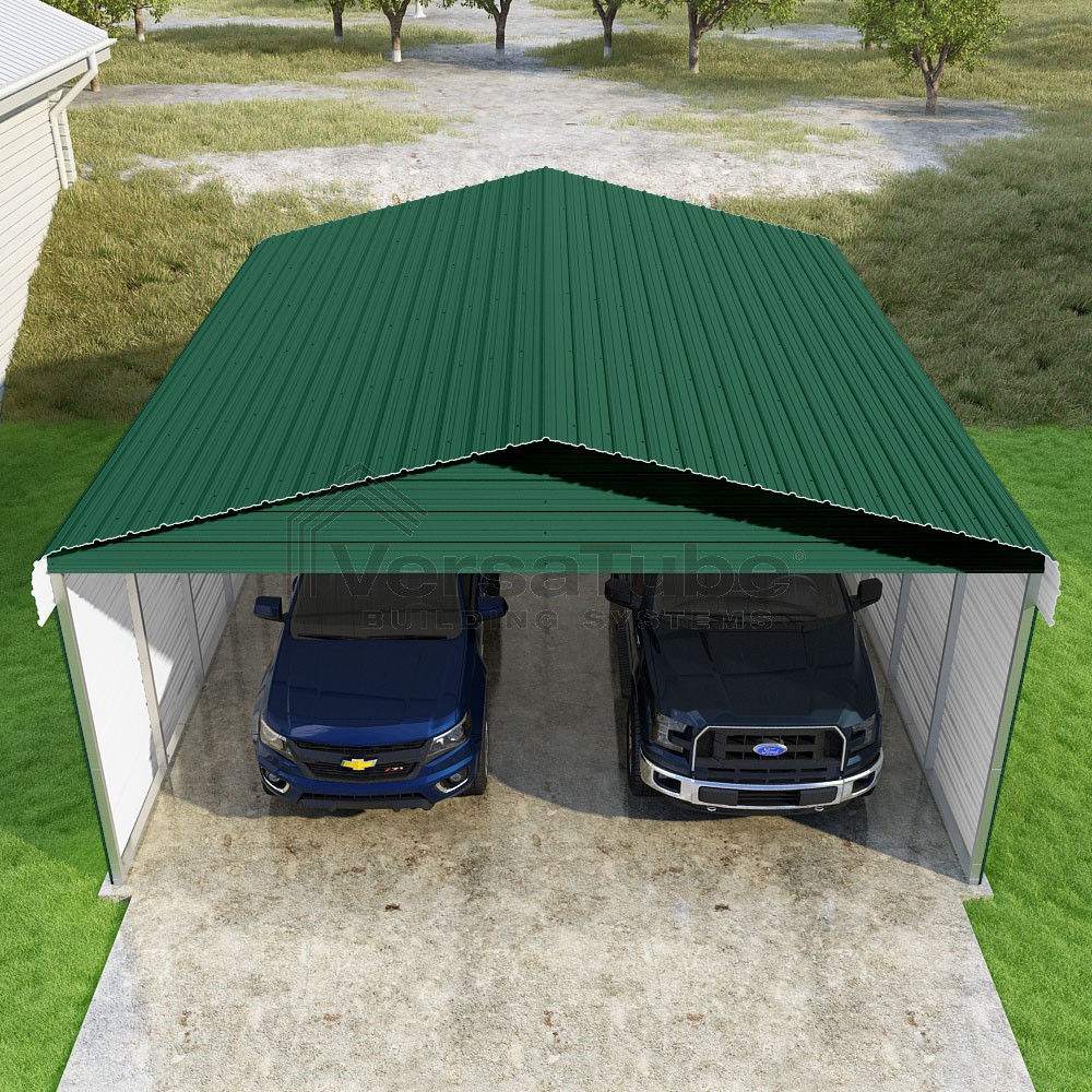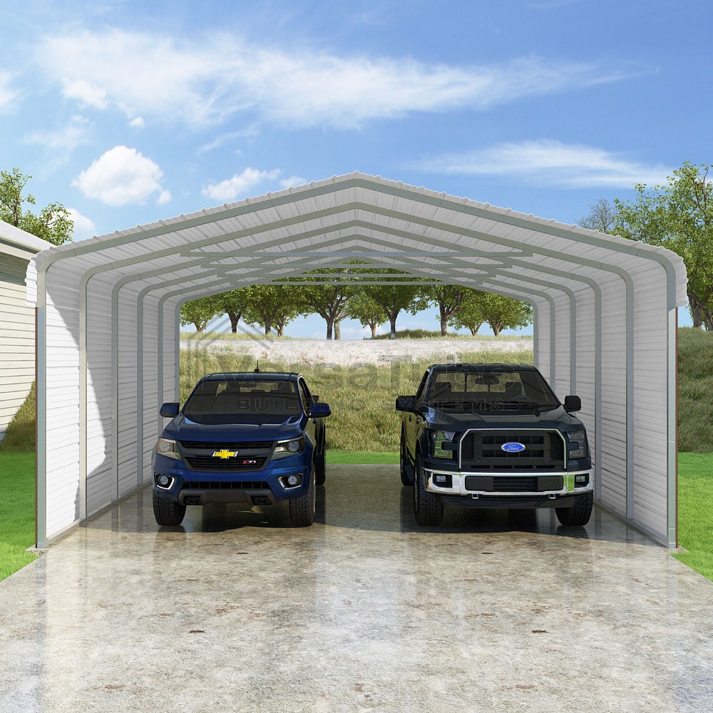 Classic Series DIY carport kit features horizontal application of sheet metal panels with the extra protection of rounded eaves.