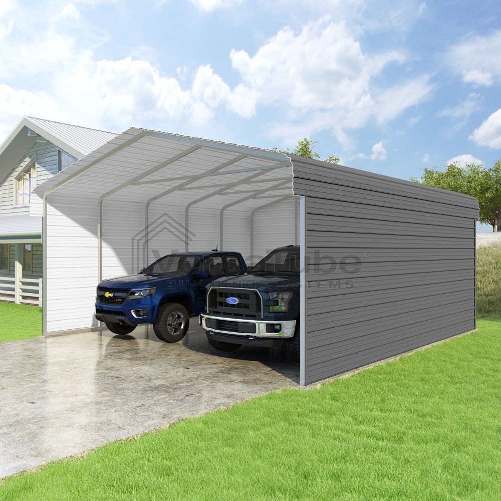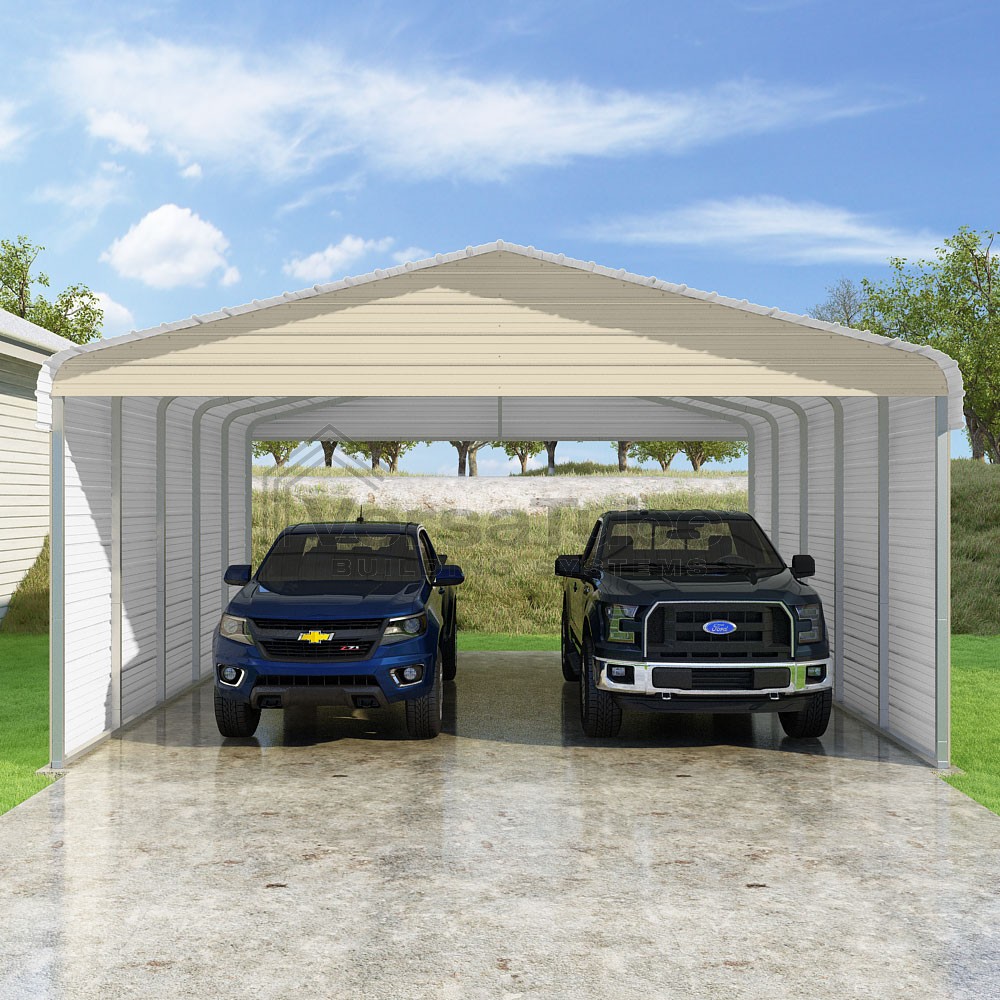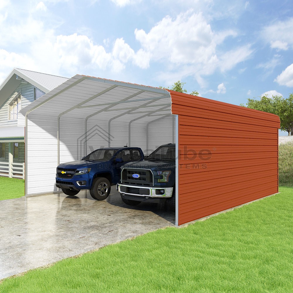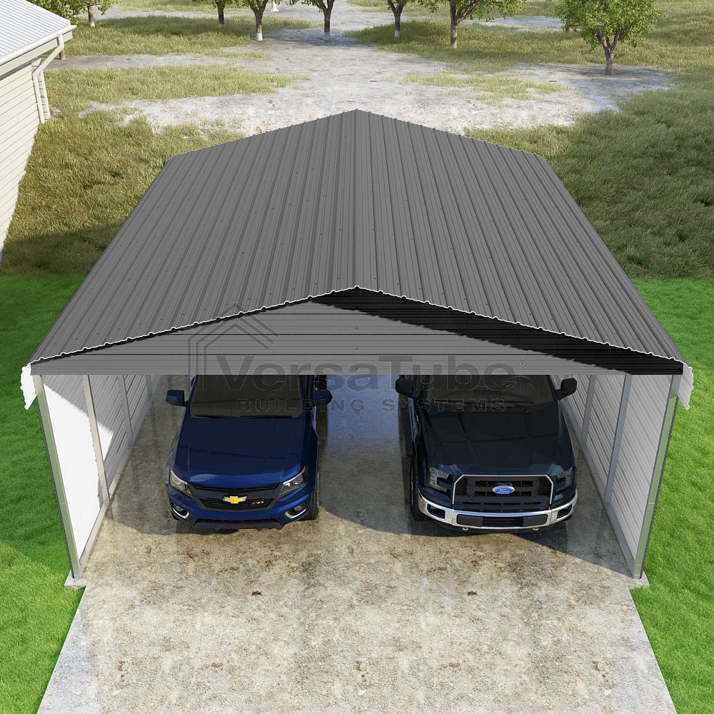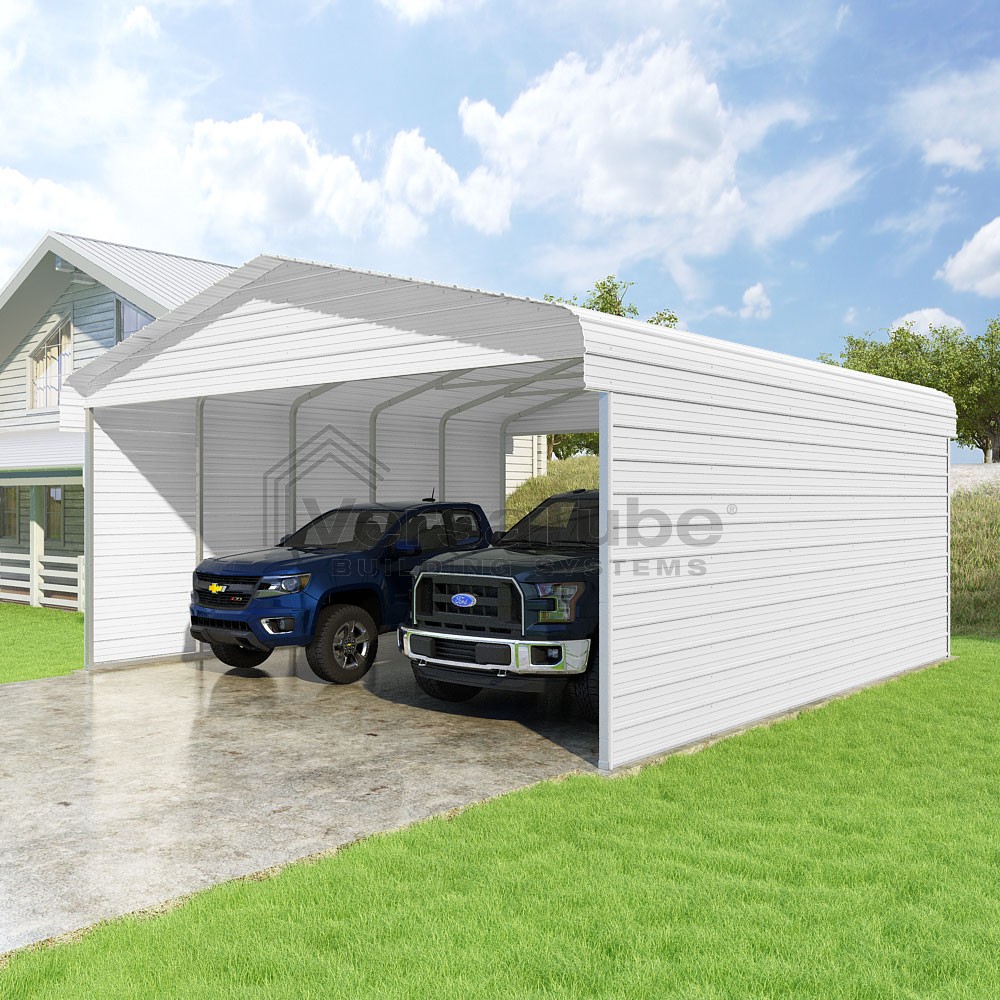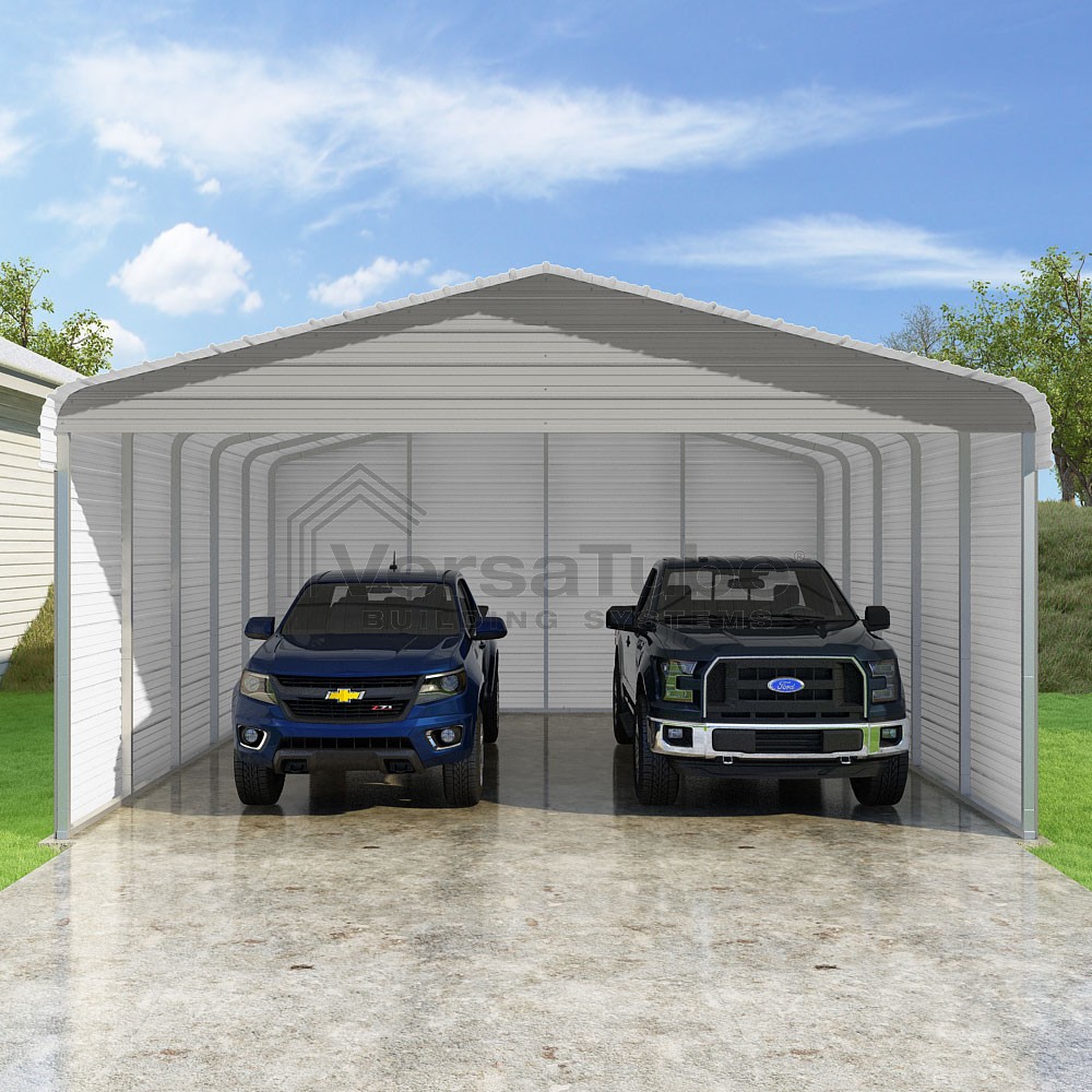 Classic Series DIY carport kit features horizontal application of sheet metal panels with the extra protection of rounded eaves.