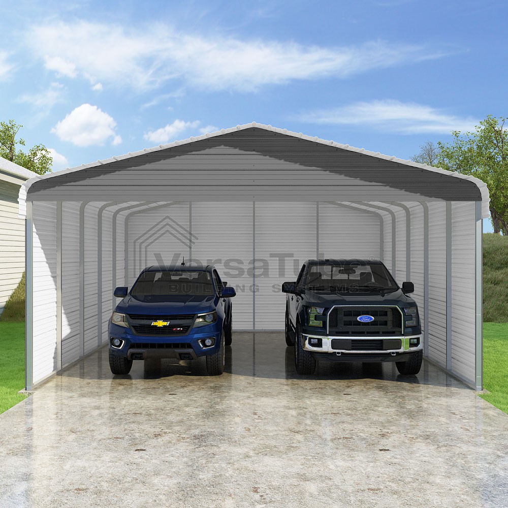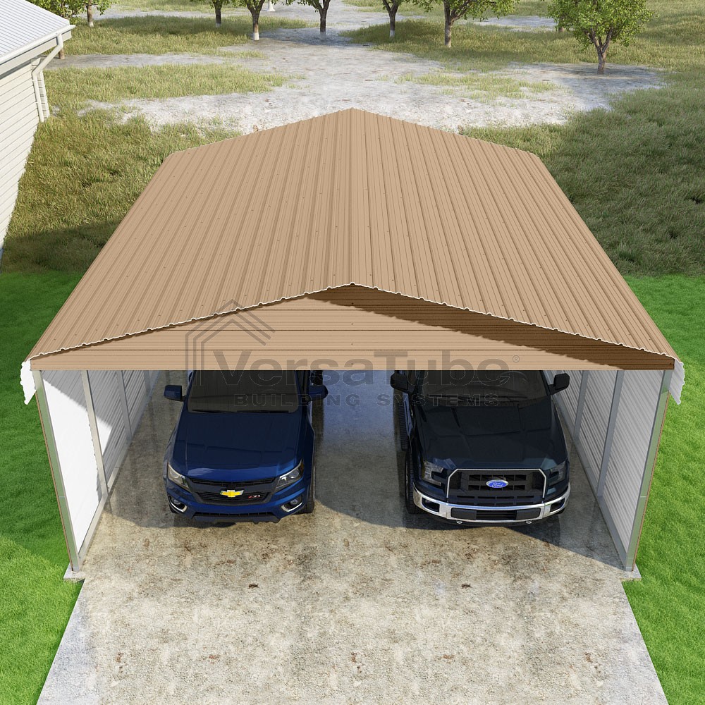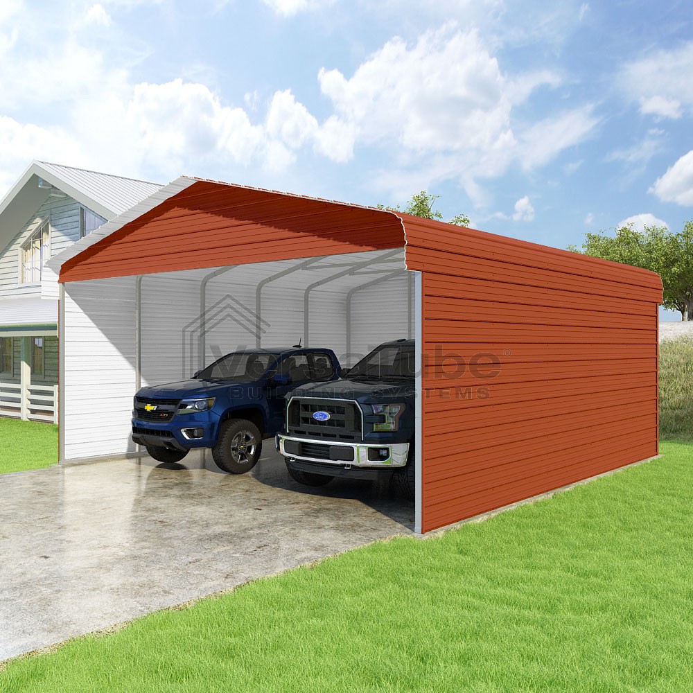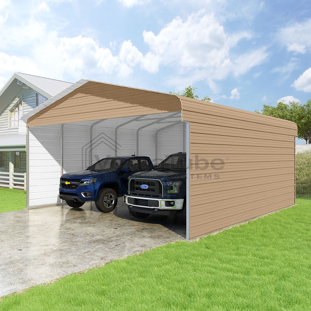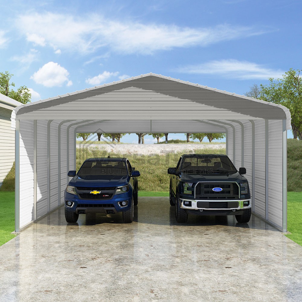 Classic Series DIY carport kit features horizontal application of sheet metal panels with the extra protection of rounded eaves.
