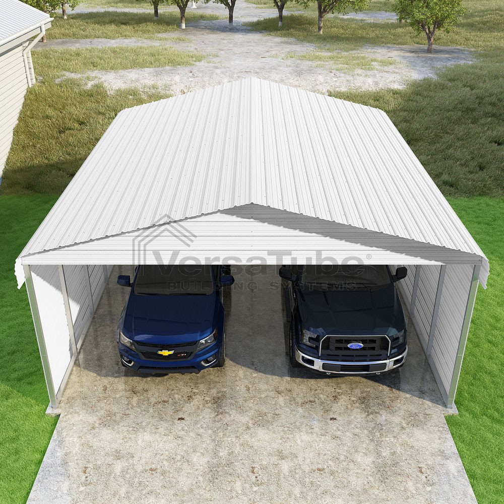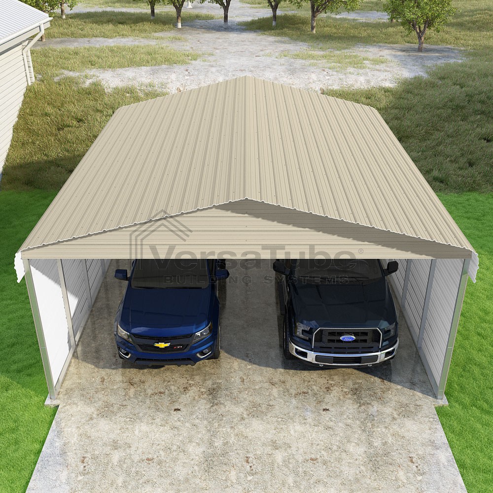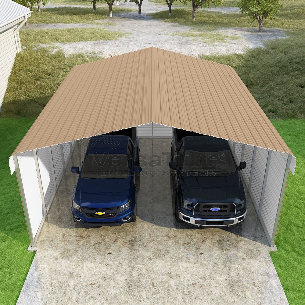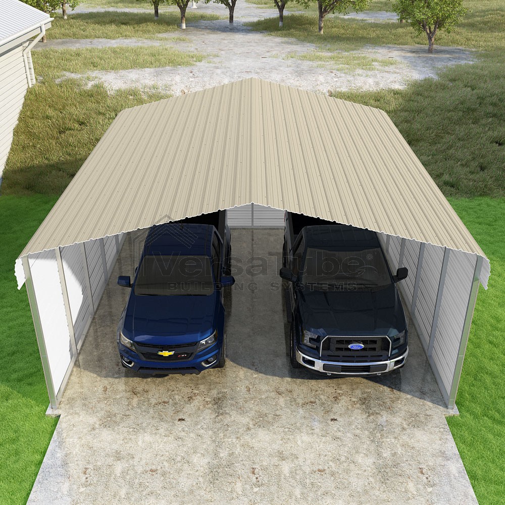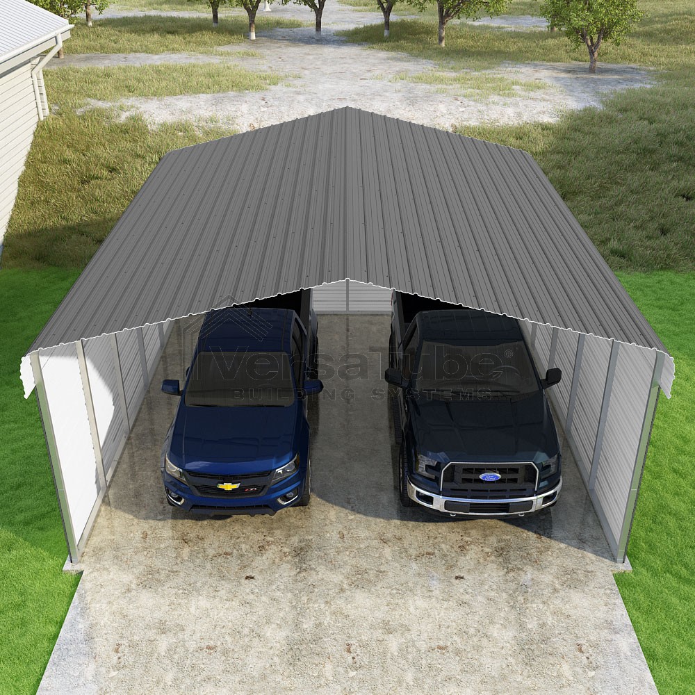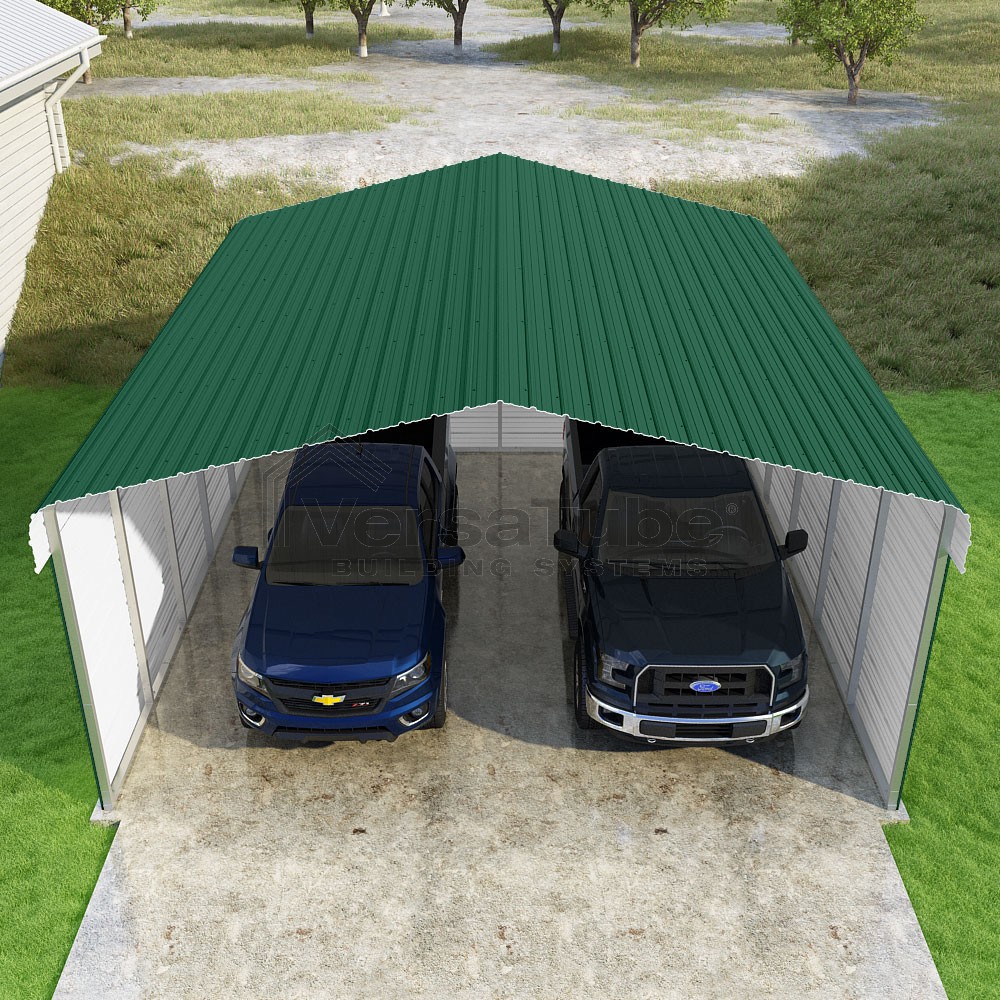 Classic Series DIY carport kit features horizontal application of sheet metal panels with the extra protection of rounded eaves.