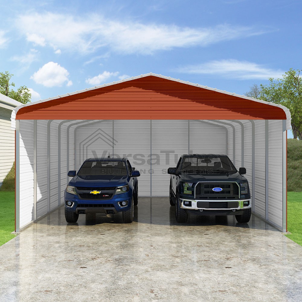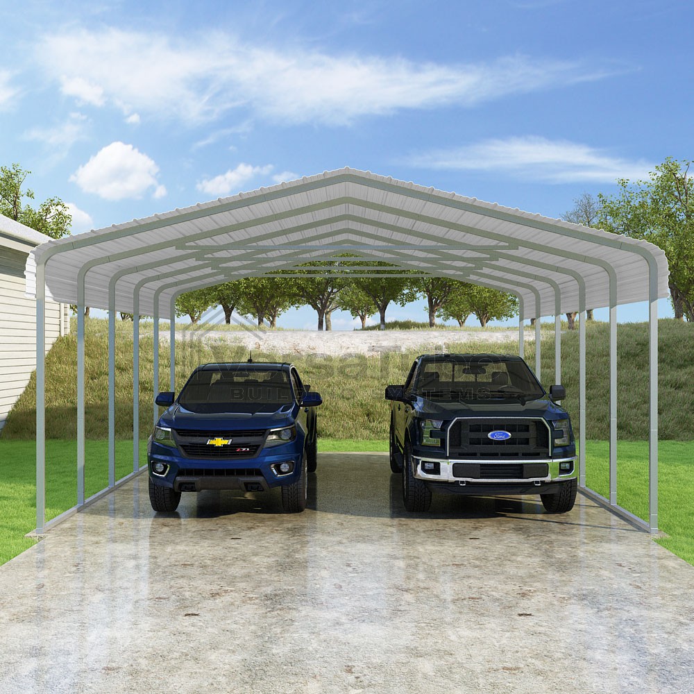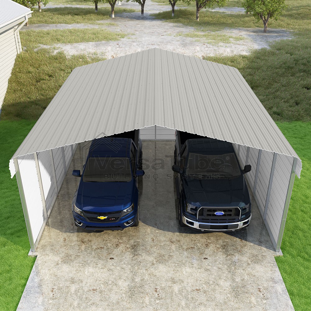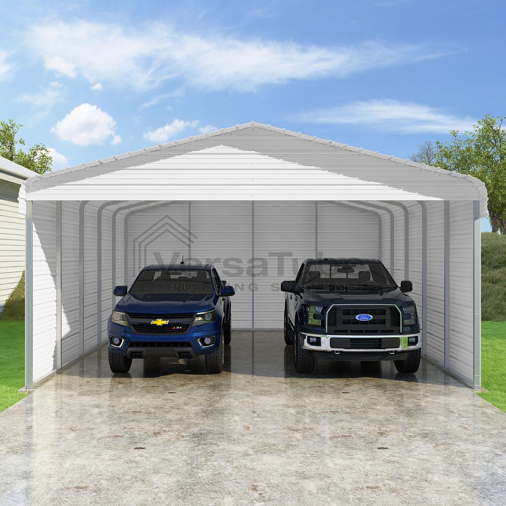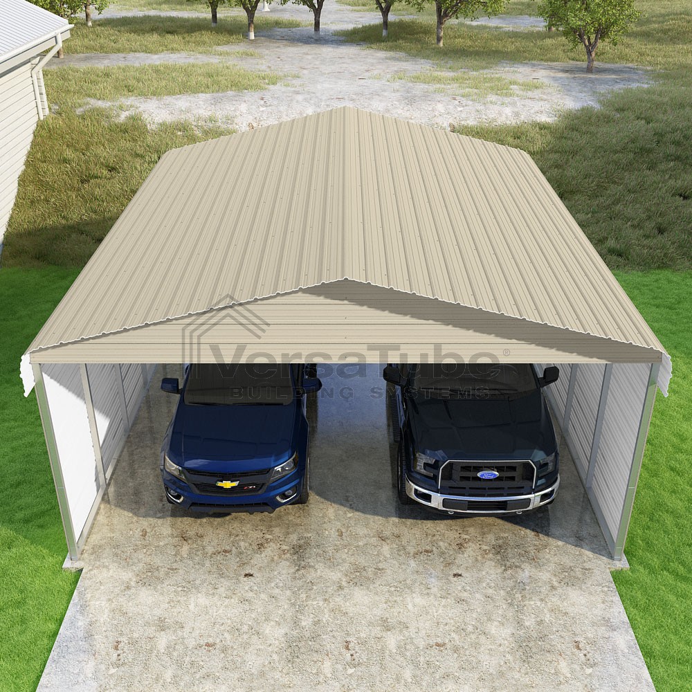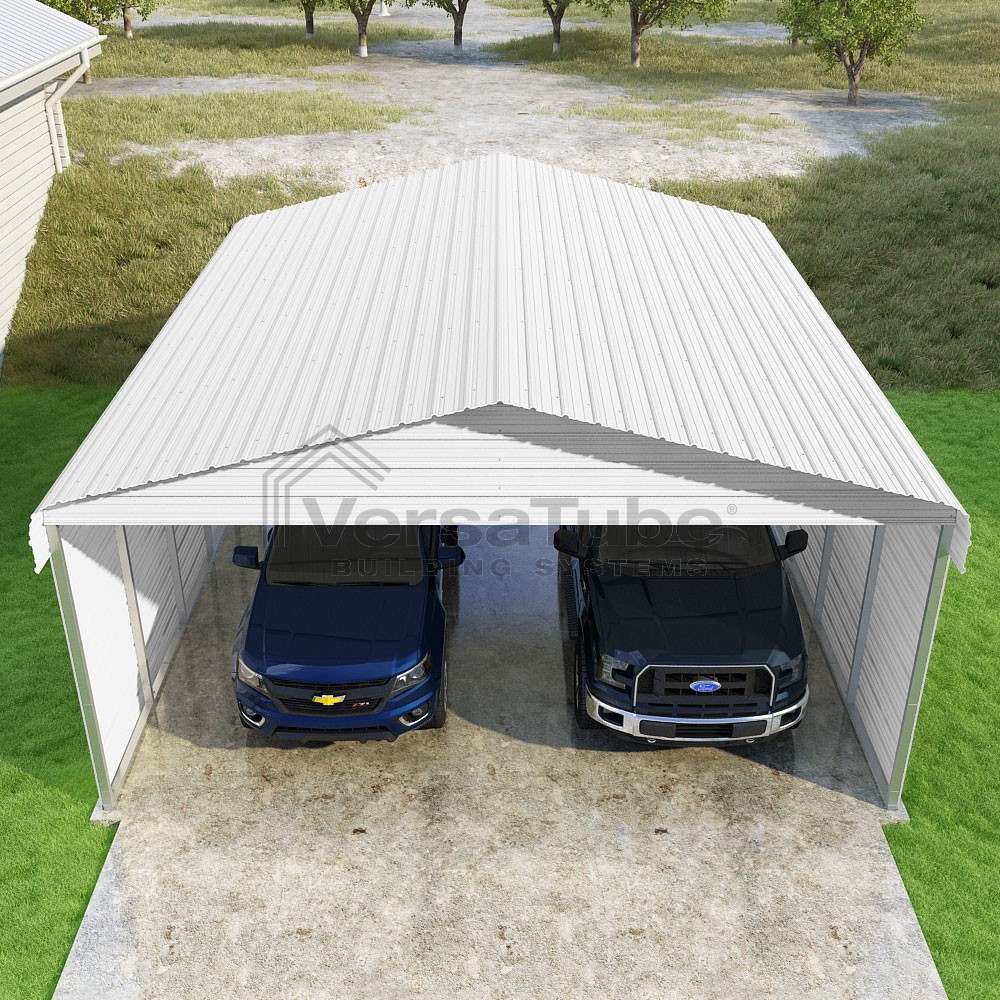 Classic Series DIY carport kit features horizontal application of sheet metal panels with the extra protection of rounded eaves.