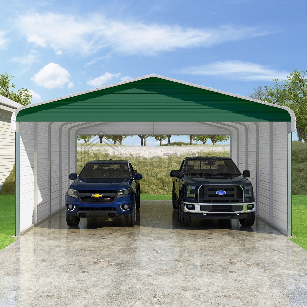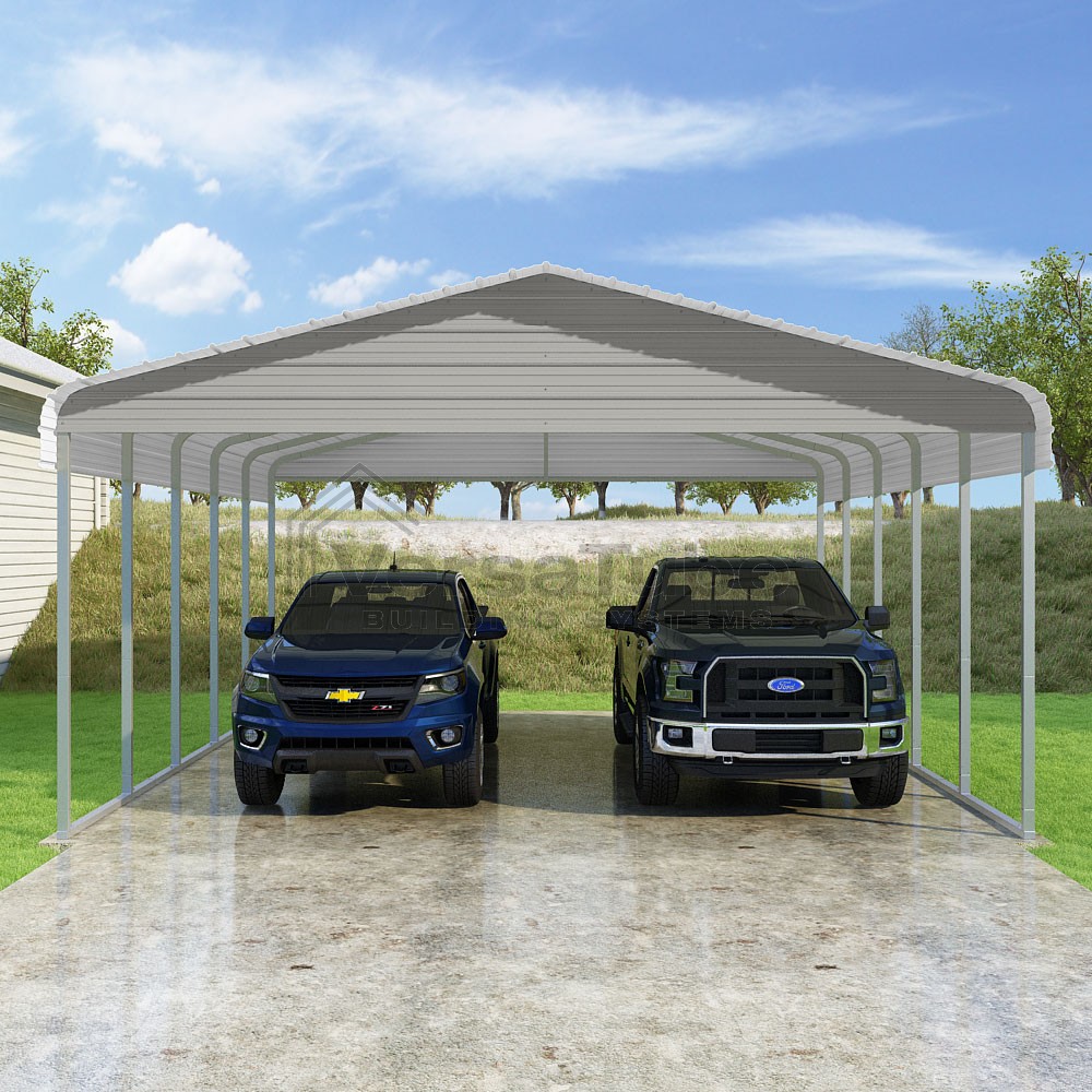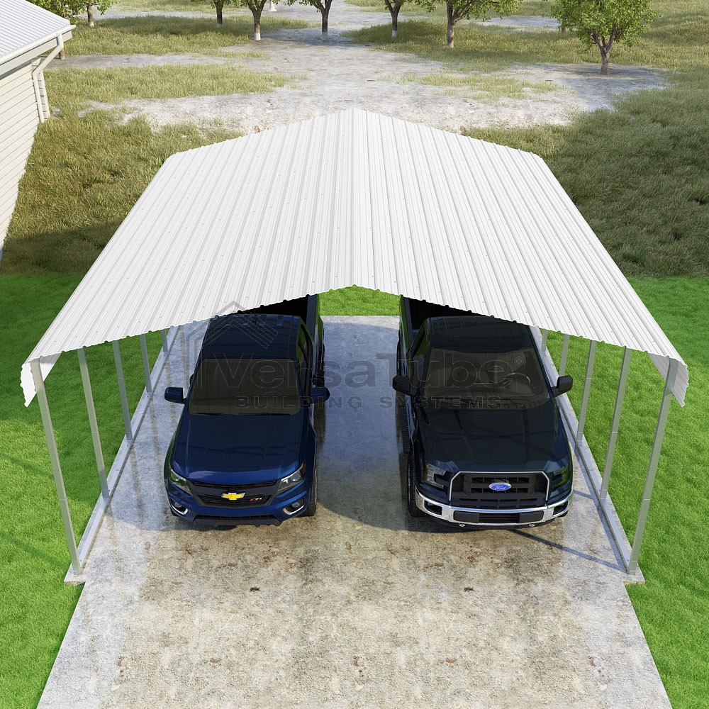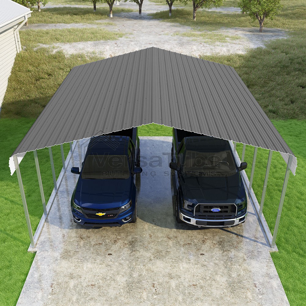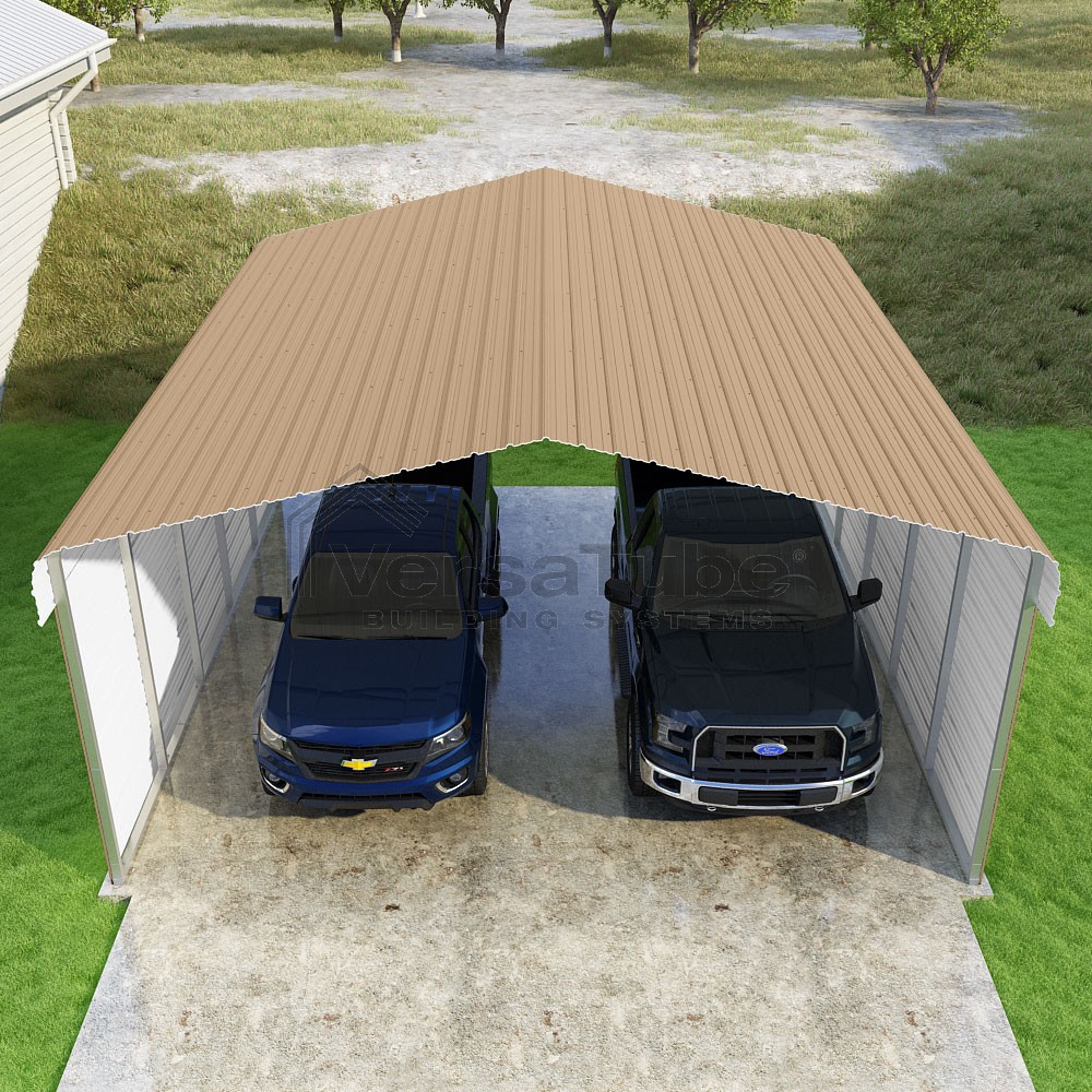 Classic Series DIY carport kit features horizontal application of sheet metal panels with the extra protection of rounded eaves.