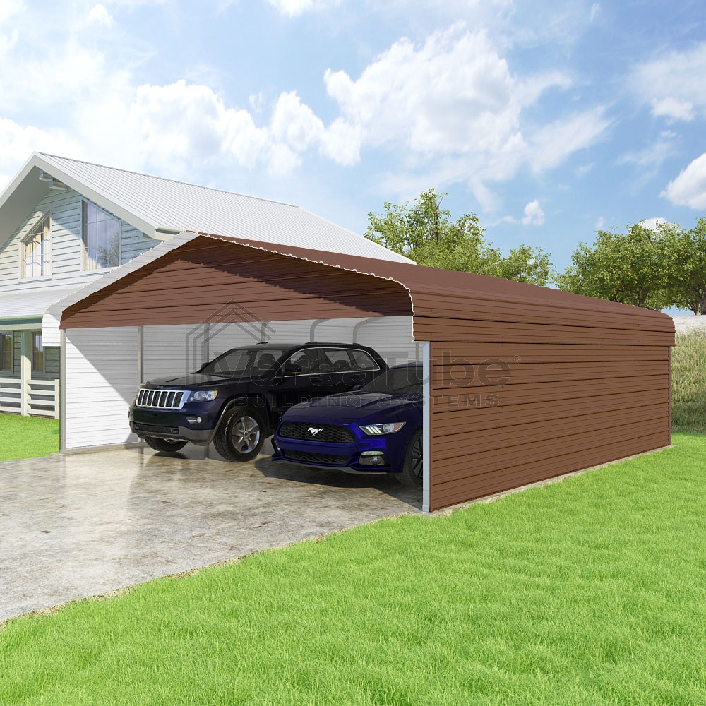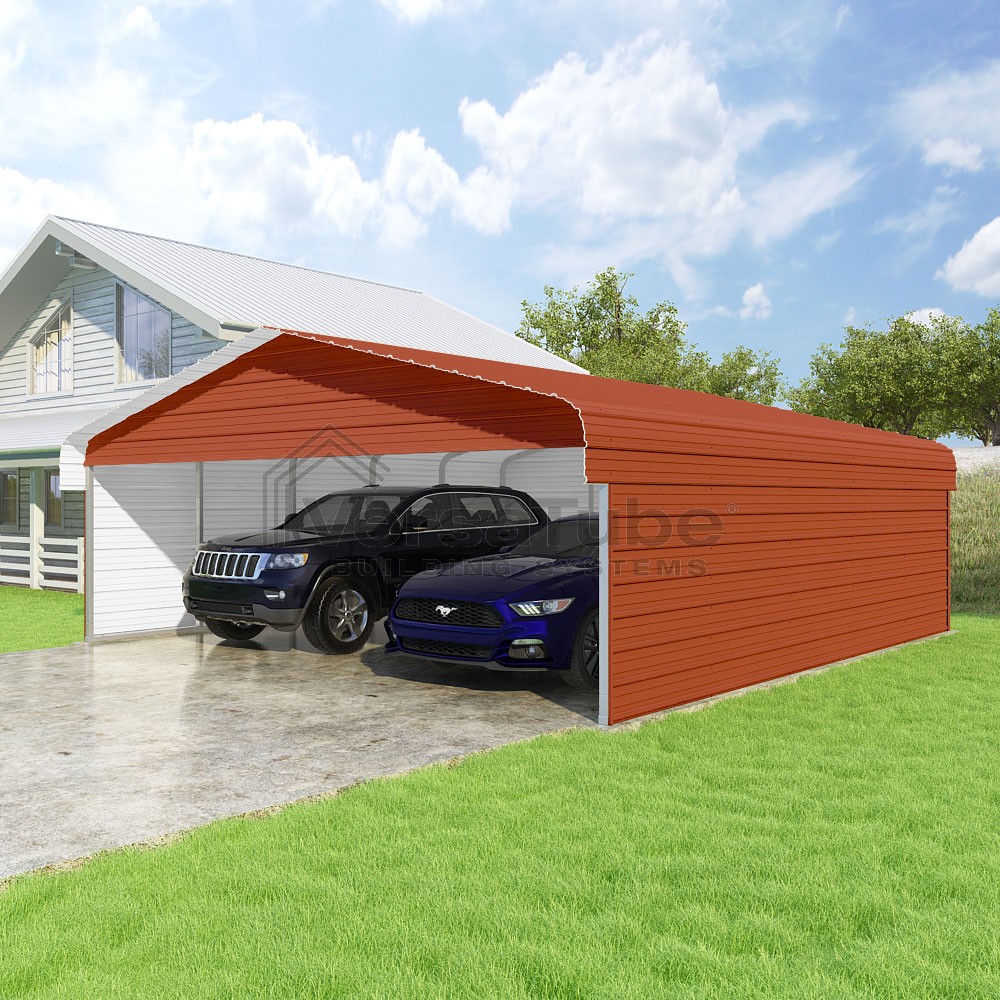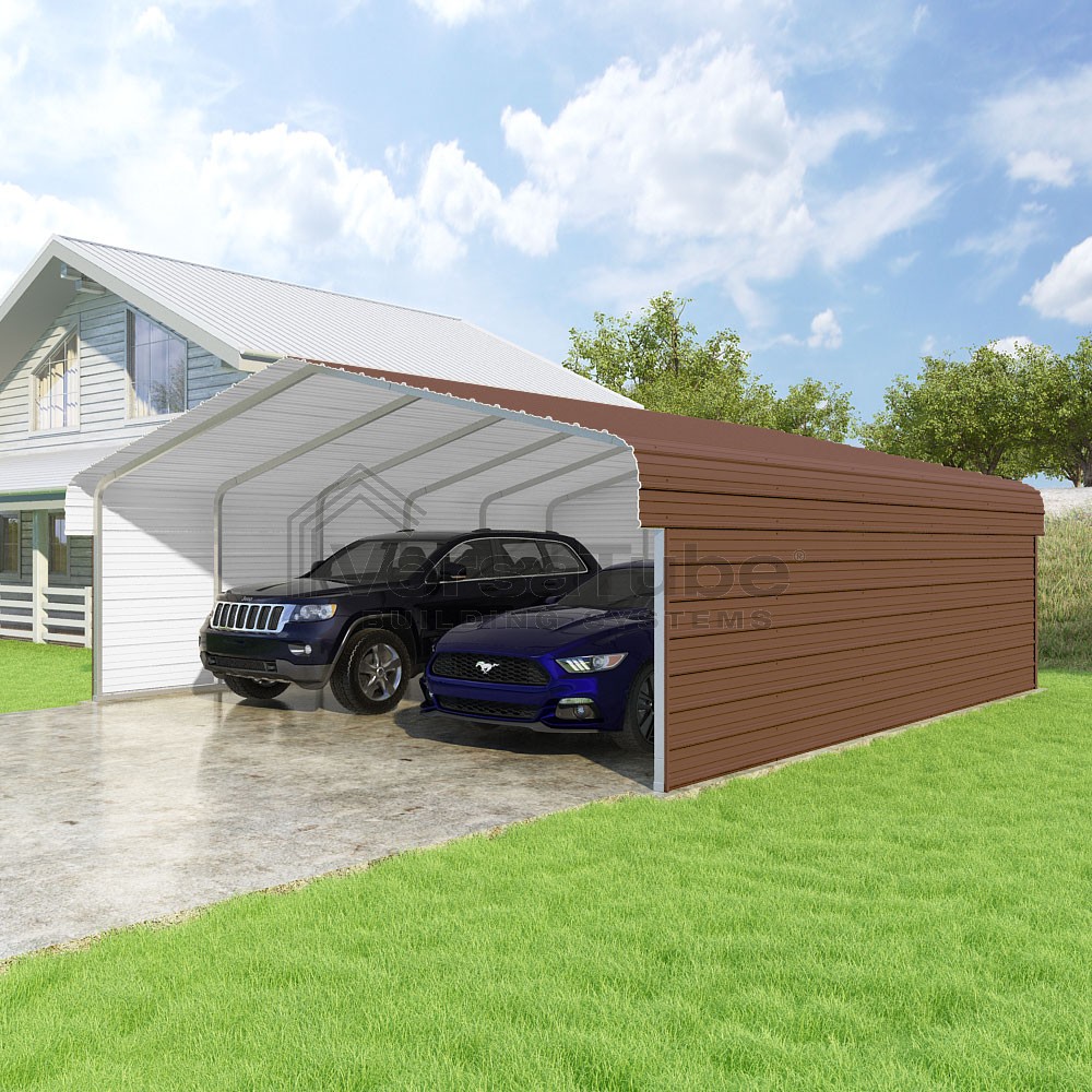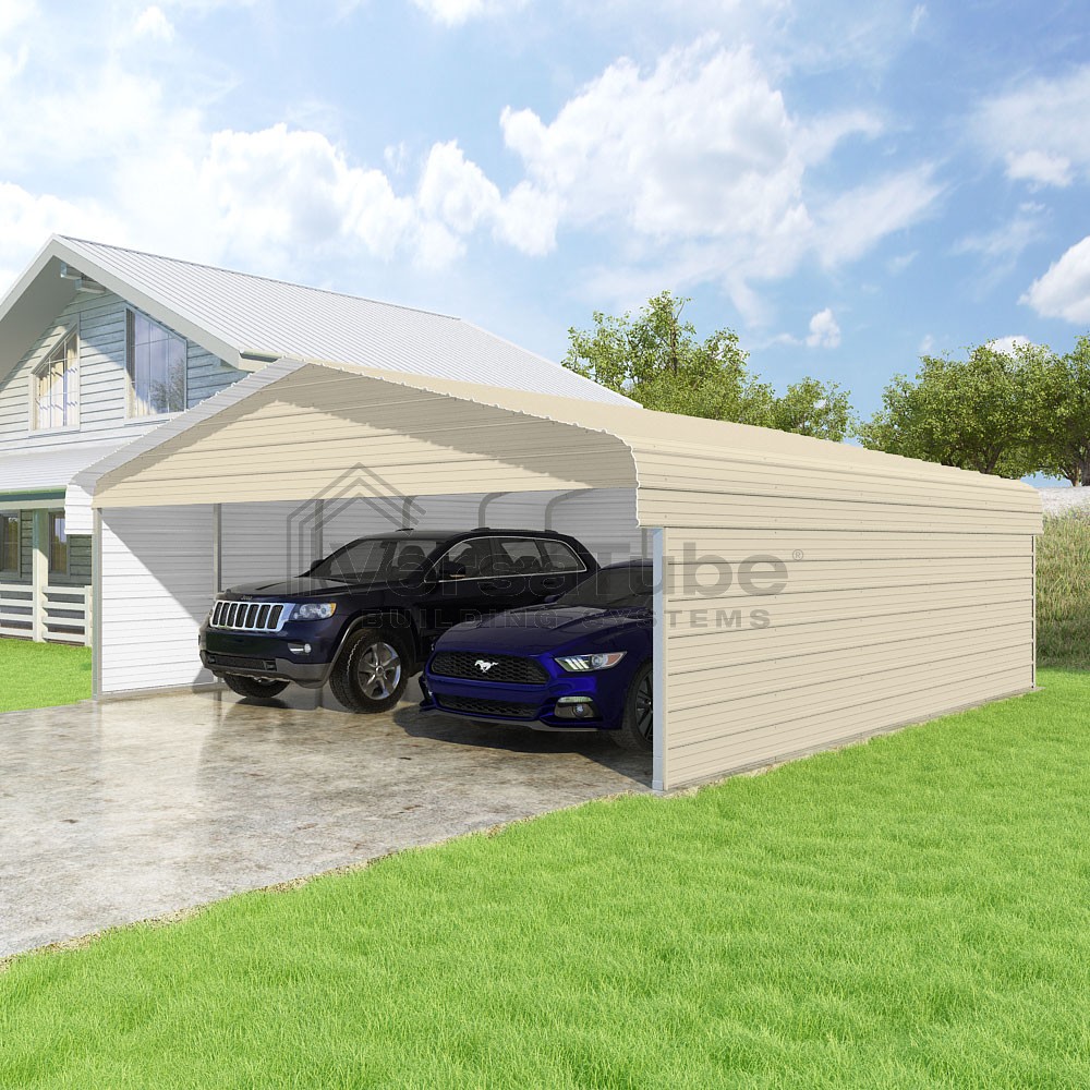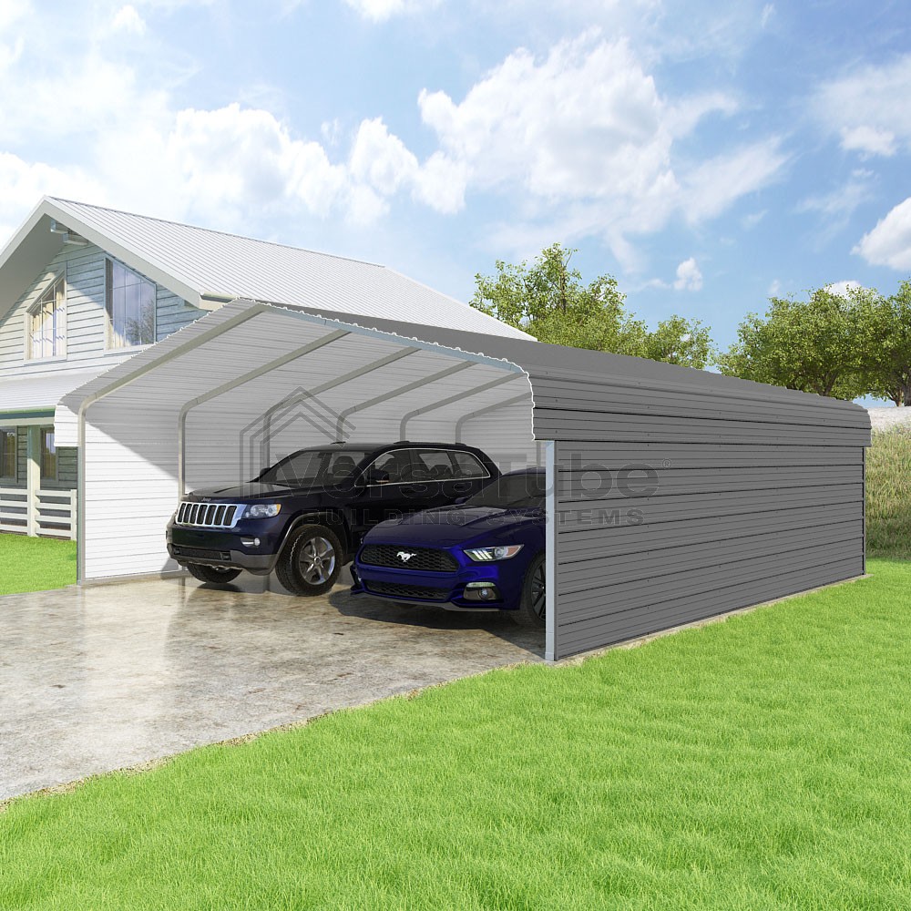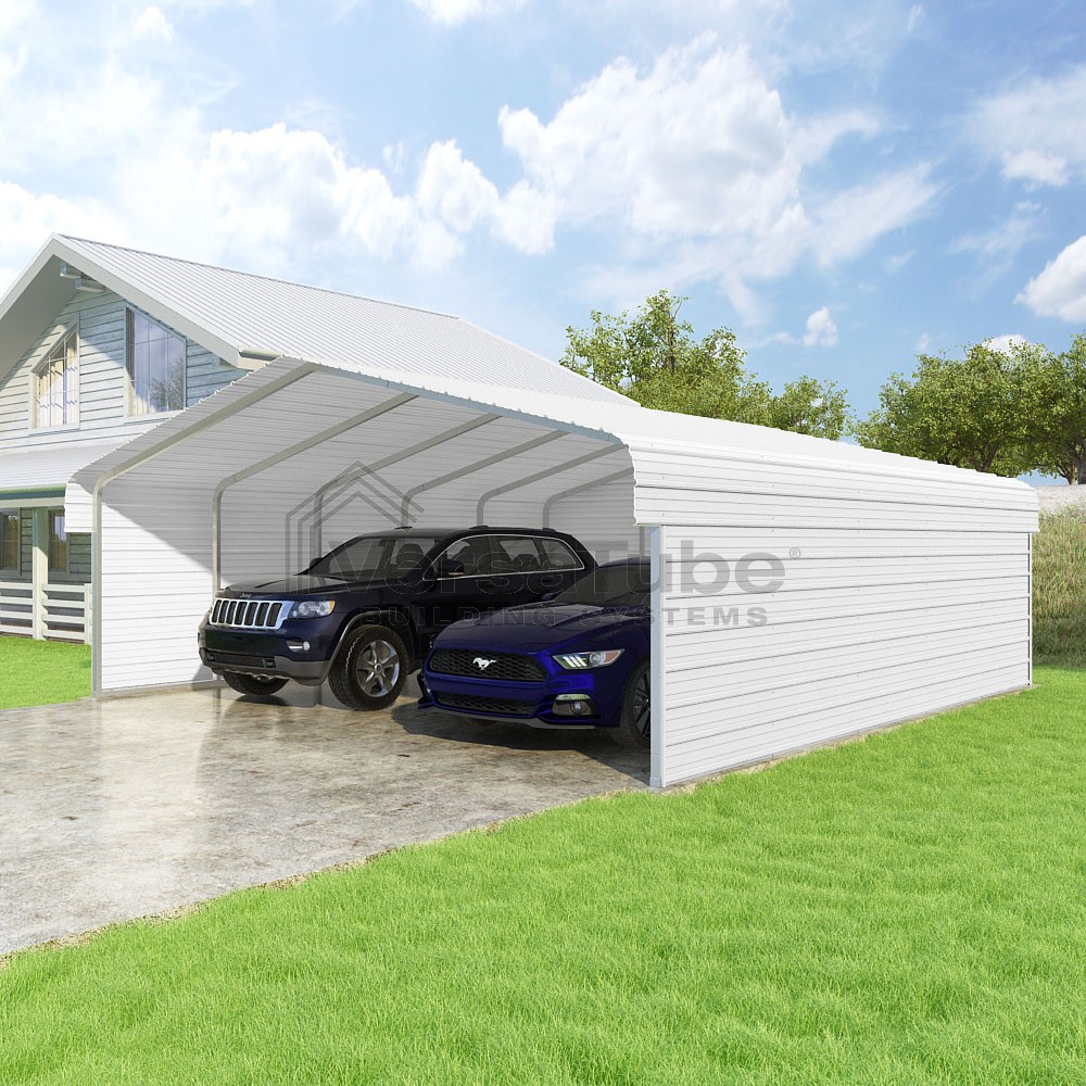 Classic Series DIY carport kit features horizontal application of sheet metal panels with the extra protection of rounded eaves.