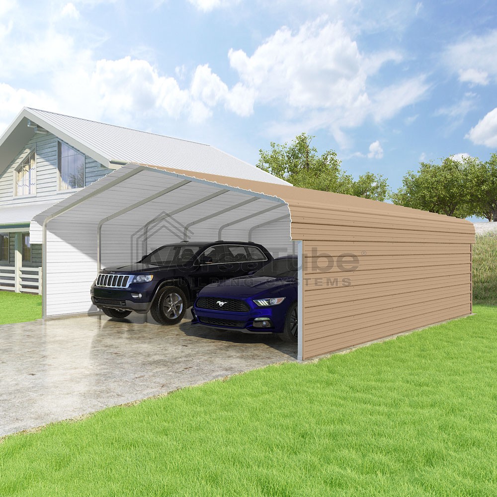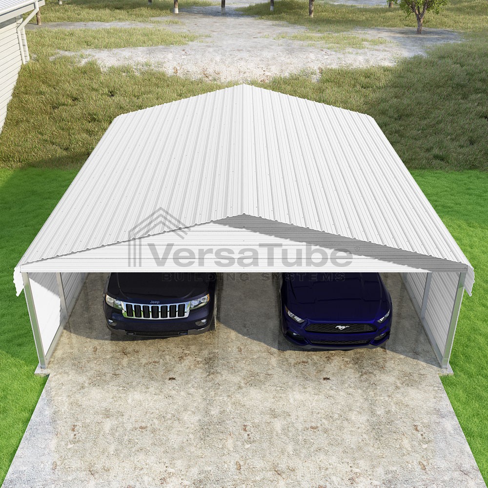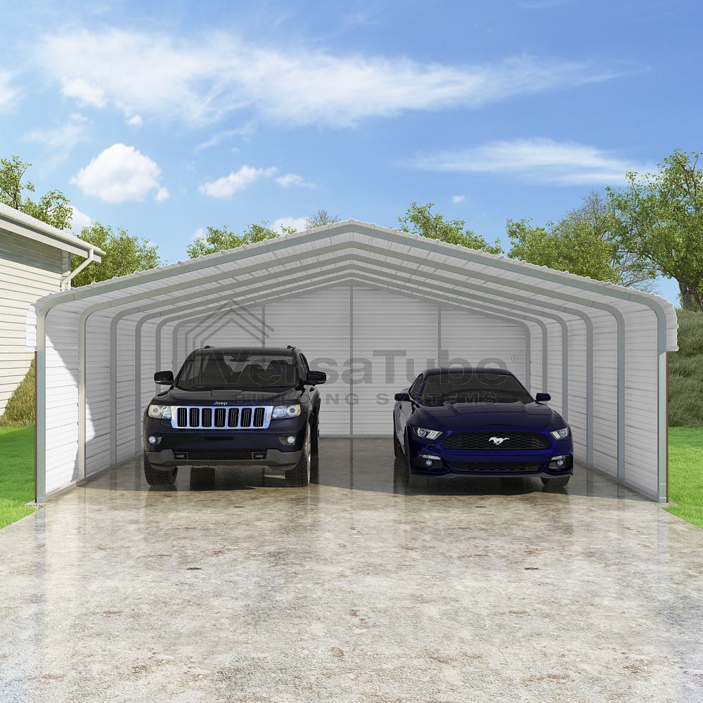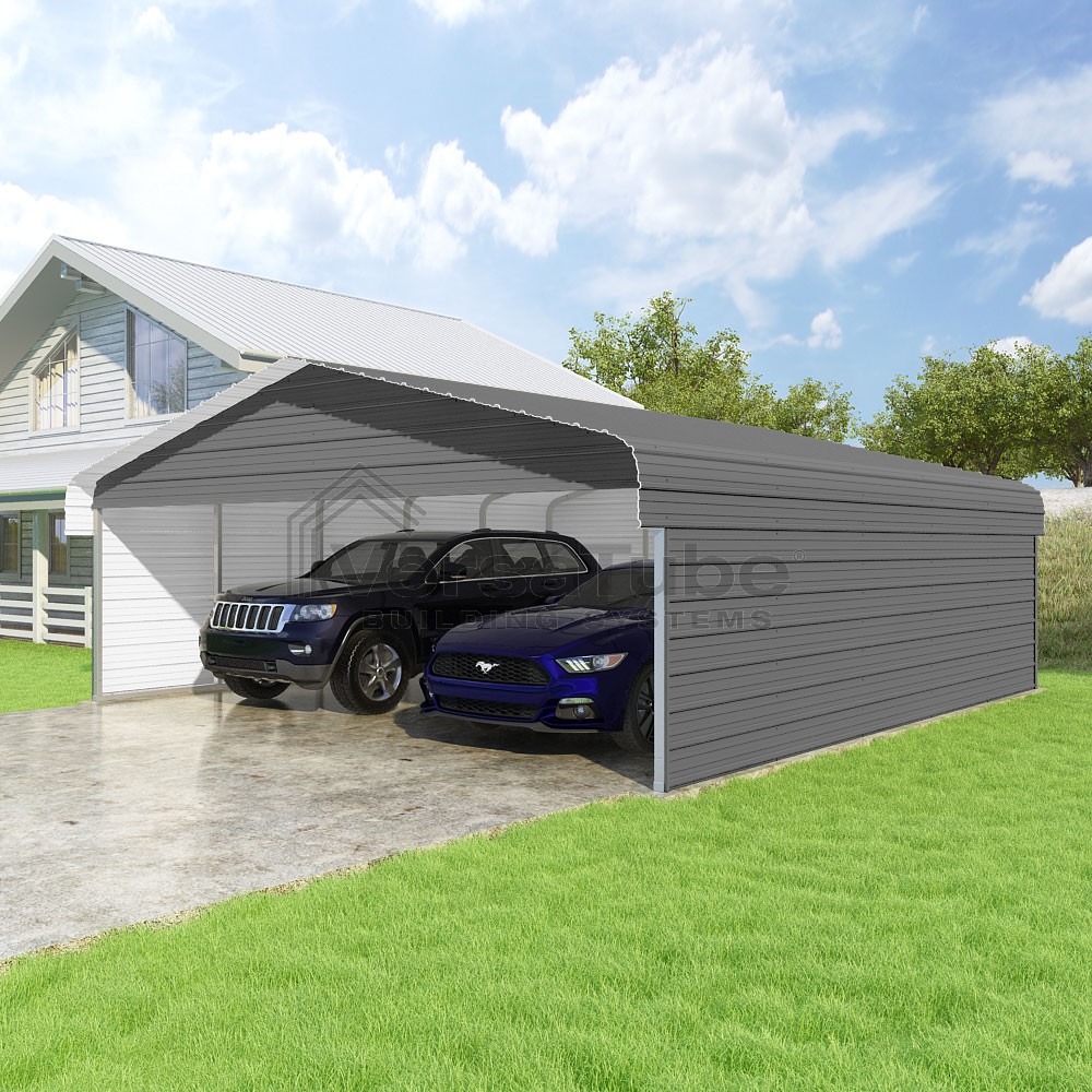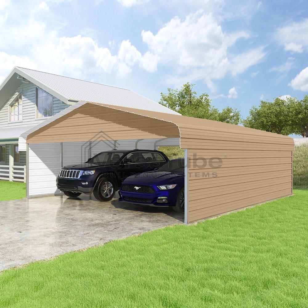 Classic Series DIY carport kit features horizontal application of sheet metal panels with the extra protection of rounded eaves.
