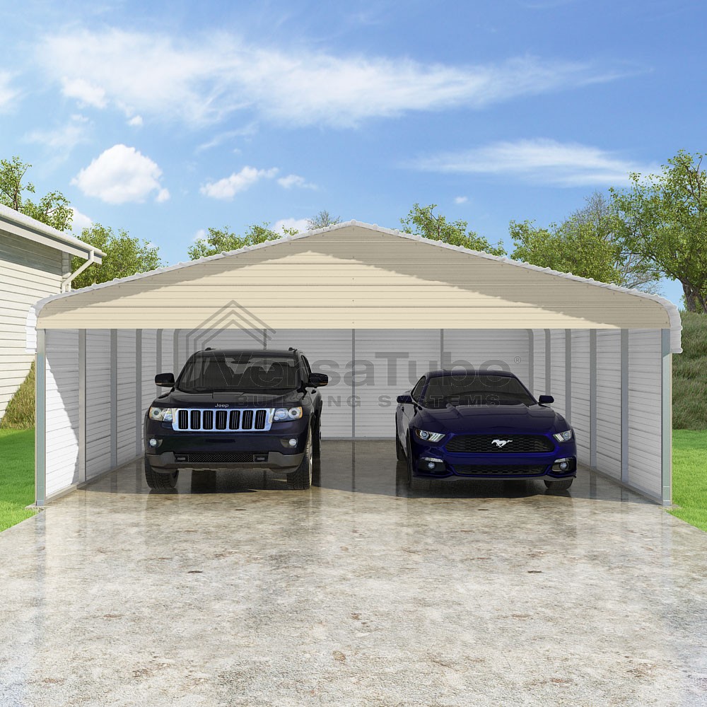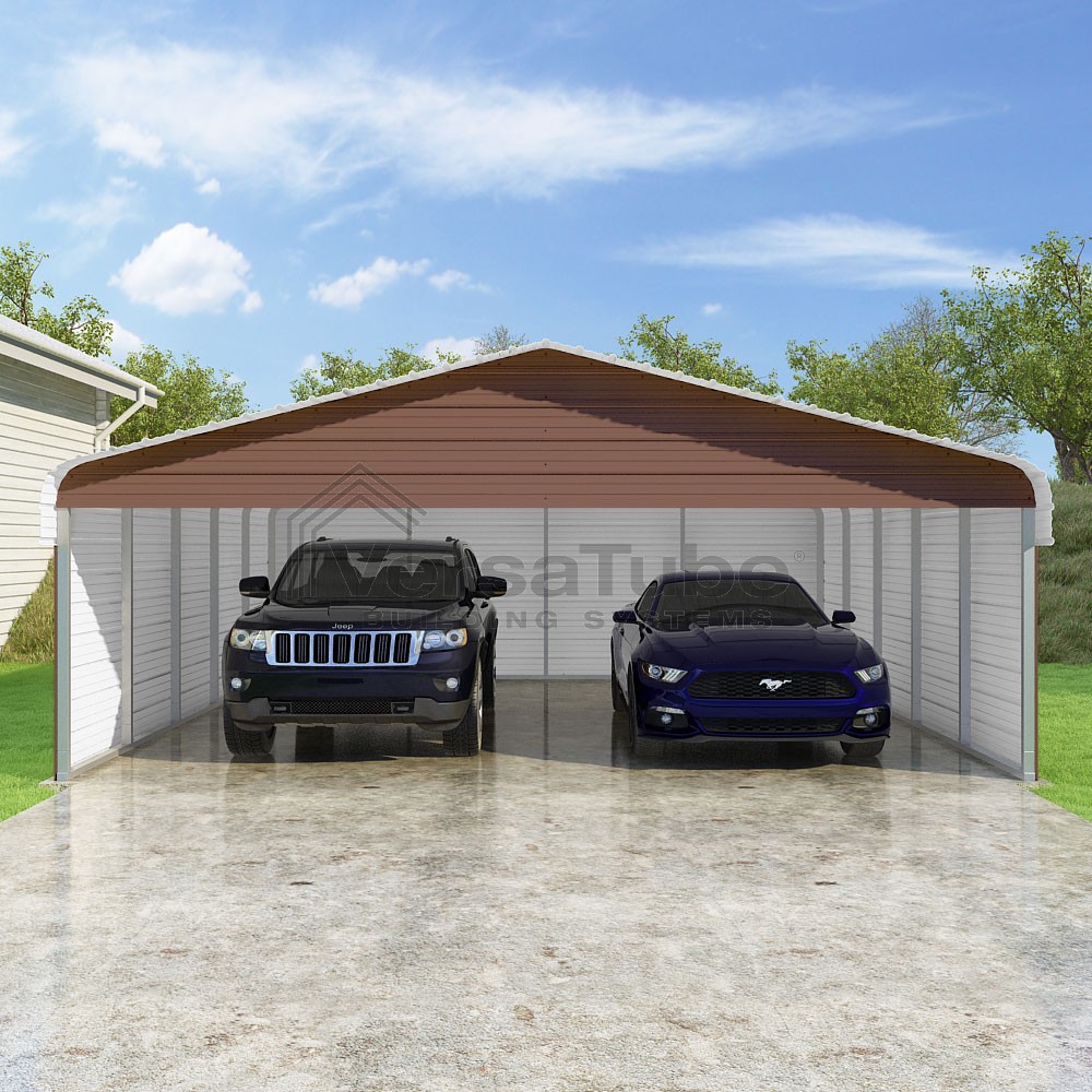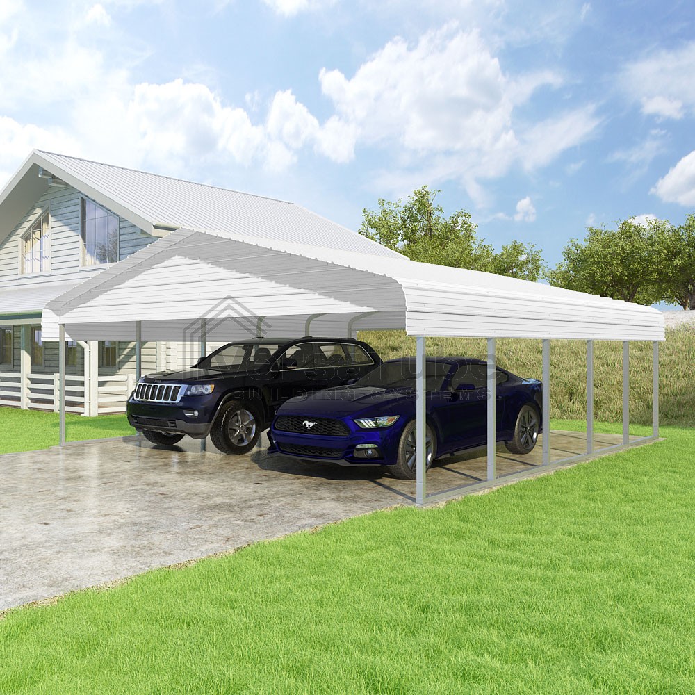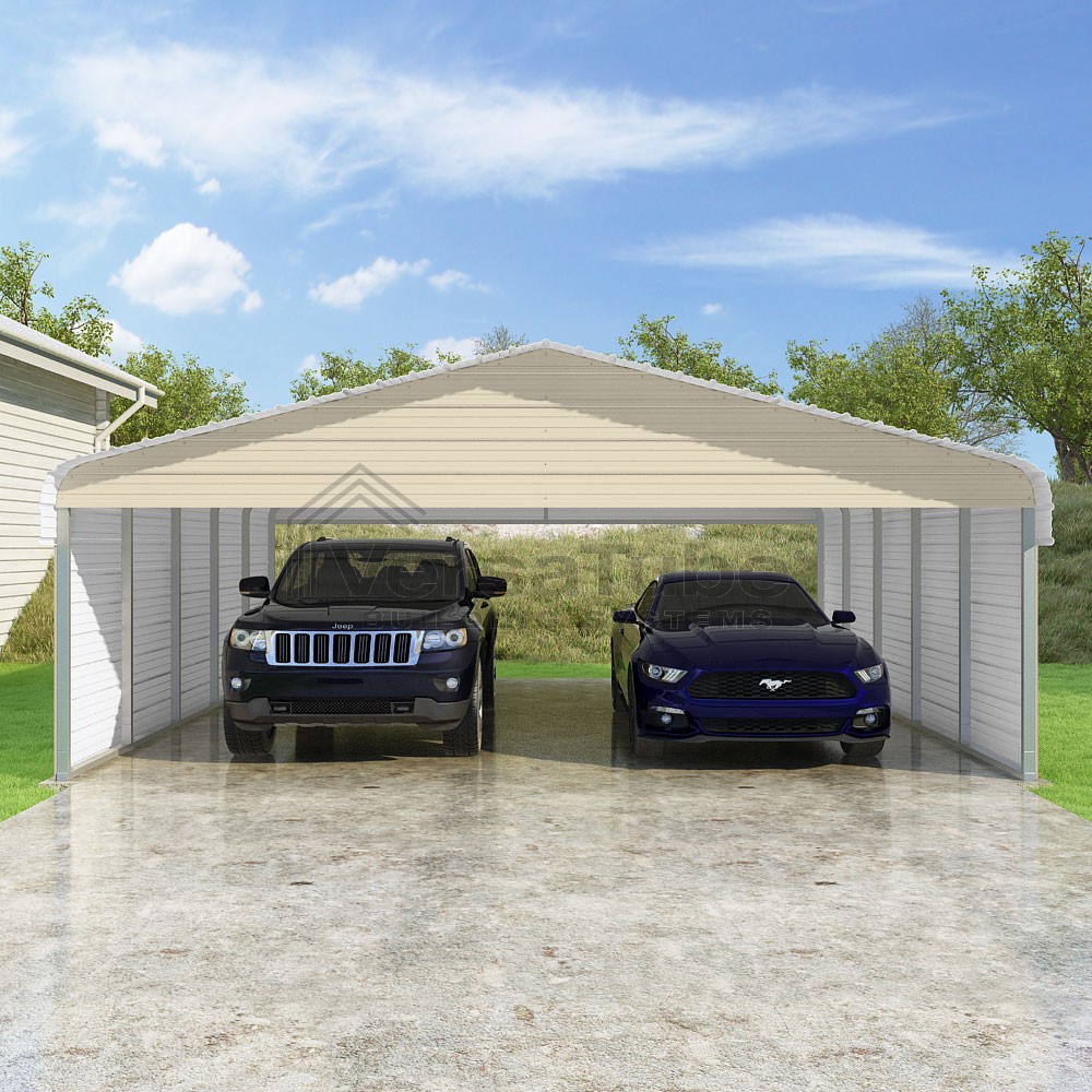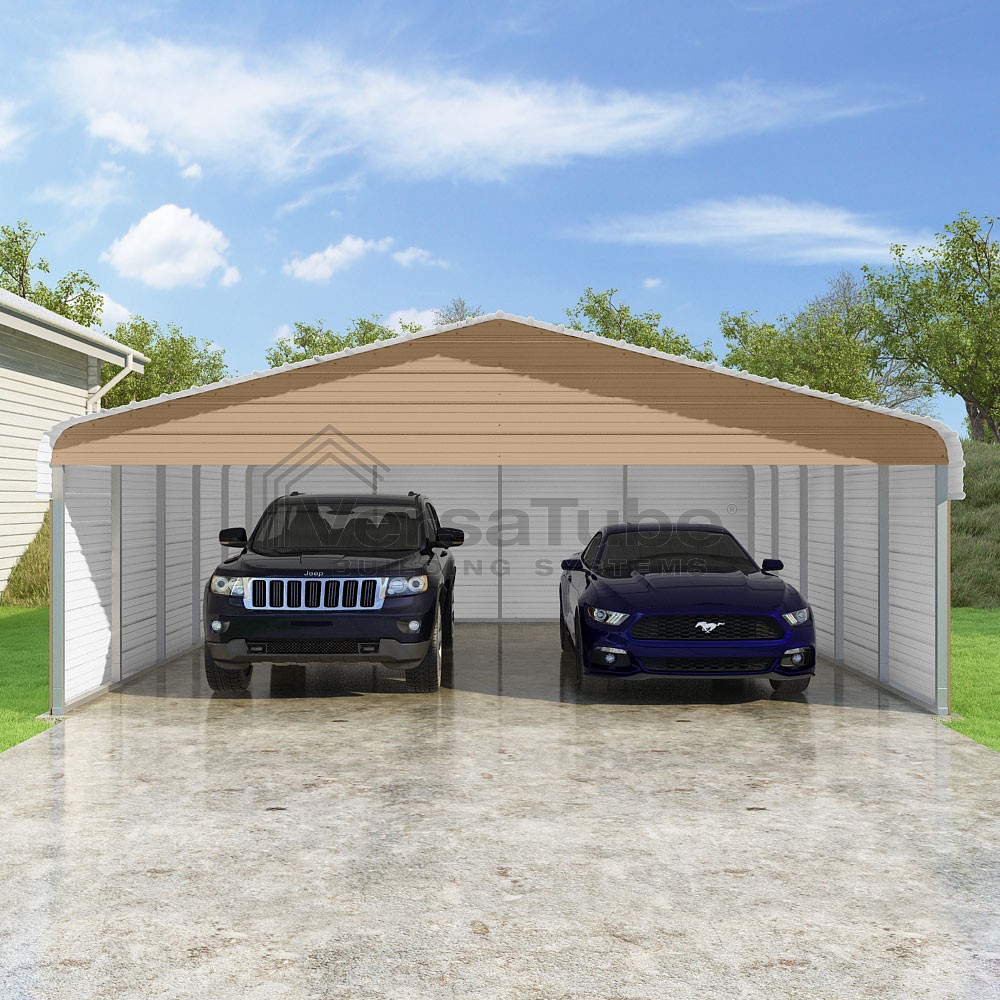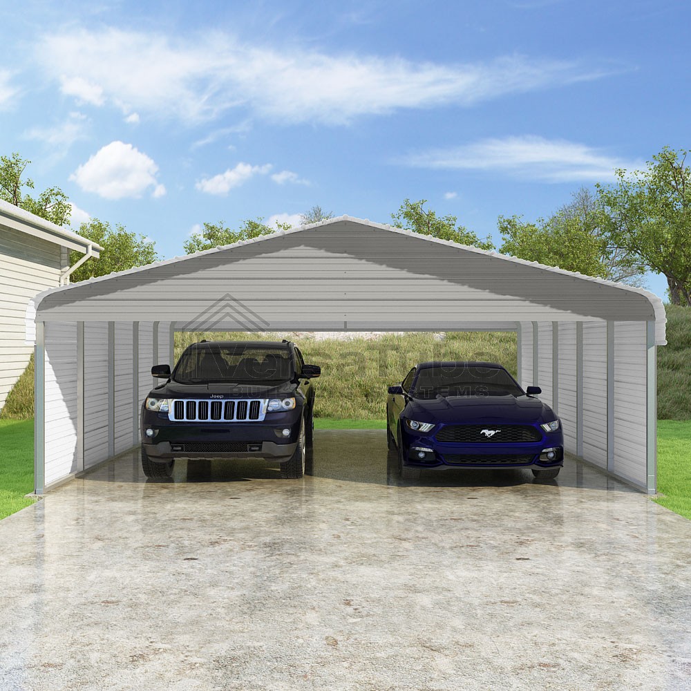 Classic Series DIY carport kit features horizontal application of sheet metal panels with the extra protection of rounded eaves.