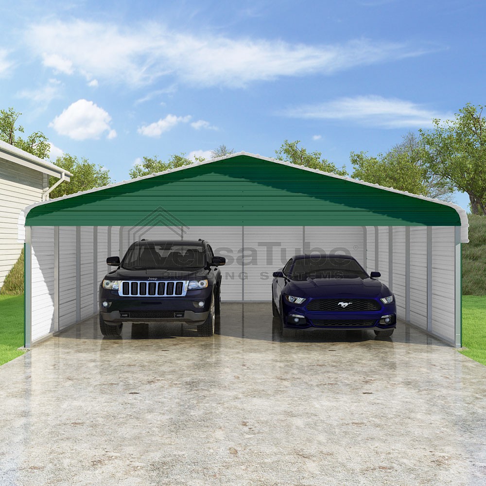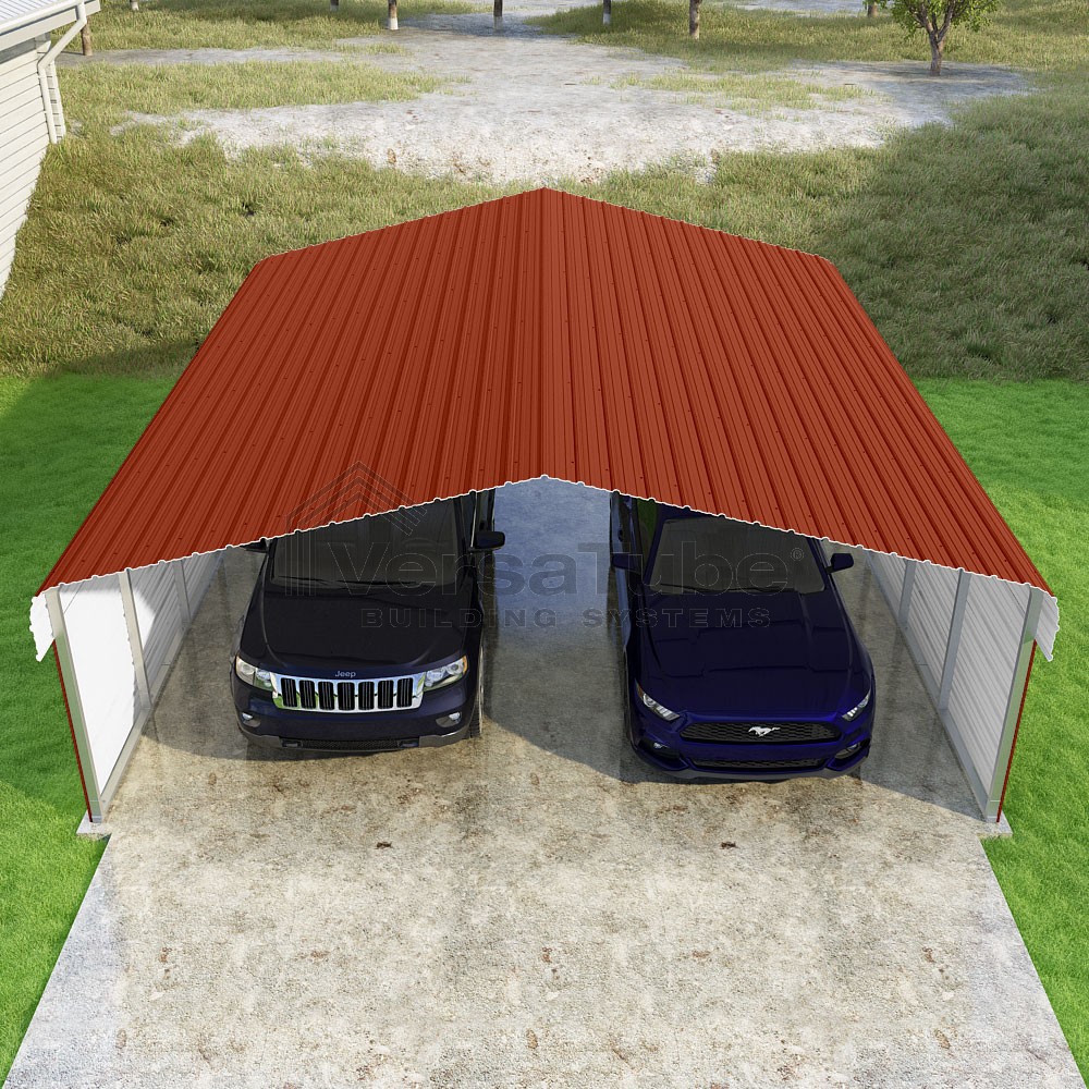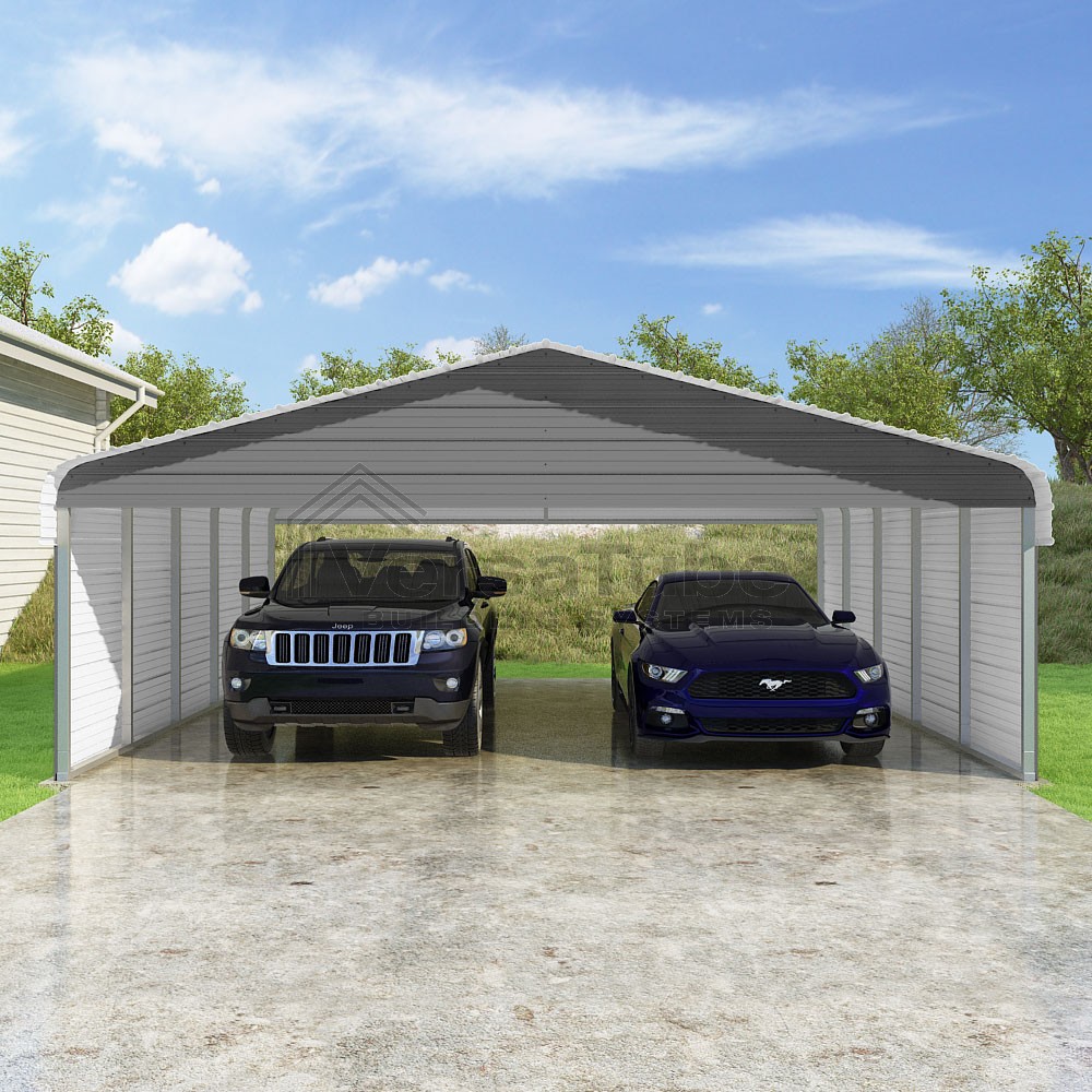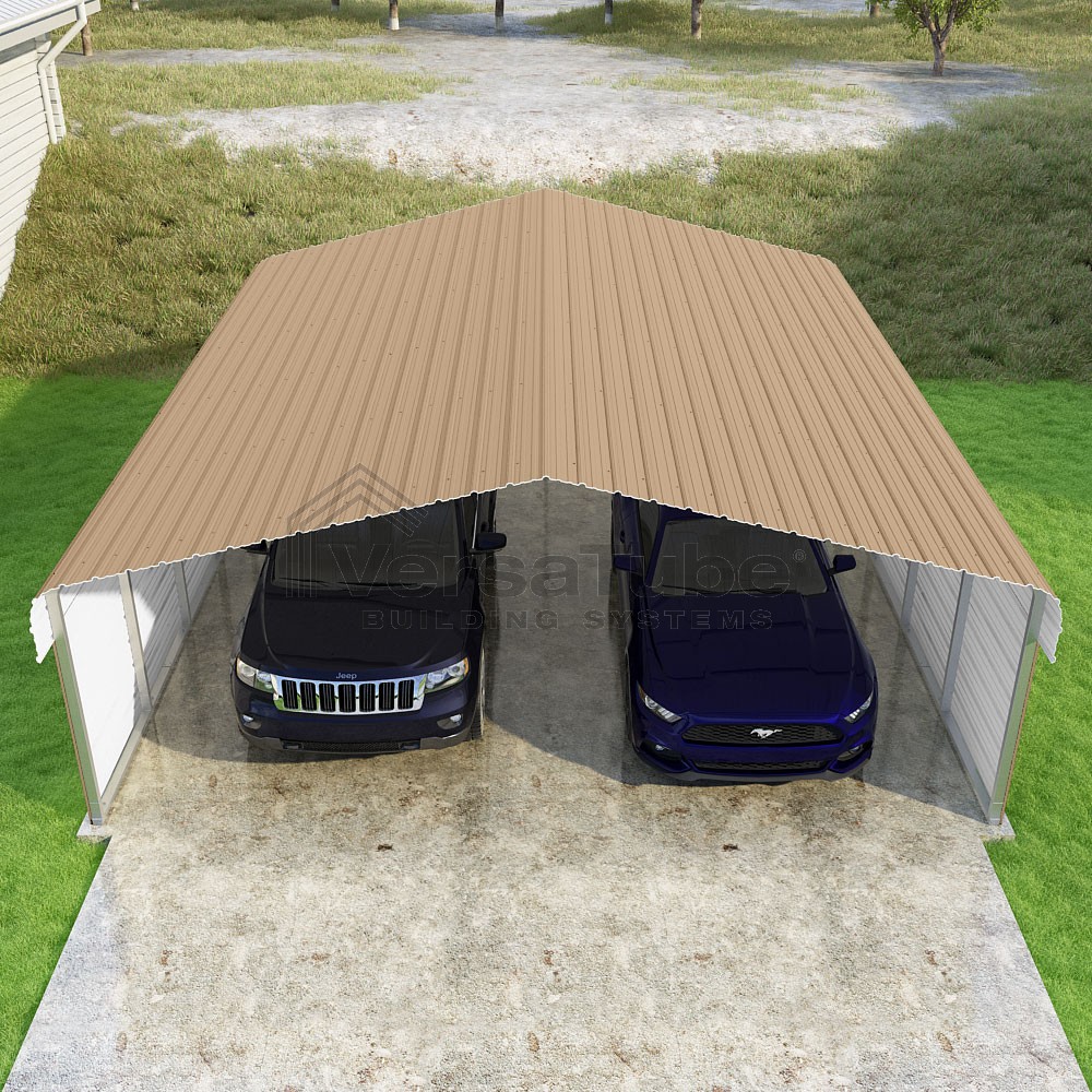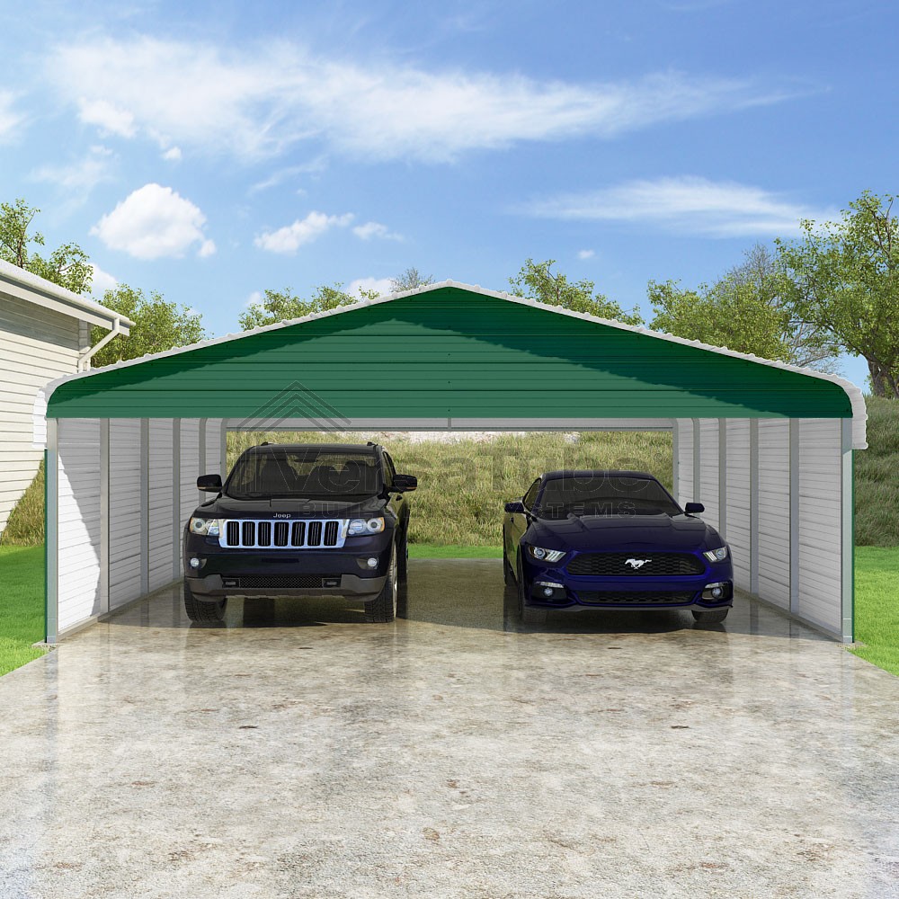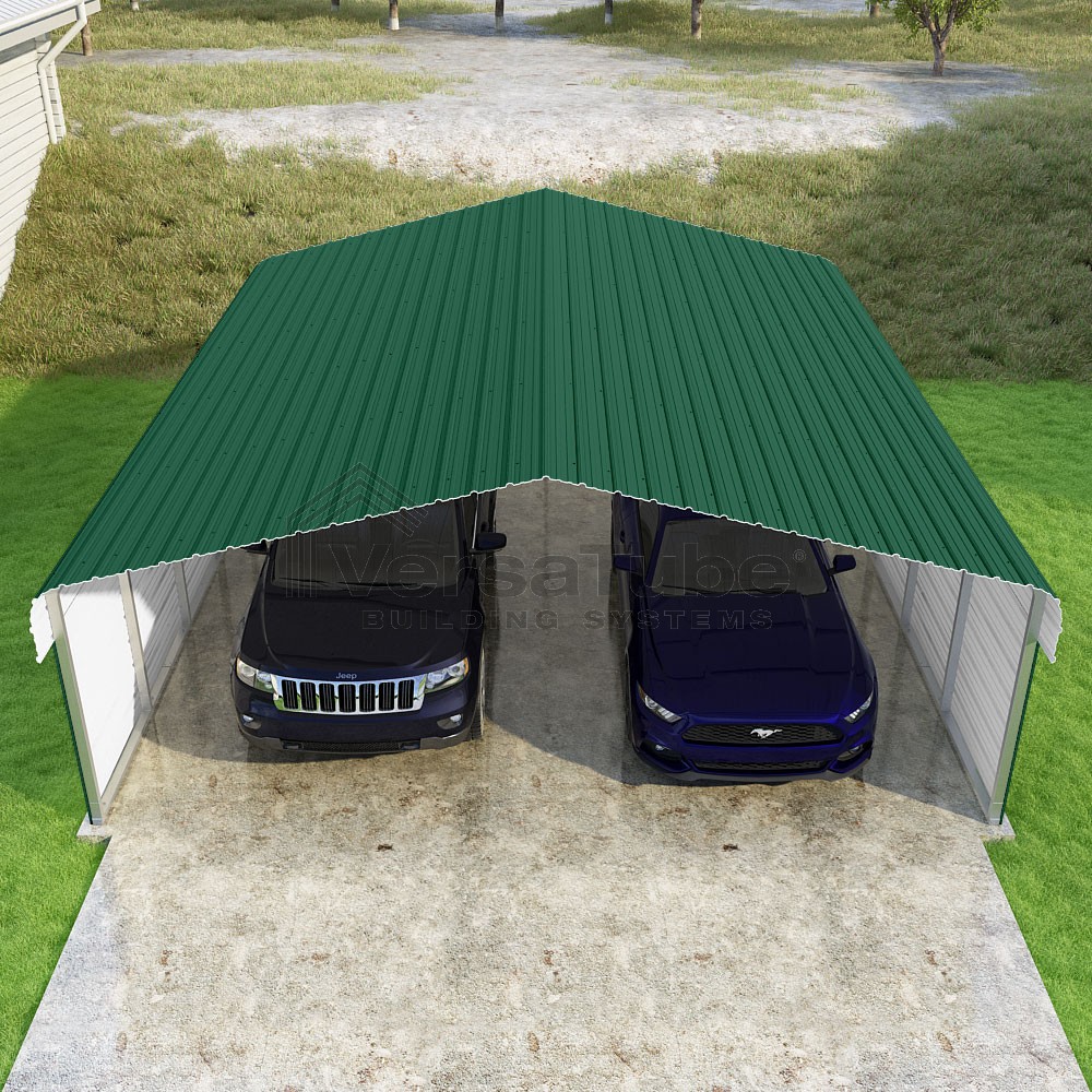 Classic Series DIY carport kit features horizontal application of sheet metal panels with the extra protection of rounded eaves.