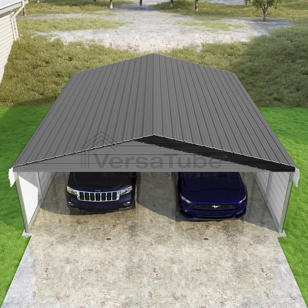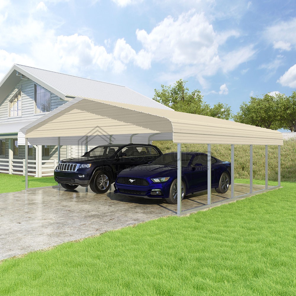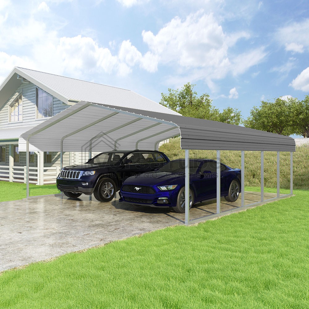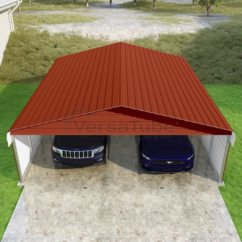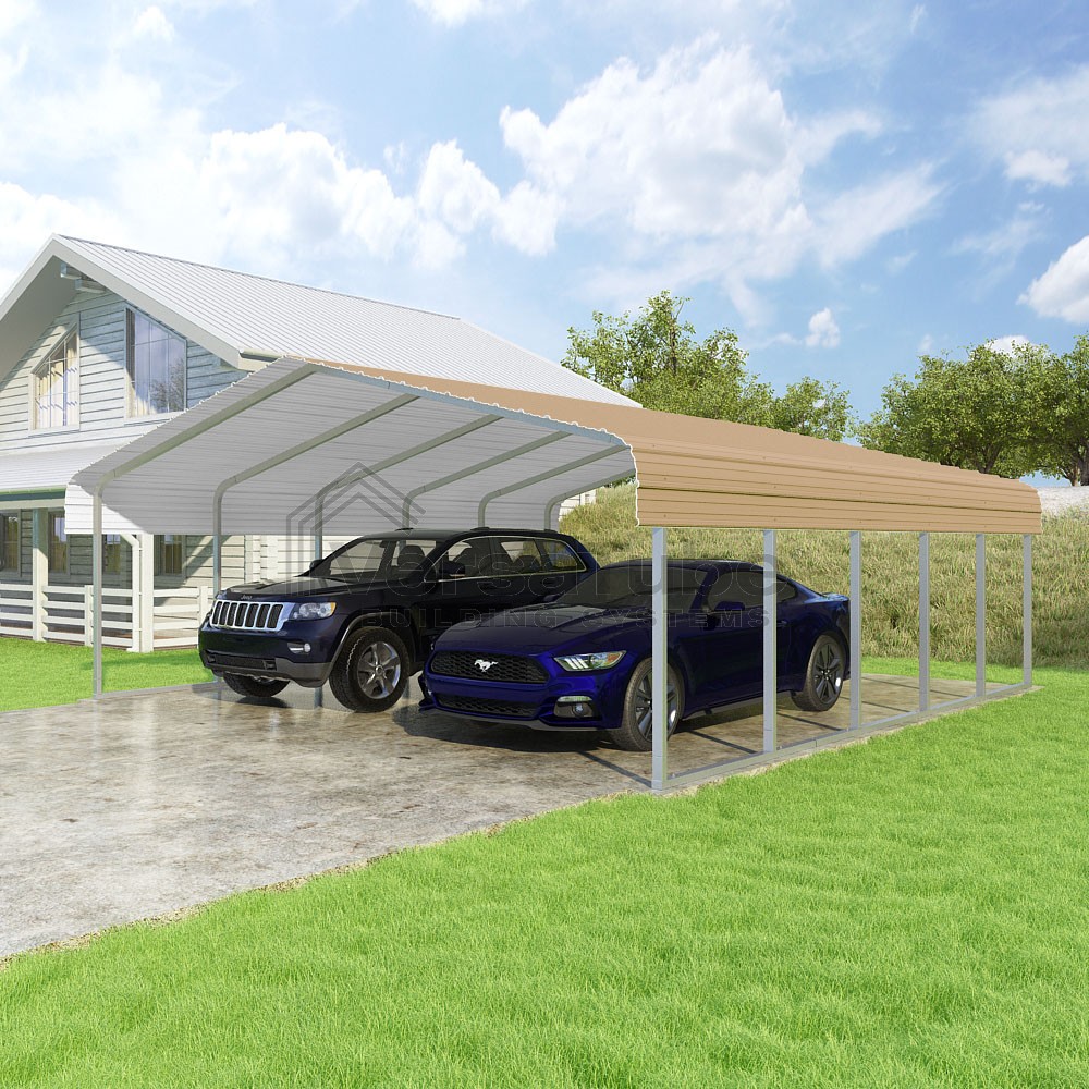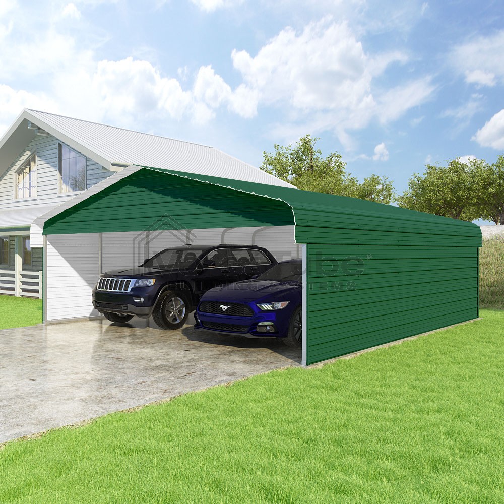 Classic Series DIY carport kit features horizontal application of sheet metal panels with the extra protection of rounded eaves.