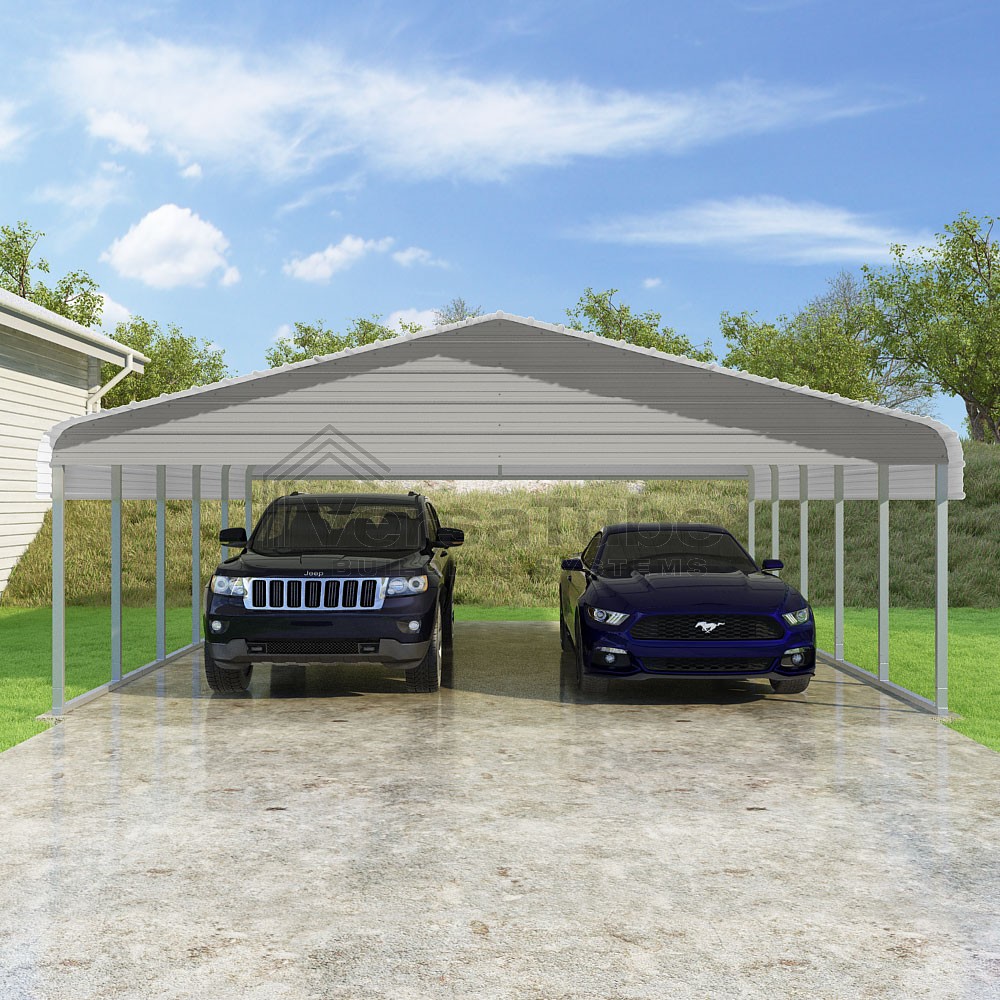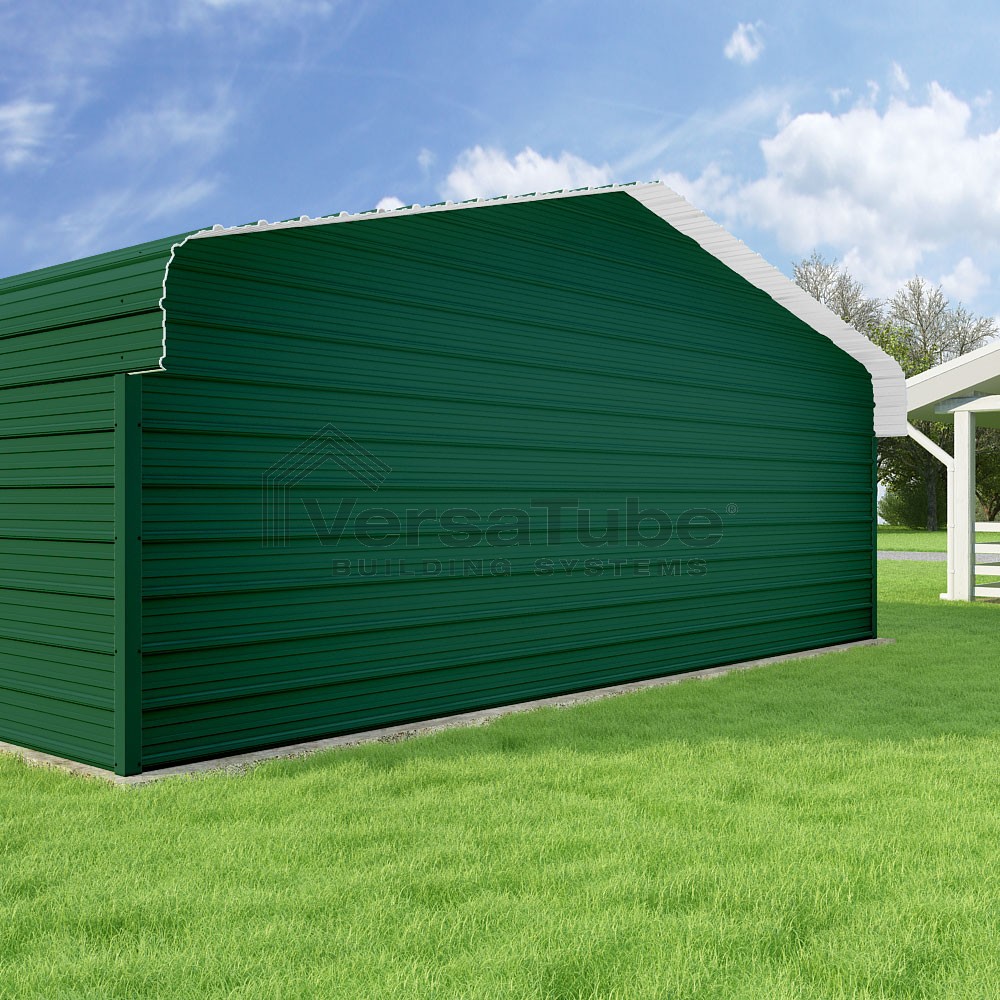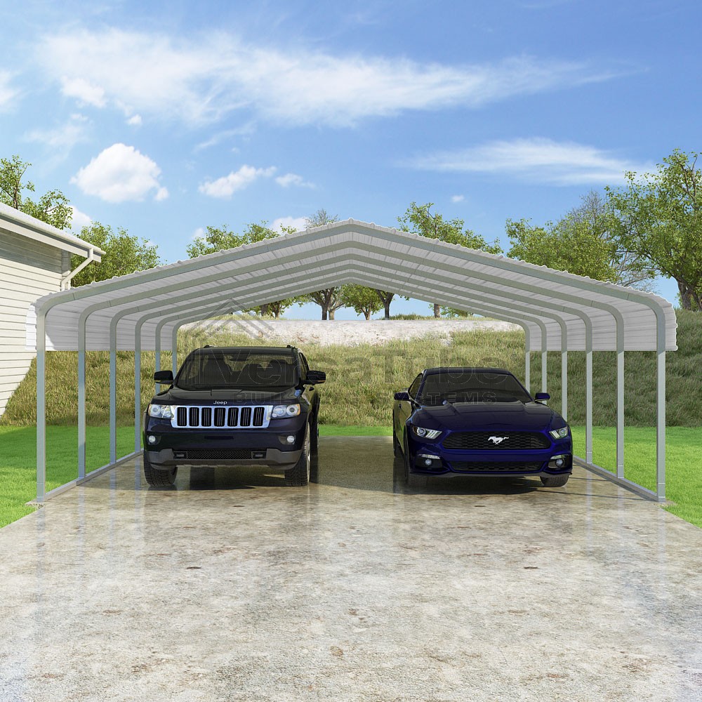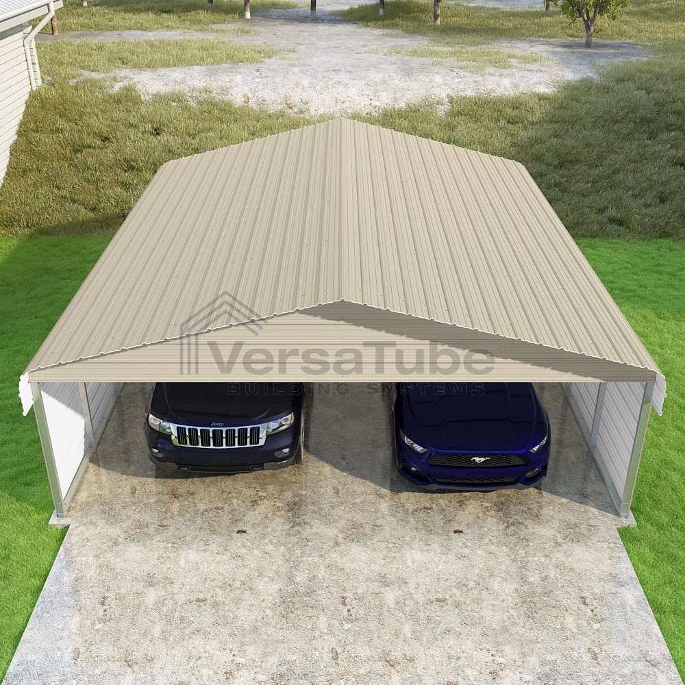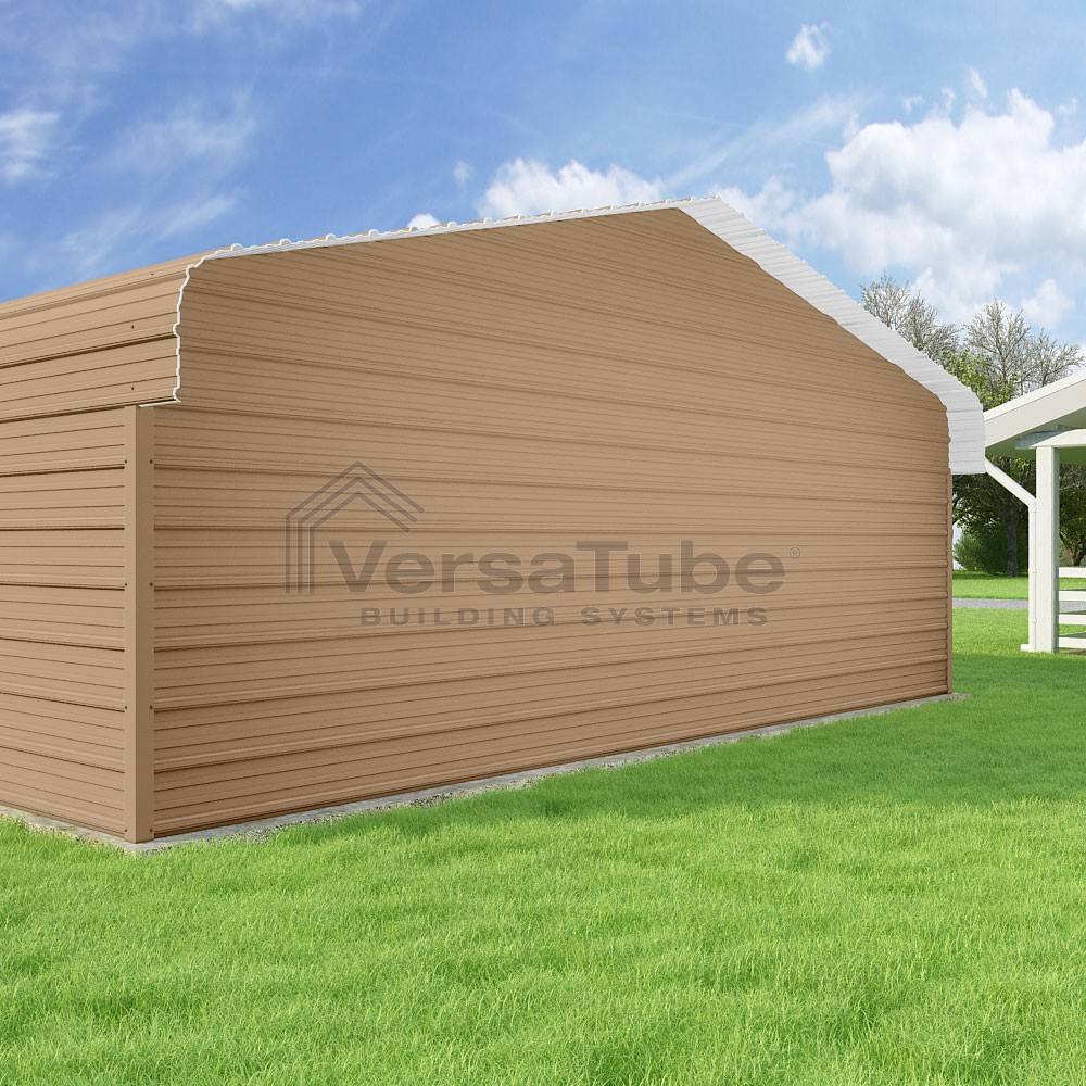 Classic Series DIY carport kit features horizontal application of sheet metal panels with the extra protection of rounded eaves.