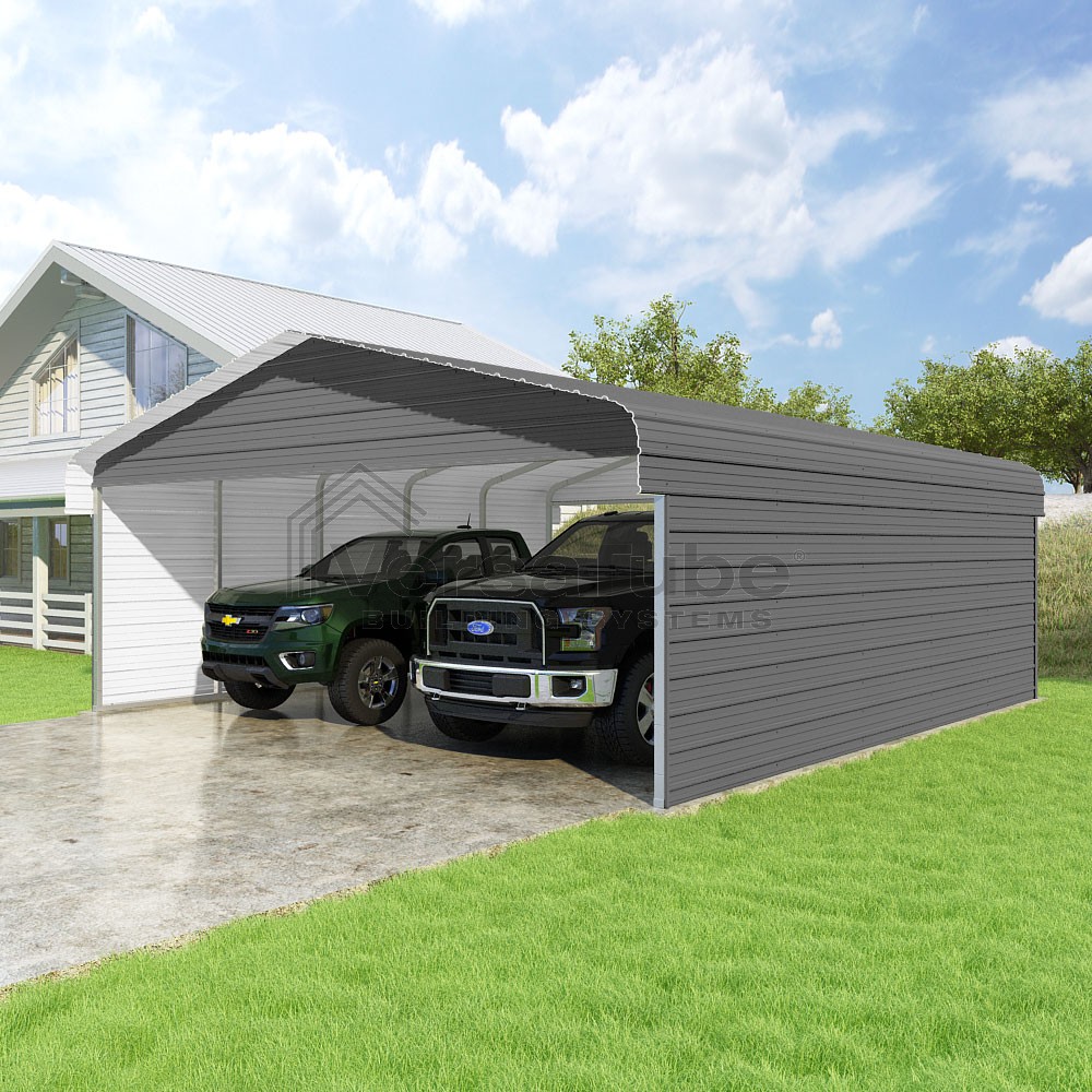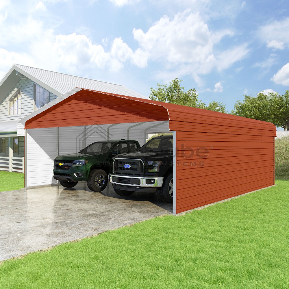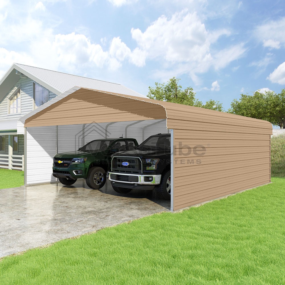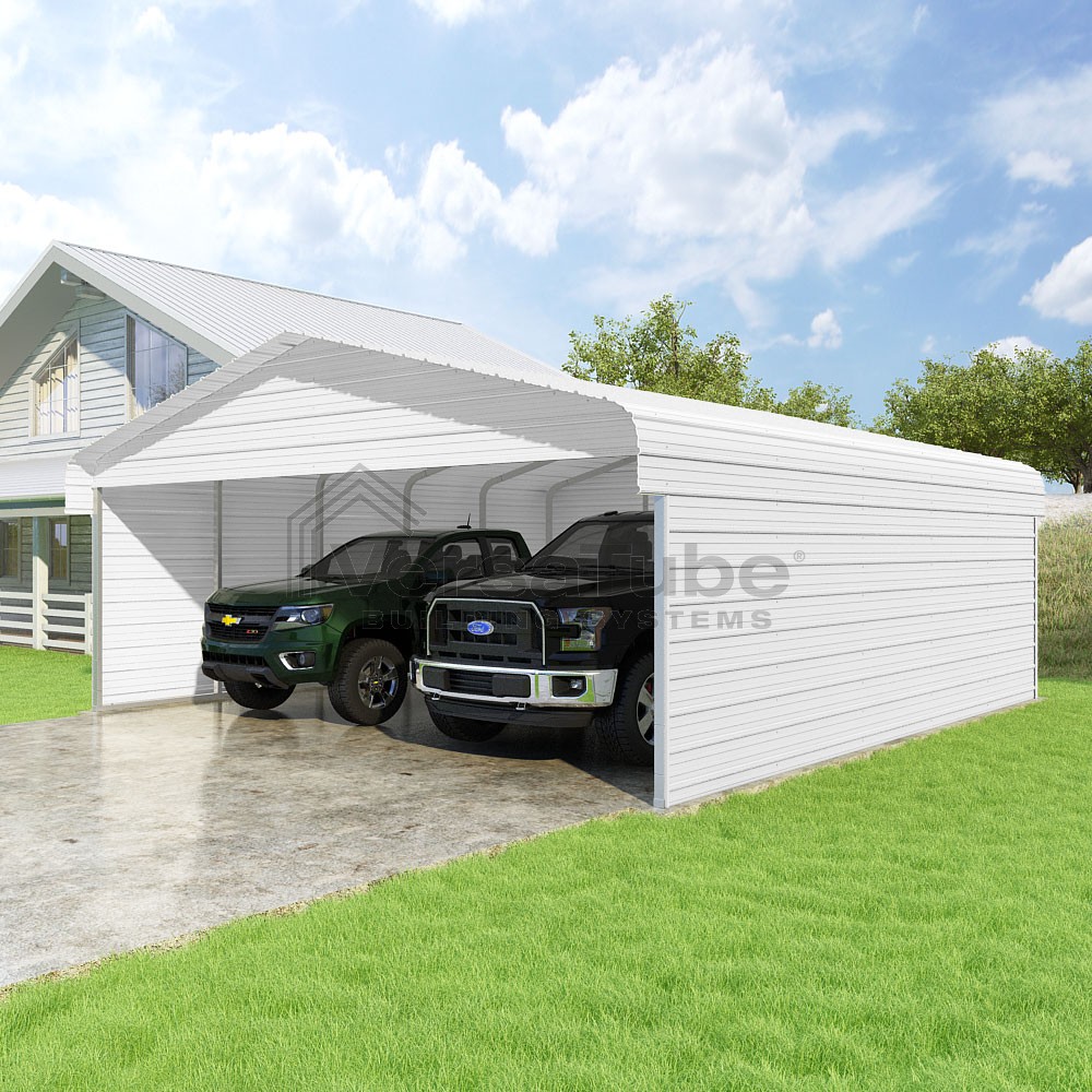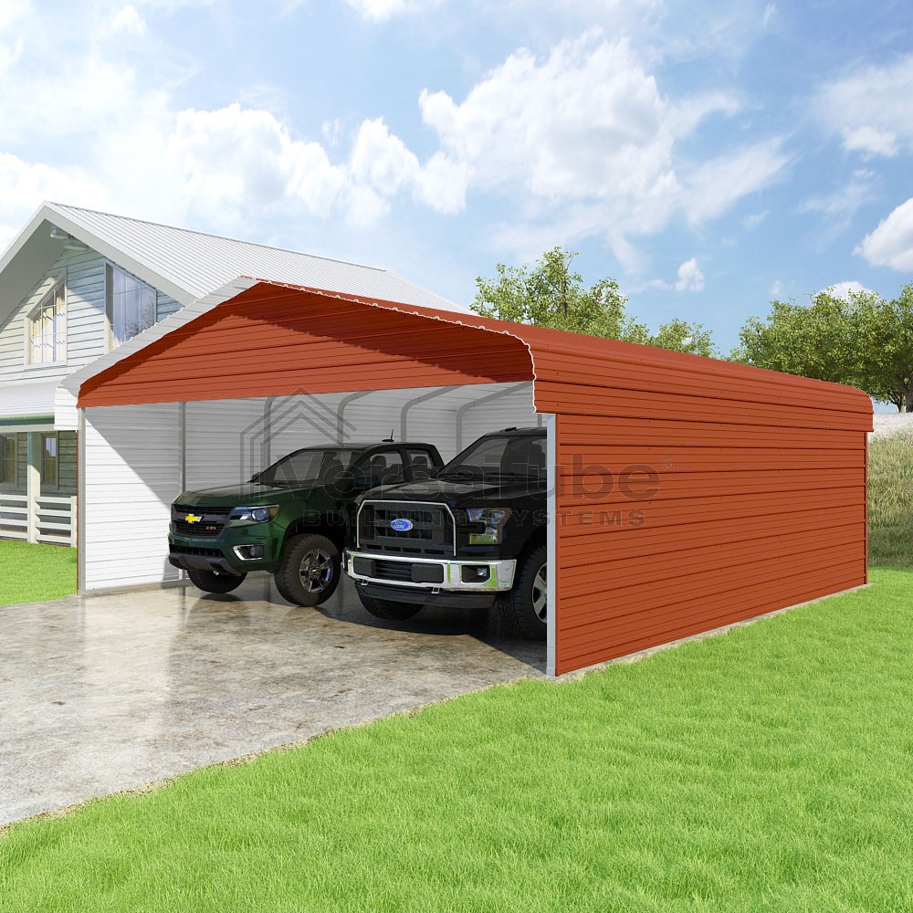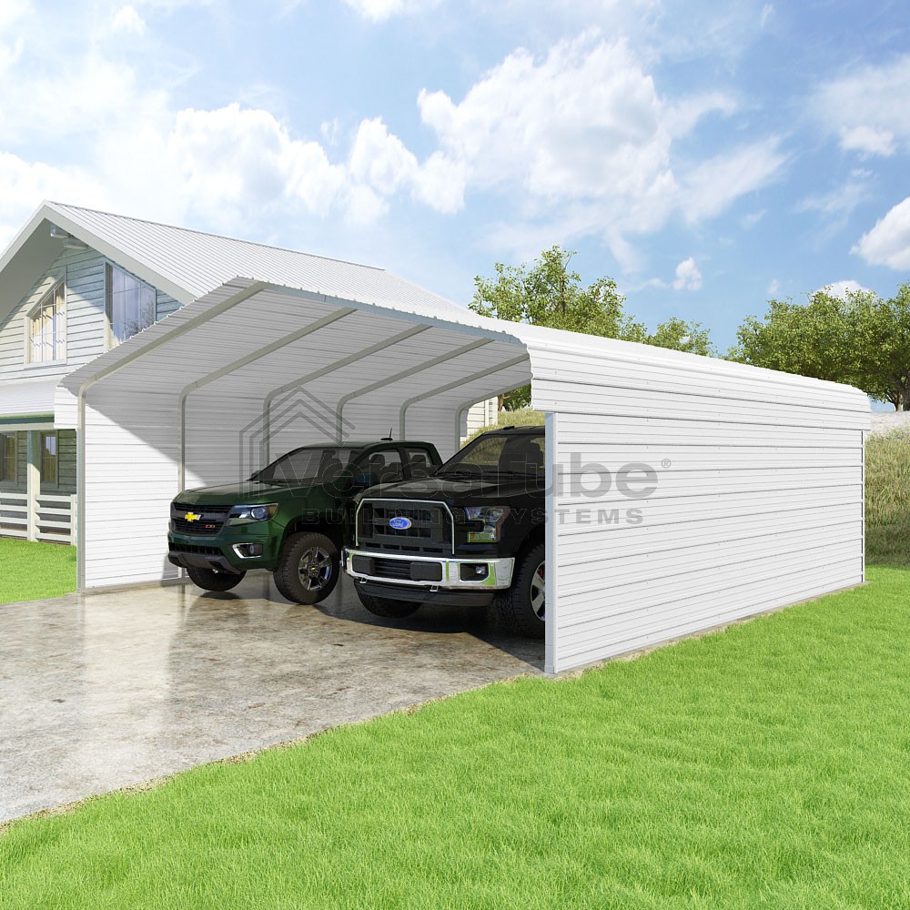 Classic Series DIY carport kit features horizontal application of sheet metal panels with the extra protection of rounded eaves.
