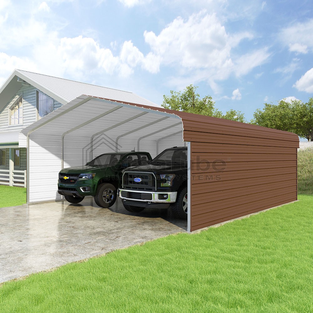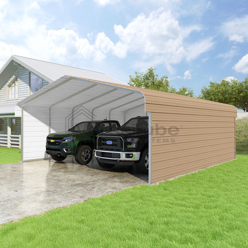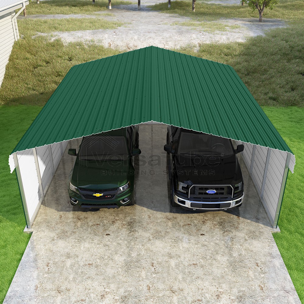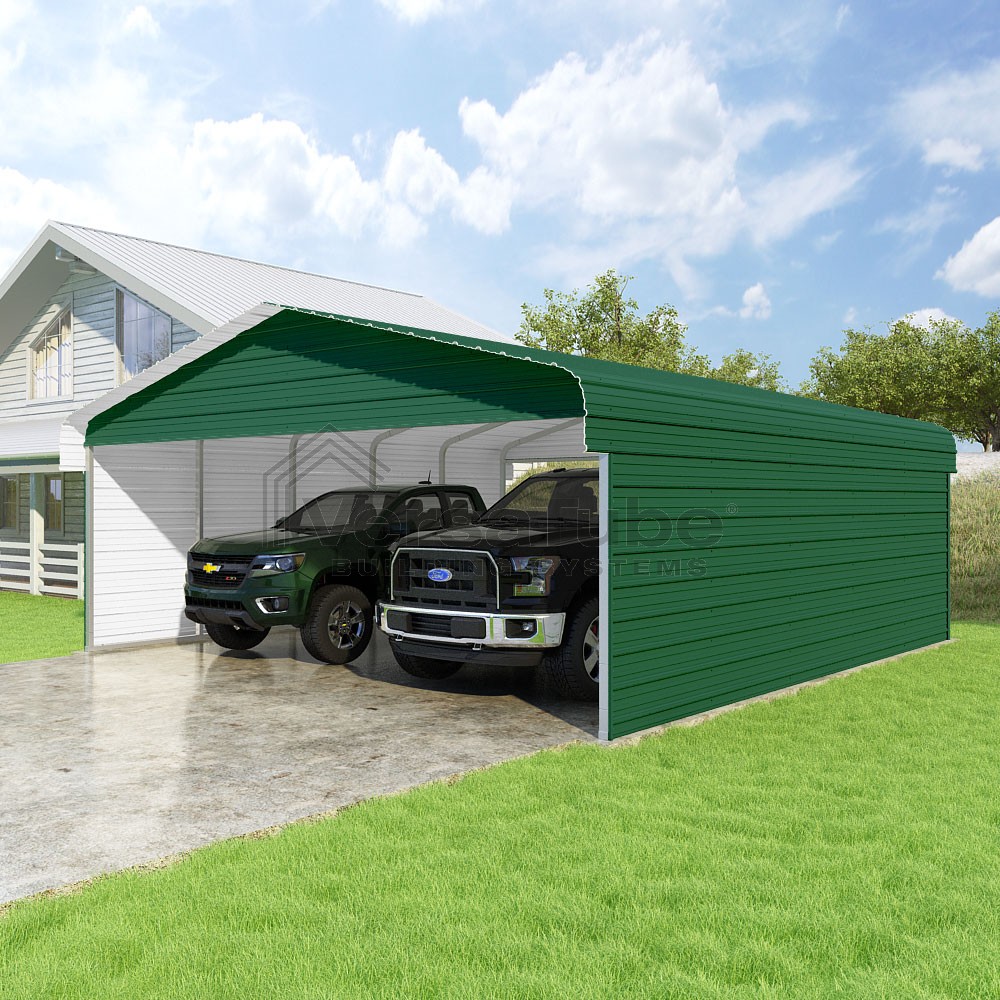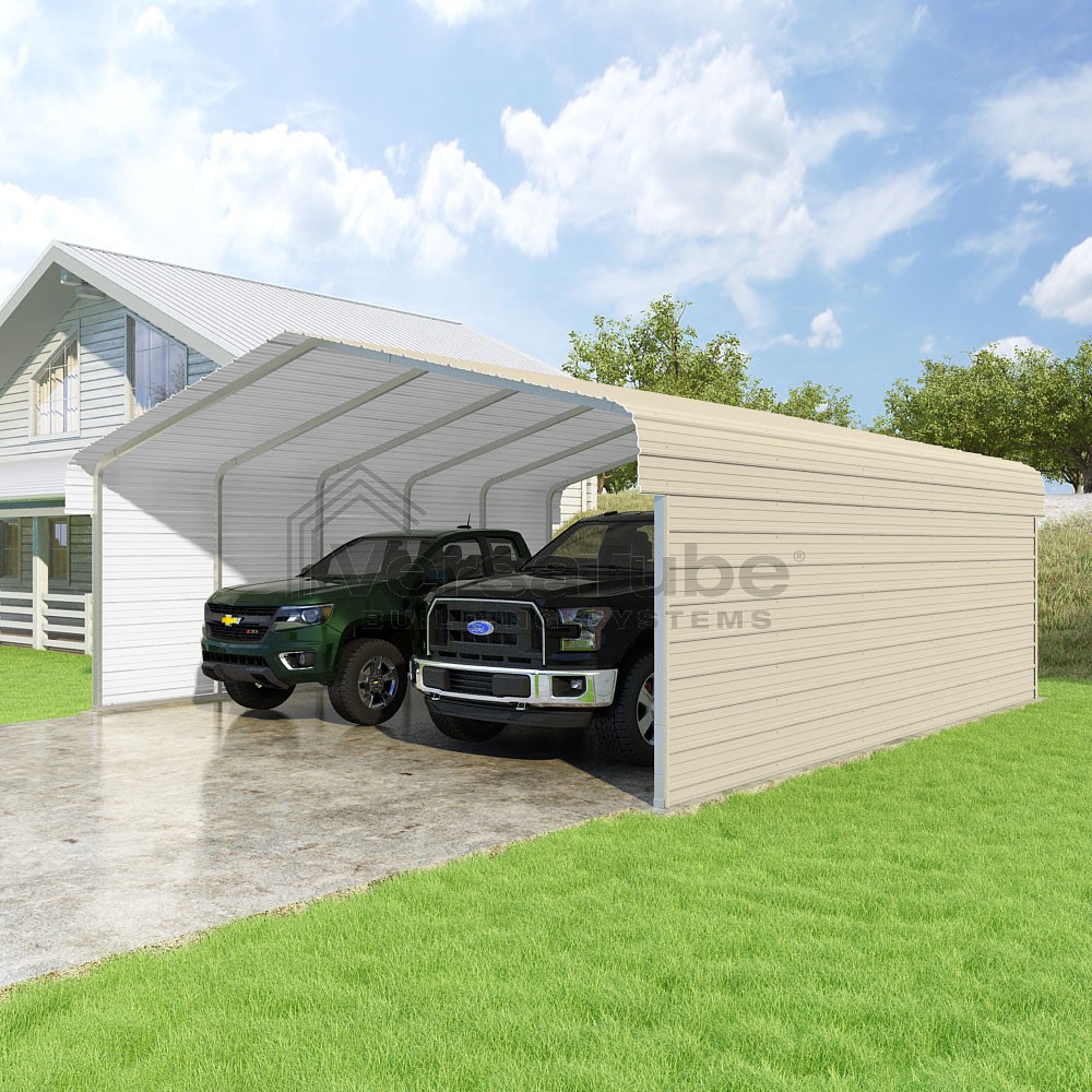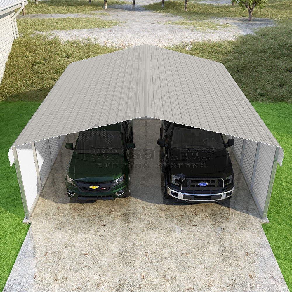 Classic Series DIY carport kit features horizontal application of sheet metal panels with the extra protection of rounded eaves.