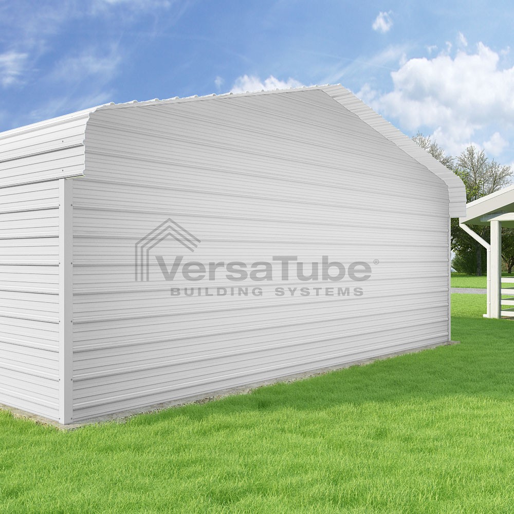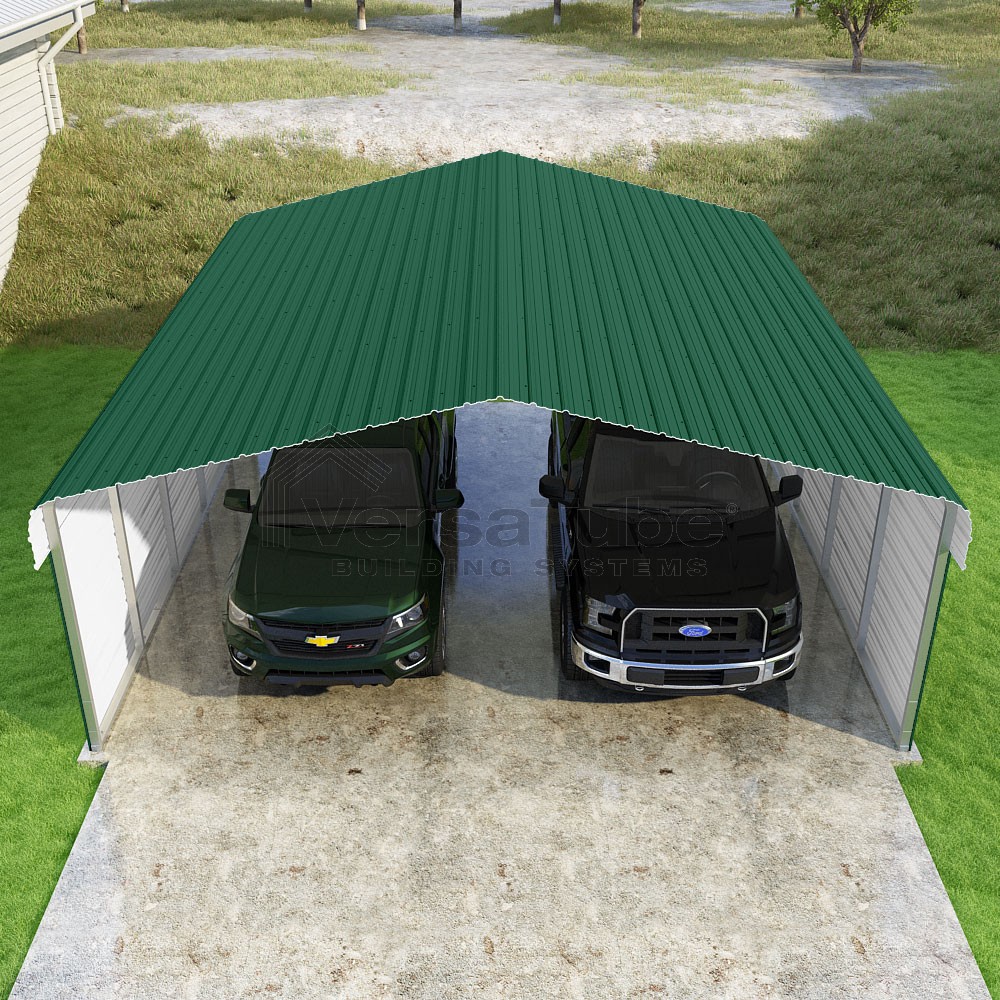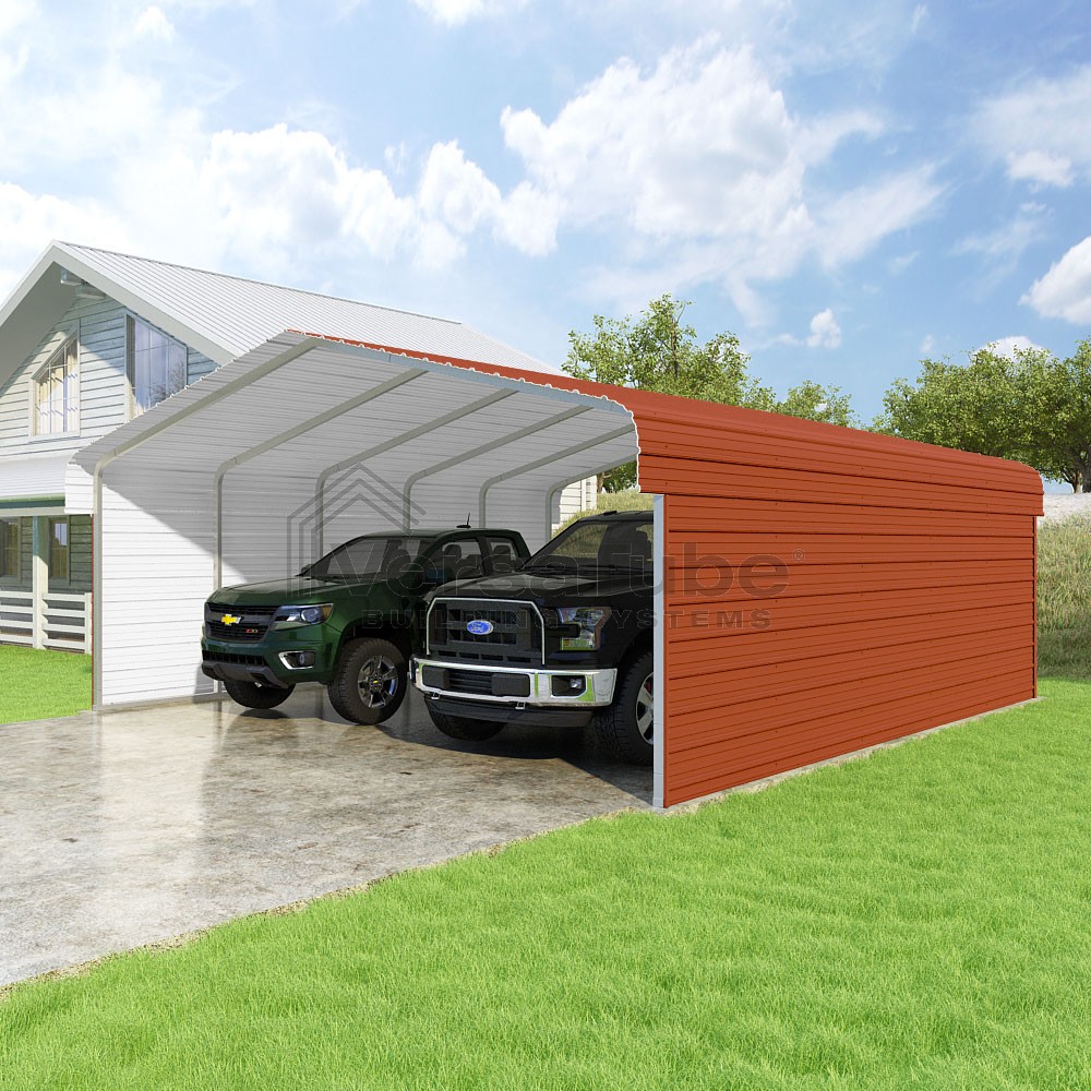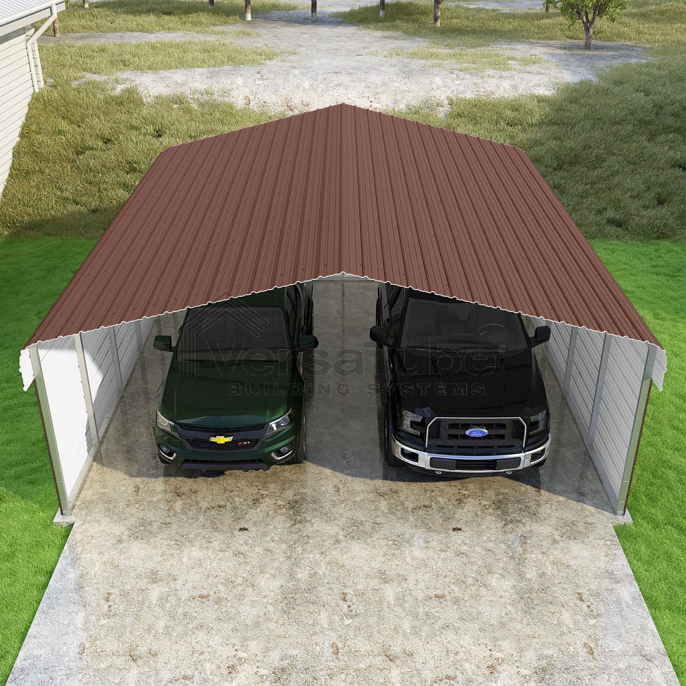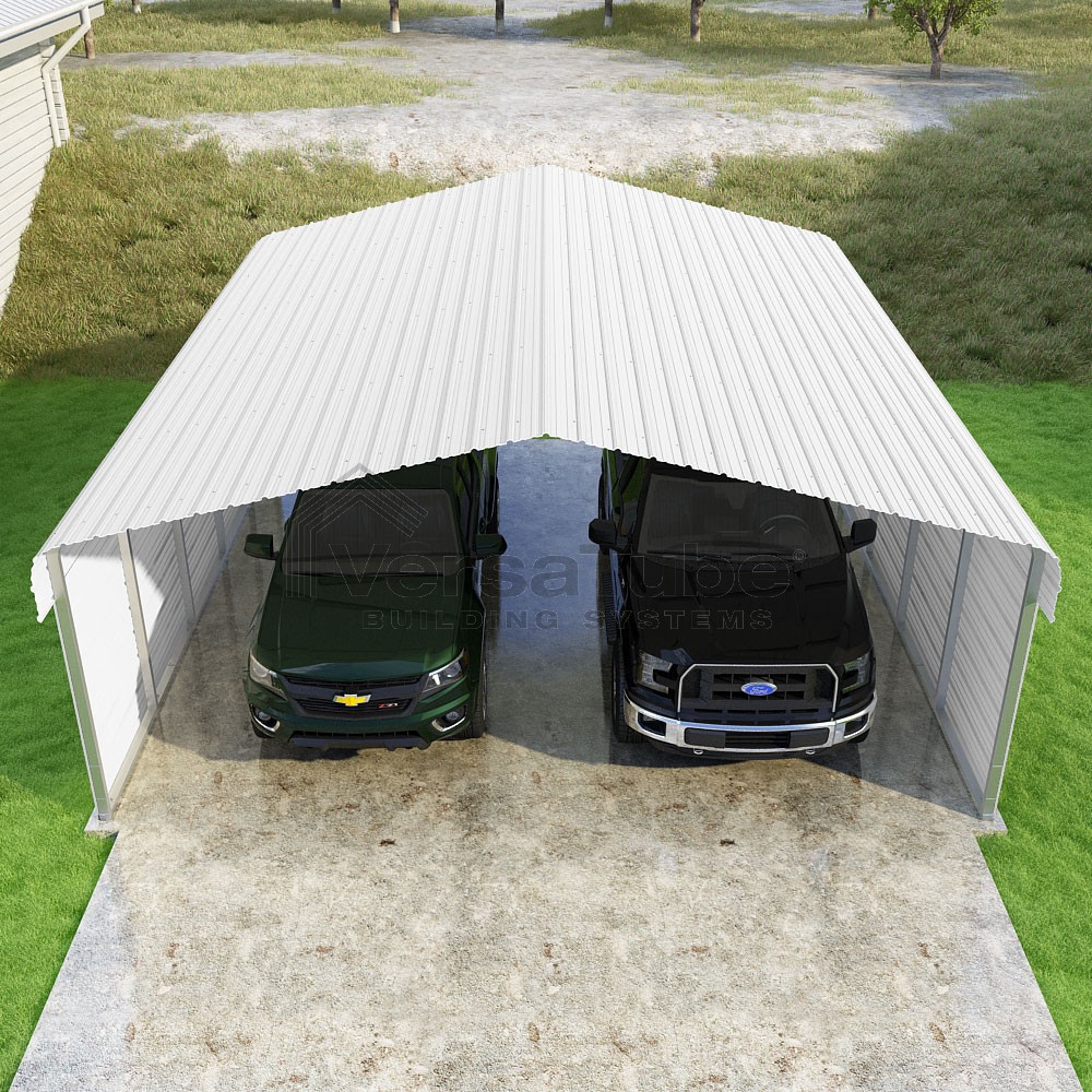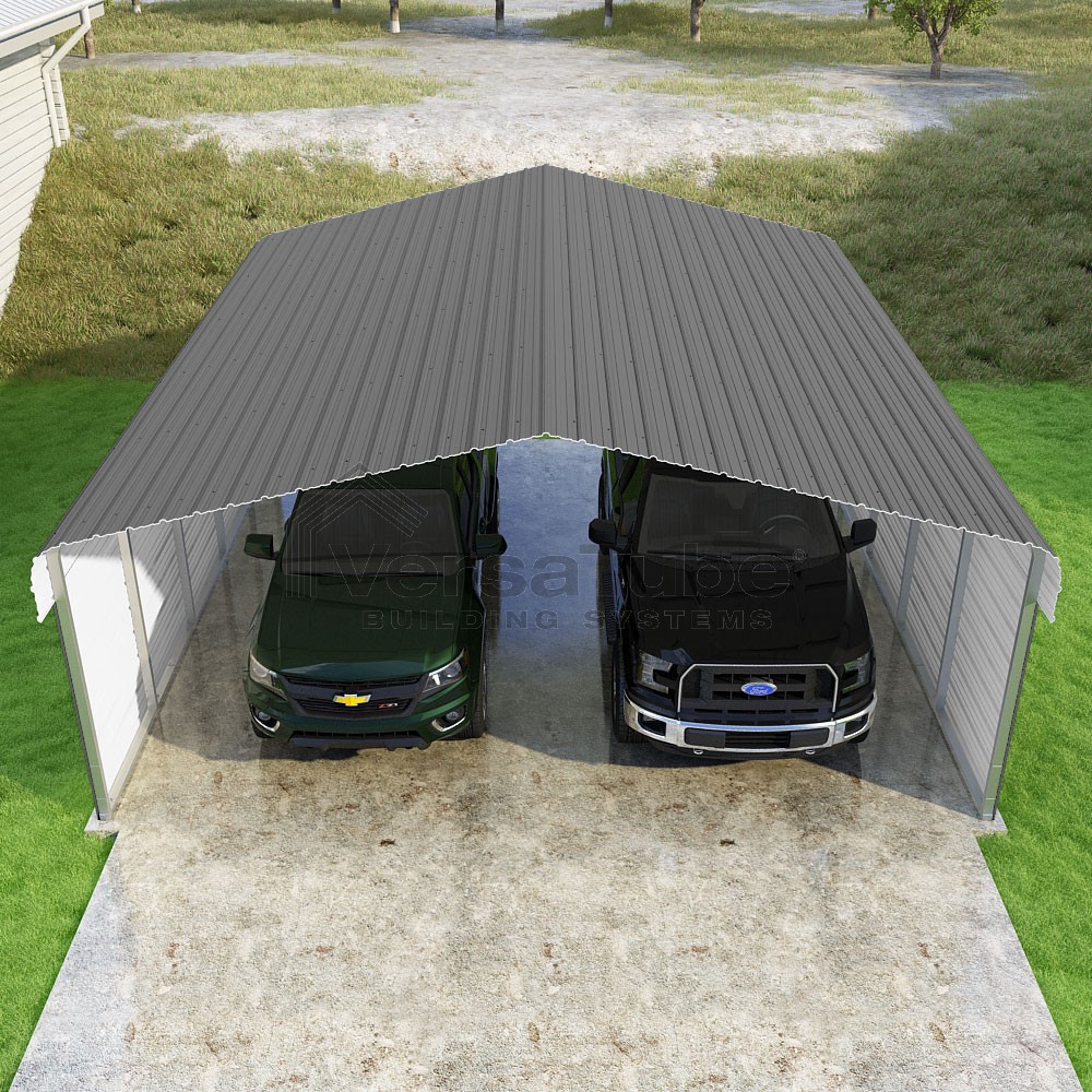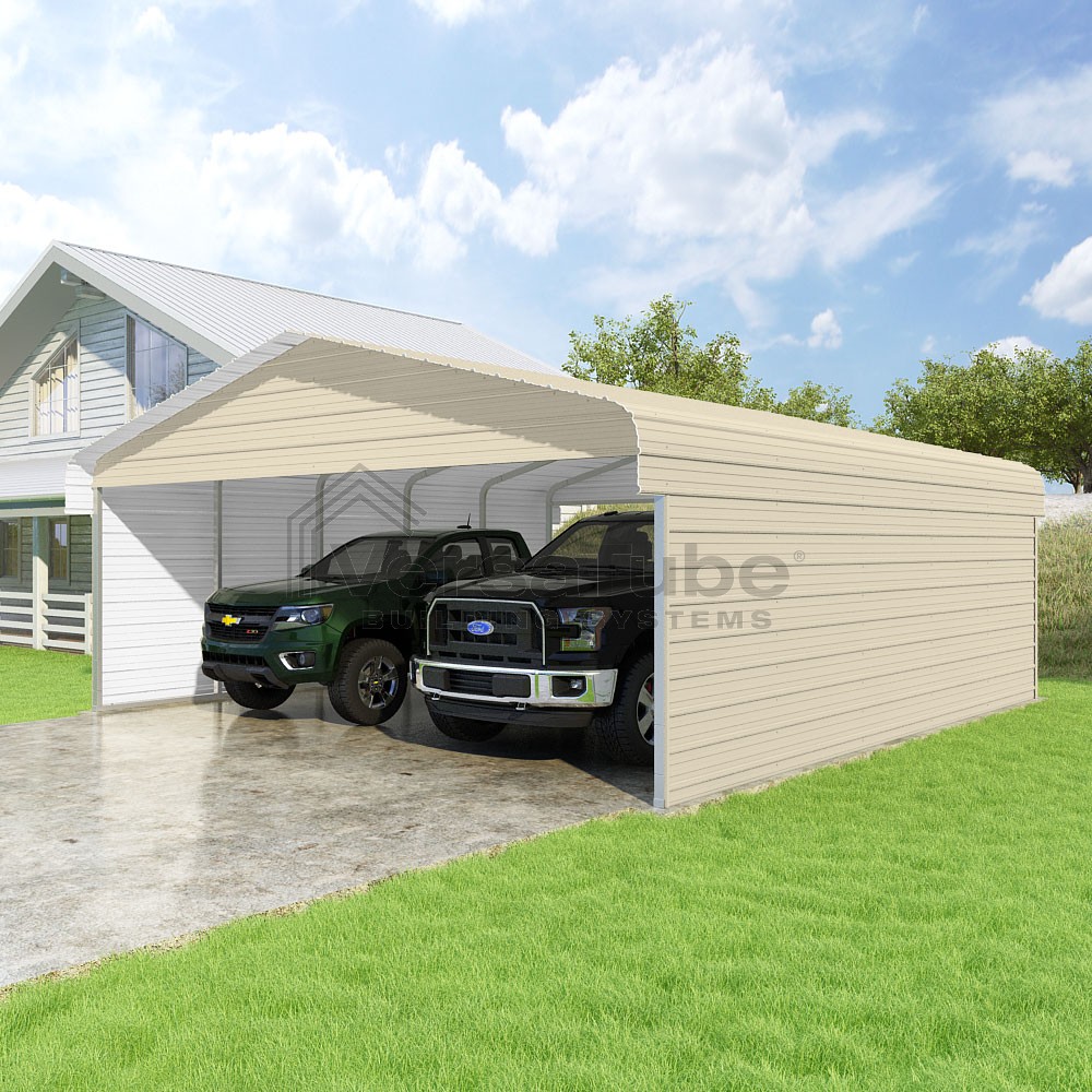 Classic Series DIY carport kit features horizontal application of sheet metal panels with the extra protection of rounded eaves.