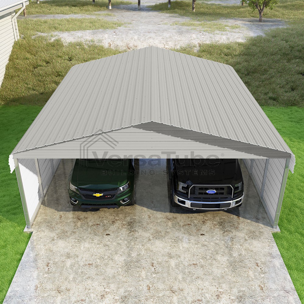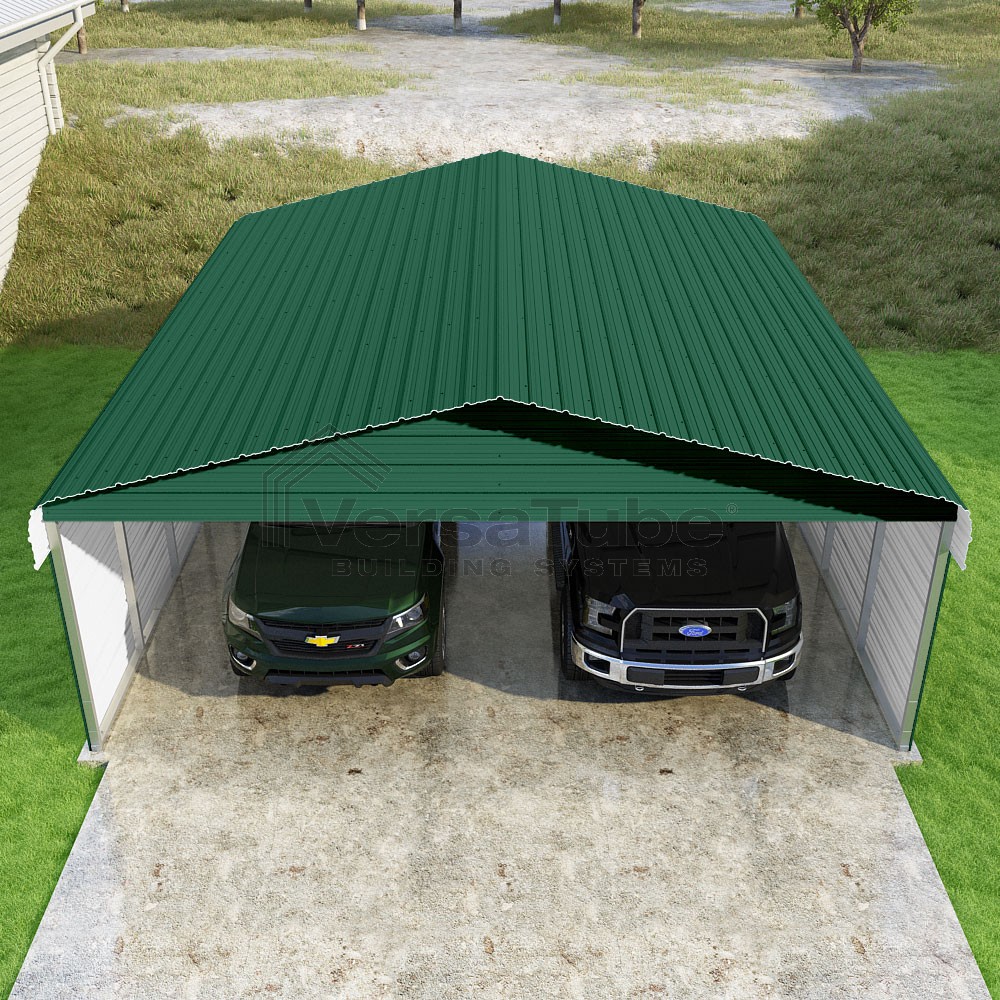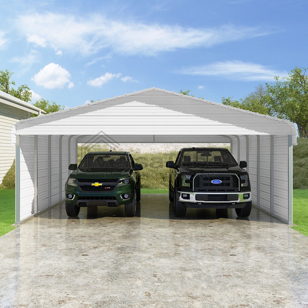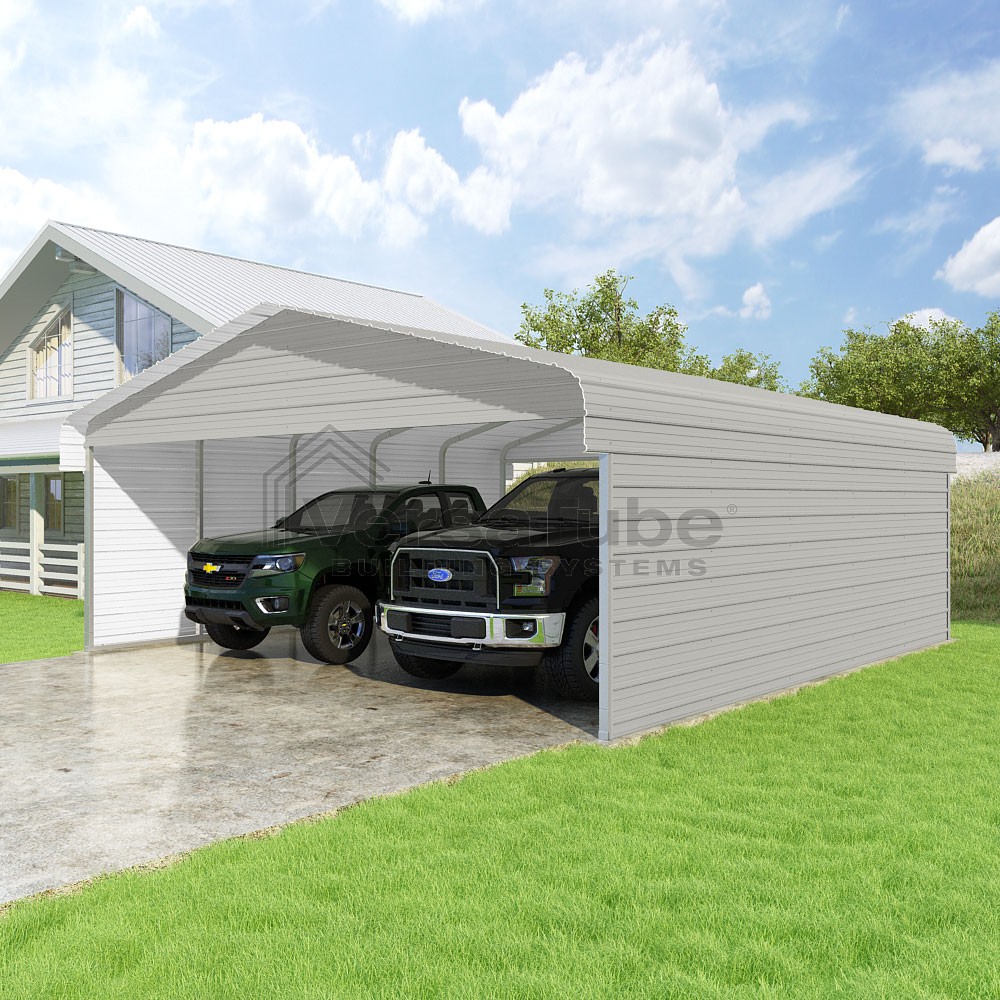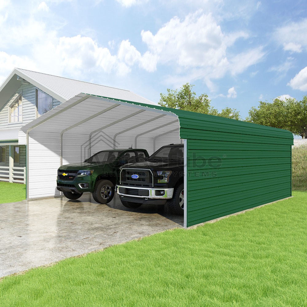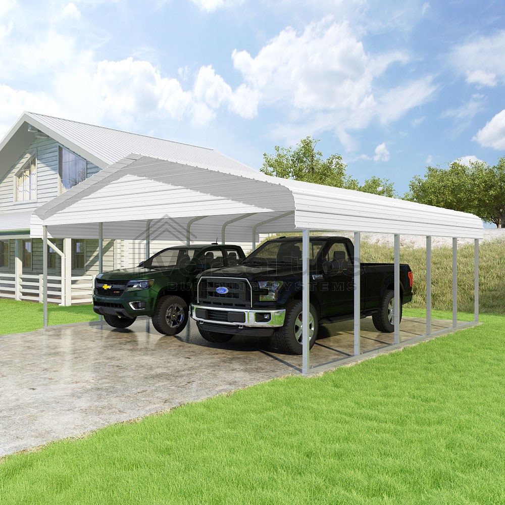 Classic Series DIY carport kit features horizontal application of sheet metal panels with the extra protection of rounded eaves.