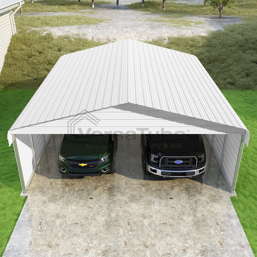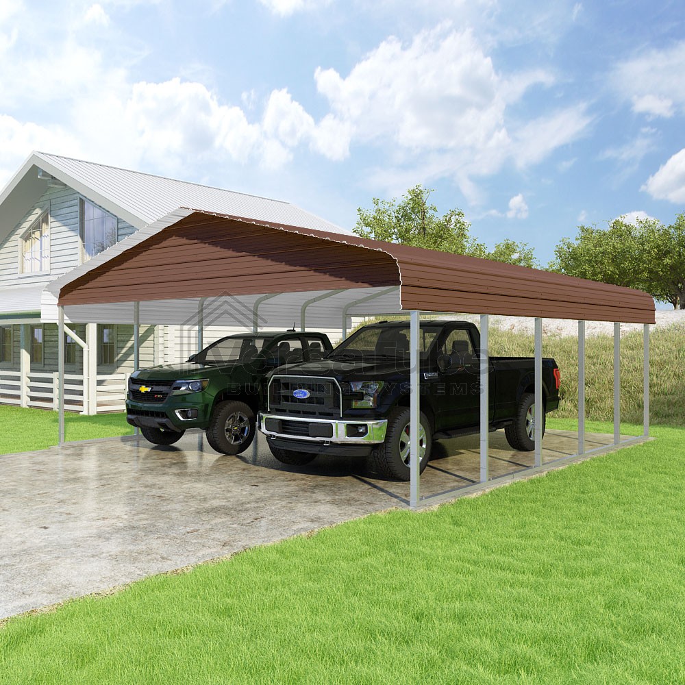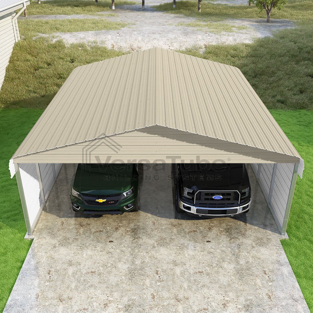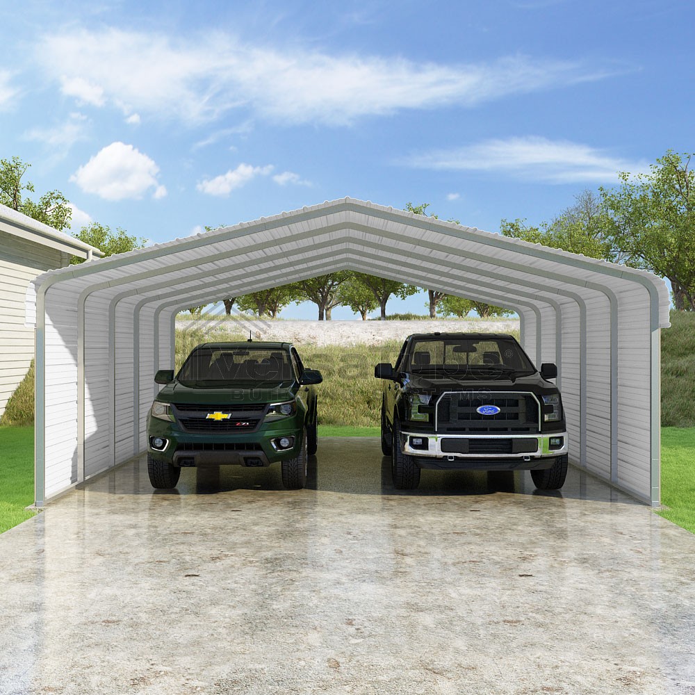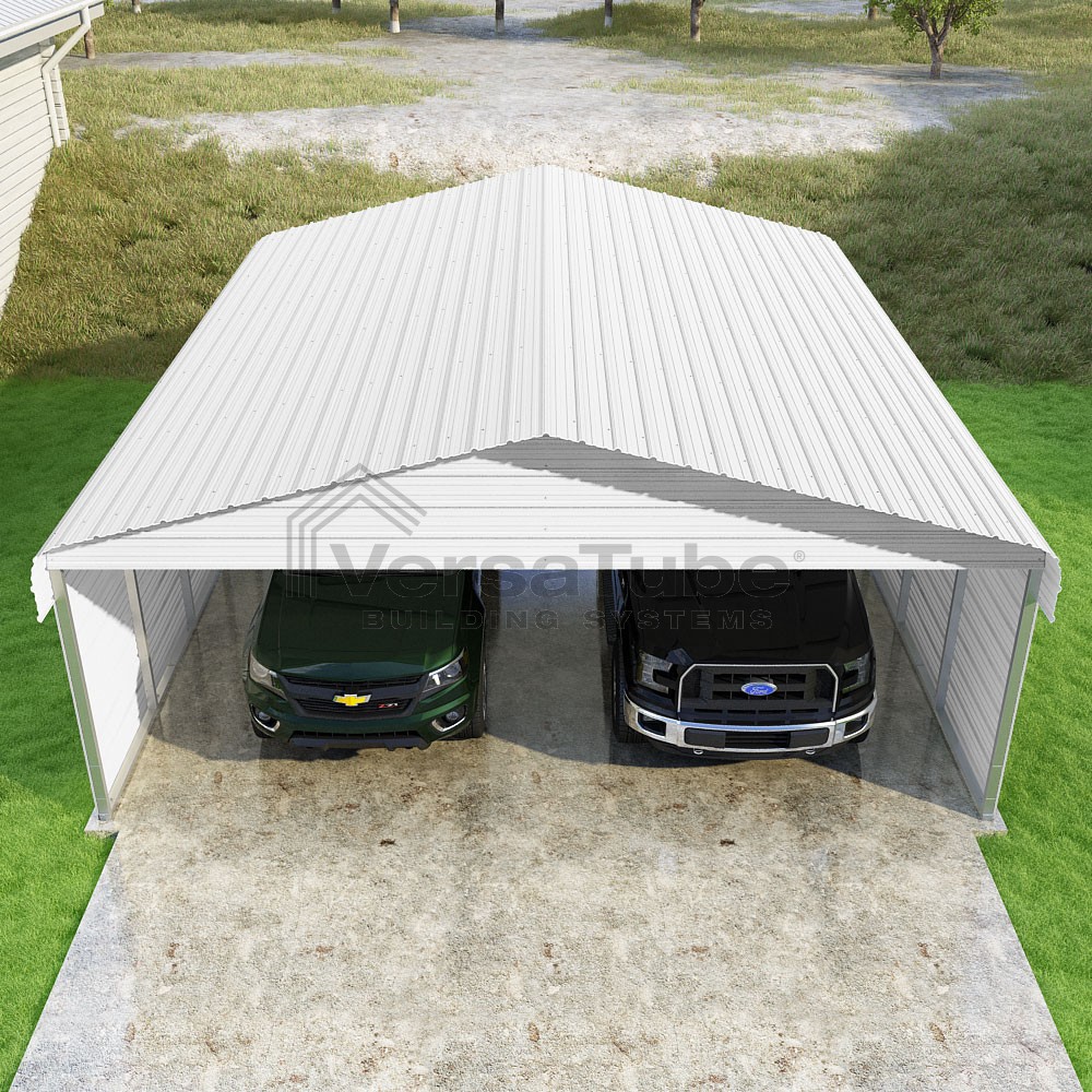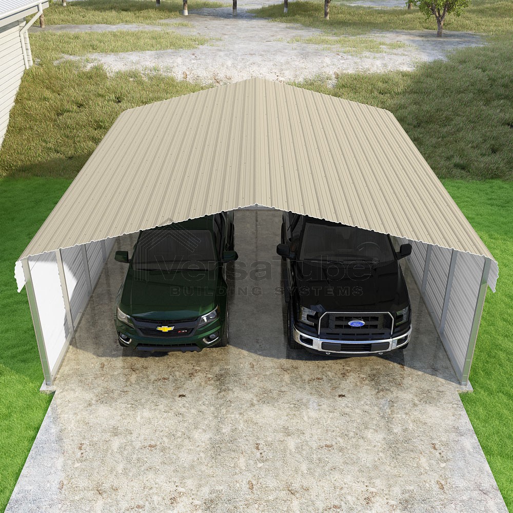 Classic Series DIY carport kit features horizontal application of sheet metal panels with the extra protection of rounded eaves.