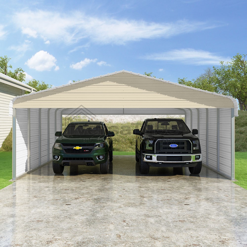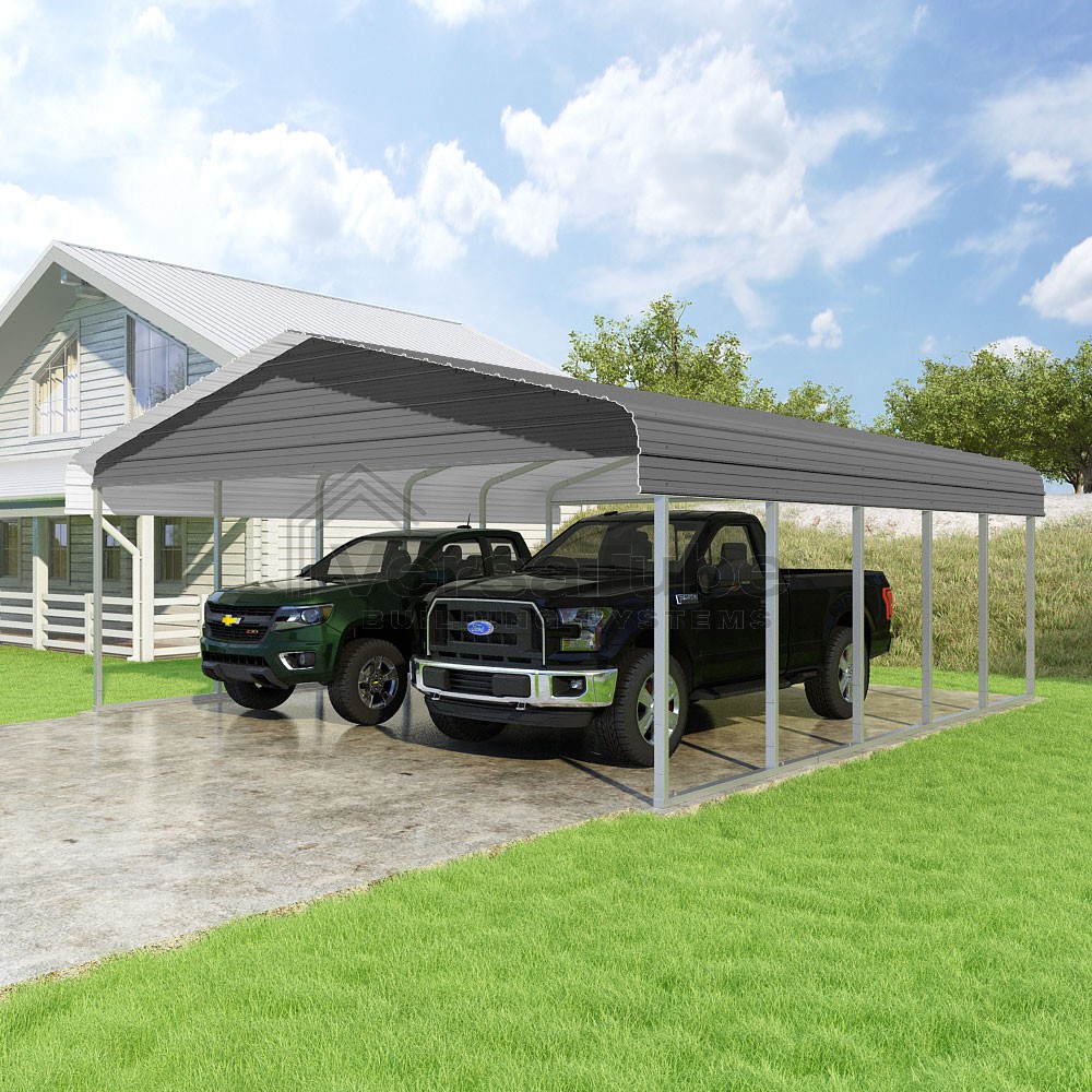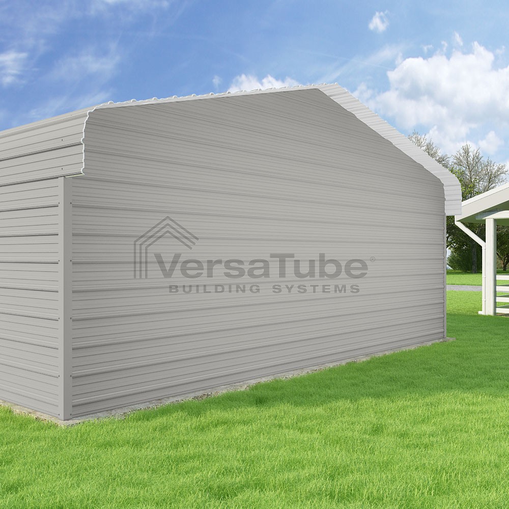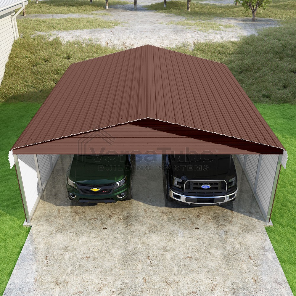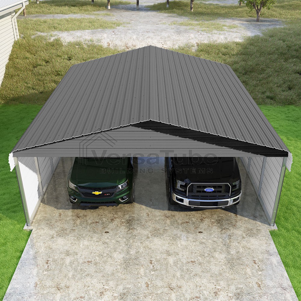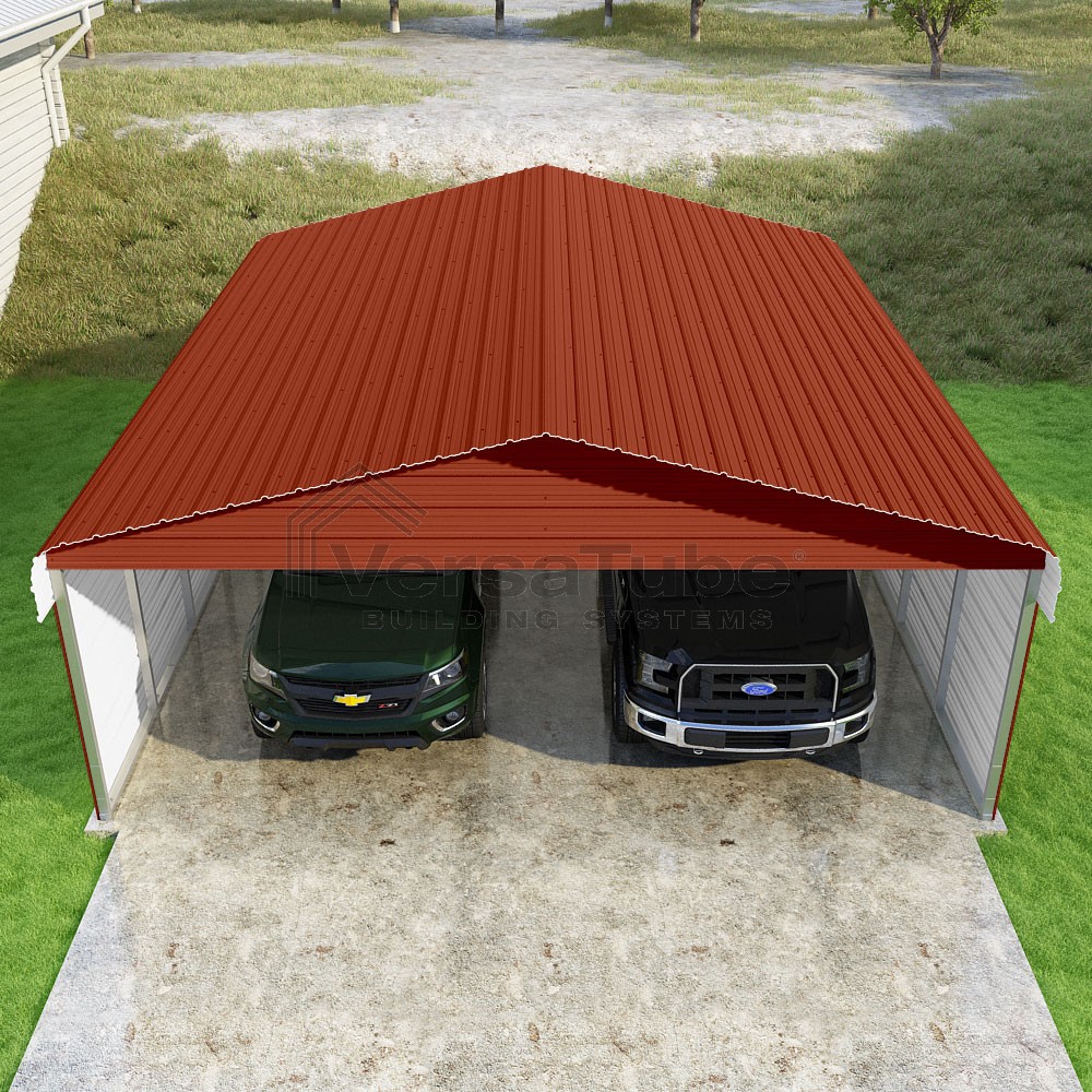 Classic Series DIY carport kit features horizontal application of sheet metal panels with the extra protection of rounded eaves.