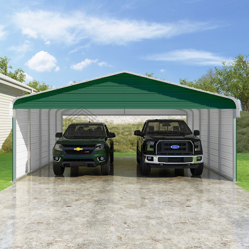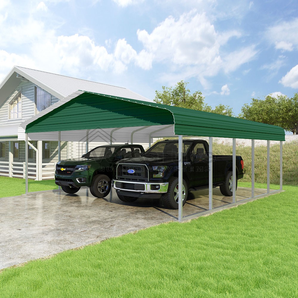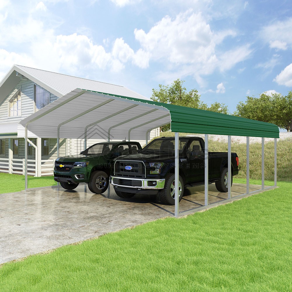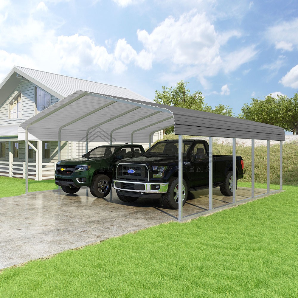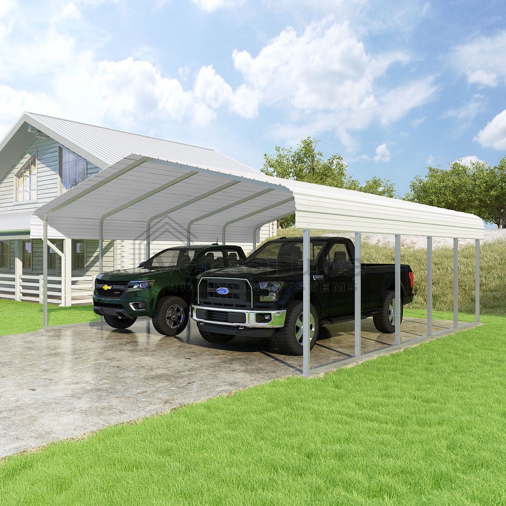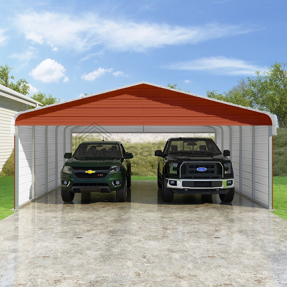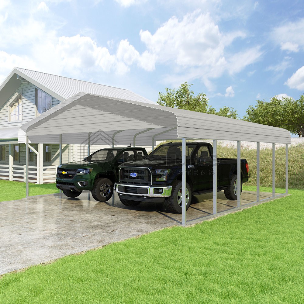 Classic Series DIY carport kit features horizontal application of sheet metal panels with the extra protection of rounded eaves.