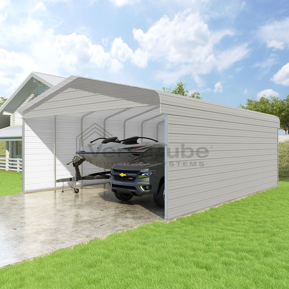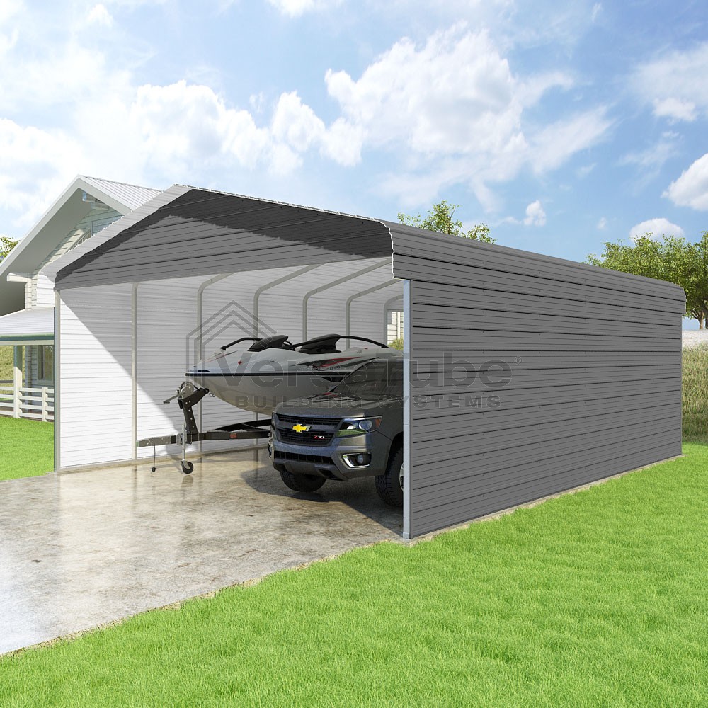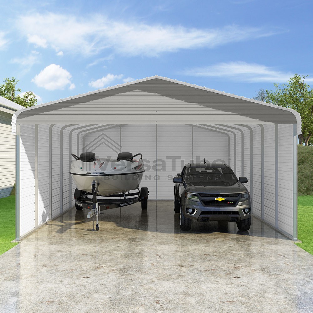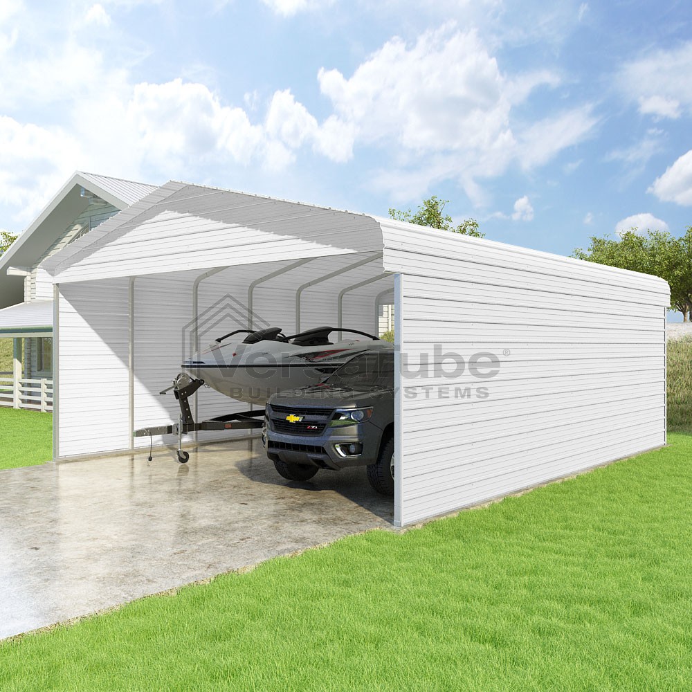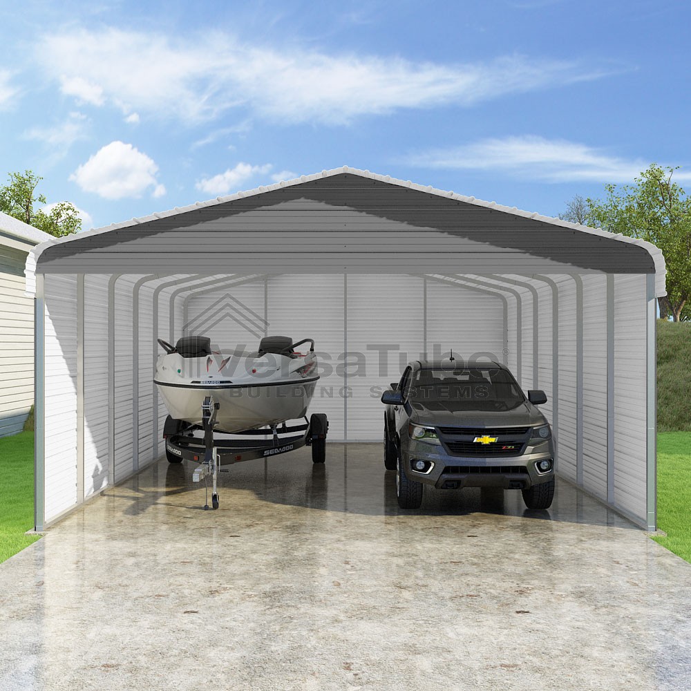 Classic Series DIY carport kit features horizontal application of sheet metal panels with the extra protection of rounded eaves.