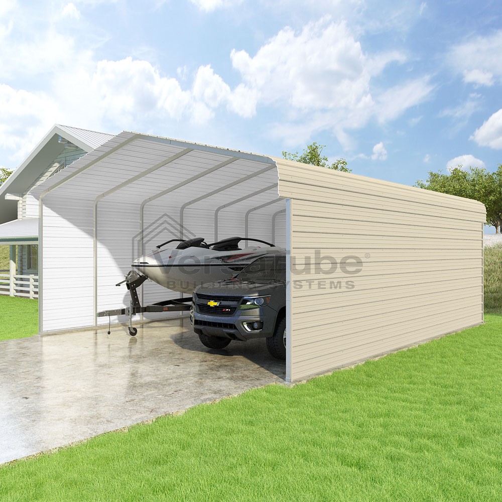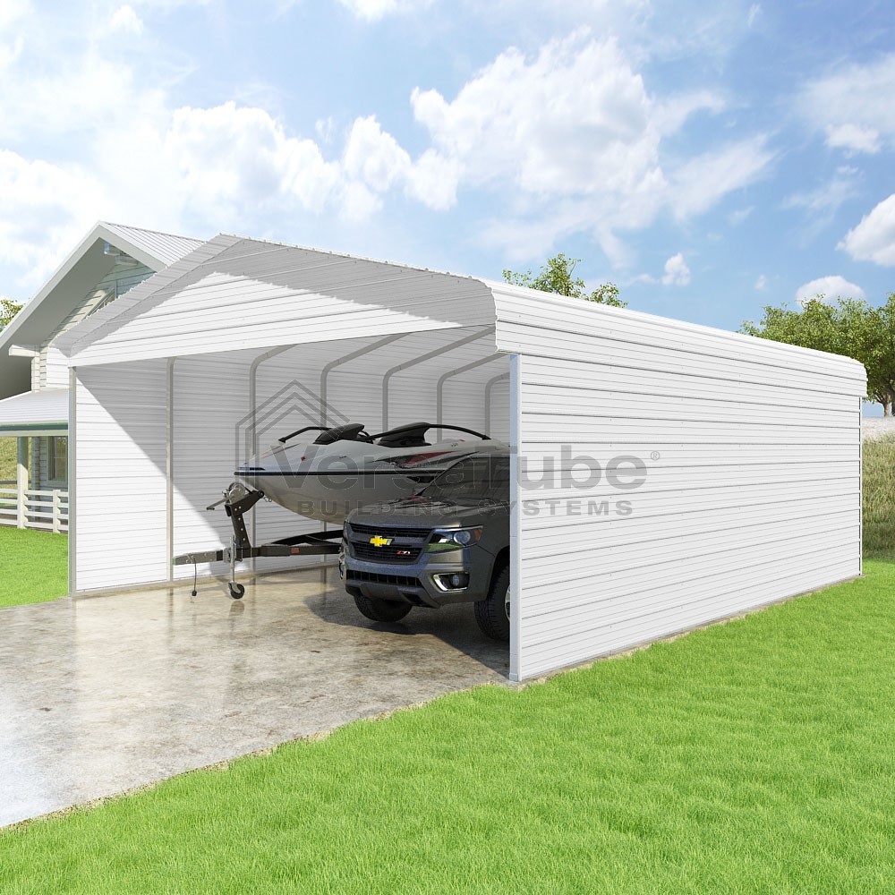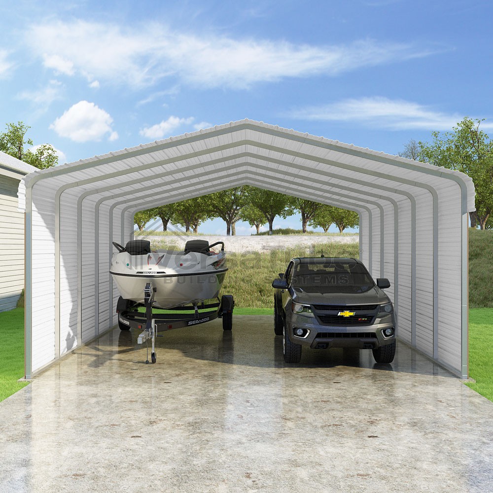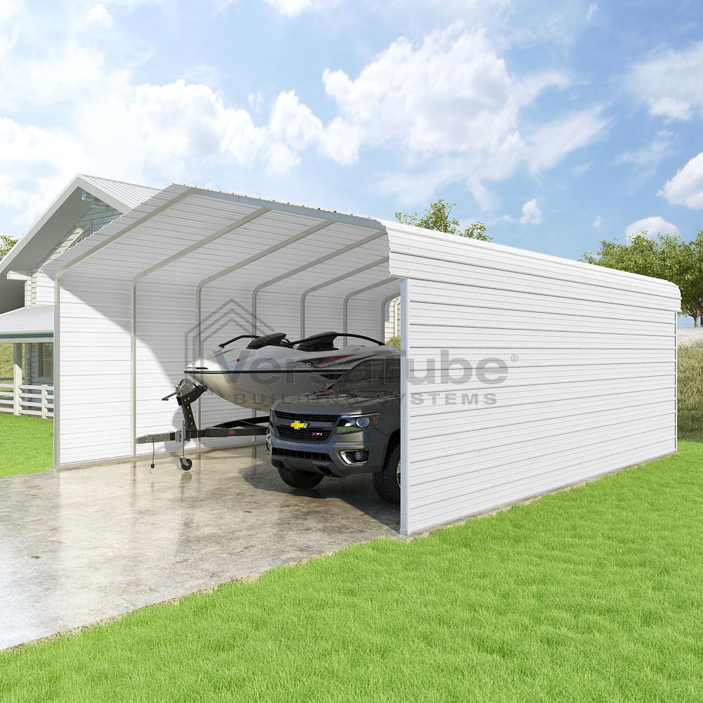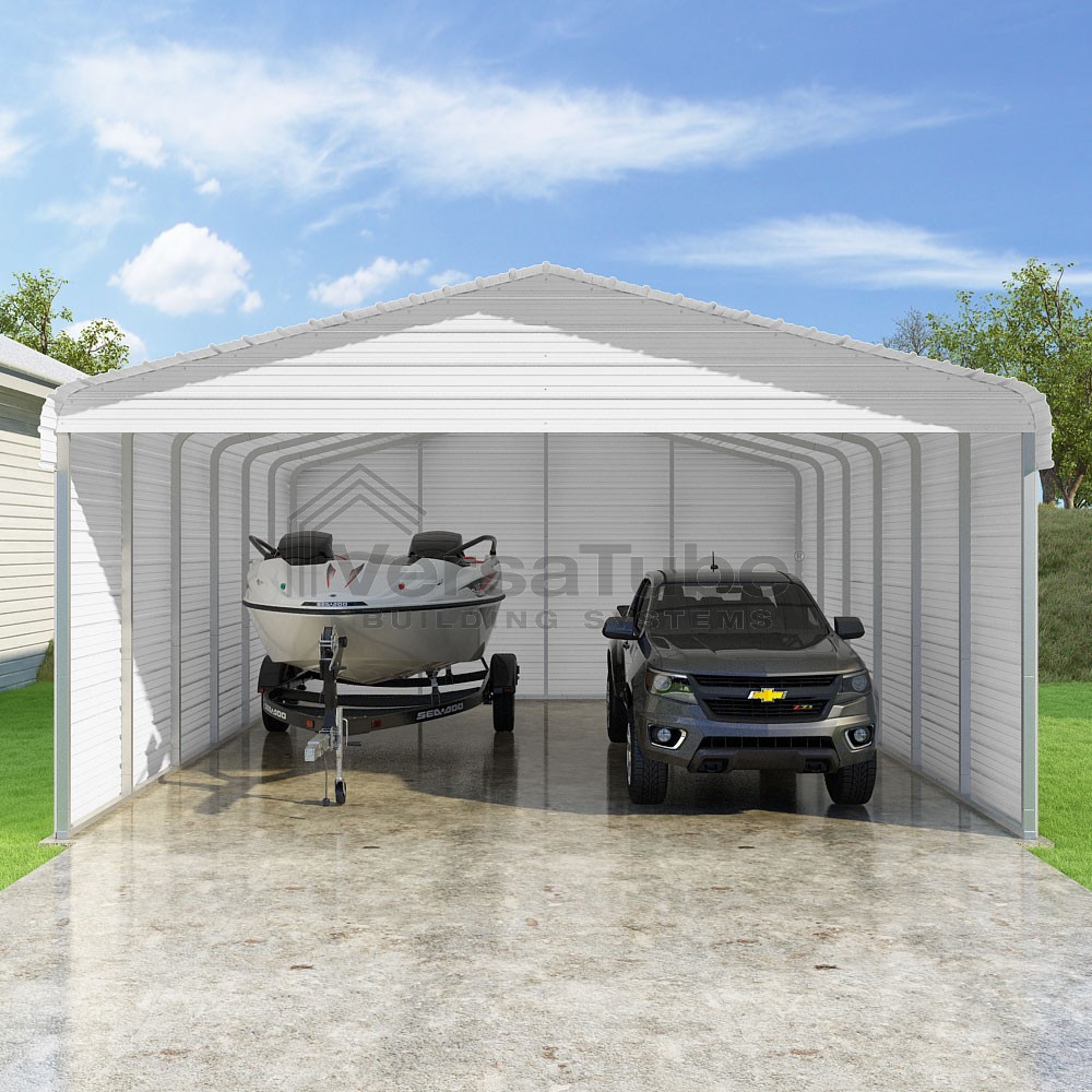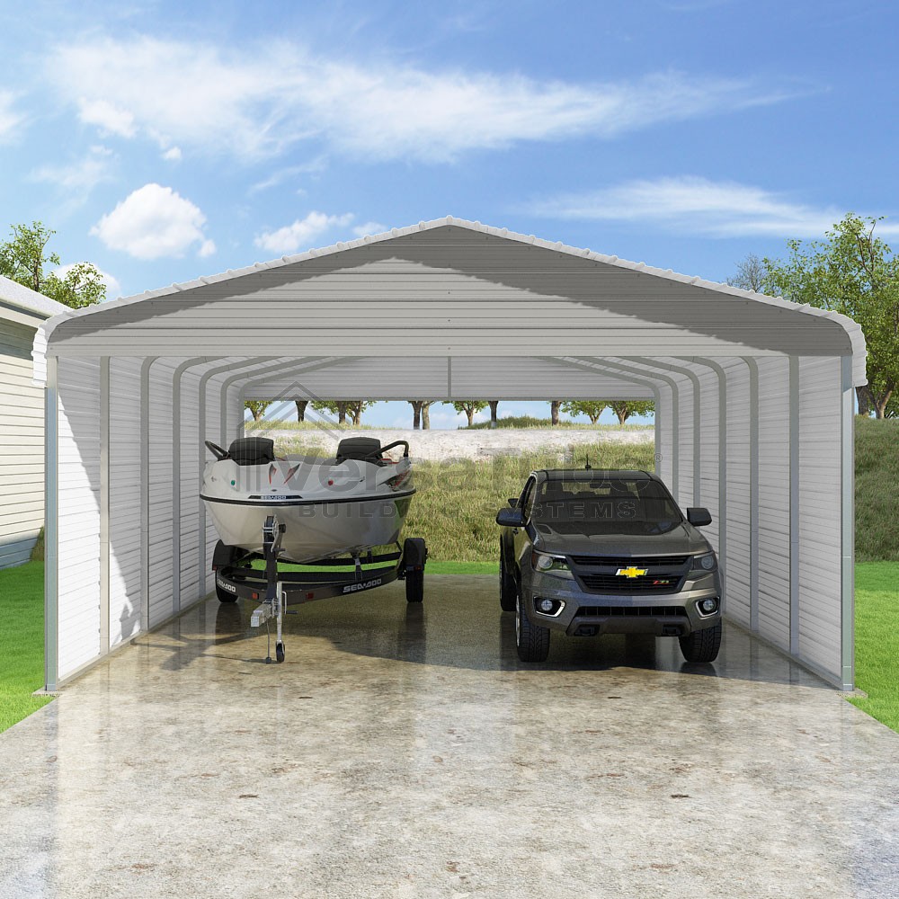 Classic Series DIY carport kit features horizontal application of sheet metal panels with the extra protection of rounded eaves.
