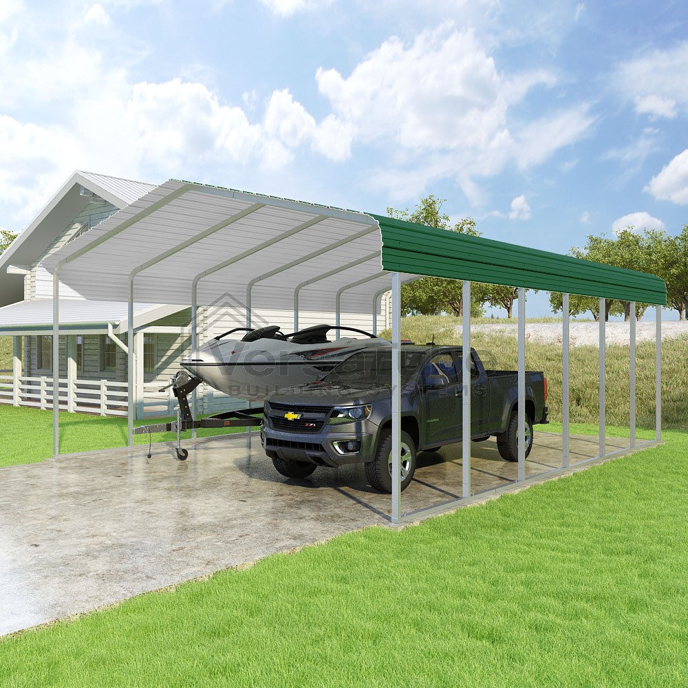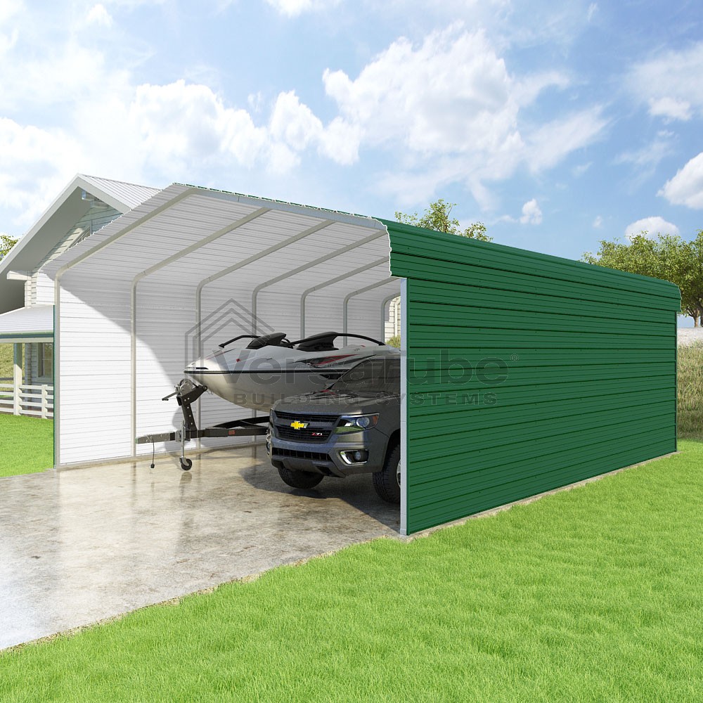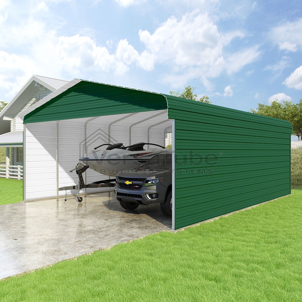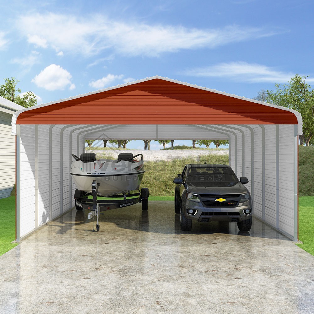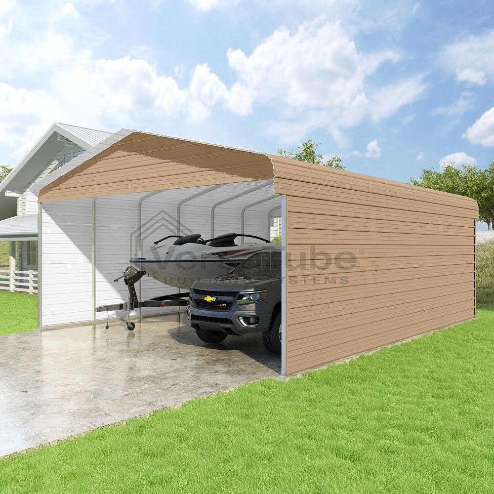 Classic Series DIY carport kit features horizontal application of sheet metal panels with the extra protection of rounded eaves.