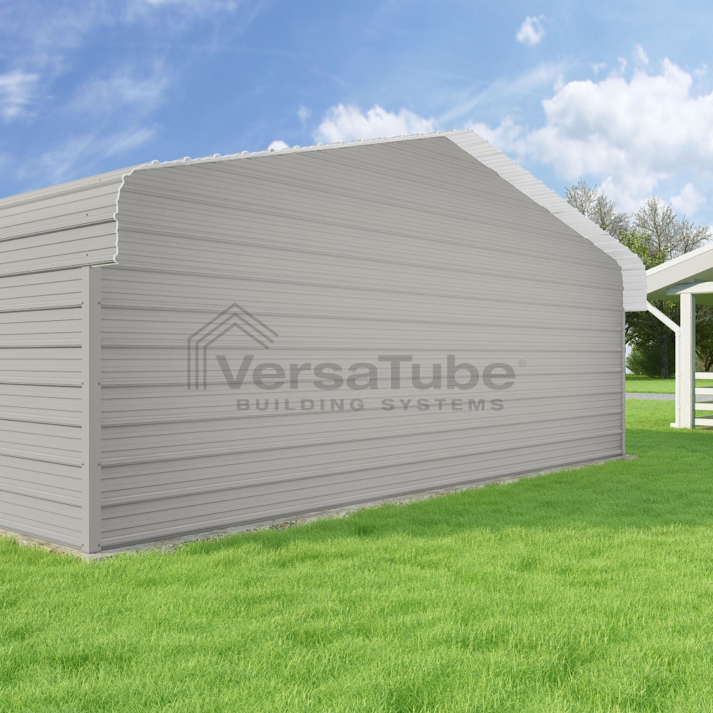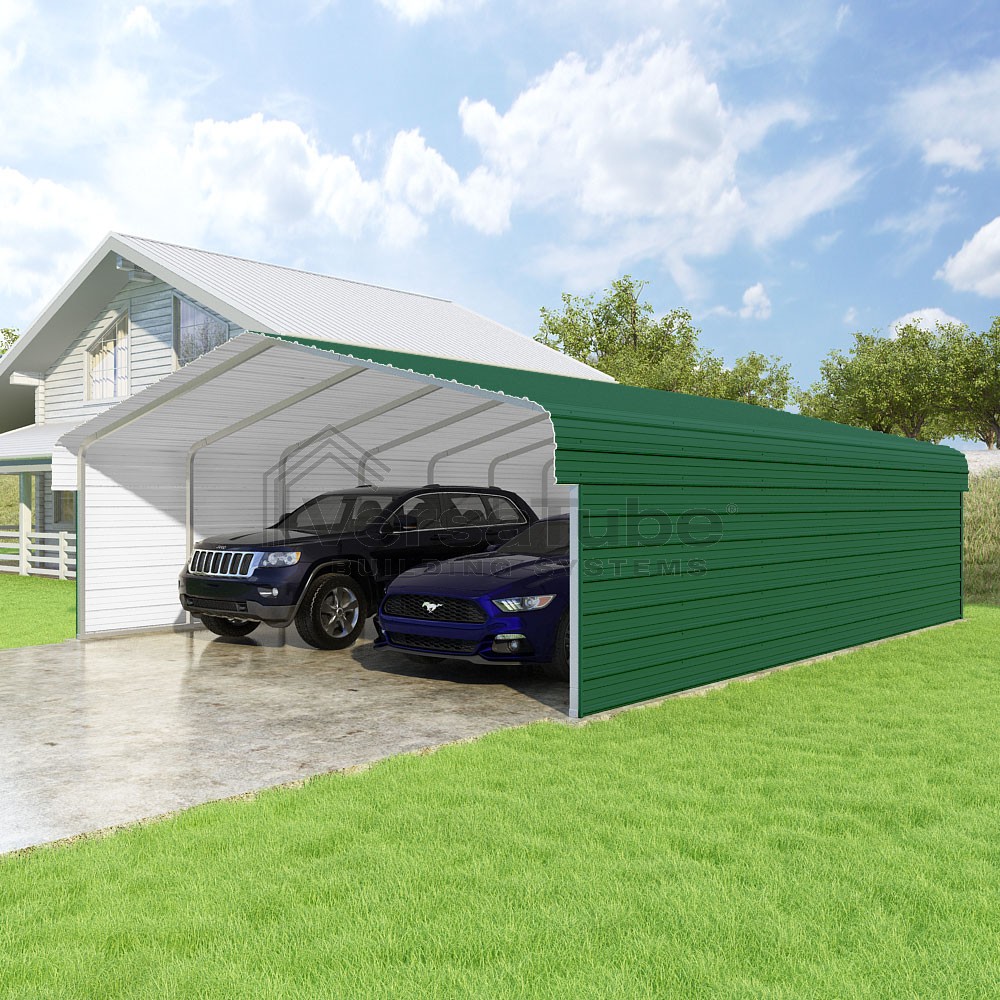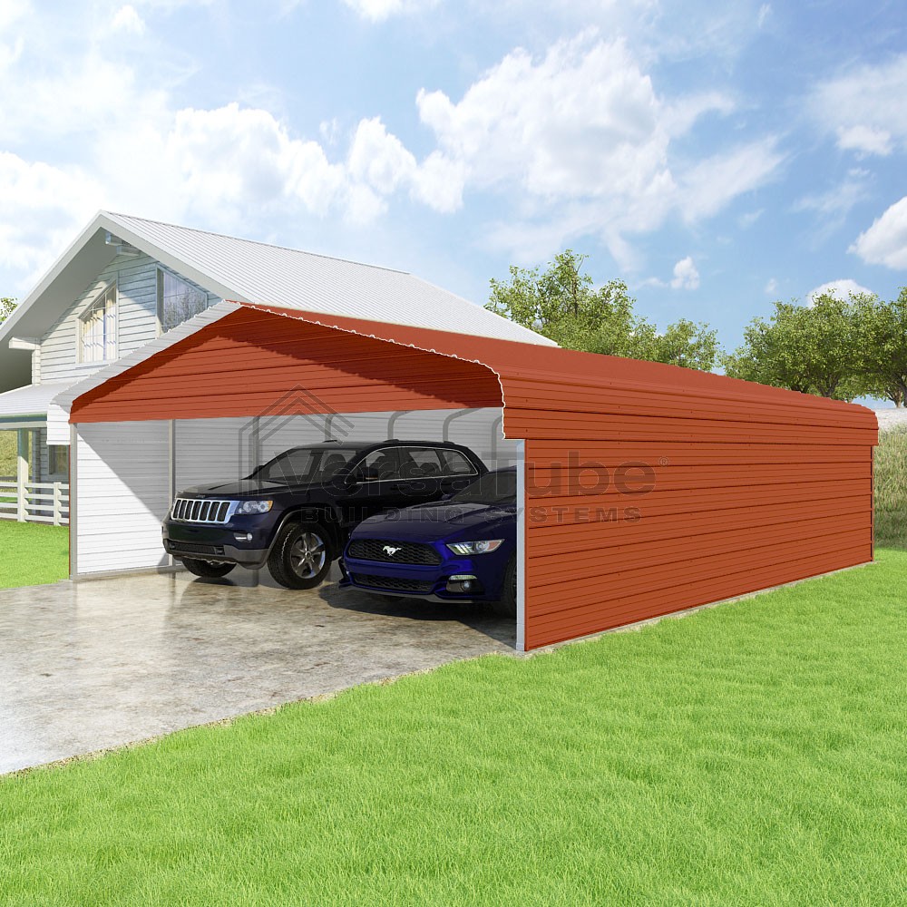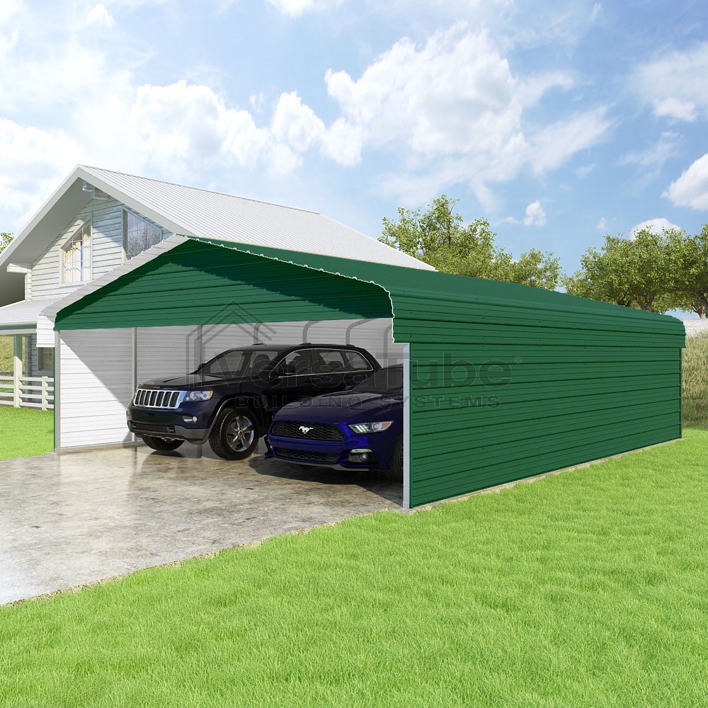 Classic Series DIY carport kit features horizontal application of sheet metal panels with the extra protection of rounded eaves.