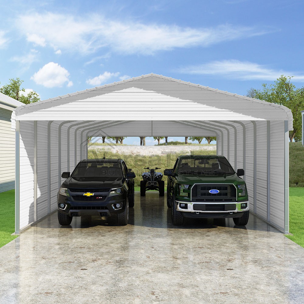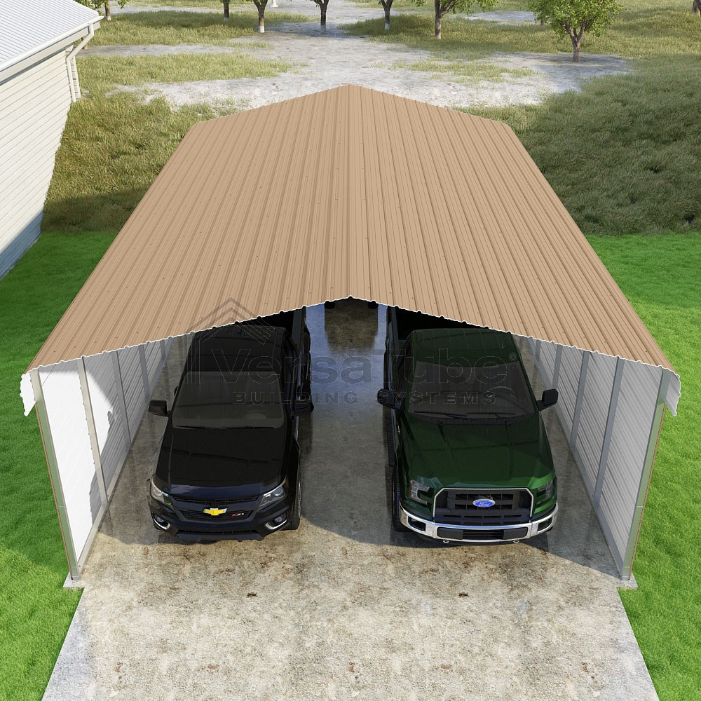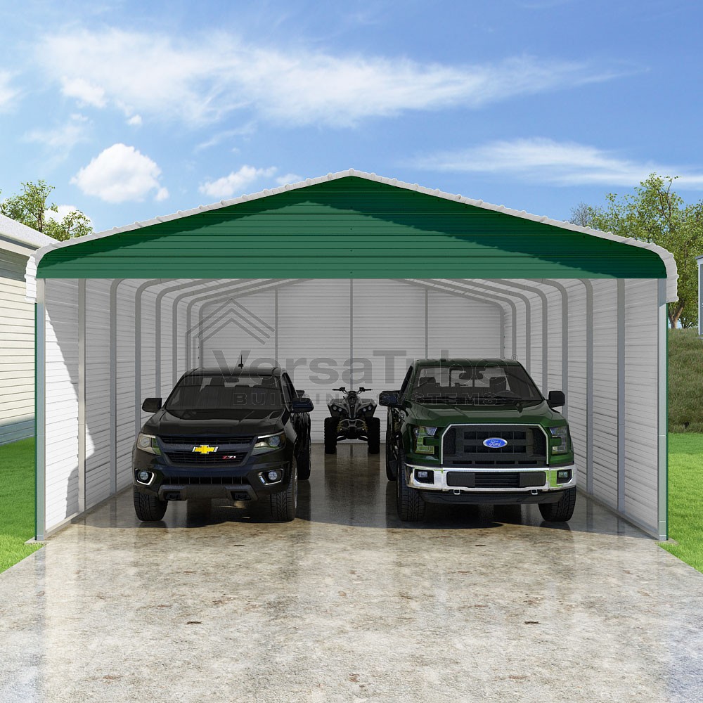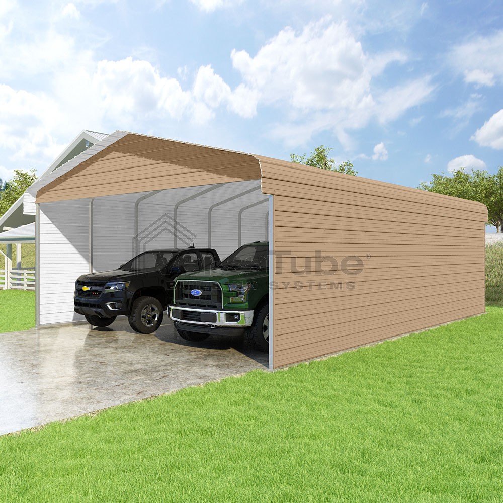 Classic Series DIY carport kit features horizontal application of sheet metal panels with the extra protection of rounded eaves.