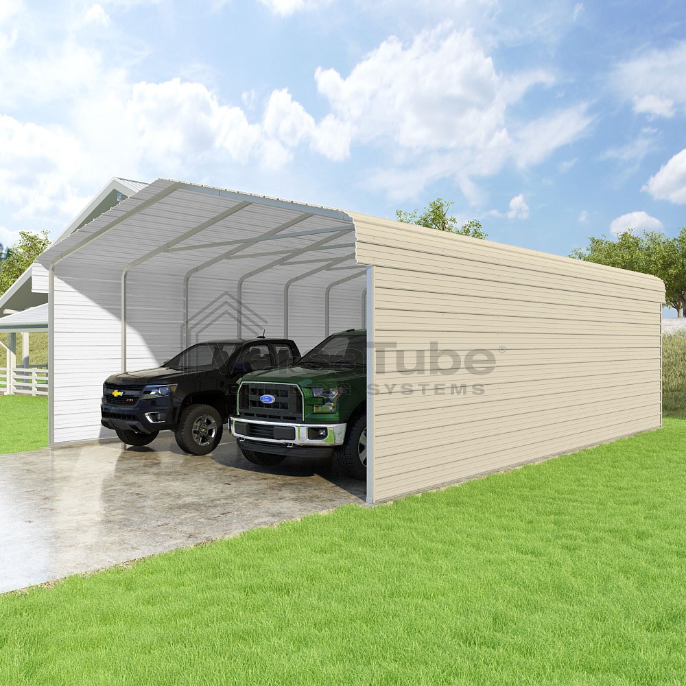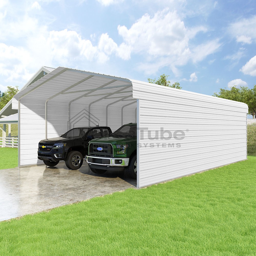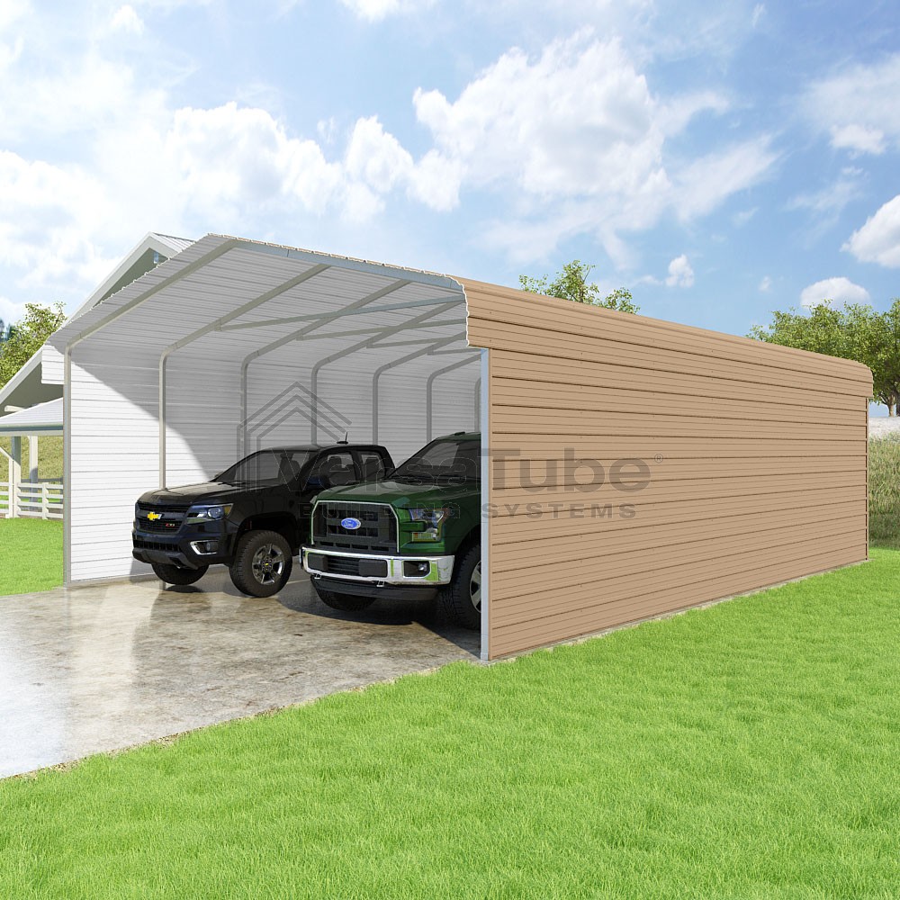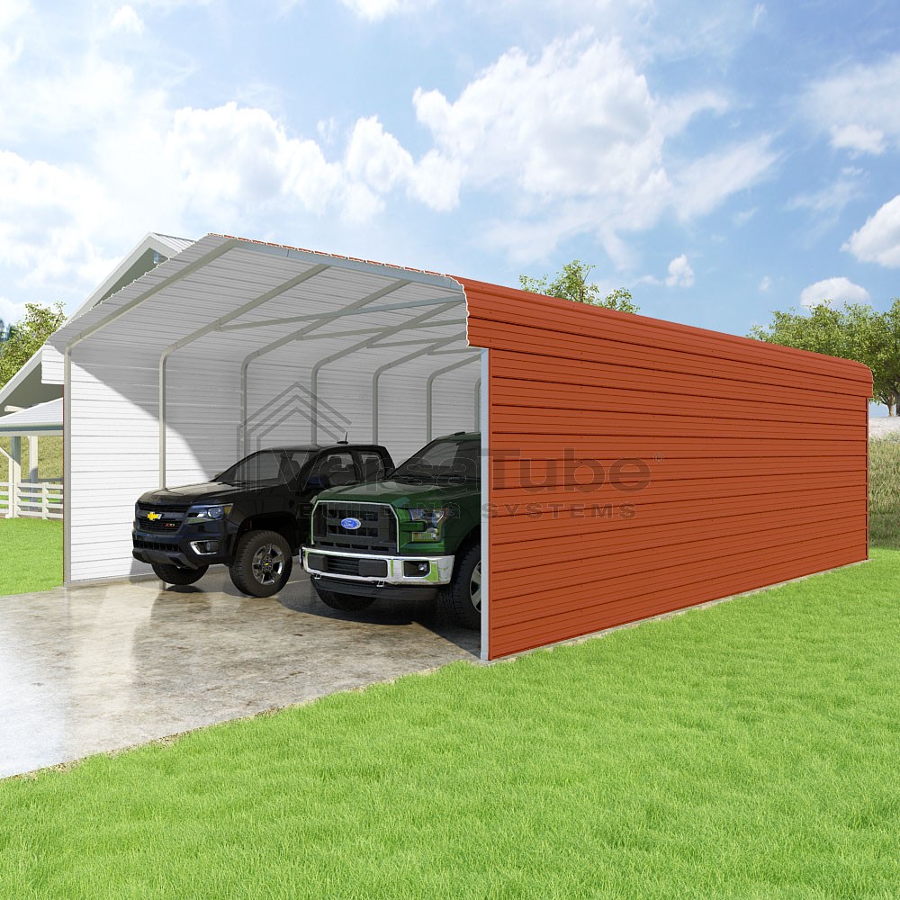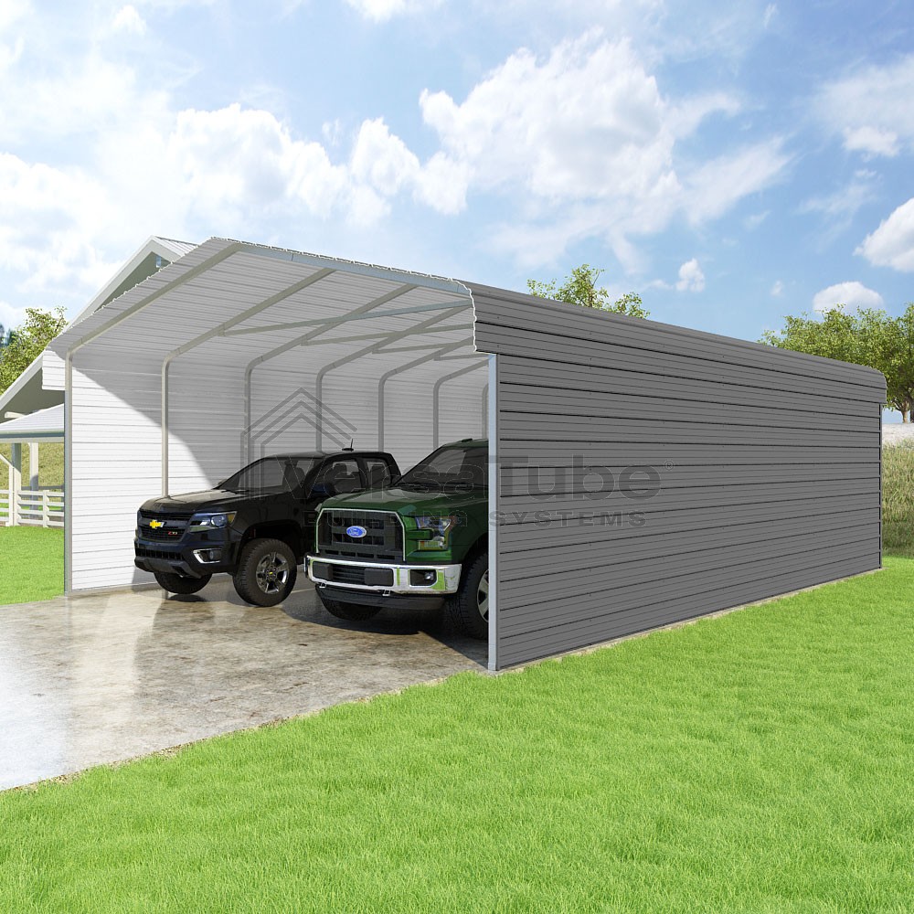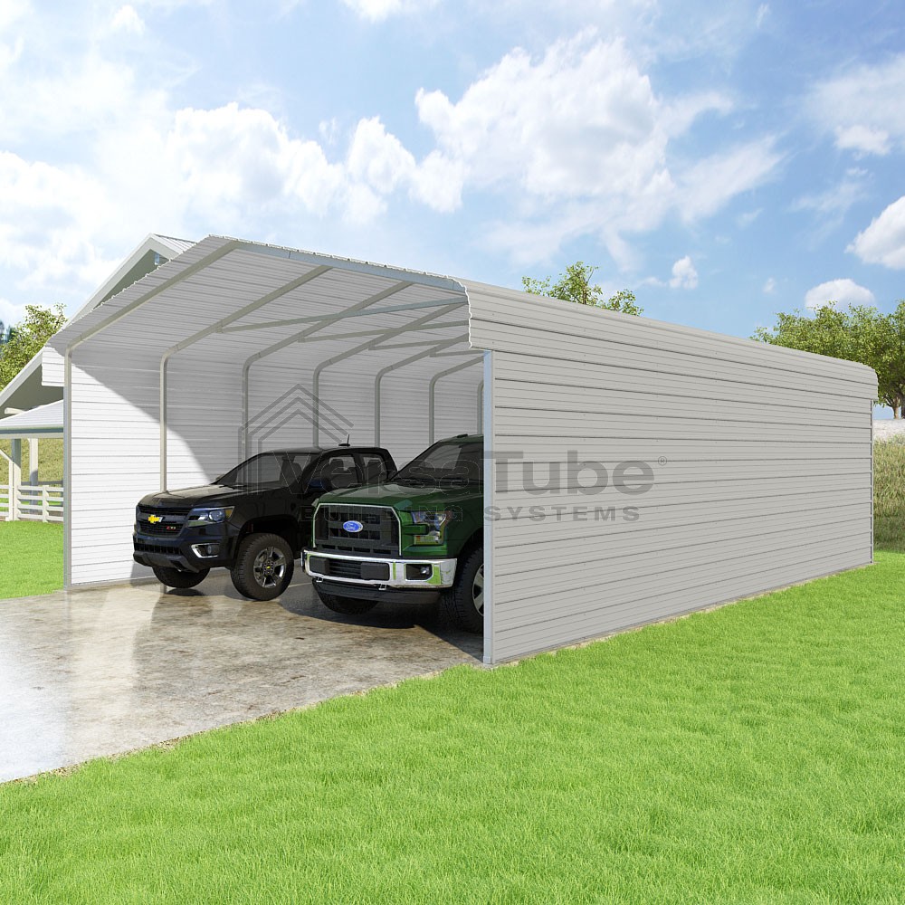 Classic Series DIY carport kit features horizontal application of sheet metal panels with the extra protection of rounded eaves.
