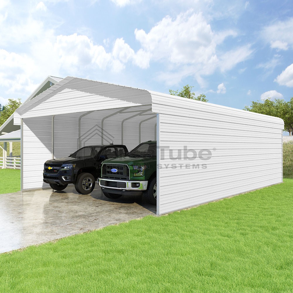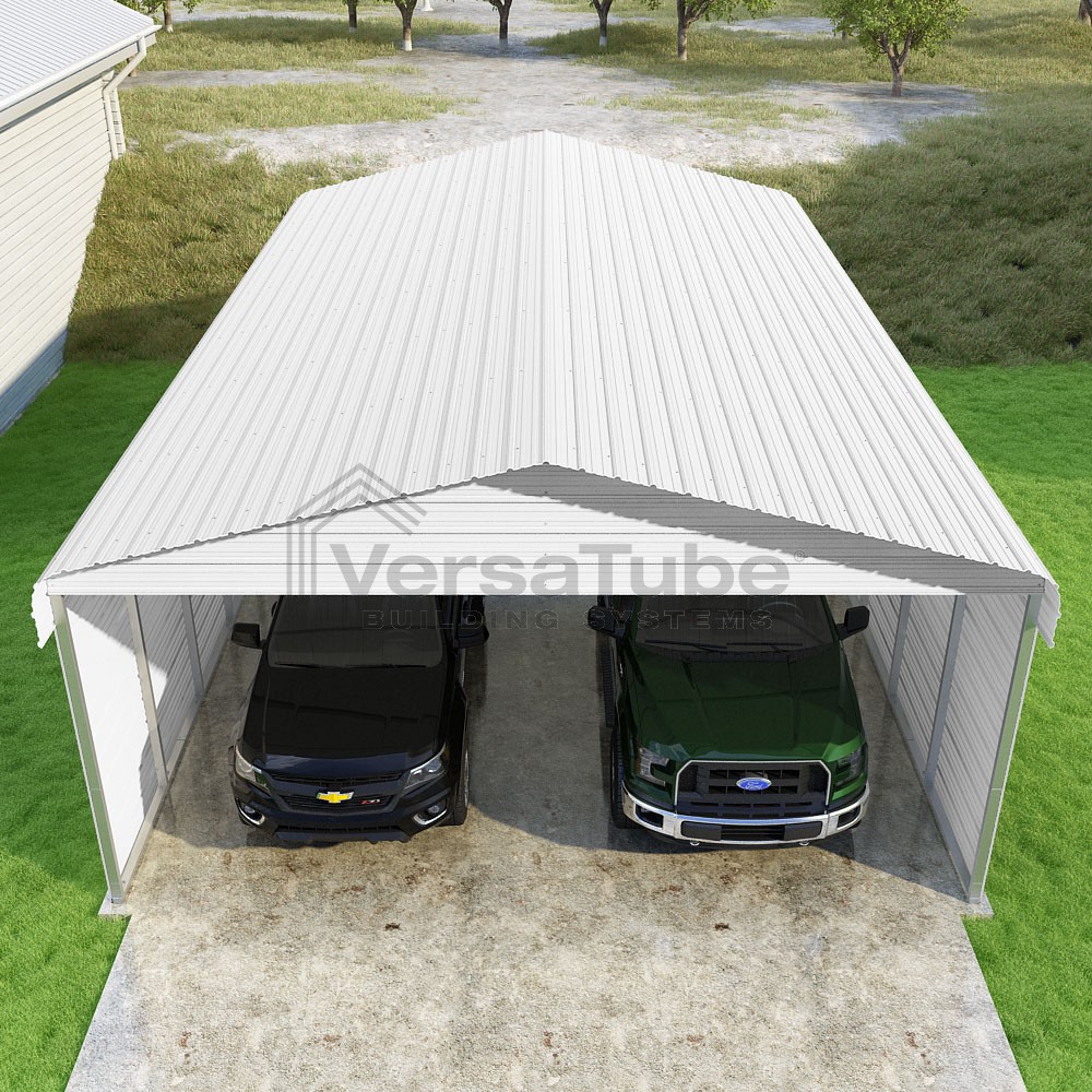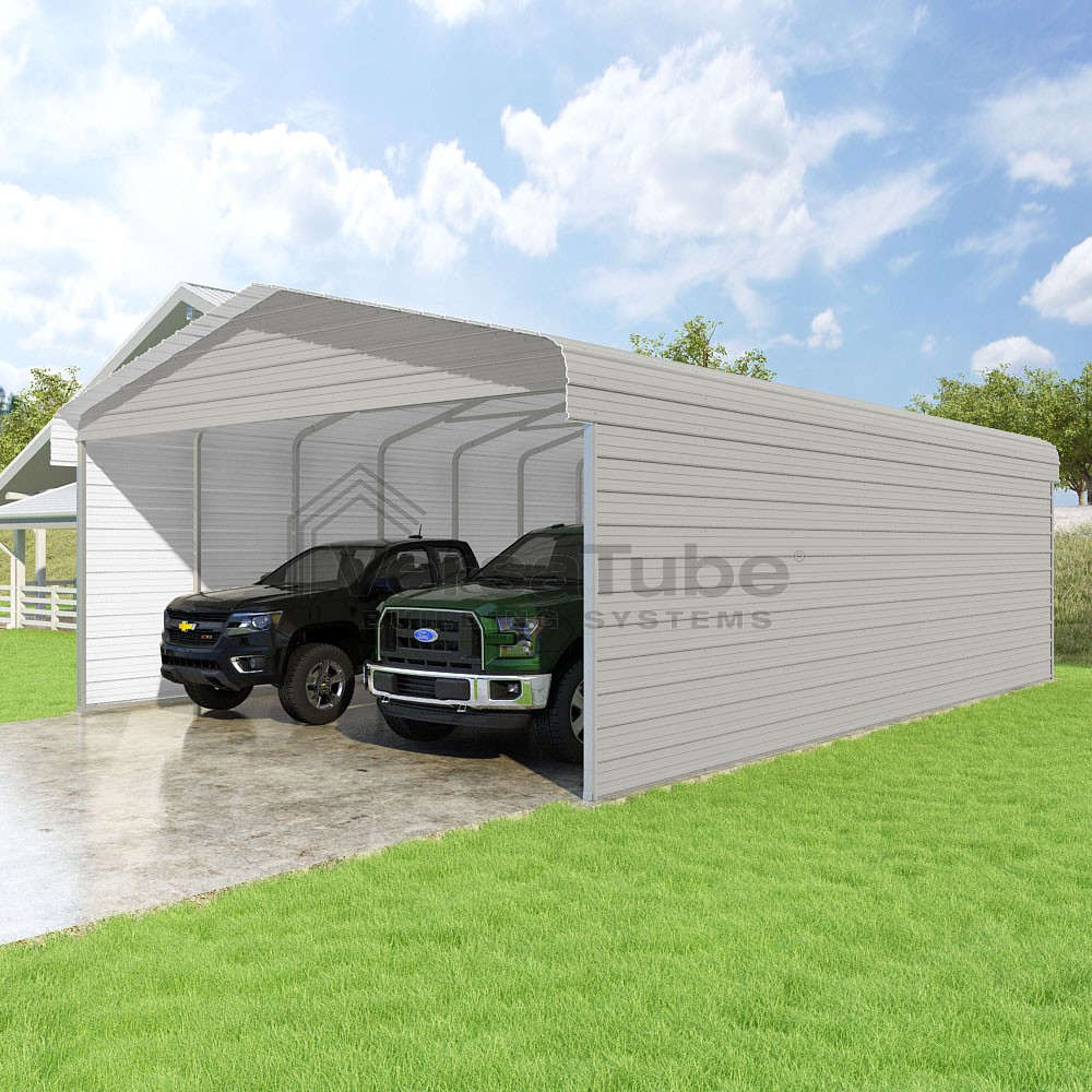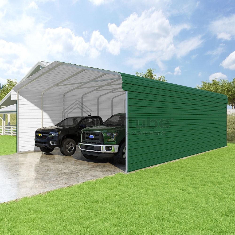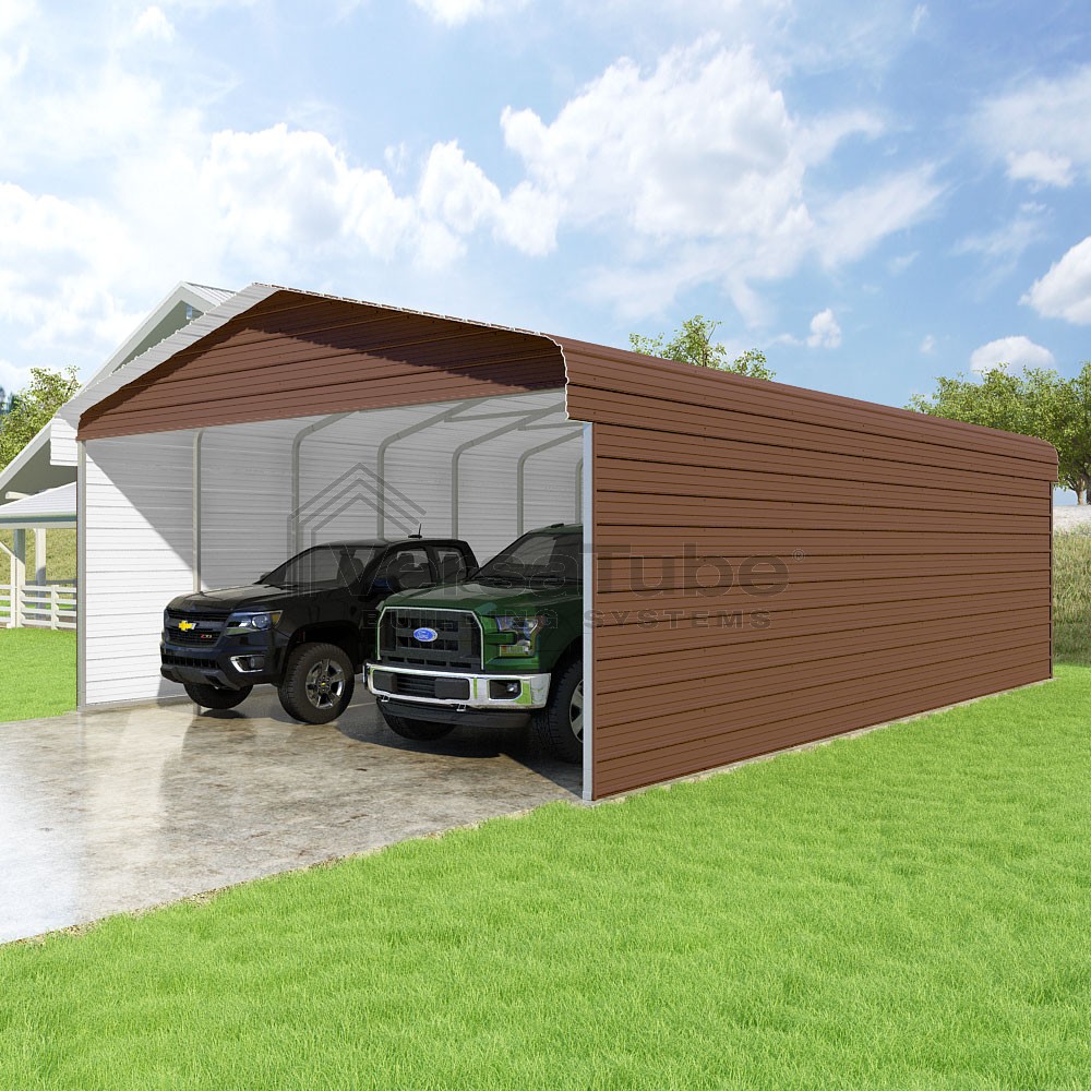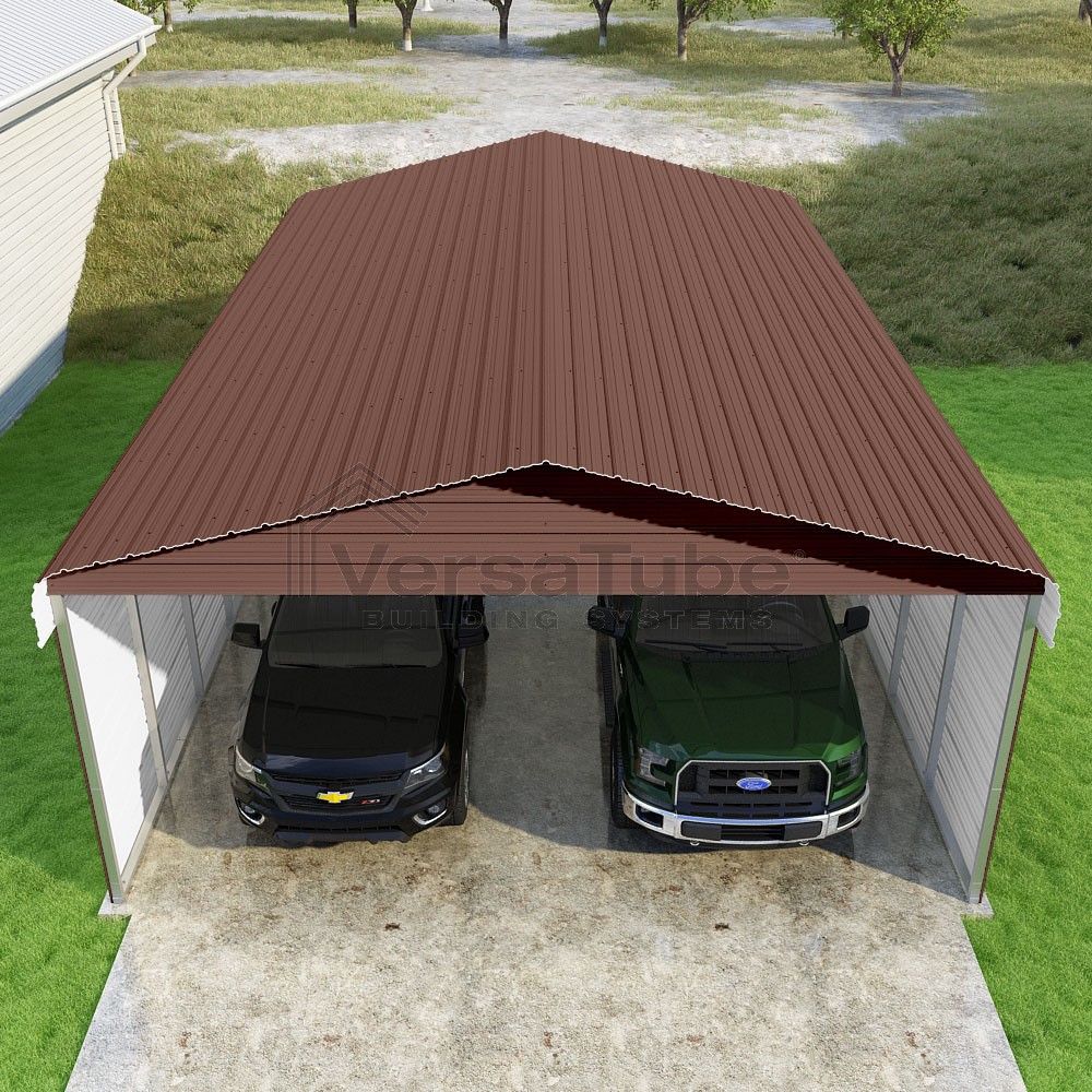 Classic Series DIY carport kit features horizontal application of sheet metal panels with the extra protection of rounded eaves.