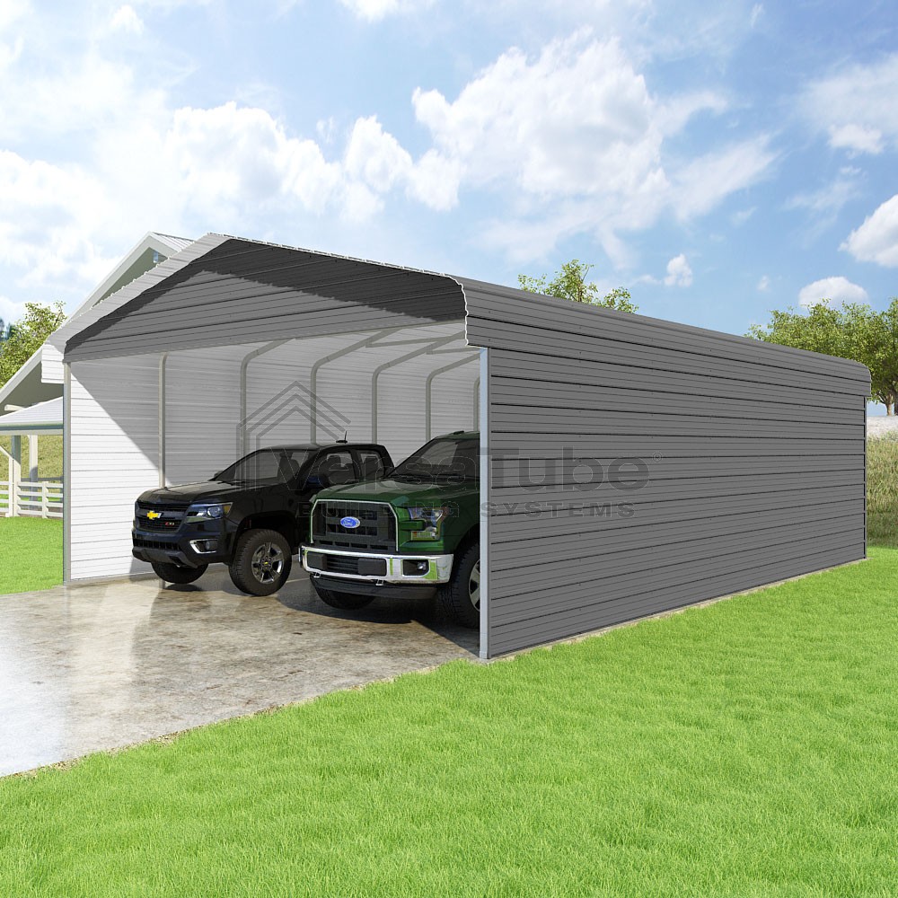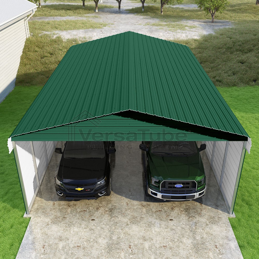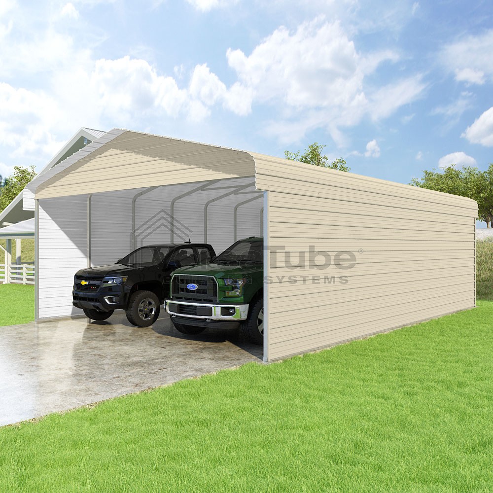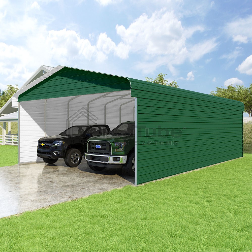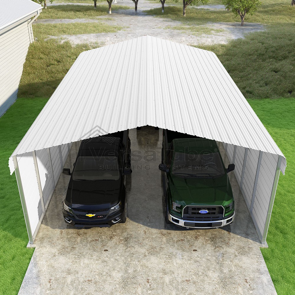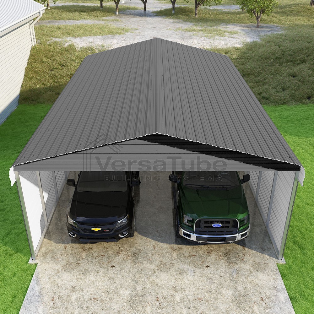 Classic Series DIY carport kit features horizontal application of sheet metal panels with the extra protection of rounded eaves.