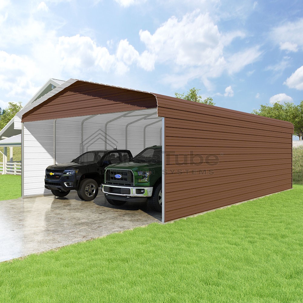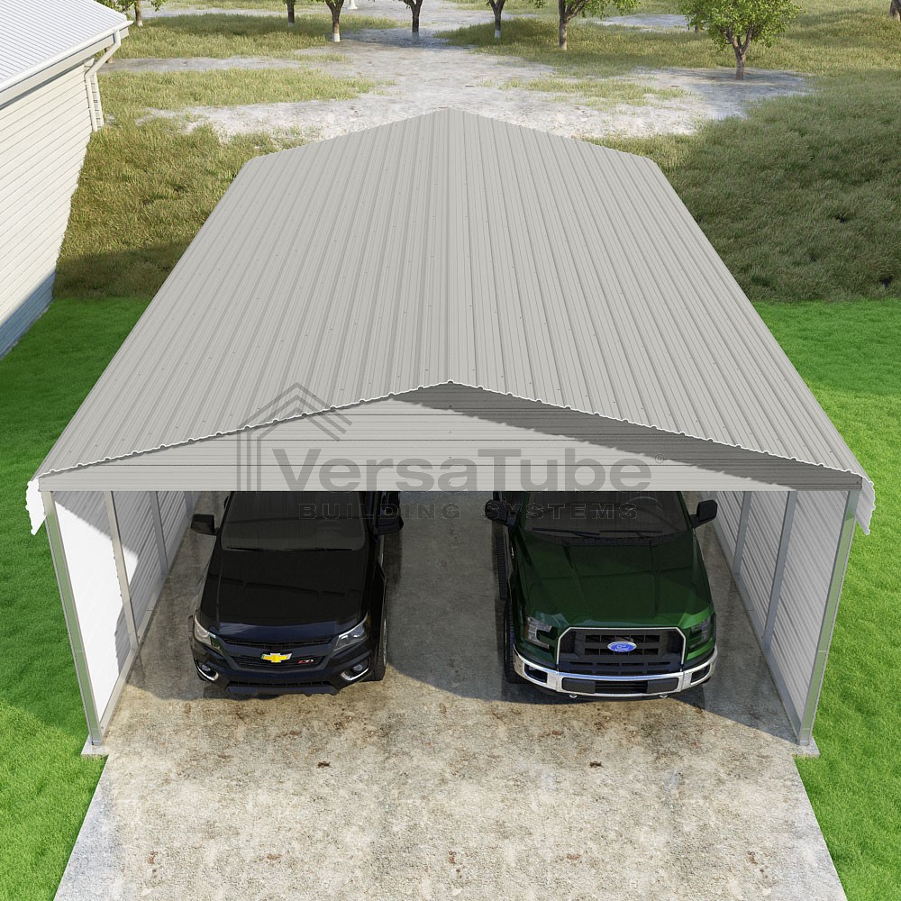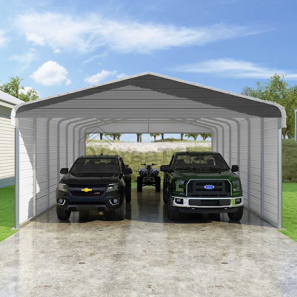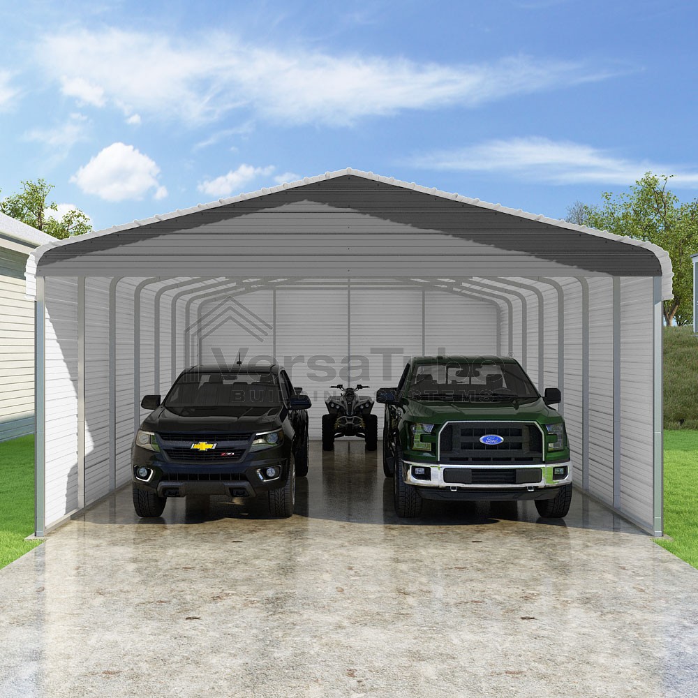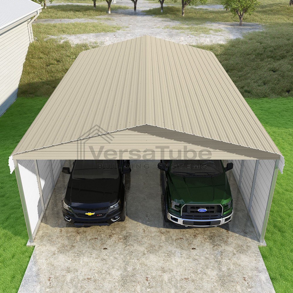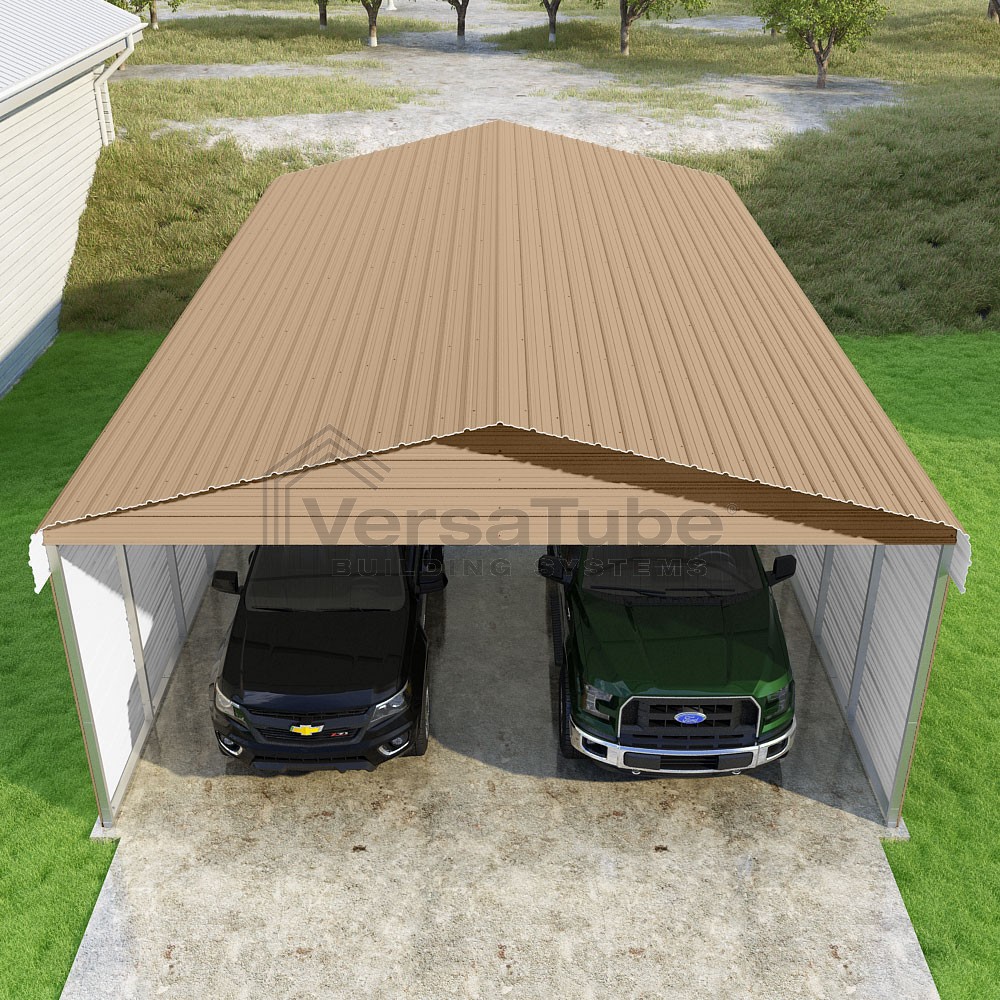 Classic Series DIY carport kit features horizontal application of sheet metal panels with the extra protection of rounded eaves.