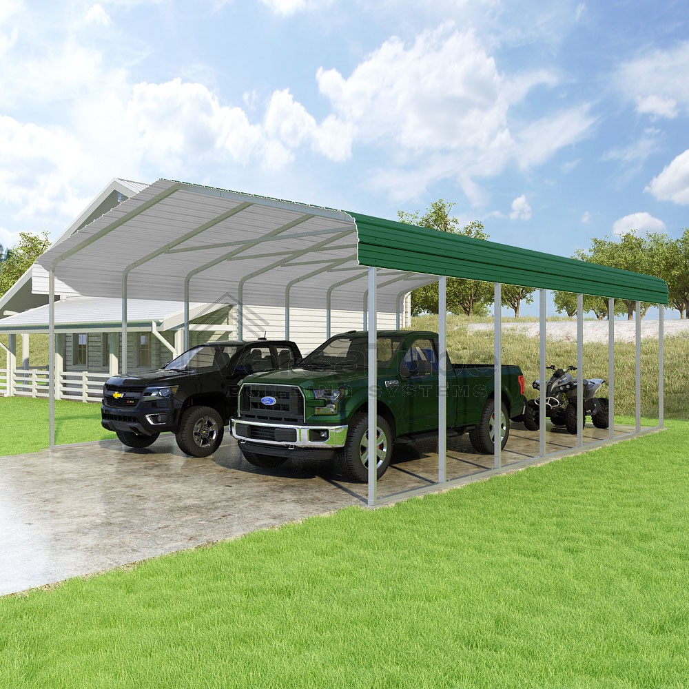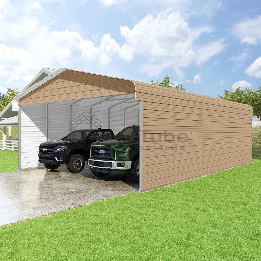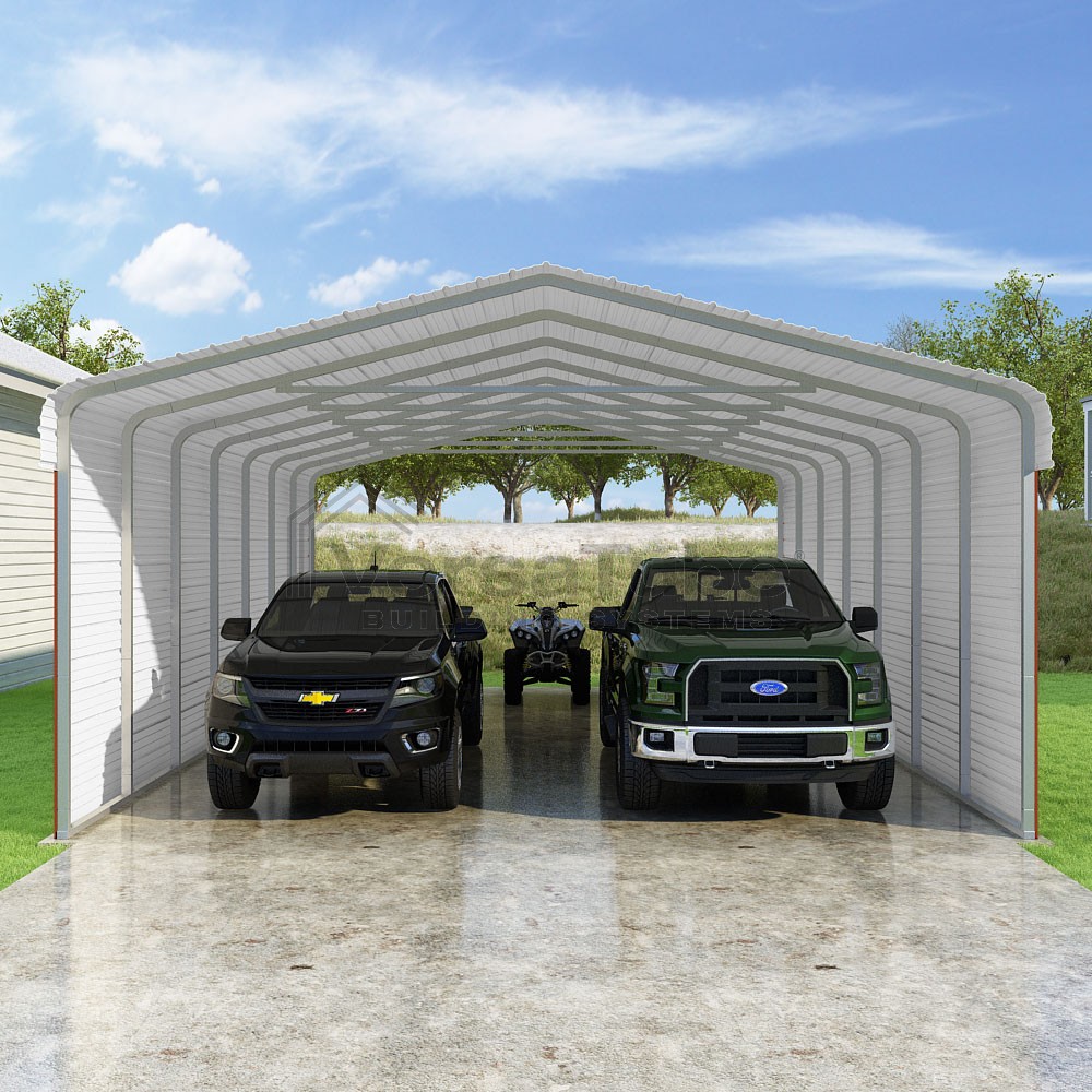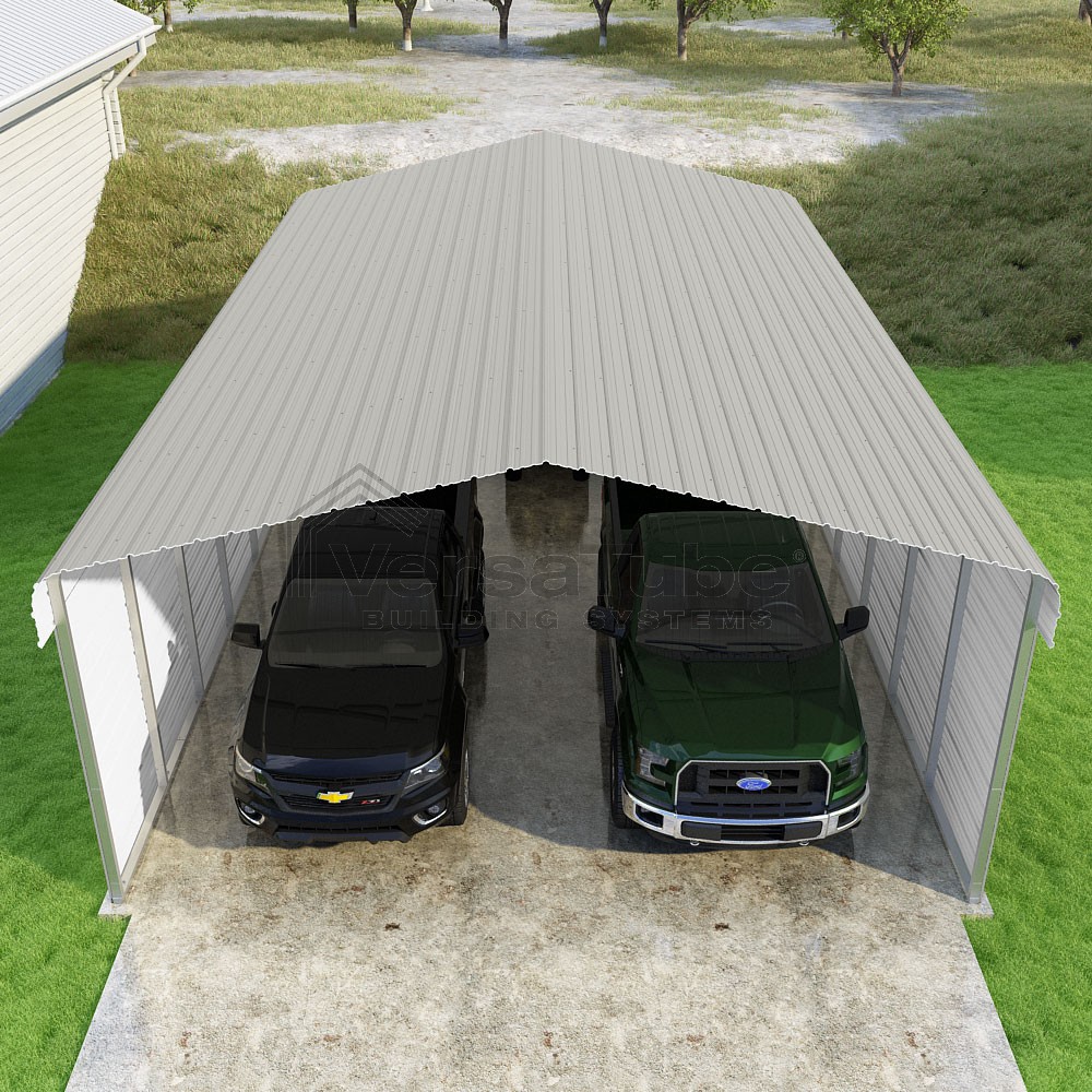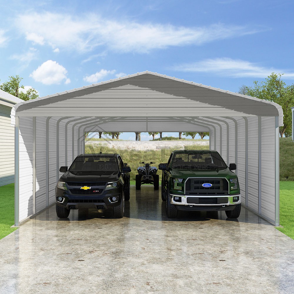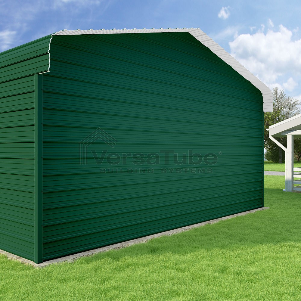 Classic Series DIY carport kit features horizontal application of sheet metal panels with the extra protection of rounded eaves.