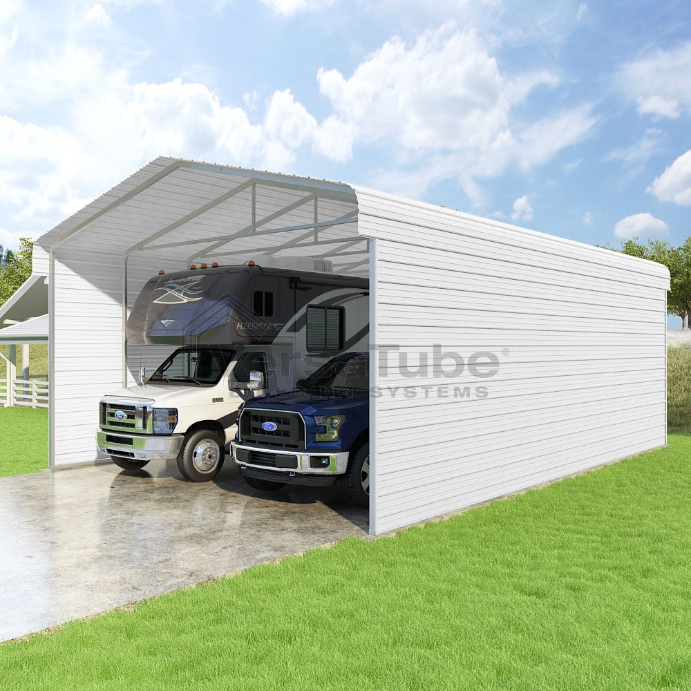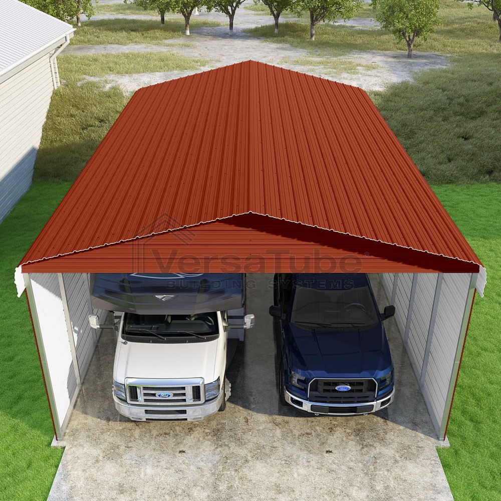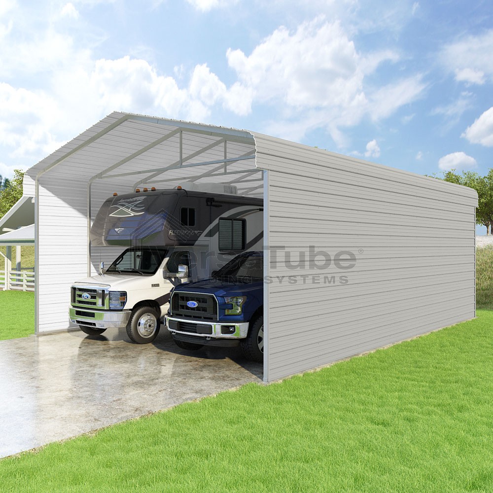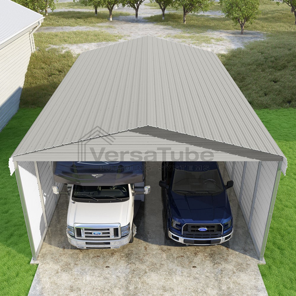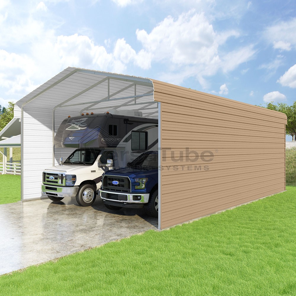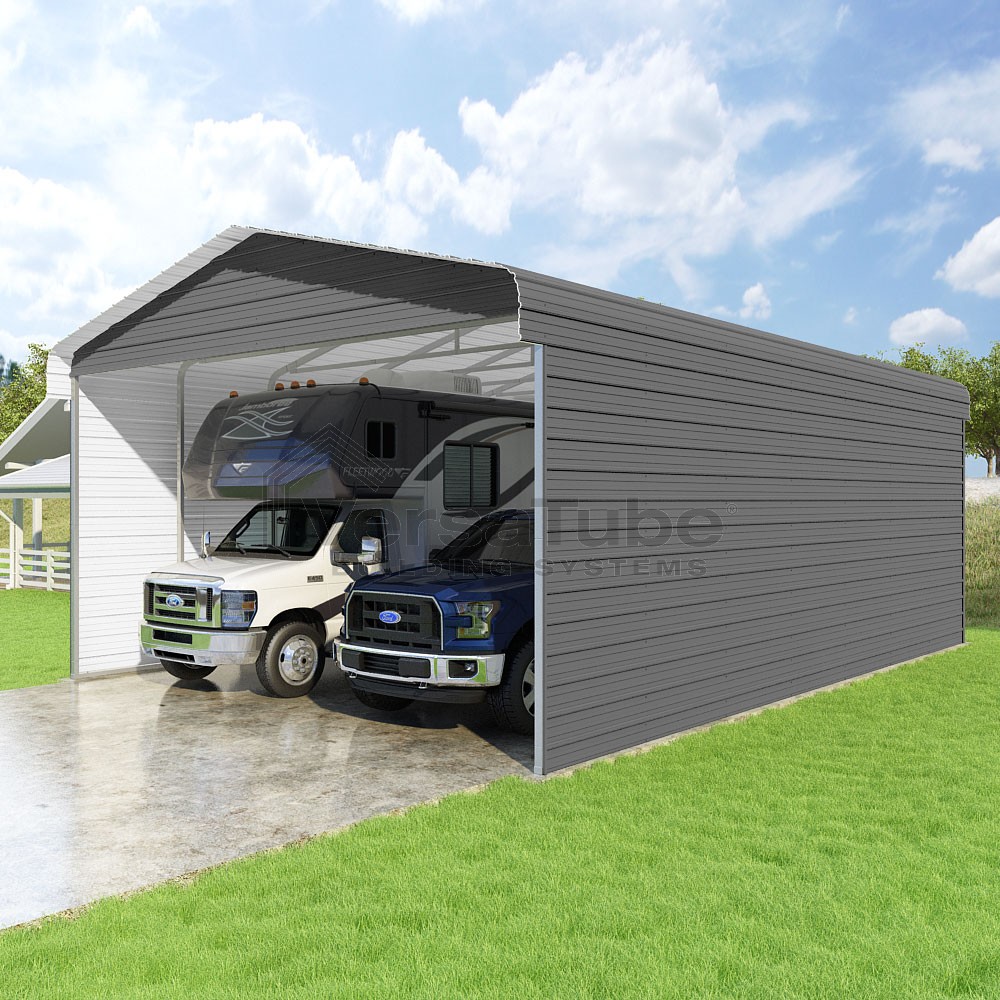 Classic Series DIY carport kit features horizontal application of sheet metal panels with the extra protection of rounded eaves.