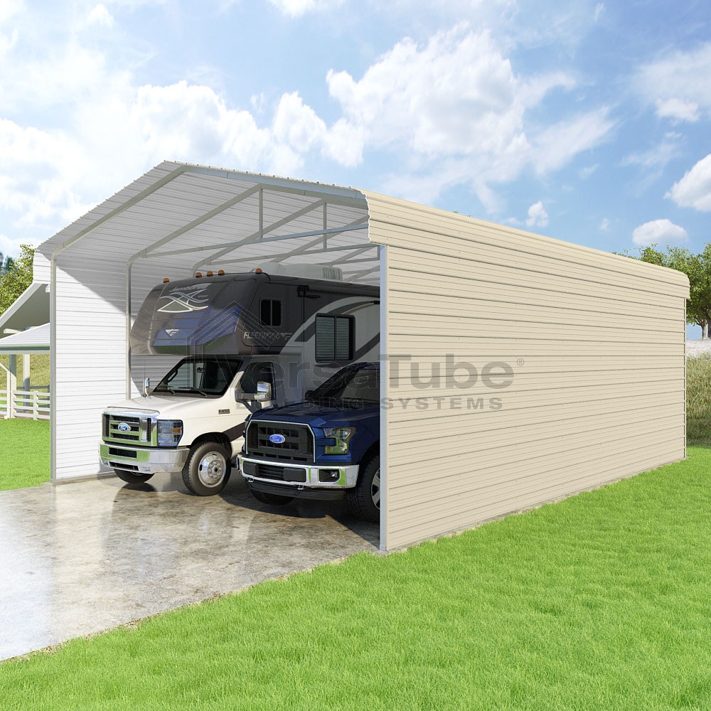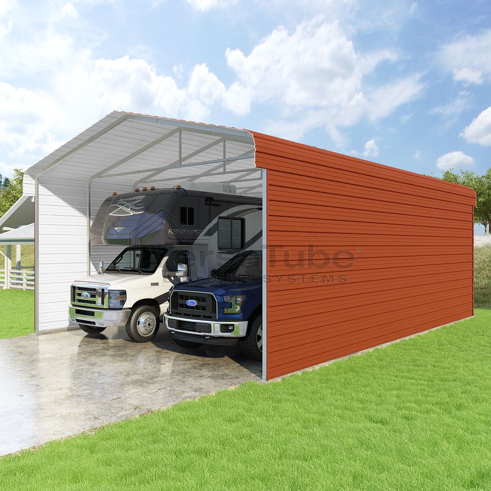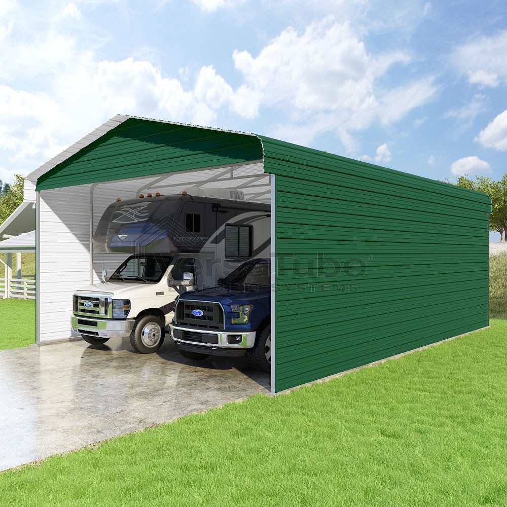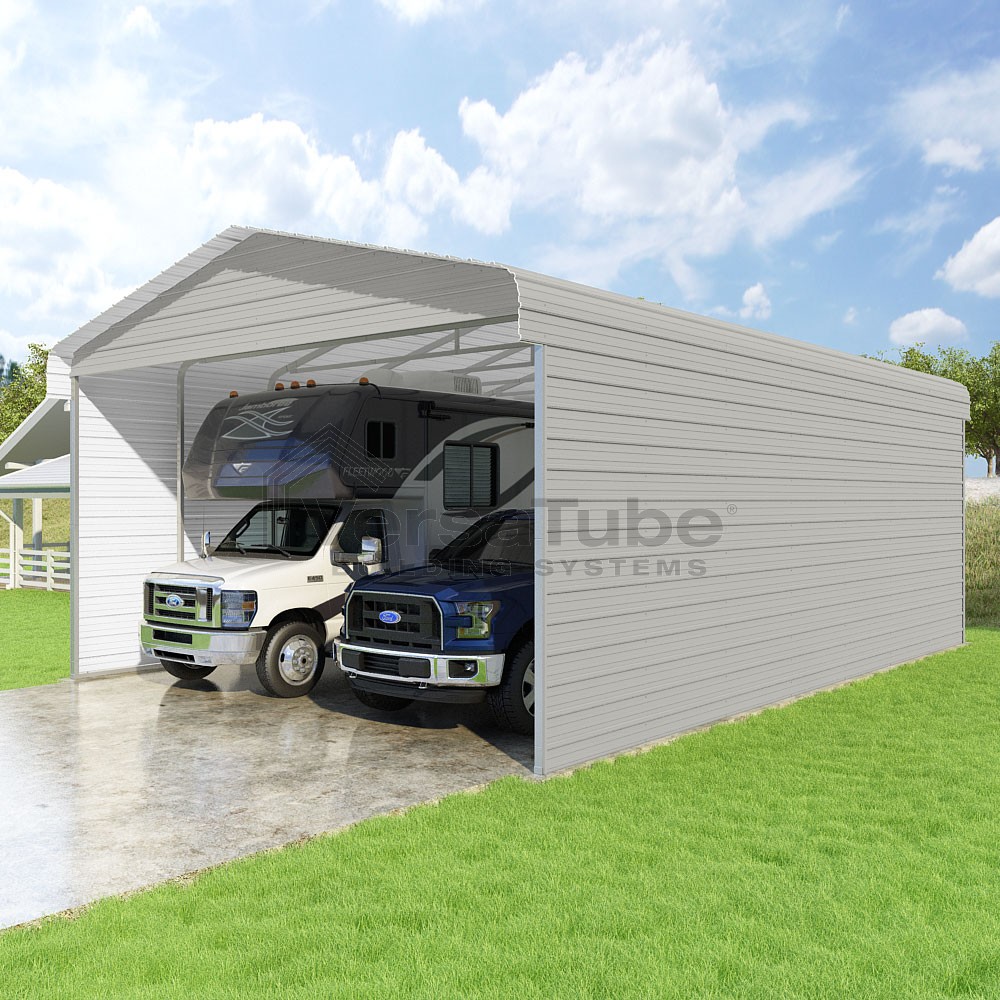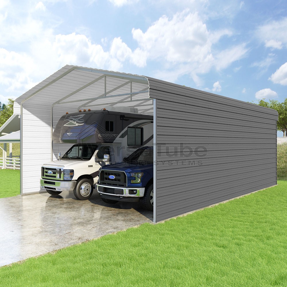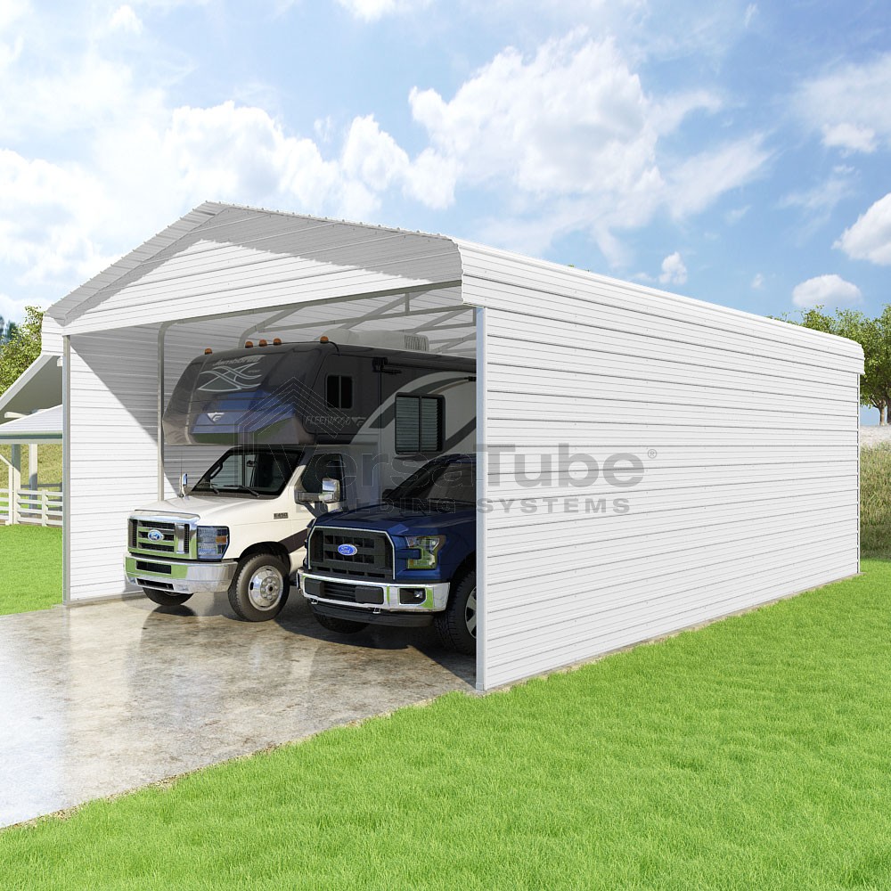 Classic Series DIY carport kit features horizontal application of sheet metal panels with the extra protection of rounded eaves.