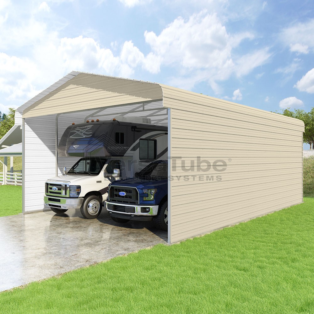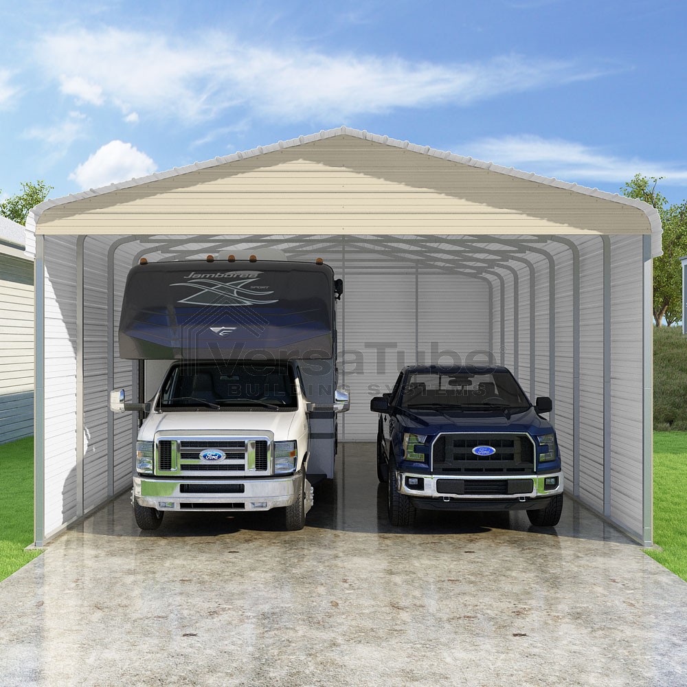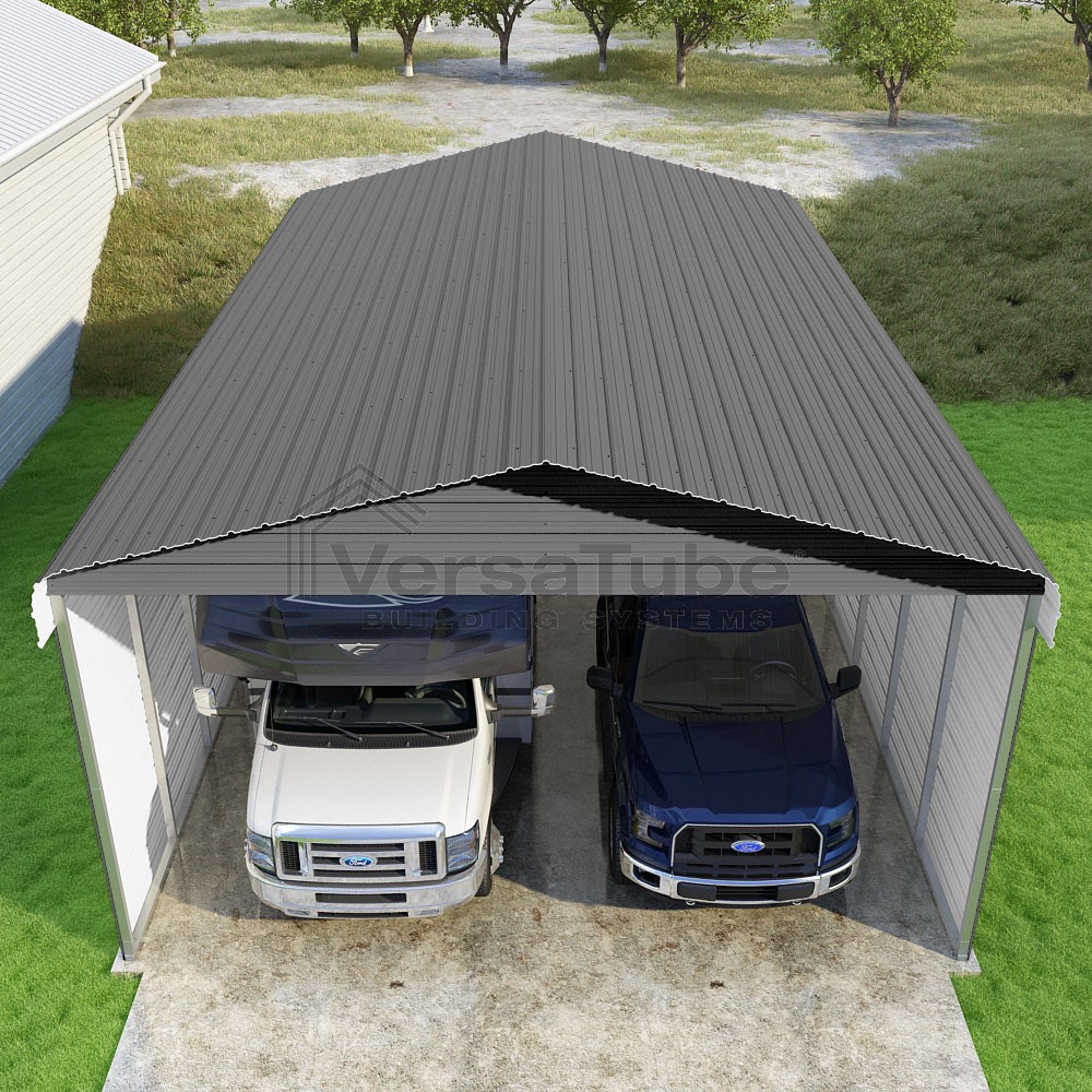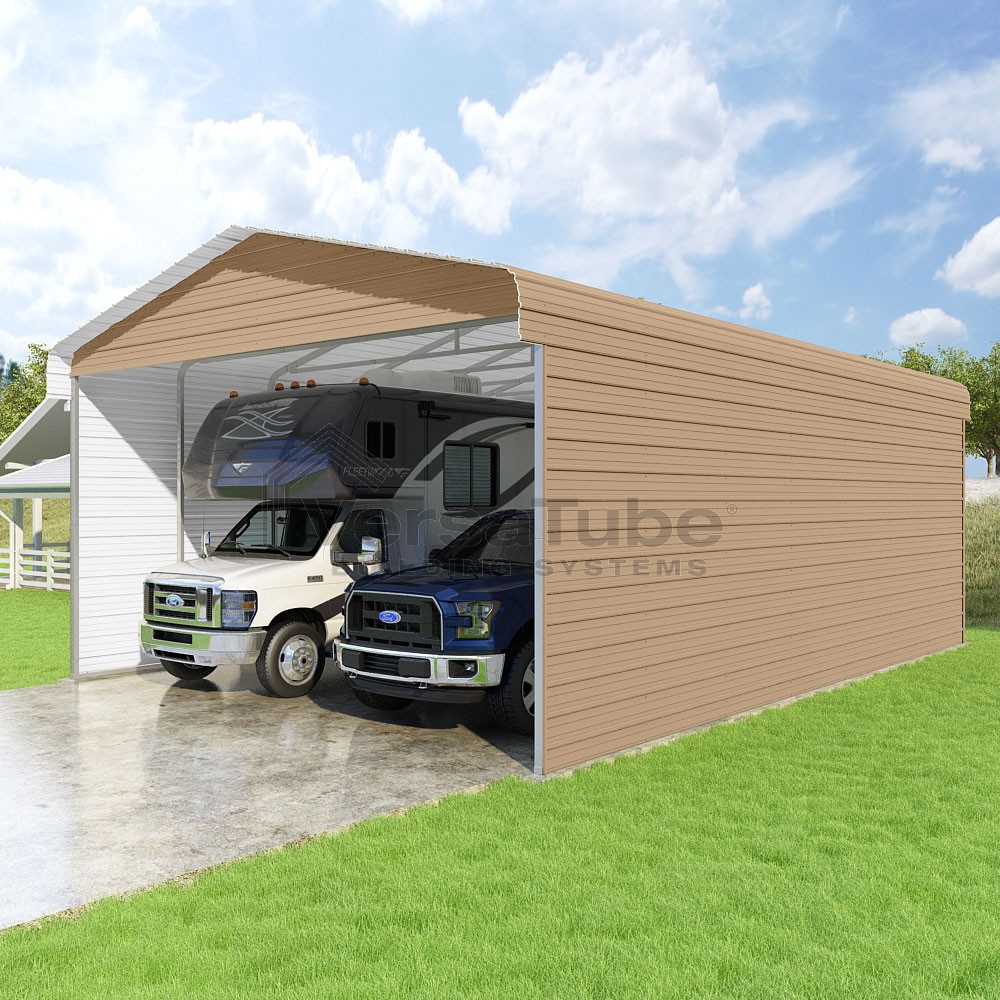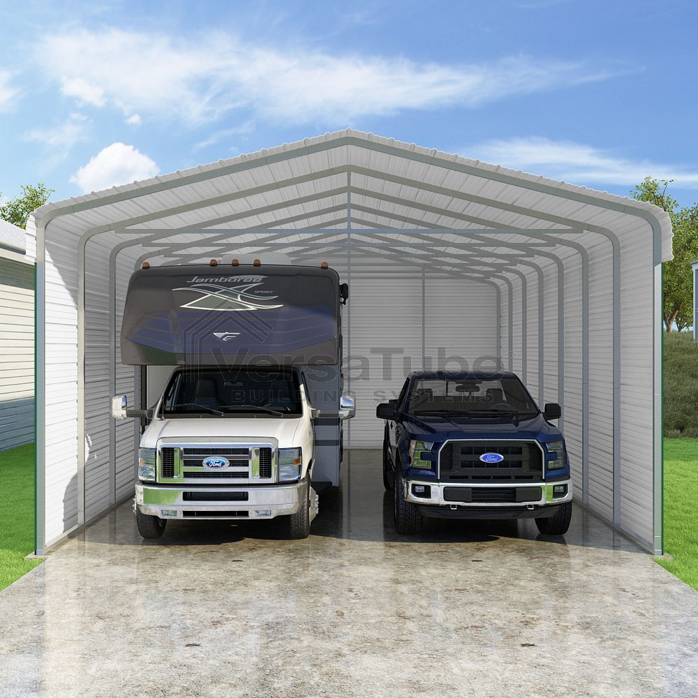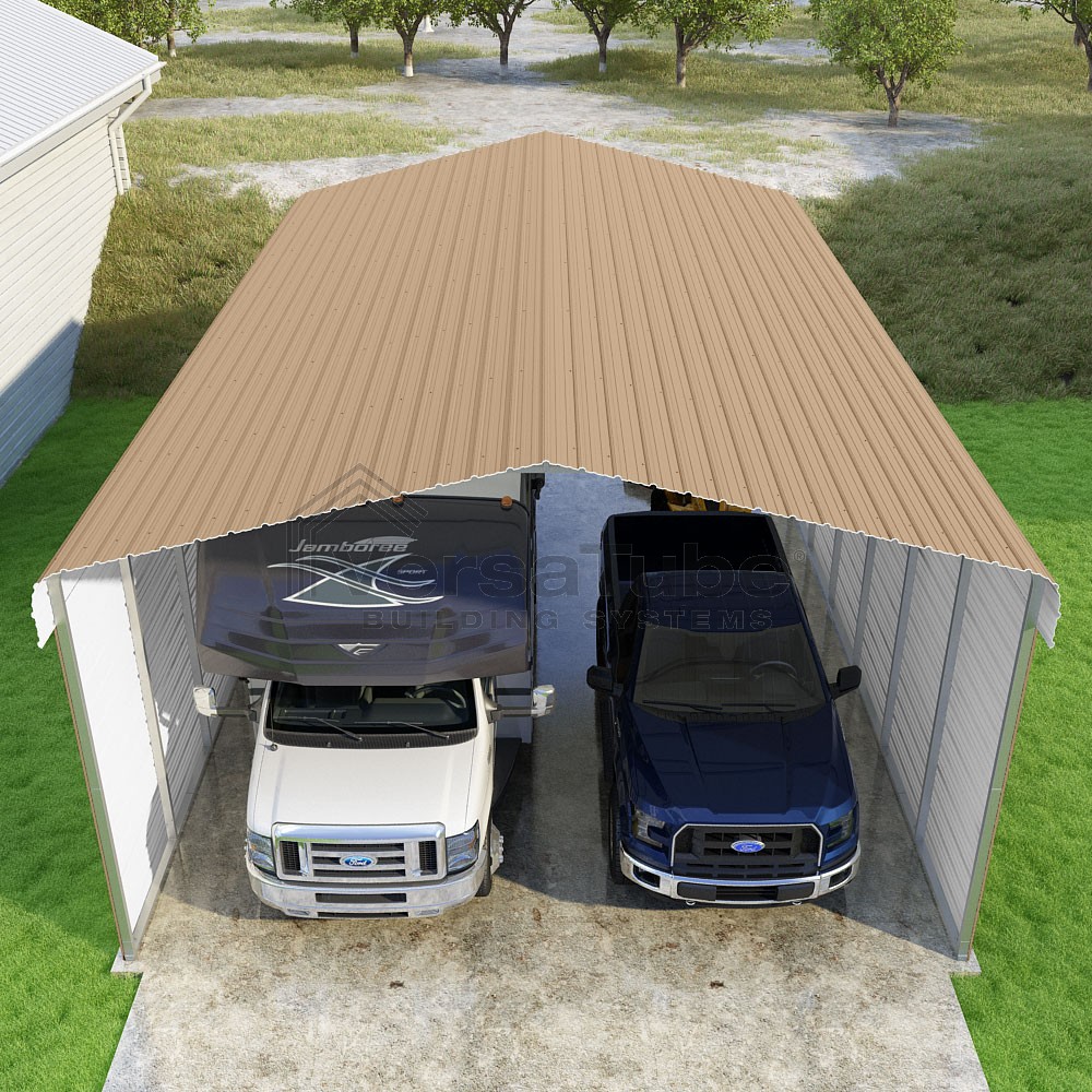 Classic Series DIY carport kit features horizontal application of sheet metal panels with the extra protection of rounded eaves.