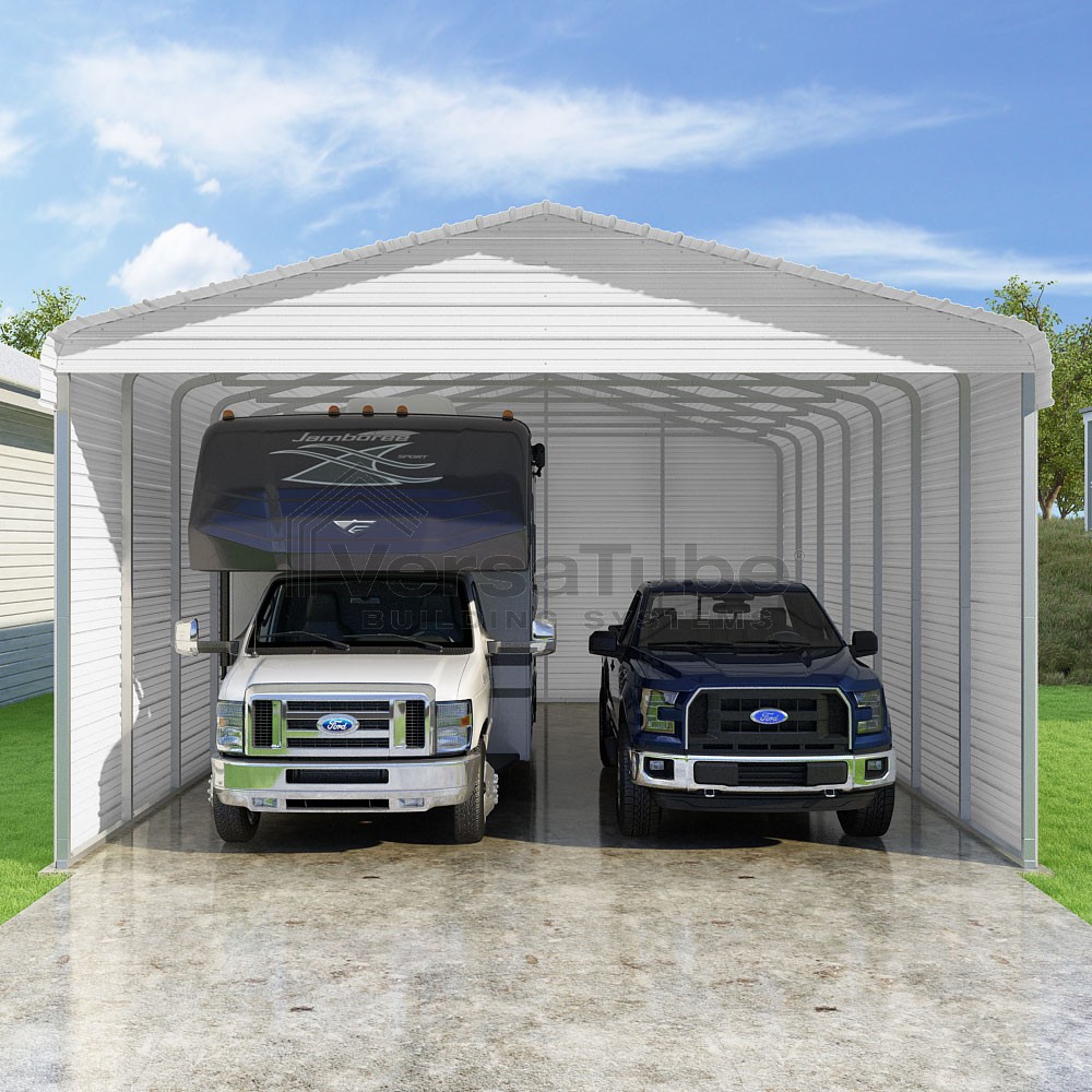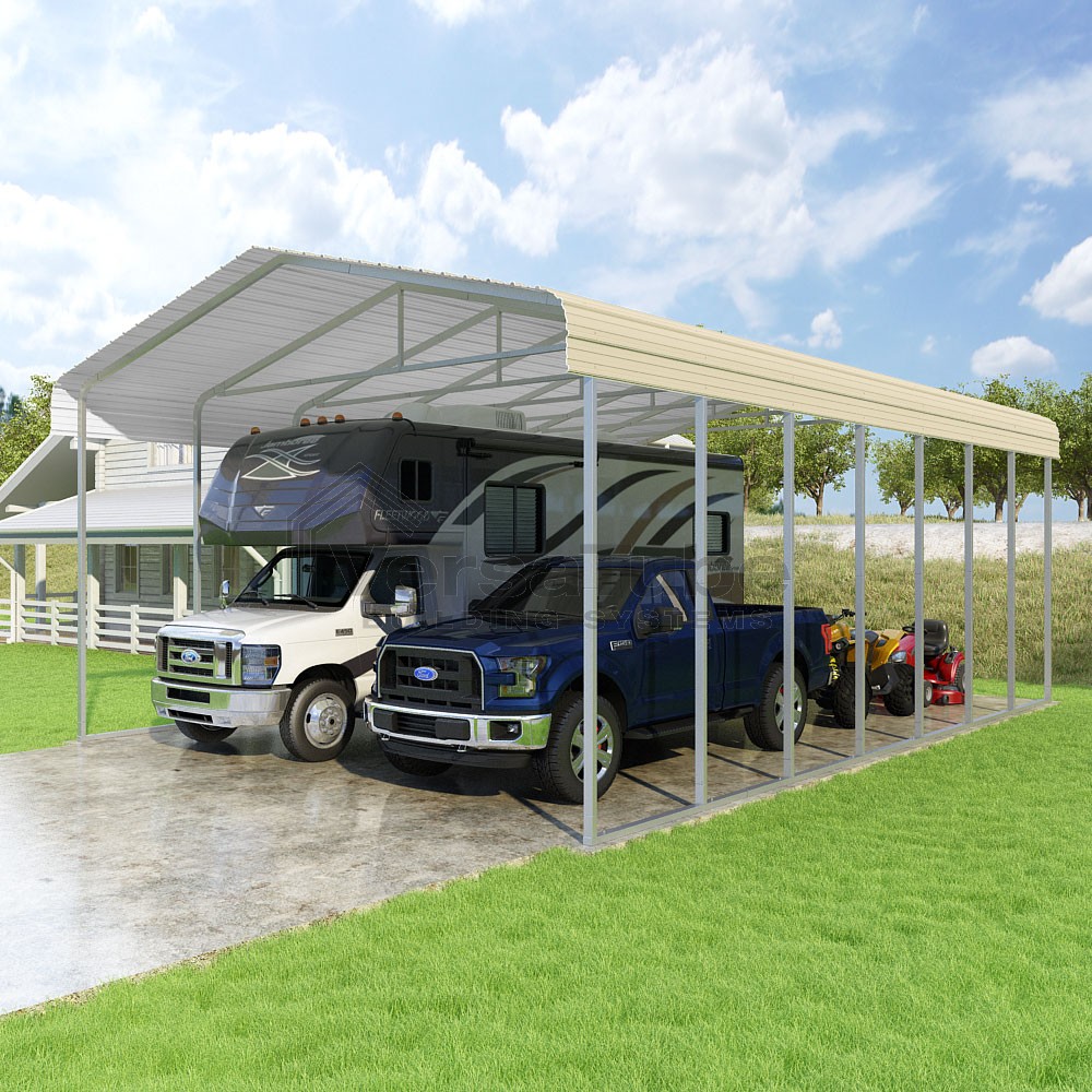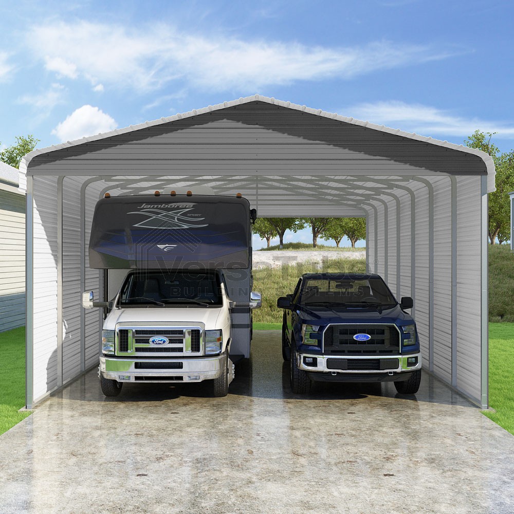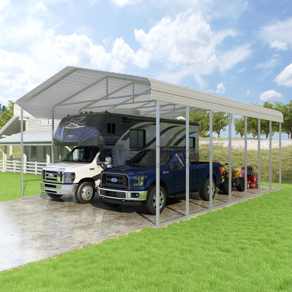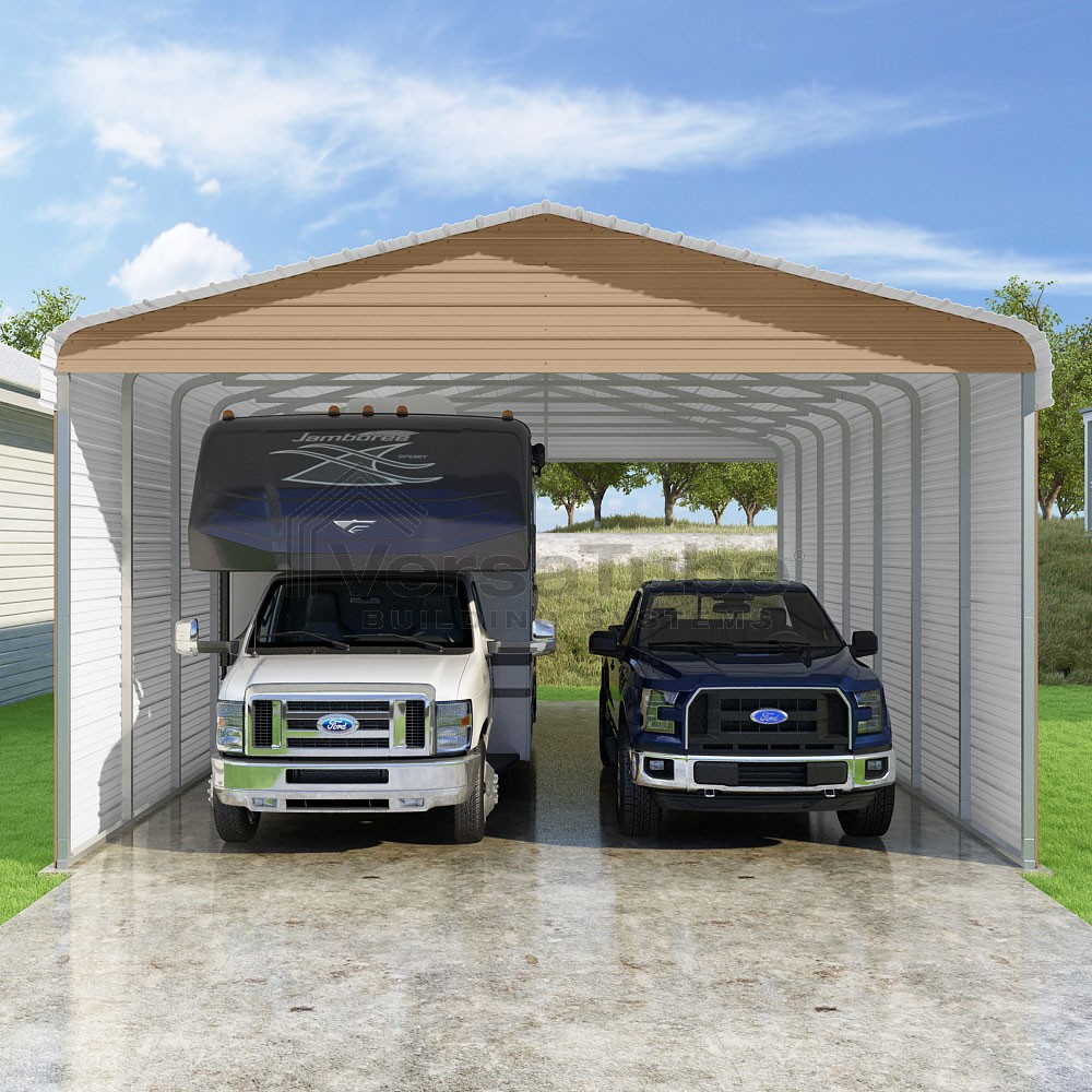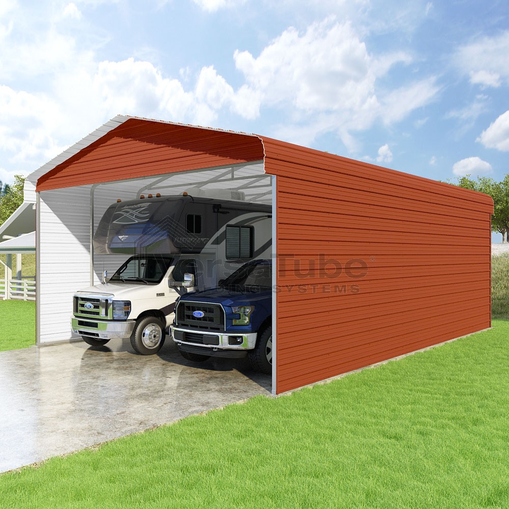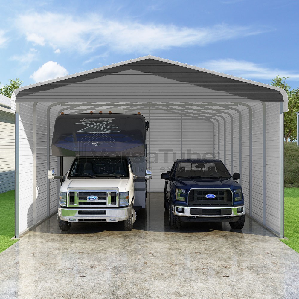 Classic Series DIY carport kit features horizontal application of sheet metal panels with the extra protection of rounded eaves.