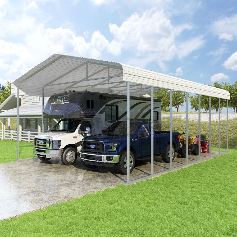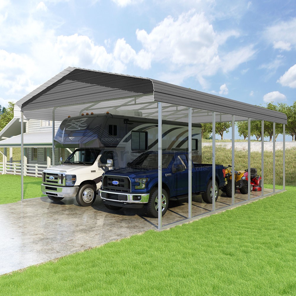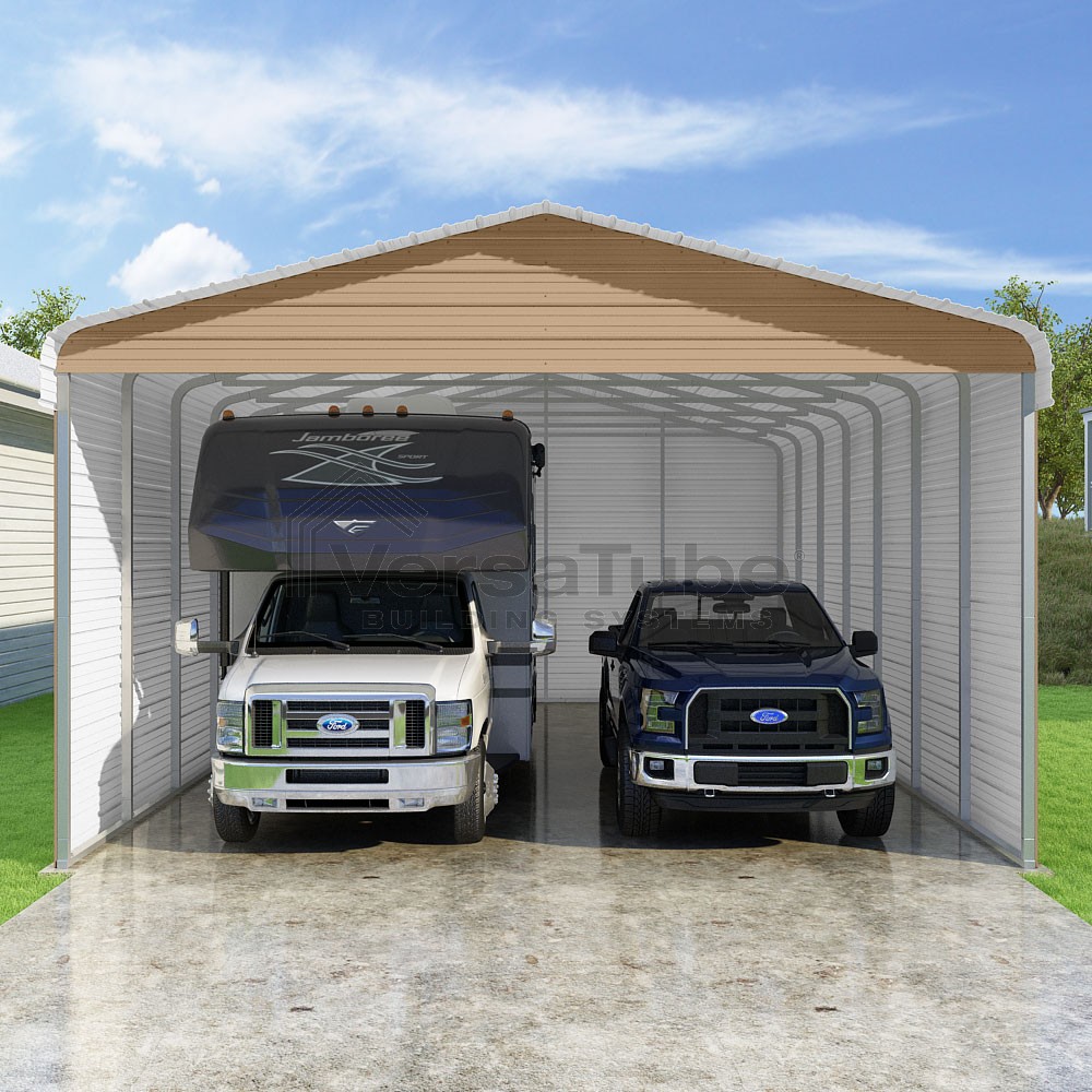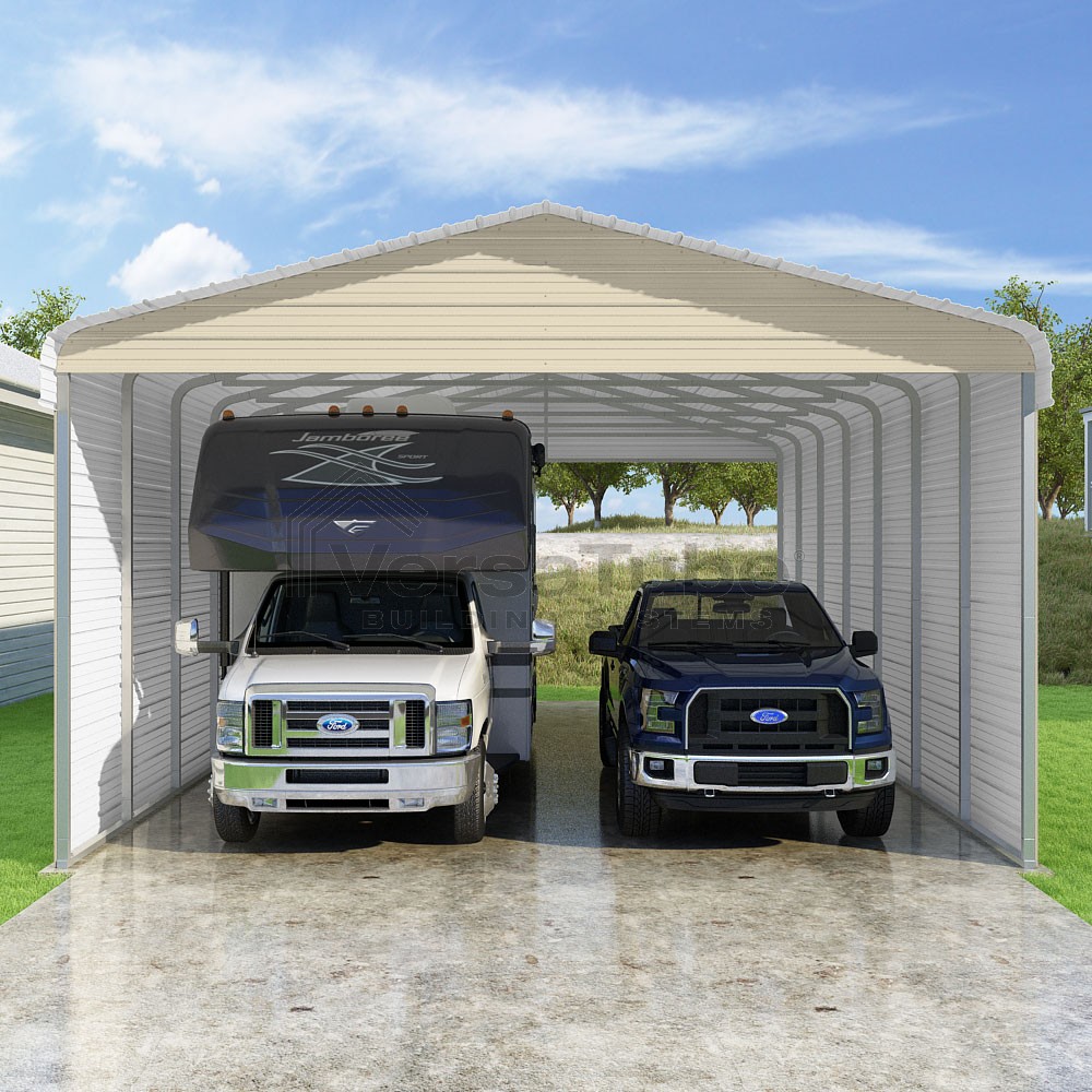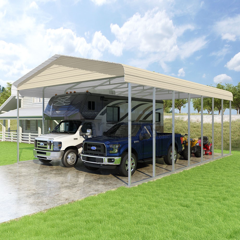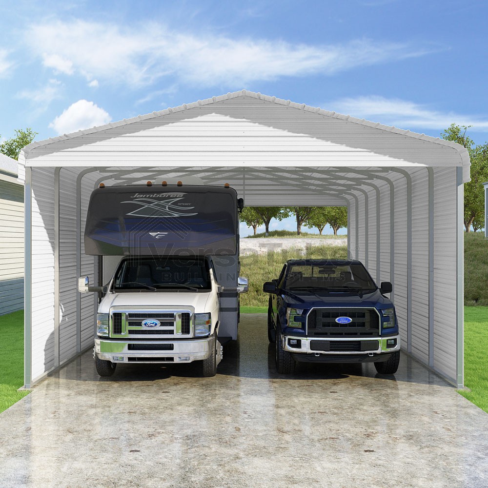 Classic Series DIY carport kit features horizontal application of sheet metal panels with the extra protection of rounded eaves.