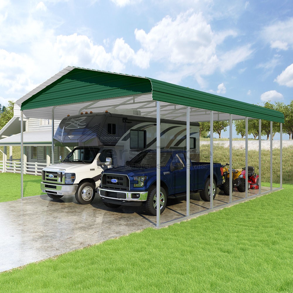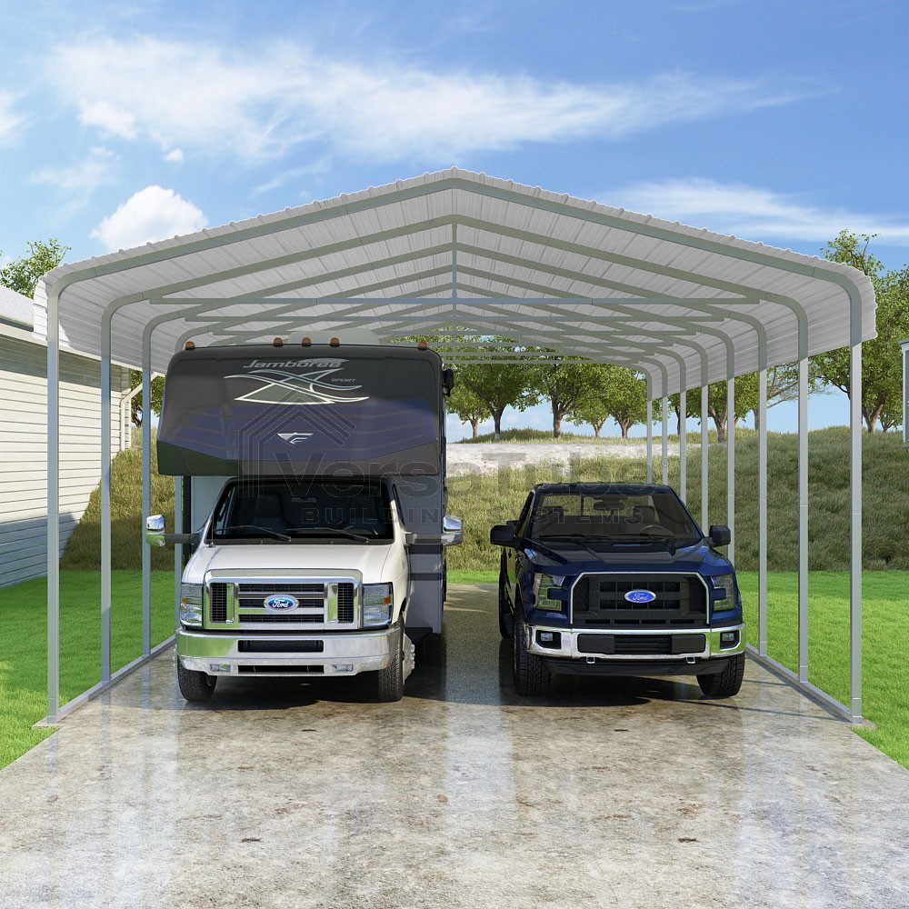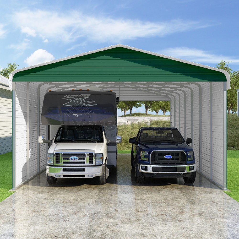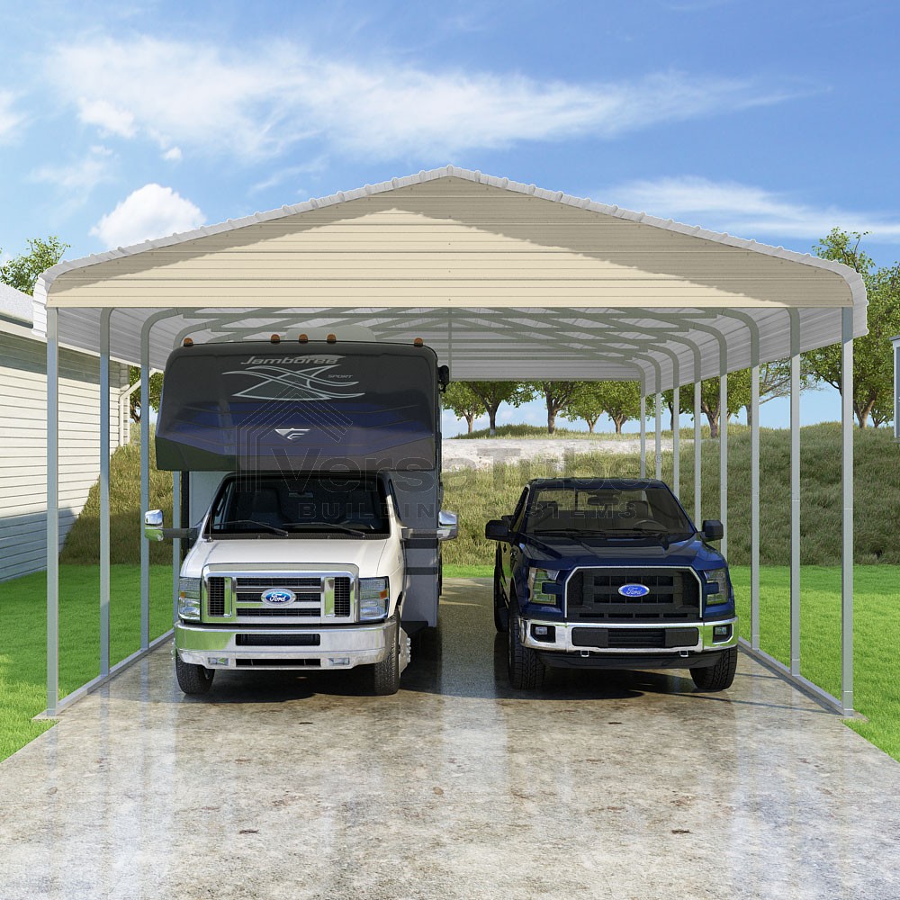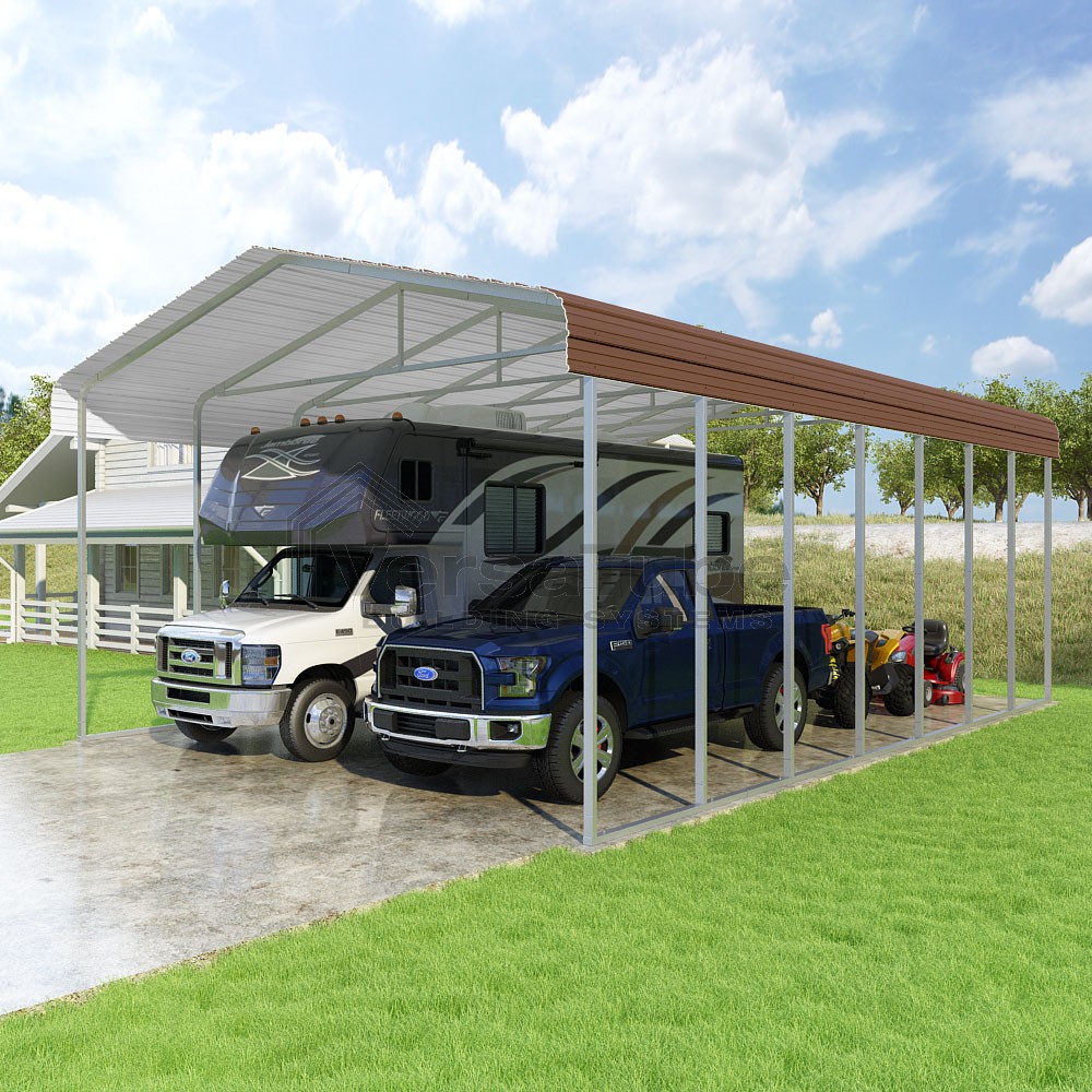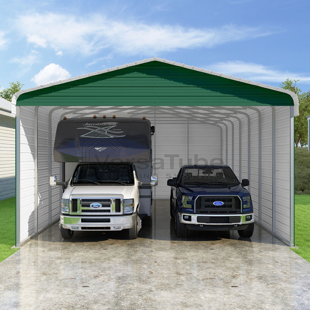 Classic Series DIY carport kit features horizontal application of sheet metal panels with the extra protection of rounded eaves.
