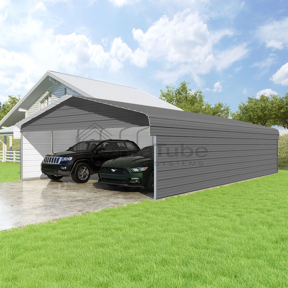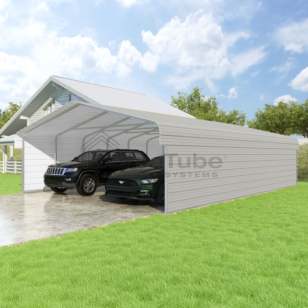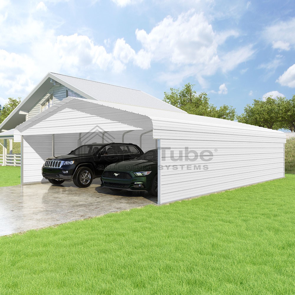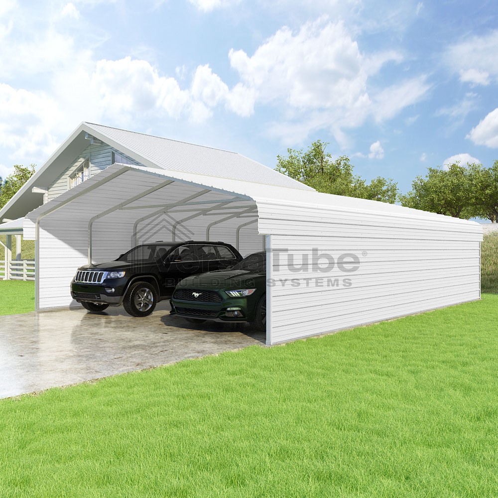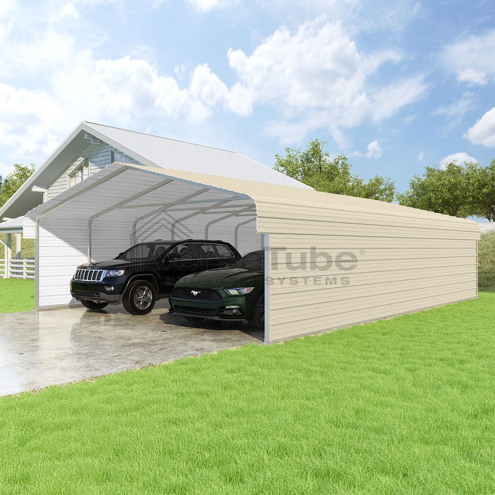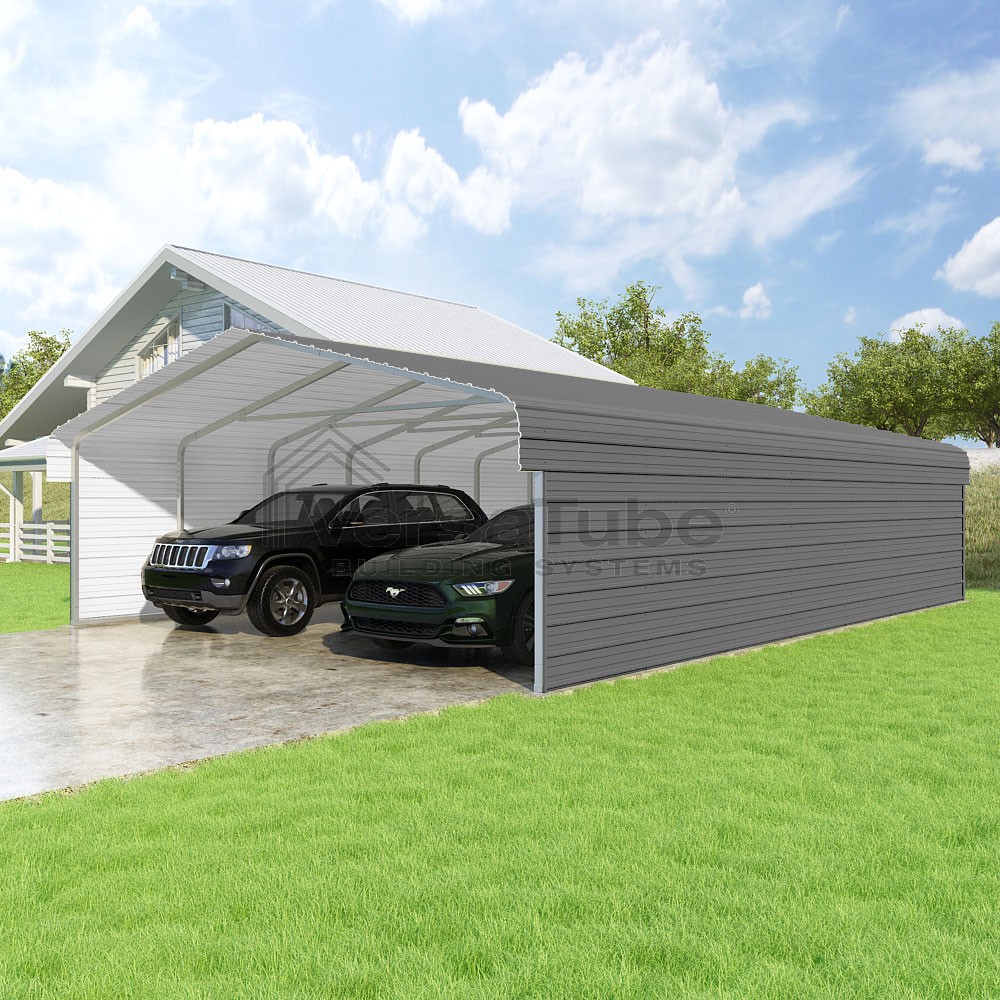 Classic Series DIY carport kit features horizontal application of sheet metal panels with the extra protection of rounded eaves.
