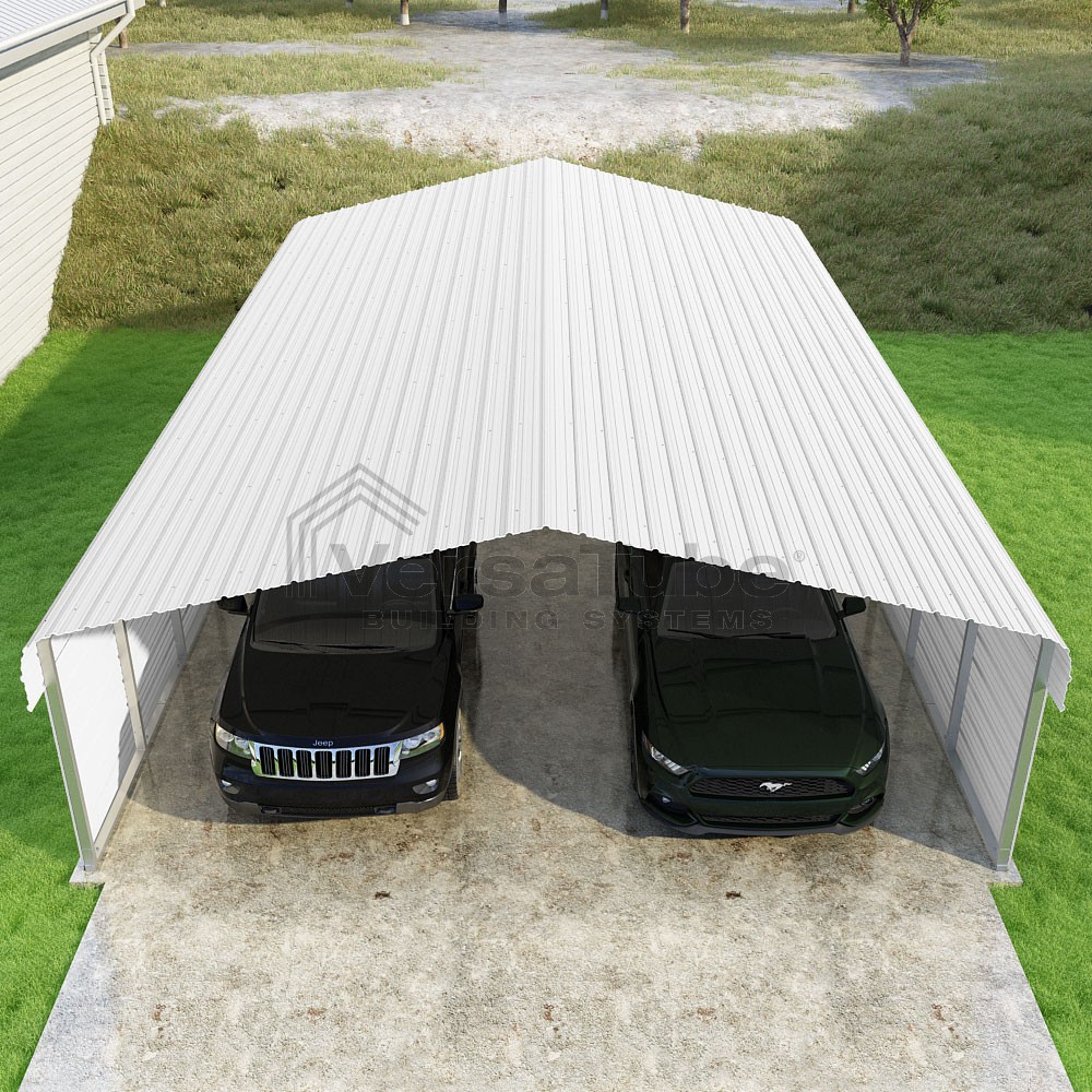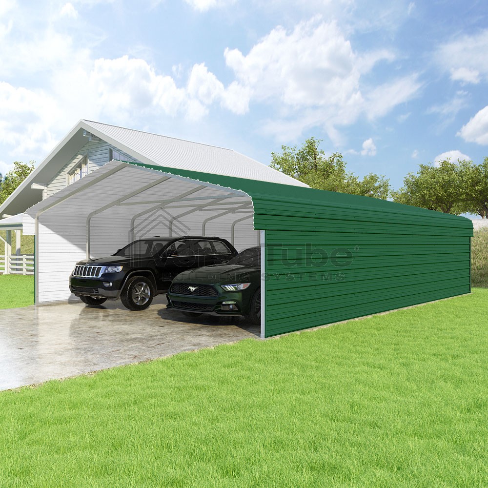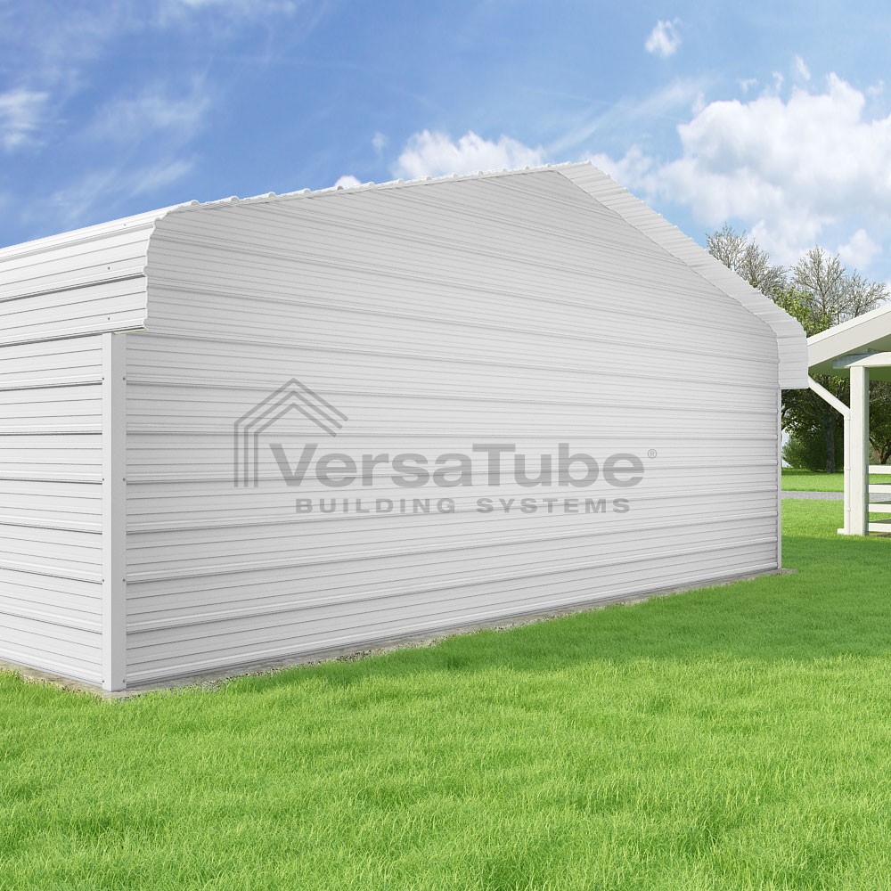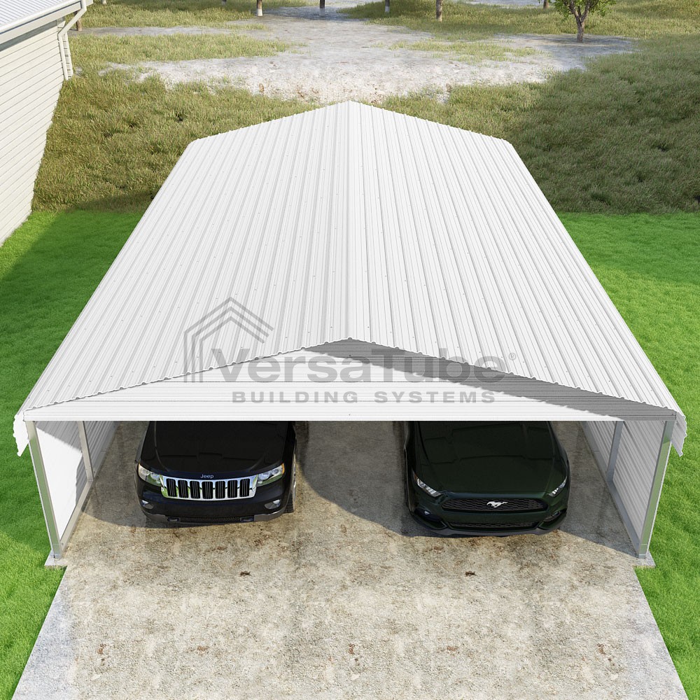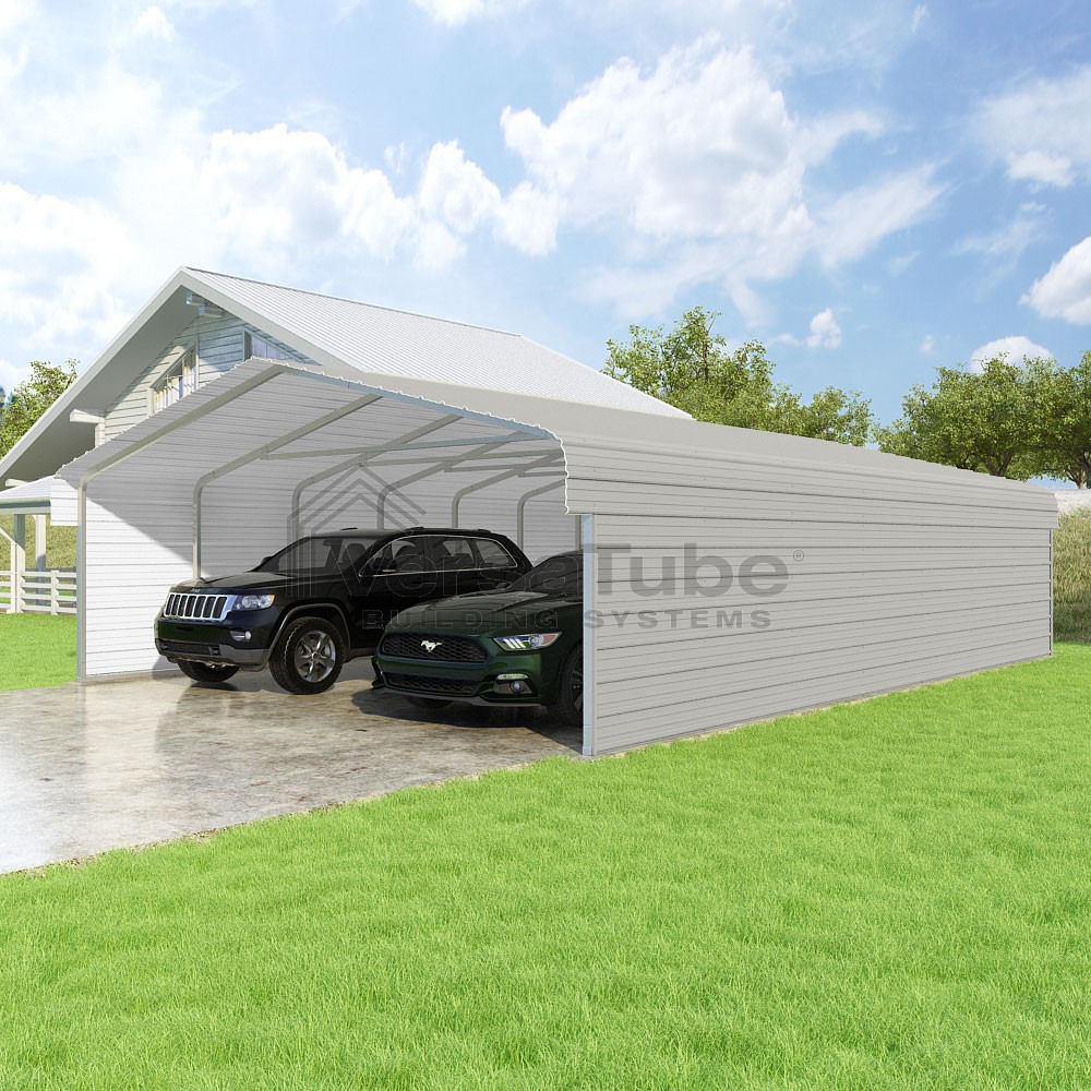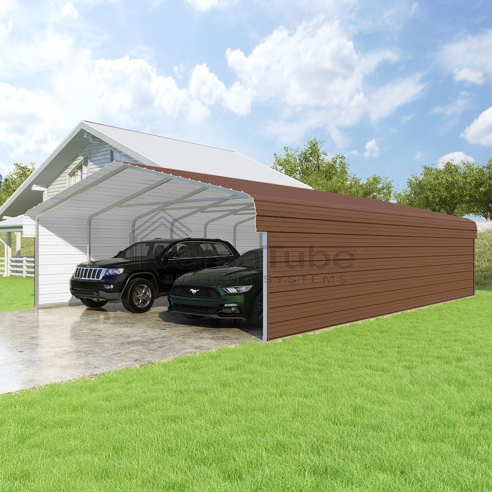 Classic Series DIY carport kit features horizontal application of sheet metal panels with the extra protection of rounded eaves.