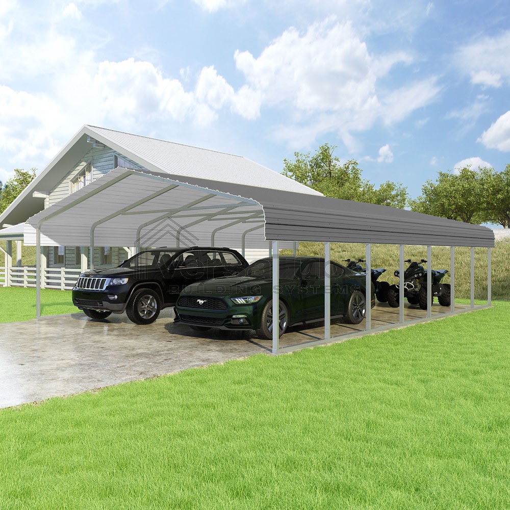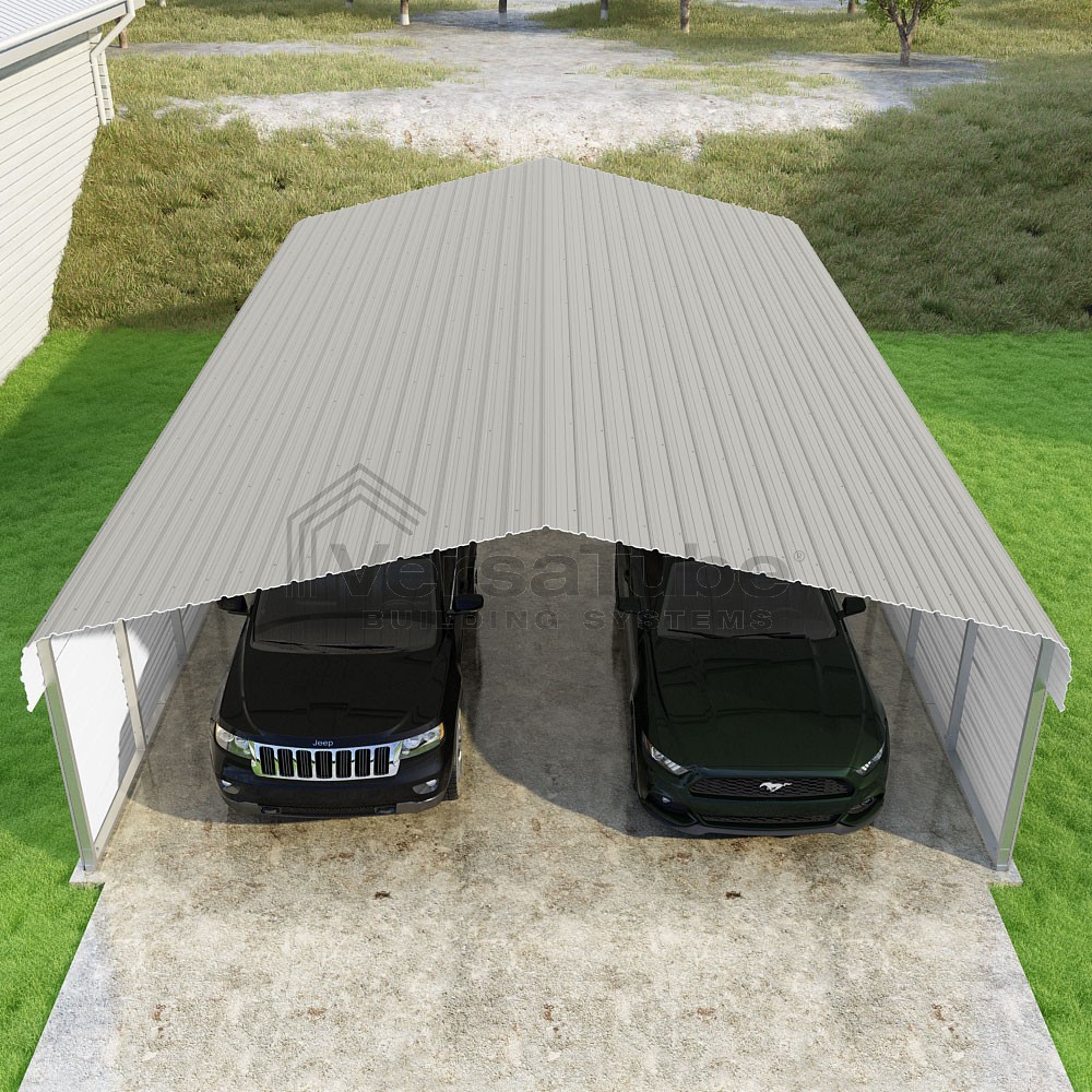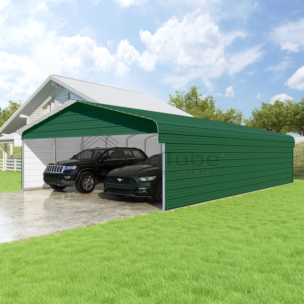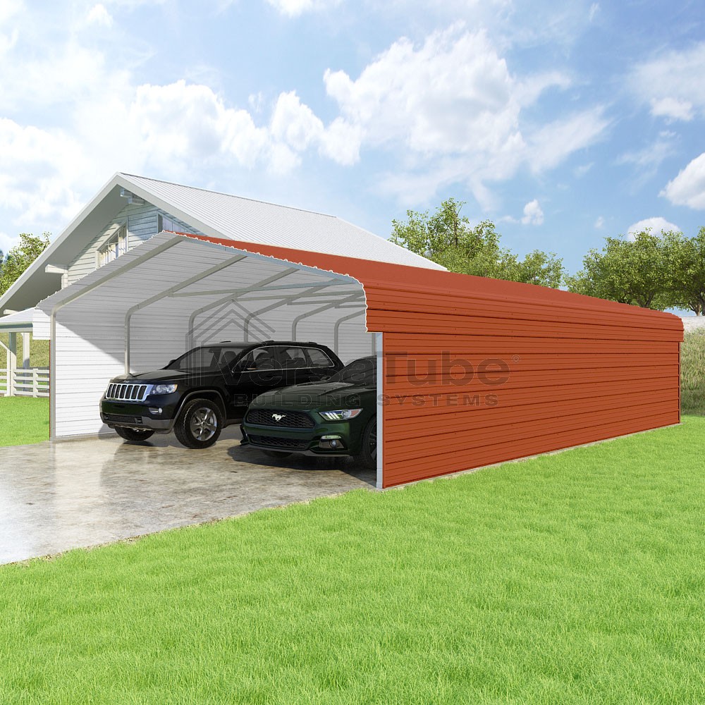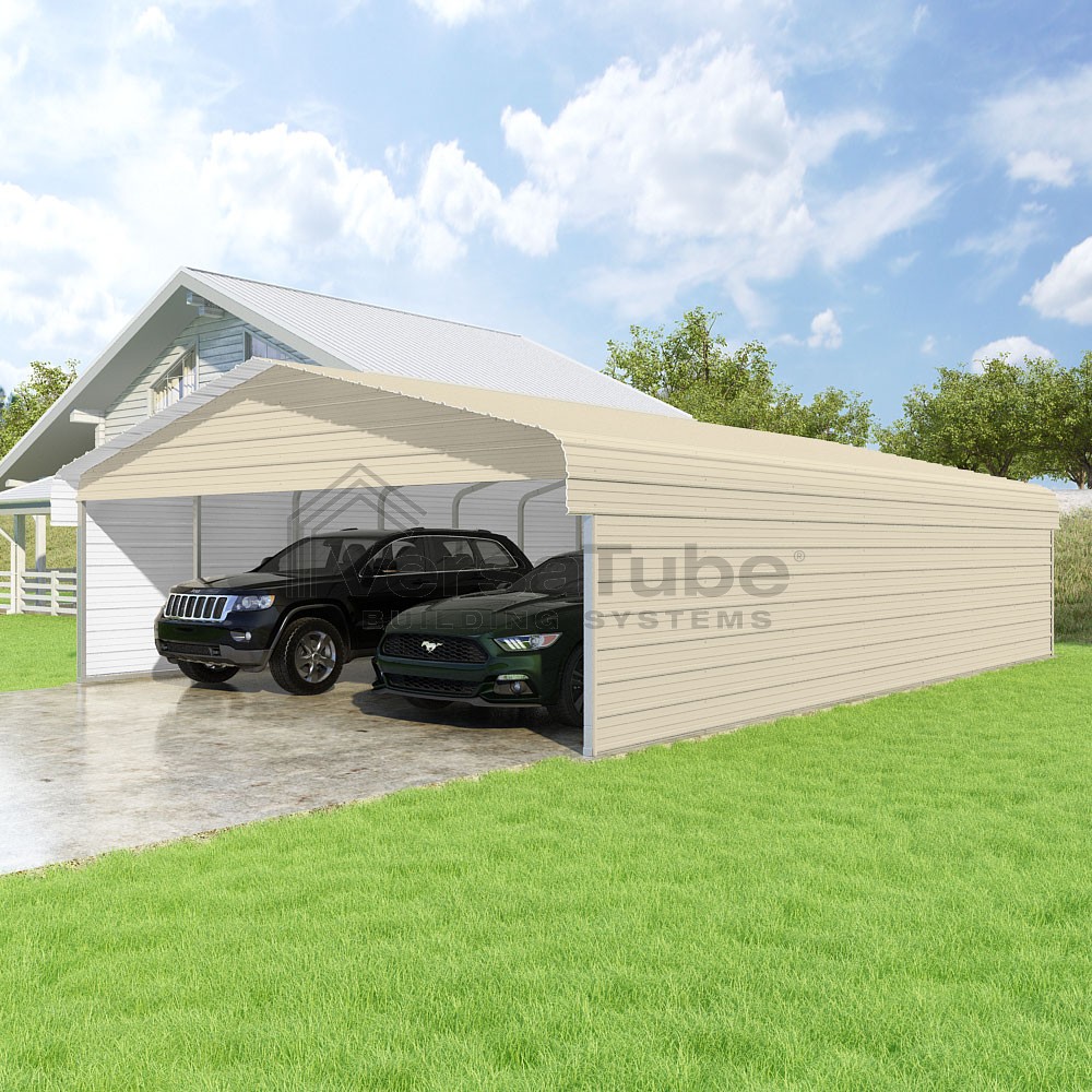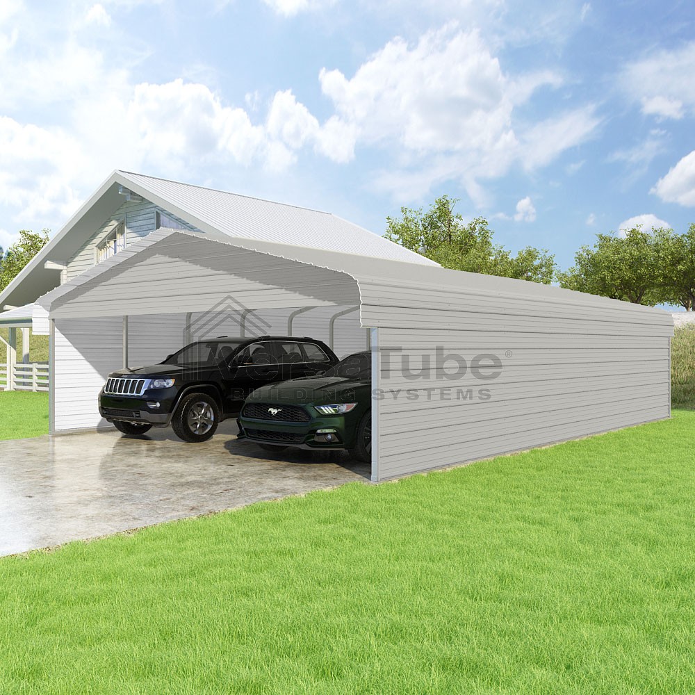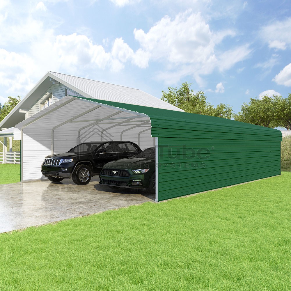 Classic Series DIY carport kit features horizontal application of sheet metal panels with the extra protection of rounded eaves.