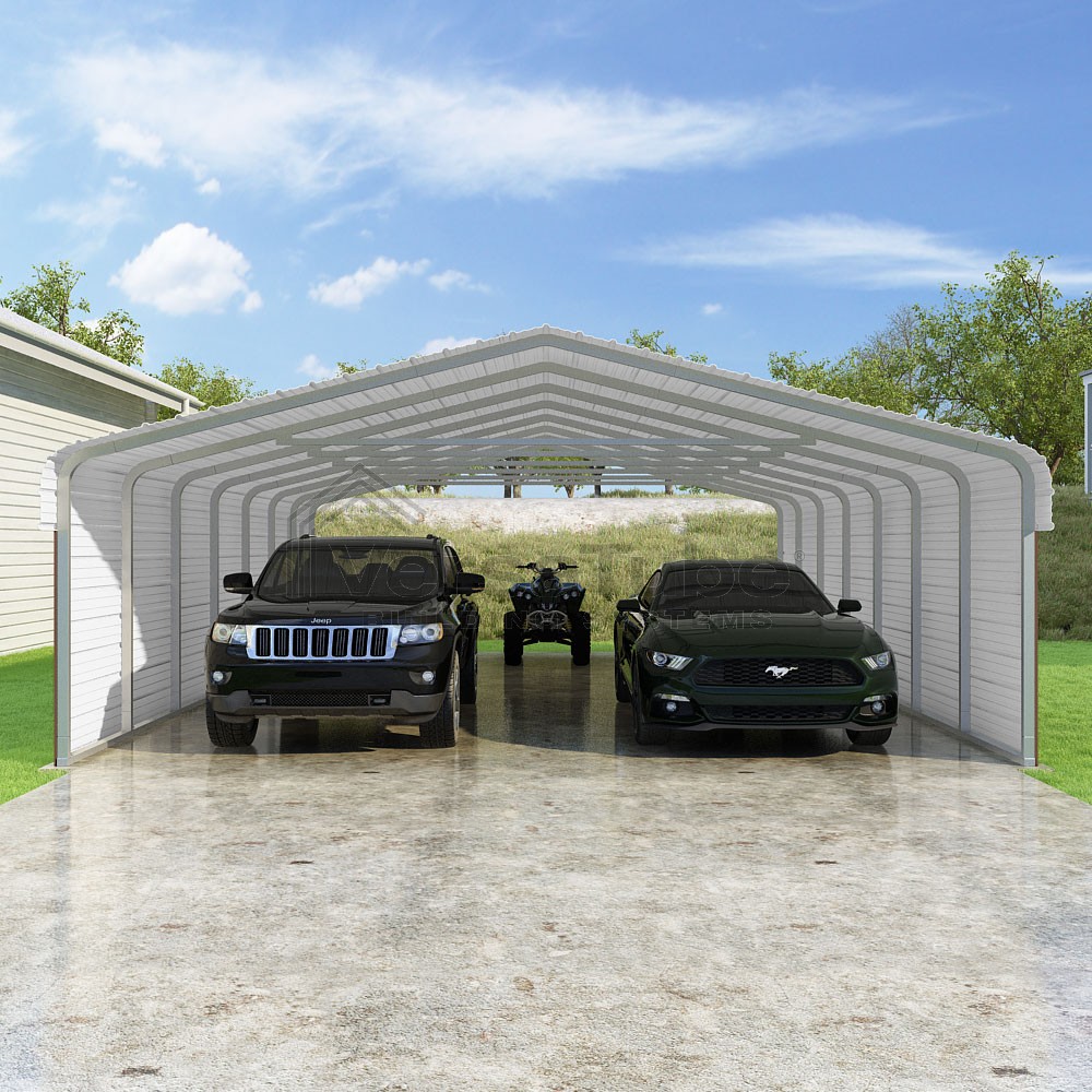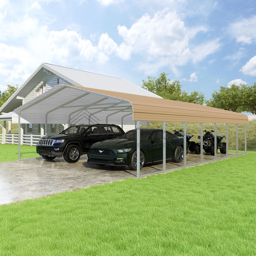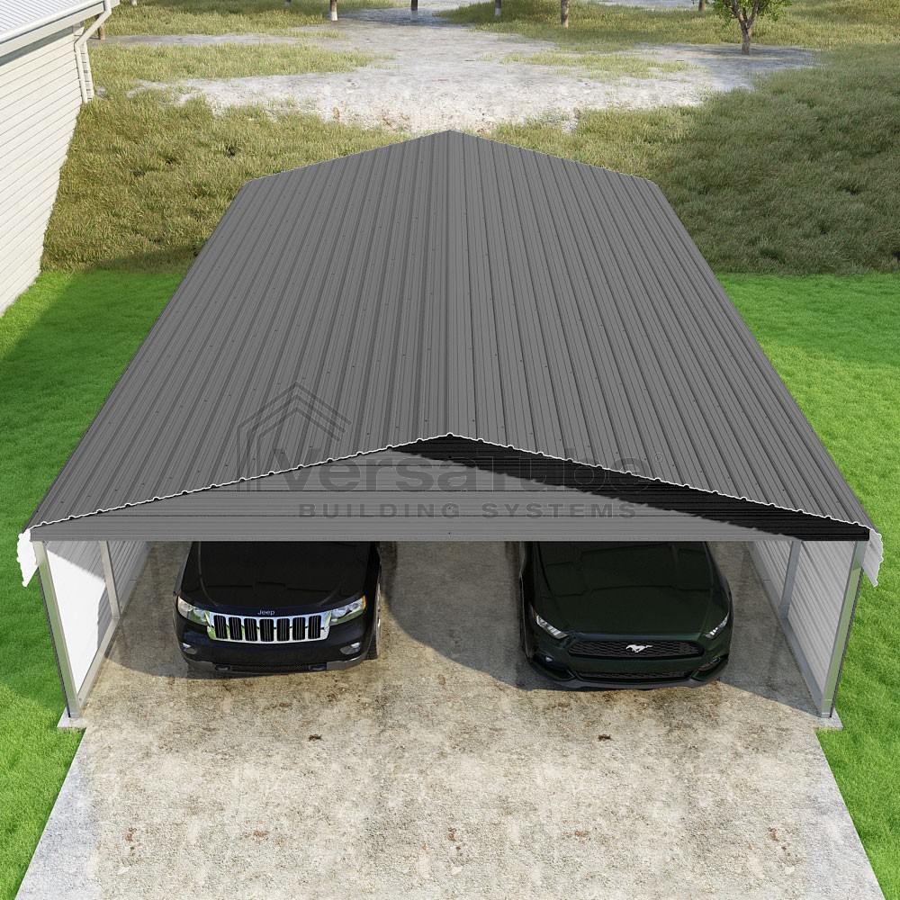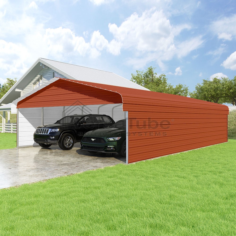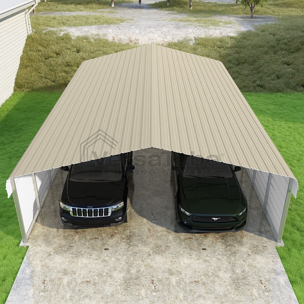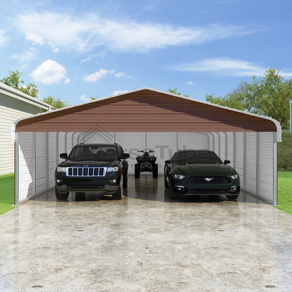Classic Series DIY carport kit features horizontal application of sheet metal panels with the extra protection of rounded eaves.