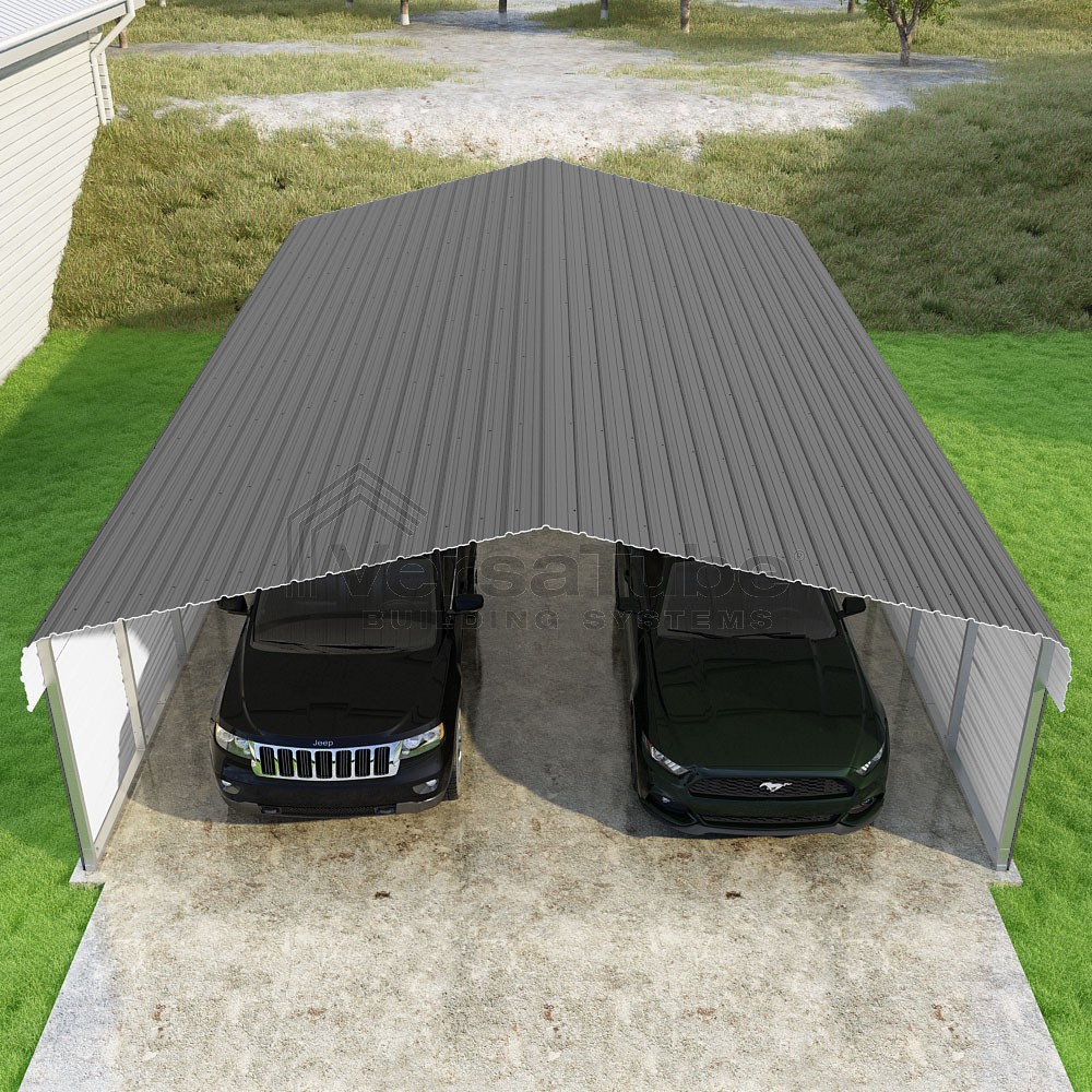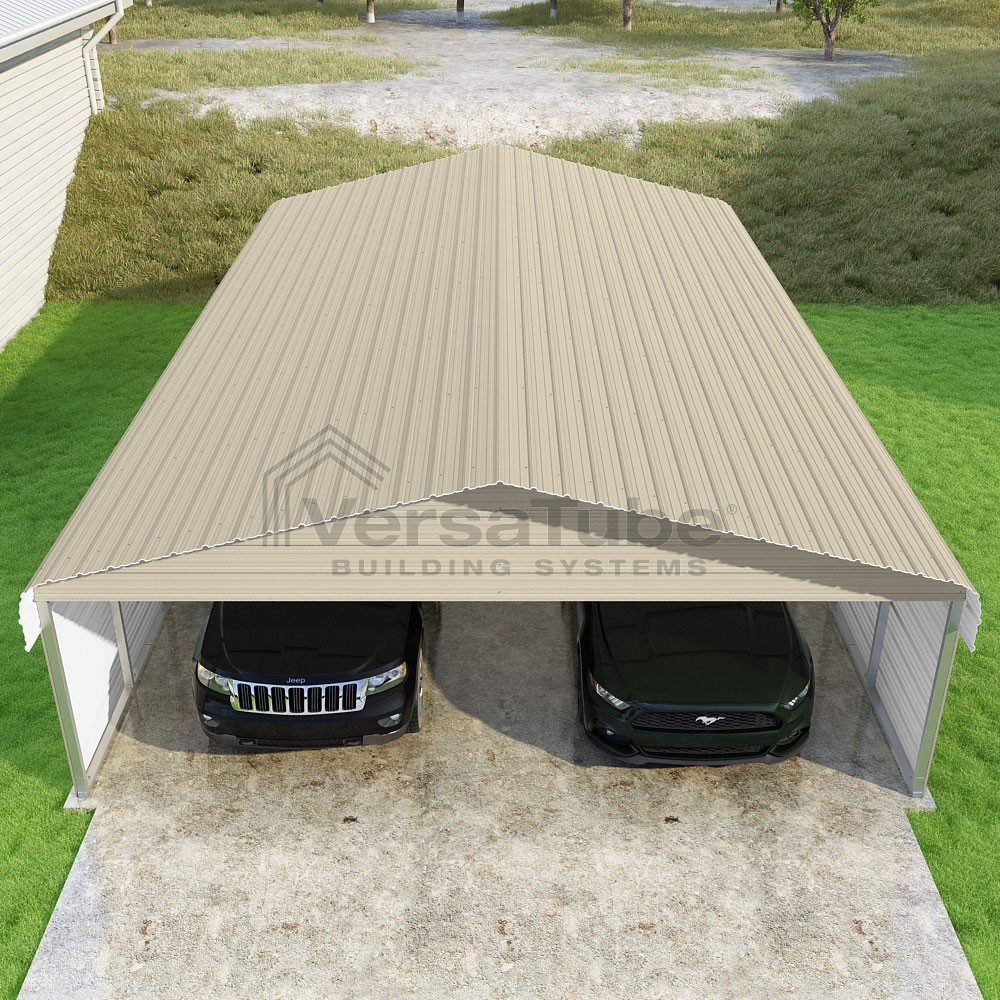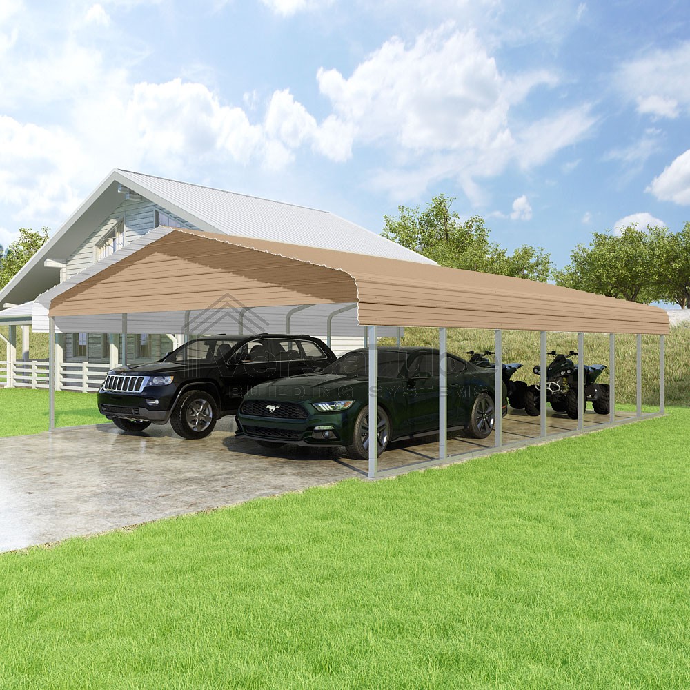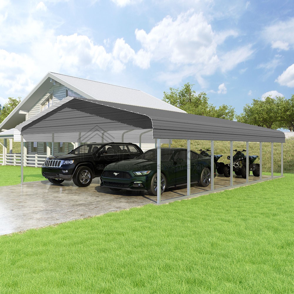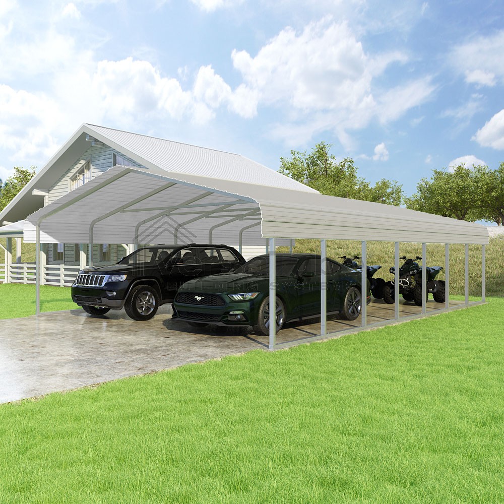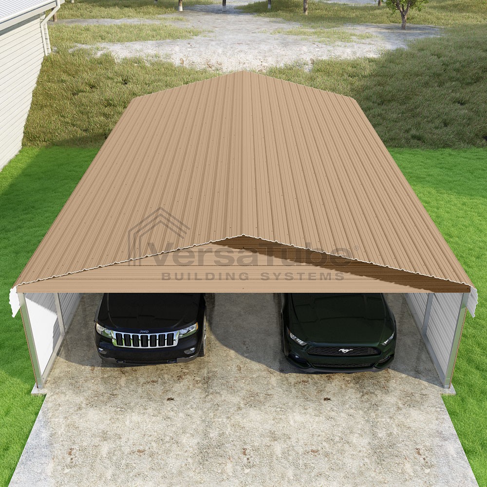 Classic Series DIY carport kit features horizontal application of sheet metal panels with the extra protection of rounded eaves.